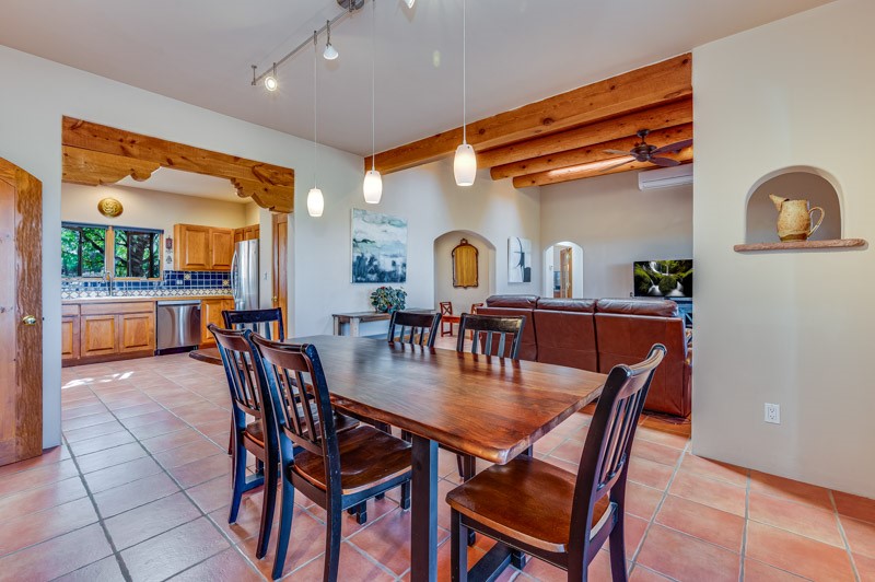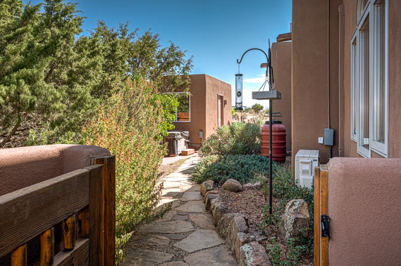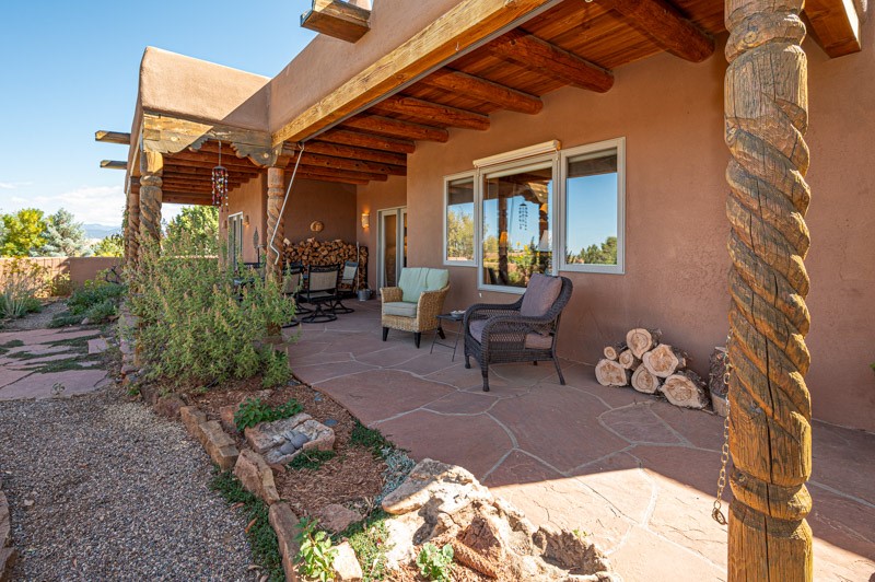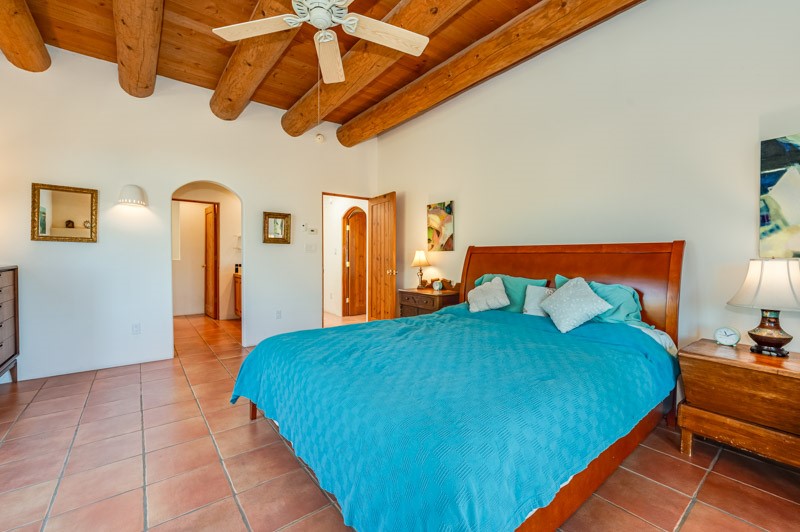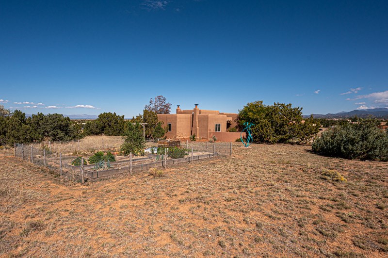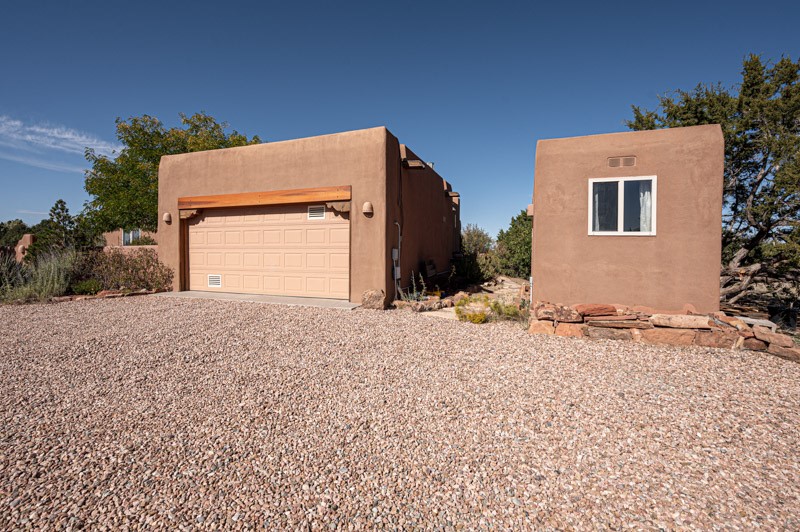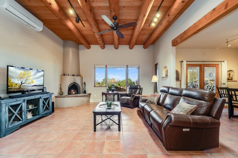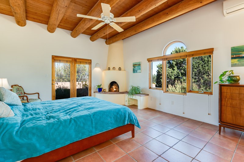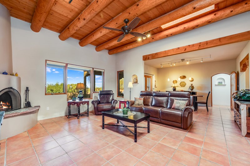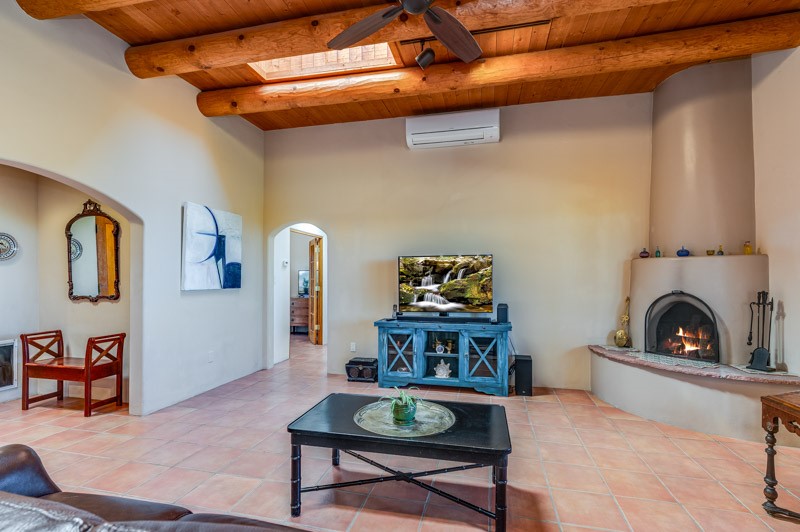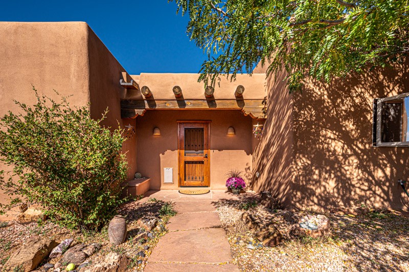 Exquisite Santa Fe detailing throughout this lovely southwestern contemporary home designed and built by Adobeworks, Inc. An open floor plan concept with high viga ceilings and many windows in the great room and master bedroom for a light and spacious feel. The master bath was completely remodeled with an artisan tiled enclosure of a new deep soaking tub and a tiled floor-to-ceiling walk-in shower. There are three lovely kiva fireplaces in the living room, master suite and third bedroom. Plenty of room in the kitchen with good pantry space and easy access to the dining area and outside portal. Natural gas in-floor radiant heat with Wirsbo pipe, and two mini-splits in the great room and master suite, as well as a central evaporative cooler for year round comfort. A fenced vegetable garden, a cozy studio, and a new hot tub await your enjoyment. The roof was recently upgraded with preventative maintenance, and has a transferable warranty that is good until March 2025. The home has all copper plumbing for hot/cold water, and has extensive landscaping and hardscaping. This meticulously maintained home has fabulous Jemez Mountain views from the great room, deluxe privacy, and is a highly livable home to enjoy.