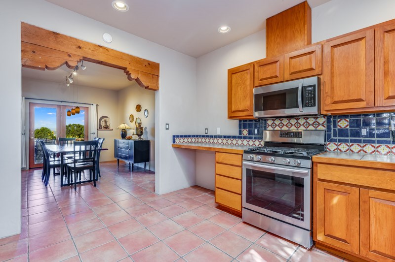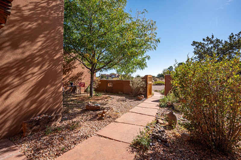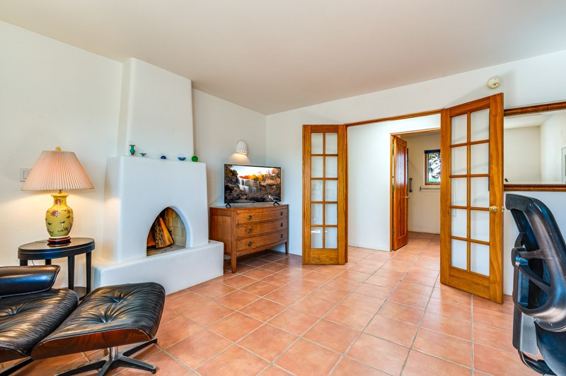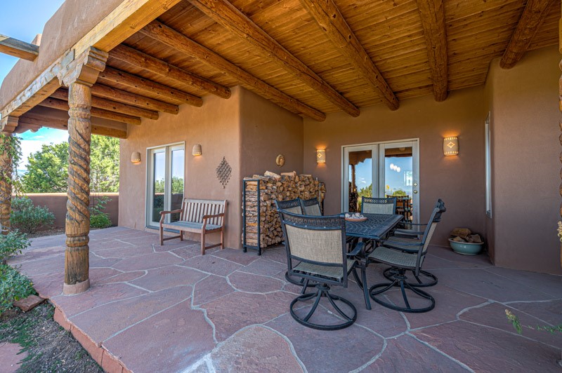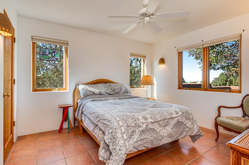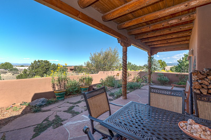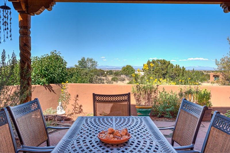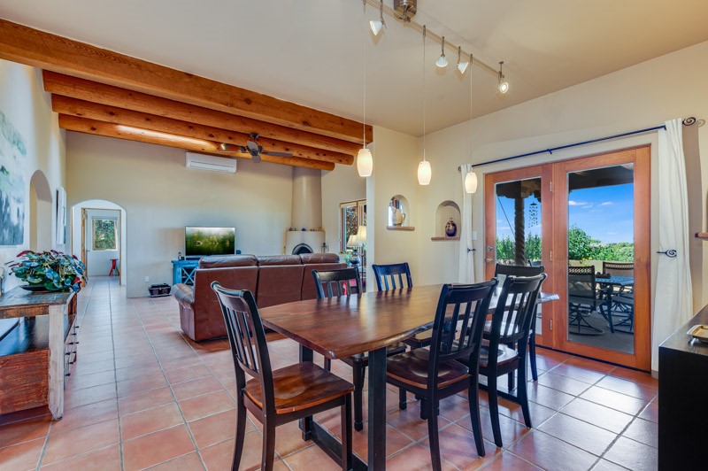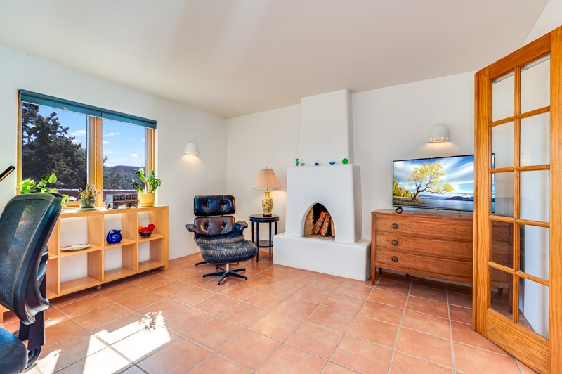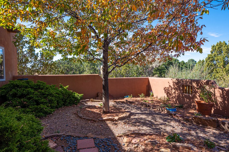 Exquisite Santa Fe detailing throughout this lovely southwestern contemporary home designed and built by Adobeworks, Inc. An open floor plan concept with high viga ceilings and many windows in the great room and master bedroom for a light and spacious feel. The master bath was completely remodeled with an artisan tiled enclosure of a new deep soaking tub and a tiled floor-to-ceiling walk-in shower. There are three lovely kiva fireplaces in the living room, master suite and third bedroom. Plenty of room in the kitchen with good pantry space and easy access to the dining area and outside portal. Natural gas in-floor radiant heat with Wirsbo pipe, and two mini-splits in the great room and master suite, as well as a central evaporative cooler for year round comfort. A fenced vegetable garden, a cozy studio, and a new hot tub await your enjoyment. The roof was recently upgraded with preventative maintenance, and has a transferable warranty that is good until March 2025. The home has all copper plumbing for hot/cold water, and has extensive landscaping and hardscaping. This meticulously maintained home has fabulous Jemez Mountain views from the great room, deluxe privacy, and is a highly livable home to enjoy.