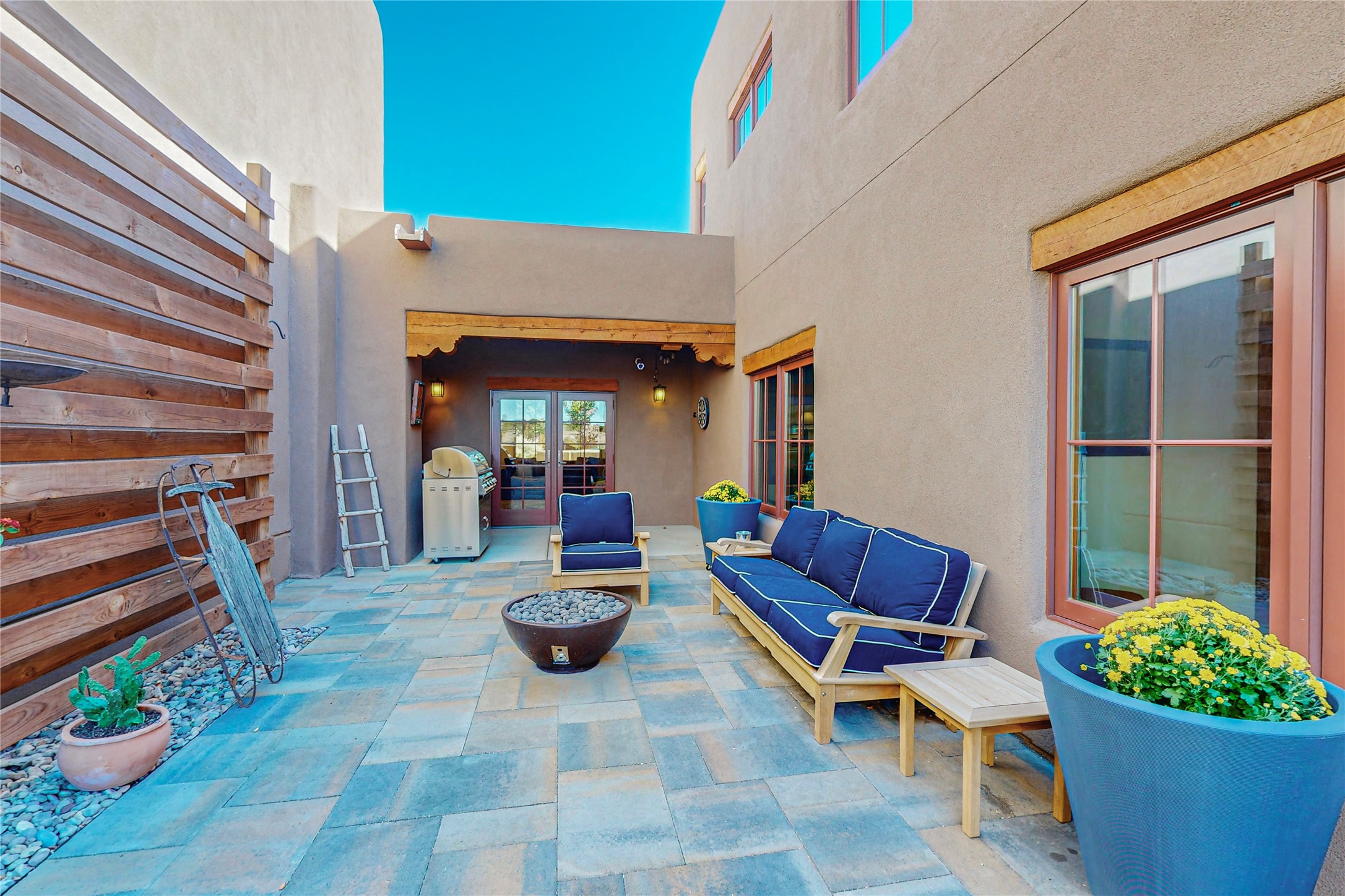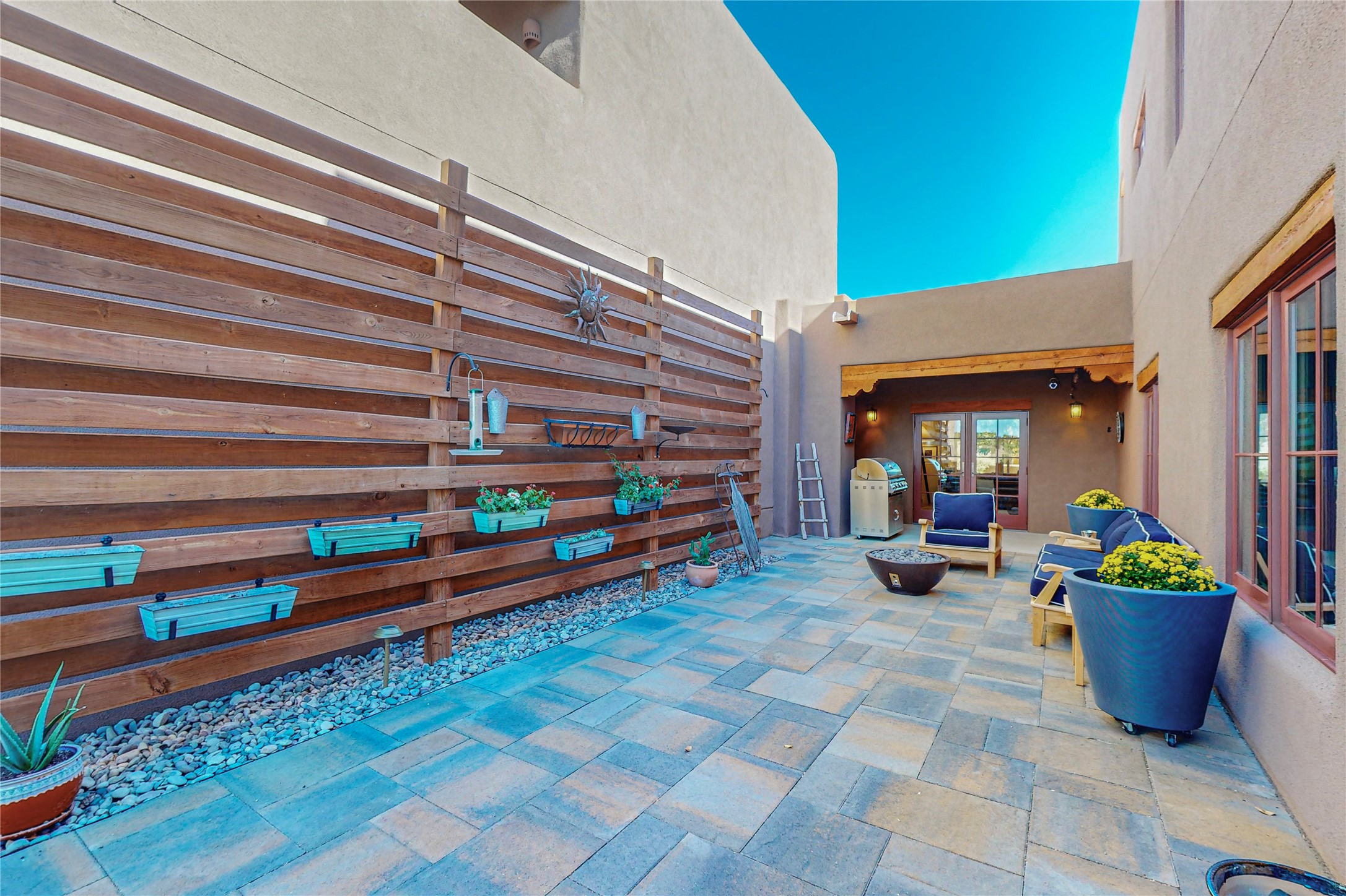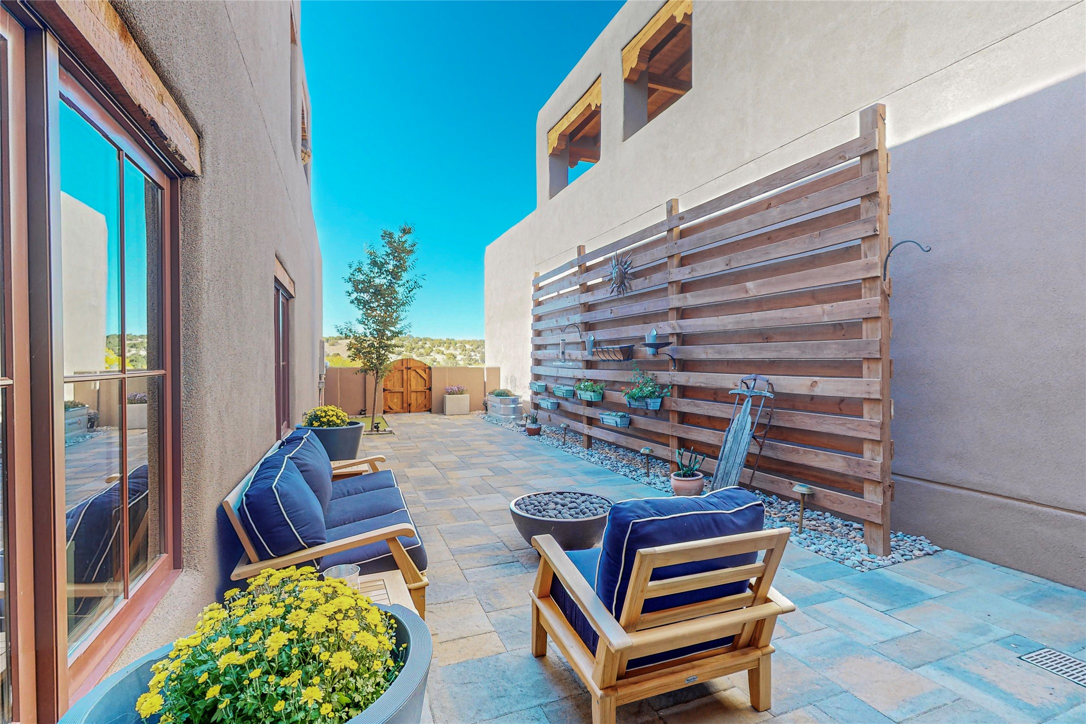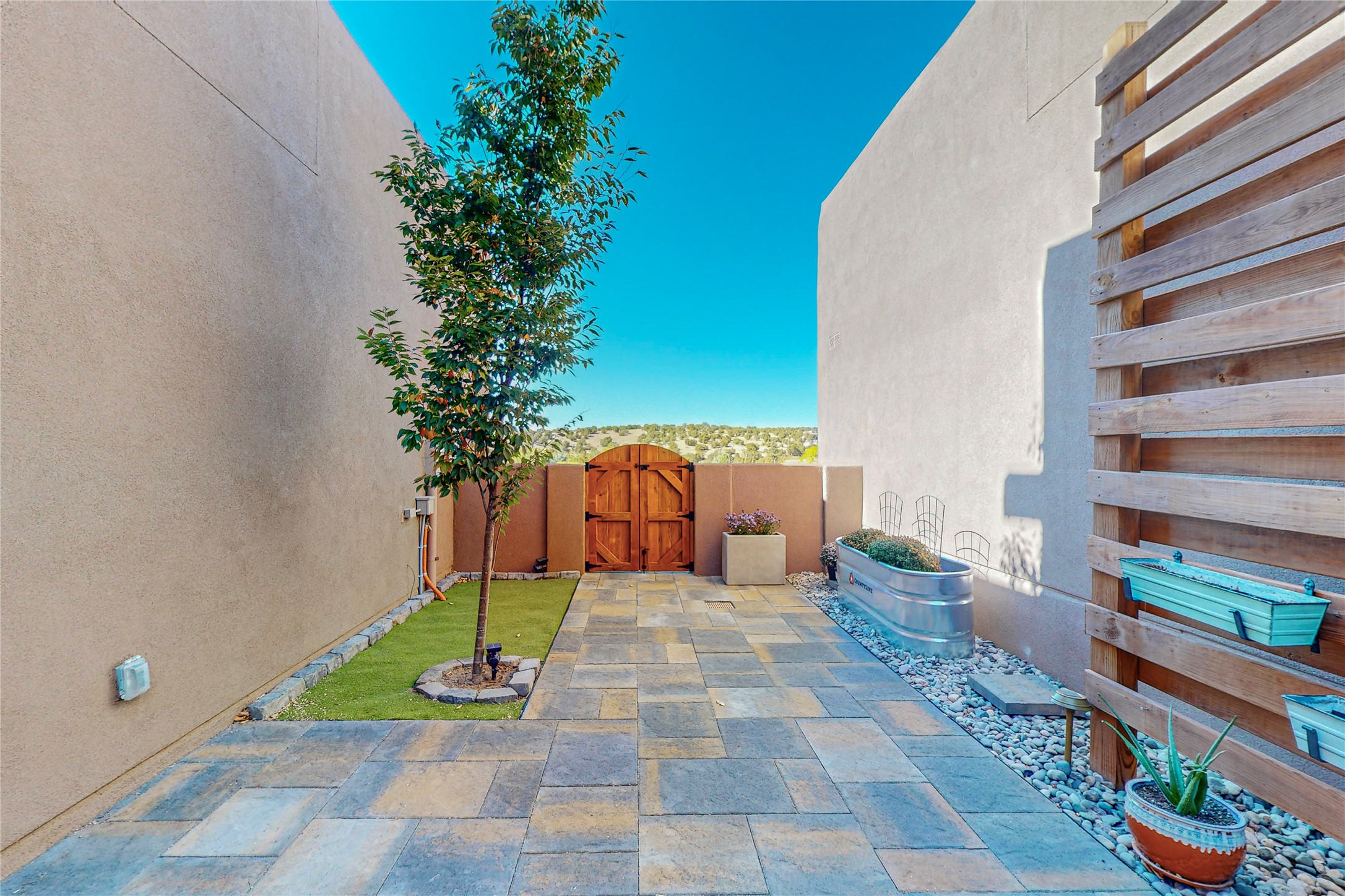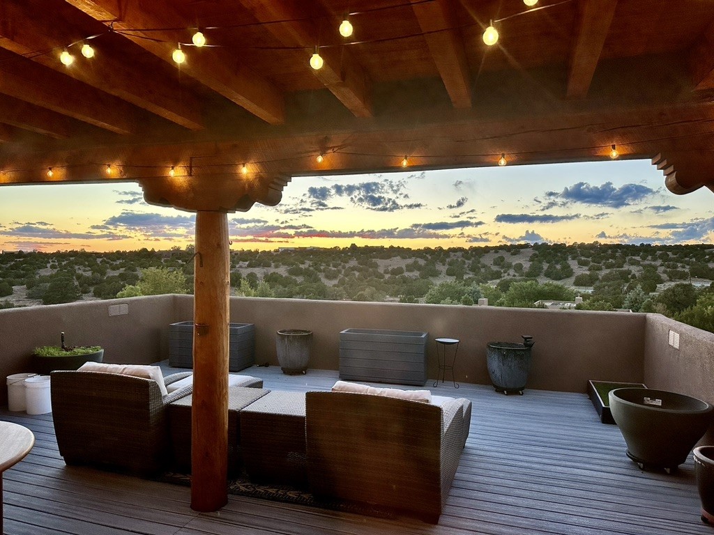 This newly built single family paito home with central heating and air conditioning, a tankless water heater, TPO roof, and energy efficient. All interior walls are insulated for better comfort and sound absorption. The owners have upgraded nearly everything. From the large plank tile flooring to the premium appliances to designer plumbing, California Closets systems, and custom cabinets. Elegant primary retreat with walk-through shower, custom California Closets, and large his and hers spaces. Entertain in your kitchen with an oversized quartz island, inviting stone paver yard, or enjoy spectacular sunsets. This home is pre-wired for home theater. The real star of the show is an expansive west facing view from the deck off of the primary bedroom with approximately 500+/-sf of Trex decking. Enjoy the monsoon storms, gorgeous sunsets, and the snow covered ridge that is protected open space. Aldea de Santa Fe is a National Wildlife Federation "Certified Wildlife Habitat Community." This is the only such designated community in New Mexico. Aldea subdivision is highly sought after for its 13 miles of trails, plus tennis, pickleball and basketball courts.
