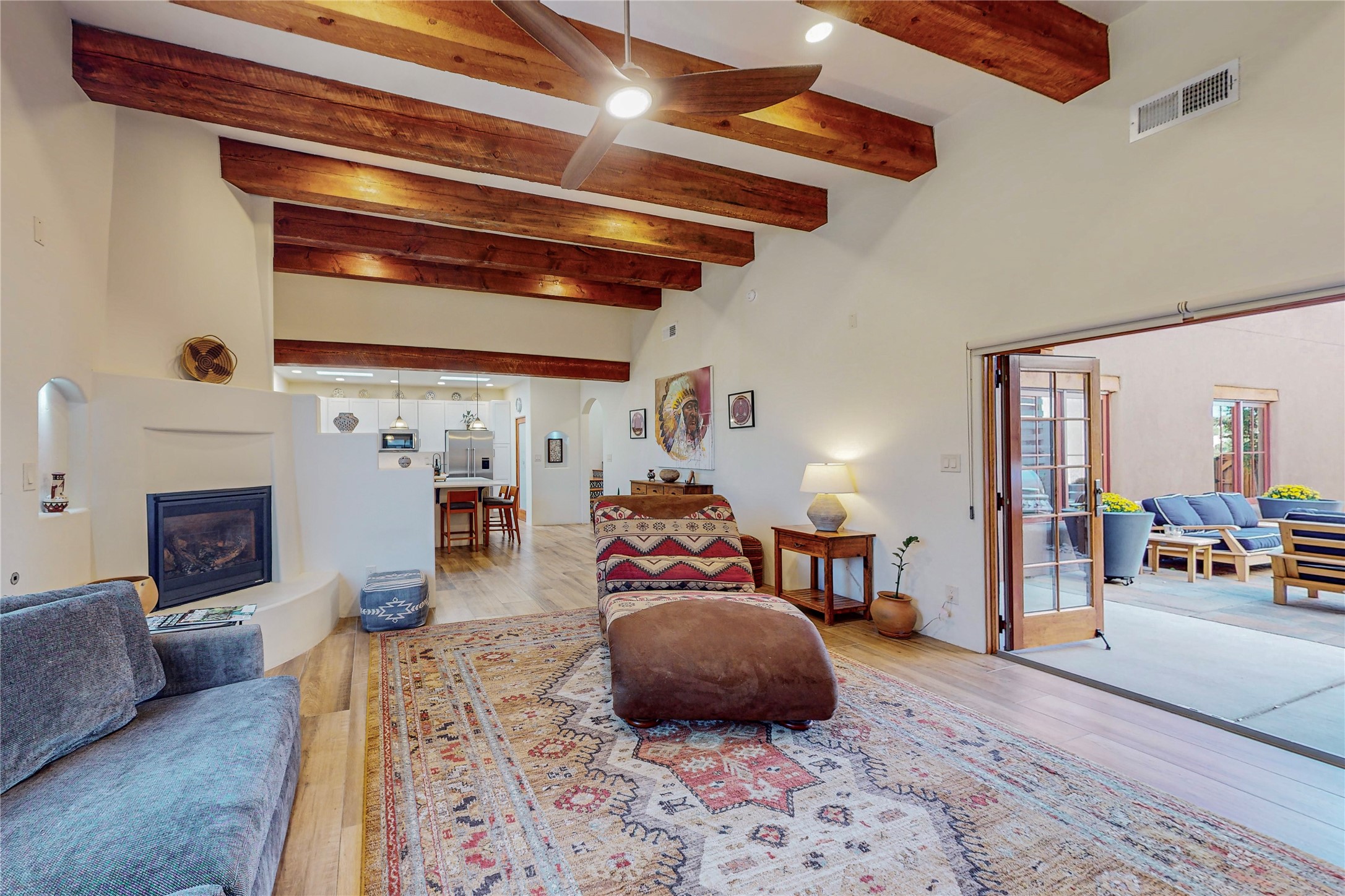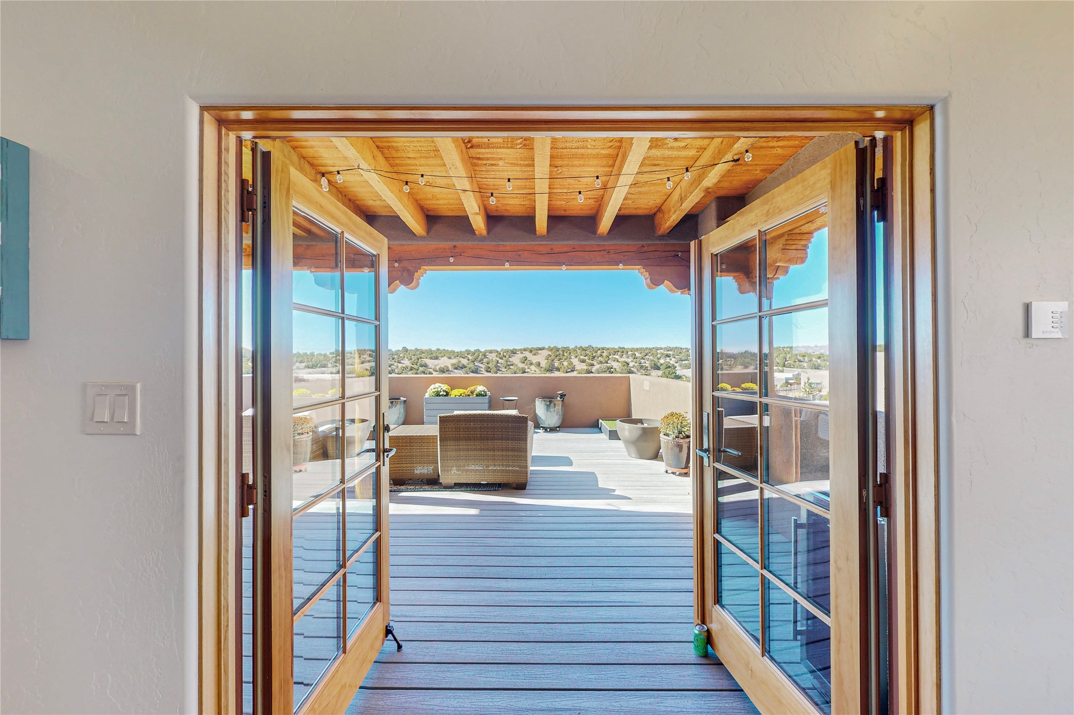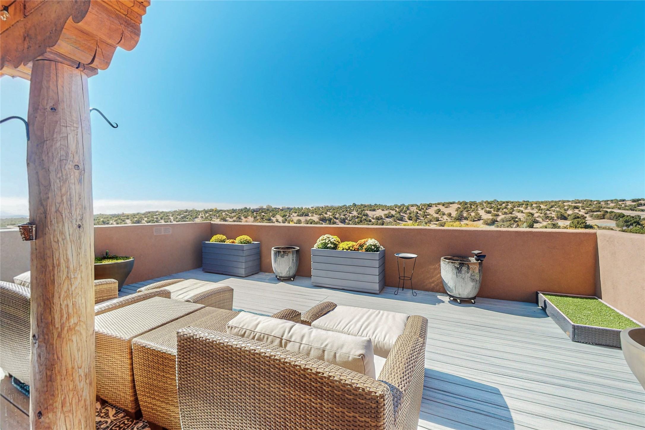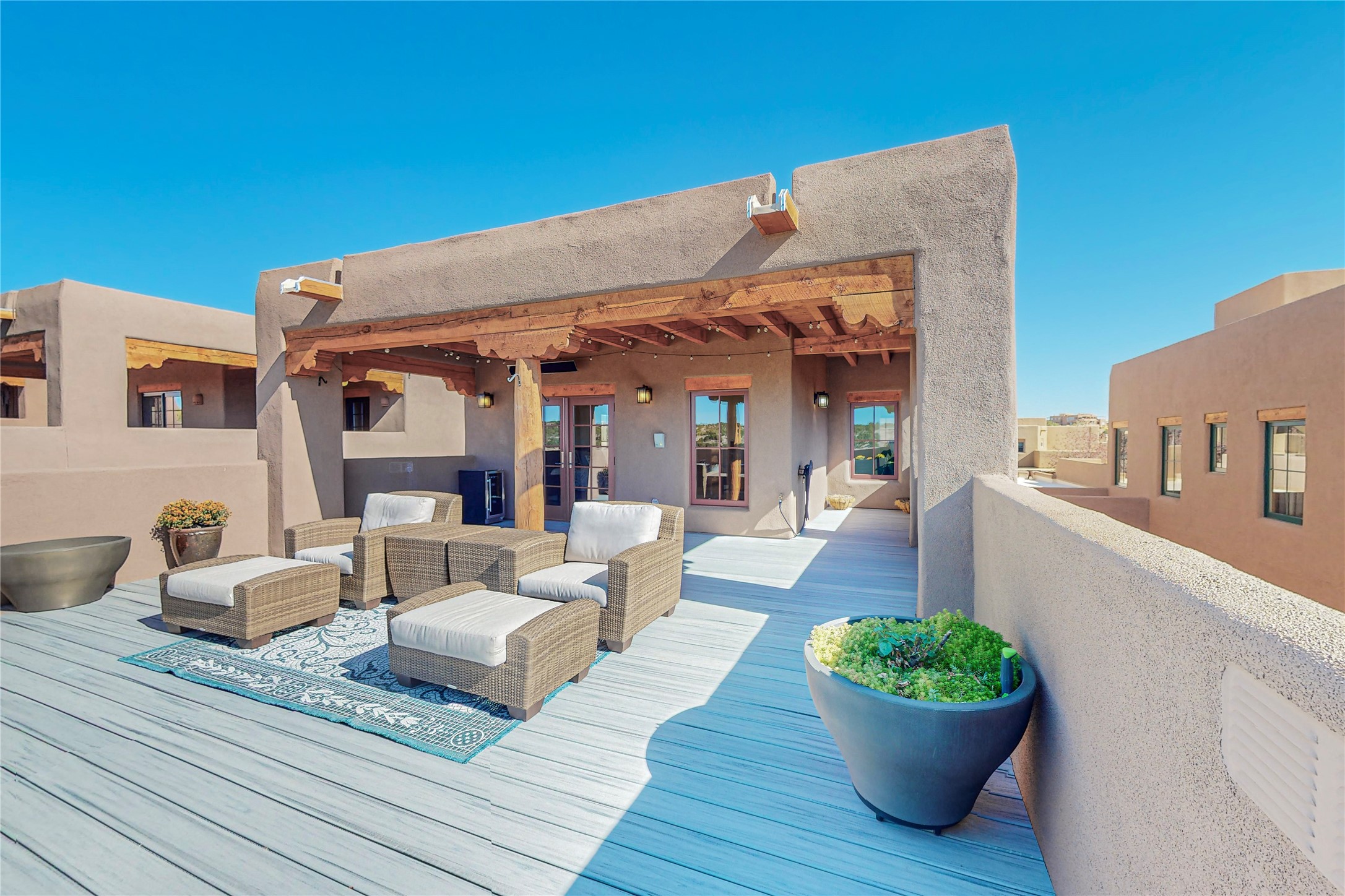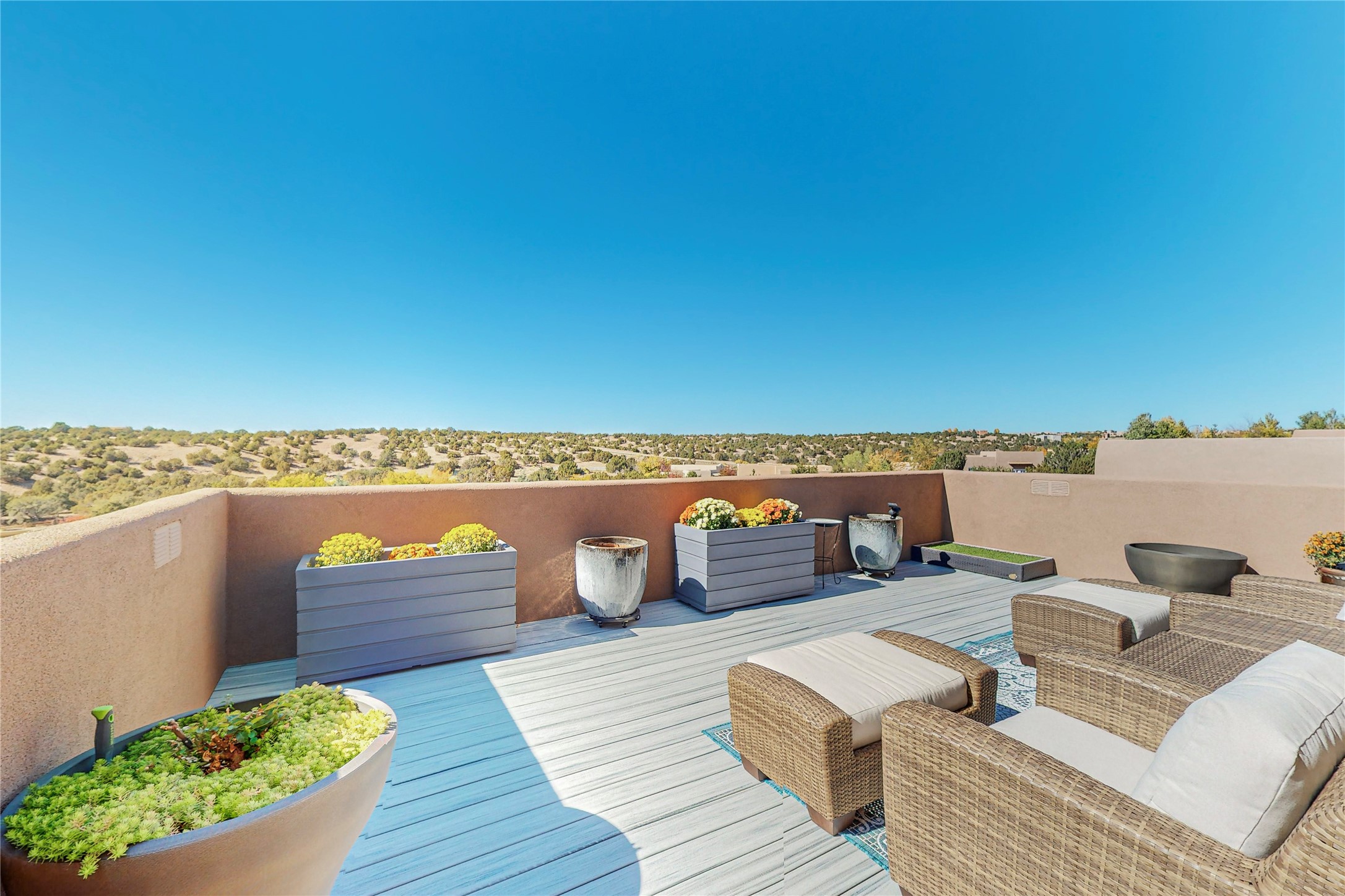This newly built single family paito home with central heating and air conditioning, a tankless water heater, TPO roof, and energy efficient. All interior walls are insulated for better comfort and sound absorption. The owners have upgraded nearly everything. From the large plank tile flooring to the premium appliances to designer plumbing, California Closets systems, and custom cabinets. Elegant primary retreat with walk-through shower, custom California Closets, and large his and hers spaces. Entertain in your kitchen with an oversized quartz island, inviting stone paver yard, or enjoy spectacular sunsets. This home is pre-wired for home theater. The real star of the show is an expansive west facing view from the deck off of the primary bedroom with approximately 500+/-sf of Trex decking. Enjoy the monsoon storms, gorgeous sunsets, and the snow covered ridge that is protected open space. Aldea de Santa Fe is a National Wildlife Federation "Certified Wildlife Habitat Community." This is the only such designated community in New Mexico. Aldea subdivision is highly sought after for its 13 miles of trails, plus tennis, pickleball and basketball courts.