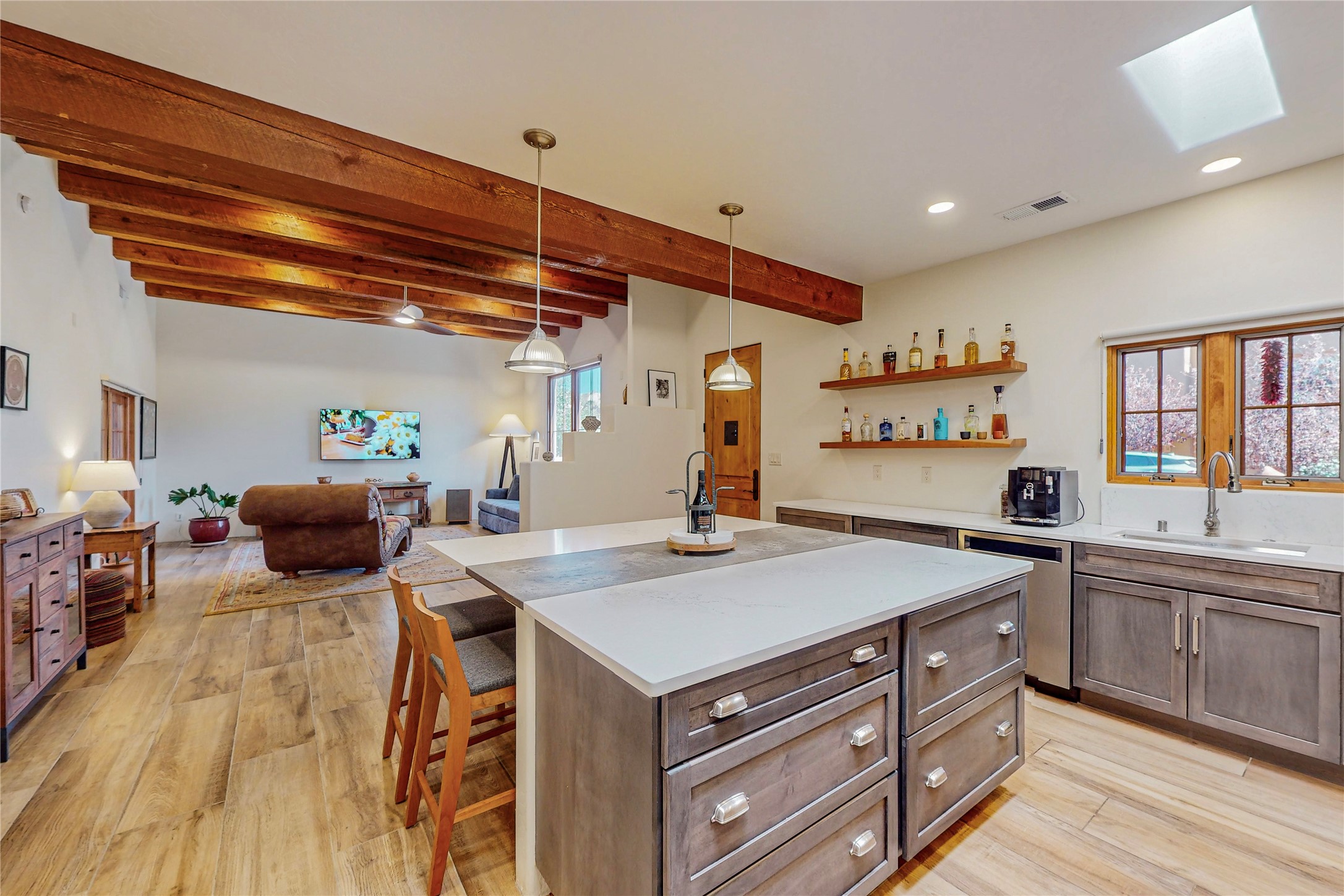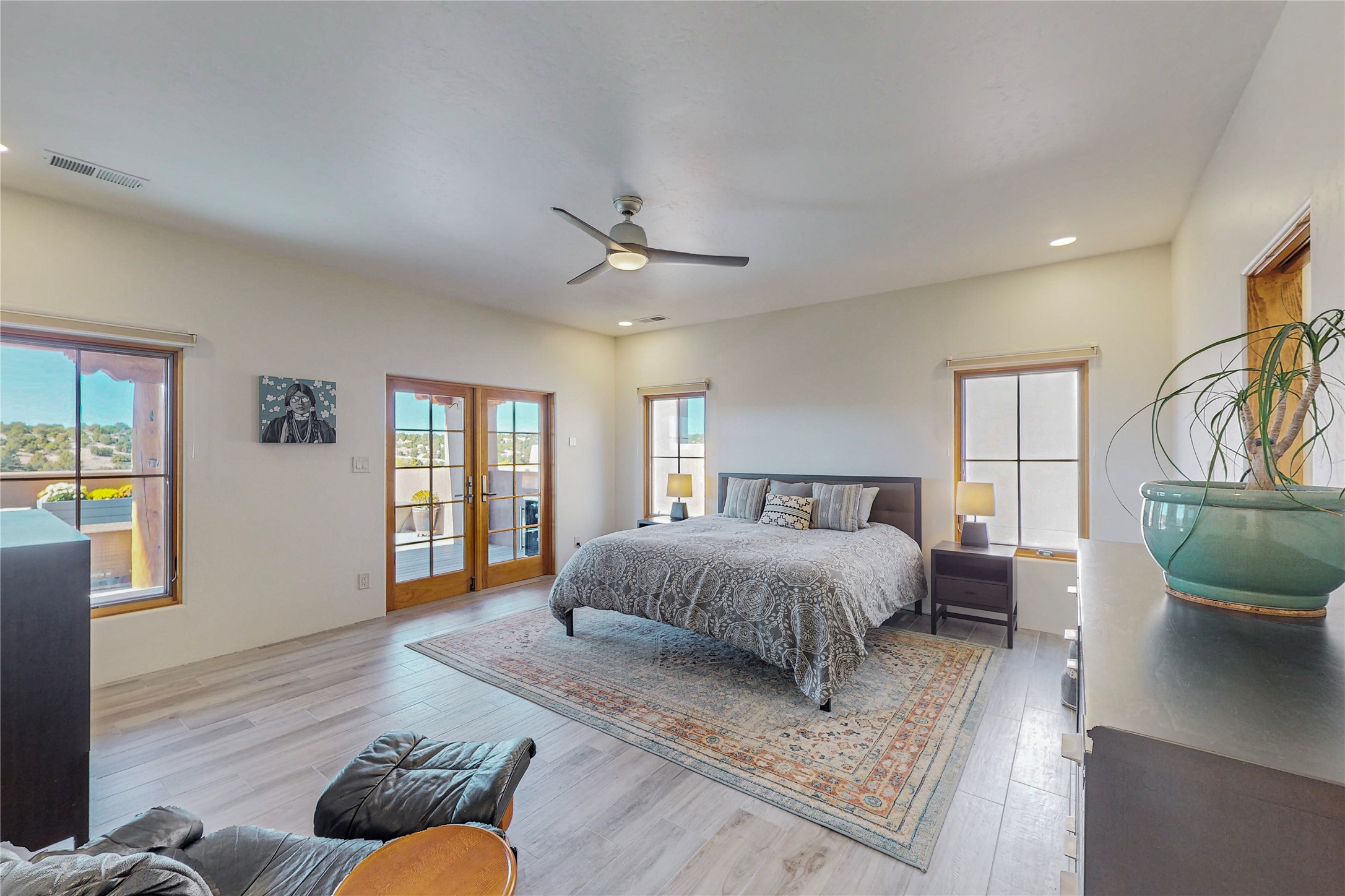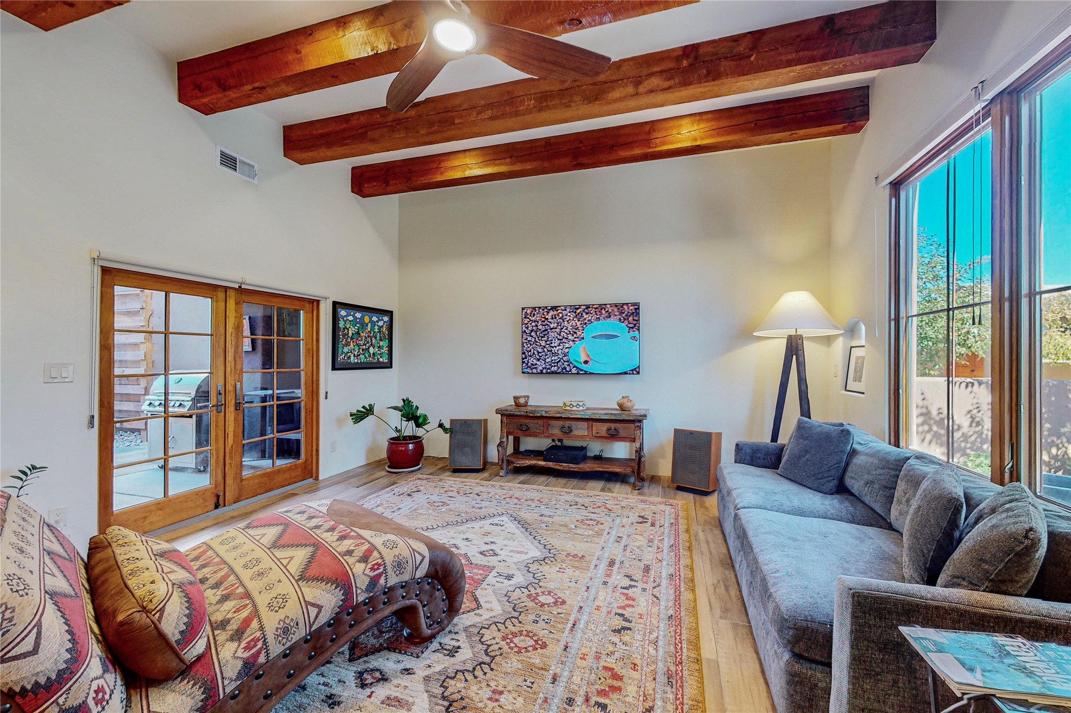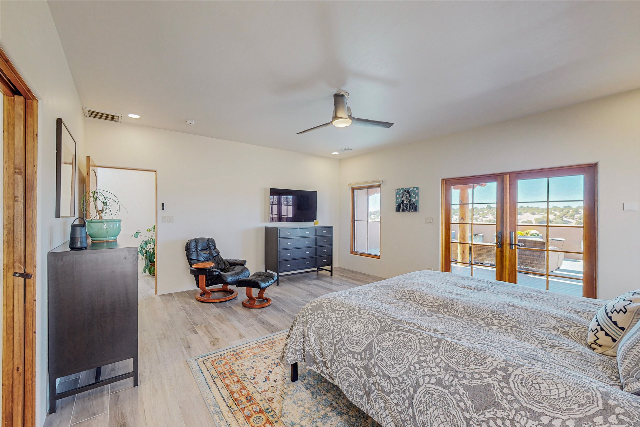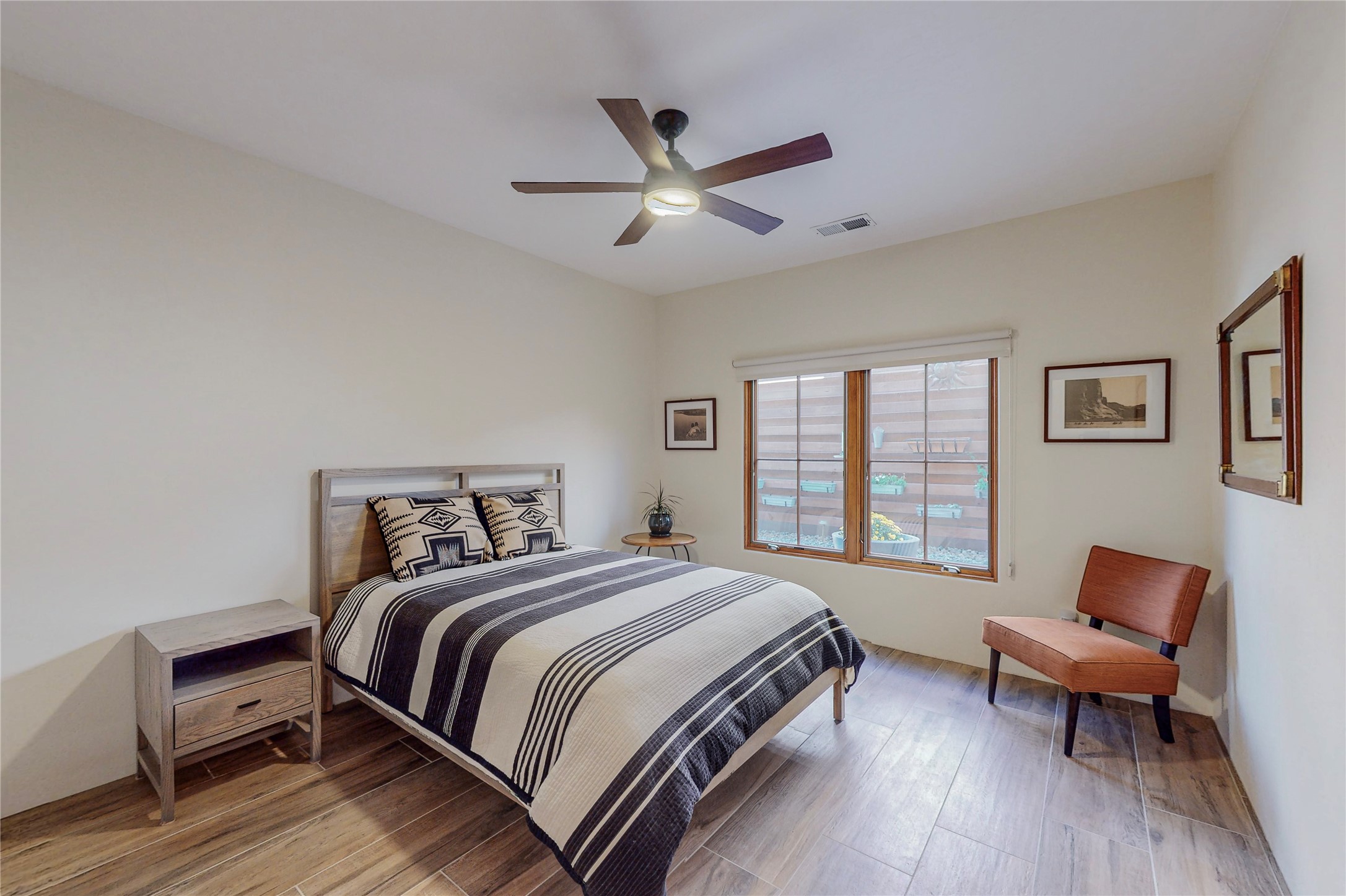 This newly built single family paito home with central heating and air conditioning, a tankless water heater, TPO roof, and energy efficient. All interior walls are insulated for better comfort and sound absorption. The owners have upgraded nearly everything. From the large plank tile flooring to the premium appliances to designer plumbing, California Closets systems, and custom cabinets. Elegant primary retreat with walk-through shower, custom California Closets, and large his and hers spaces. Entertain in your kitchen with an oversized quartz island, inviting stone paver yard, or enjoy spectacular sunsets. This home is pre-wired for home theater. The real star of the show is an expansive west facing view from the deck off of the primary bedroom with approximately 500+/-sf of Trex decking. Enjoy the monsoon storms, gorgeous sunsets, and the snow covered ridge that is protected open space. Aldea de Santa Fe is a National Wildlife Federation "Certified Wildlife Habitat Community." This is the only such designated community in New Mexico. Aldea subdivision is highly sought after for its 13 miles of trails, plus tennis, pickleball and basketball courts.