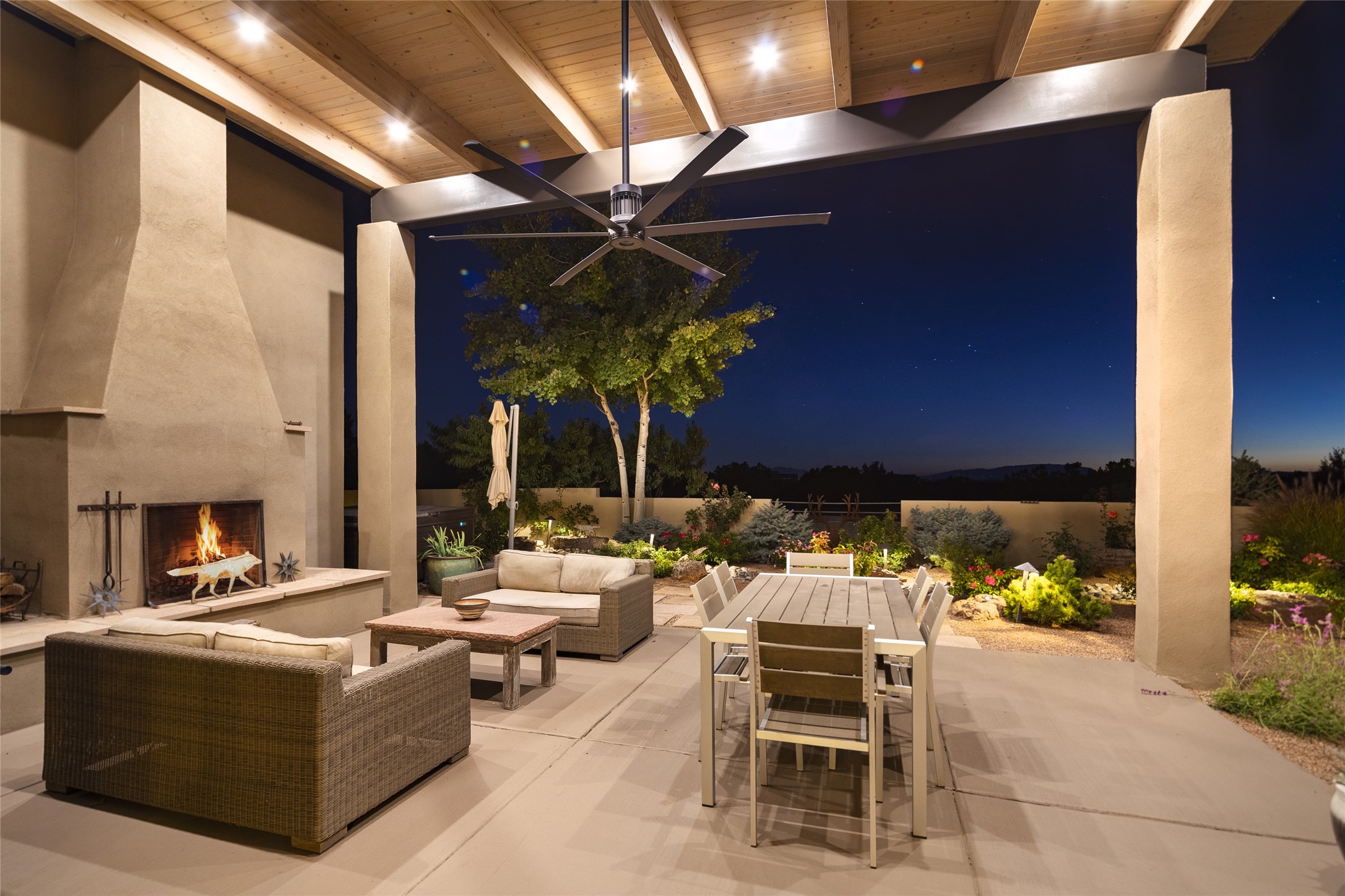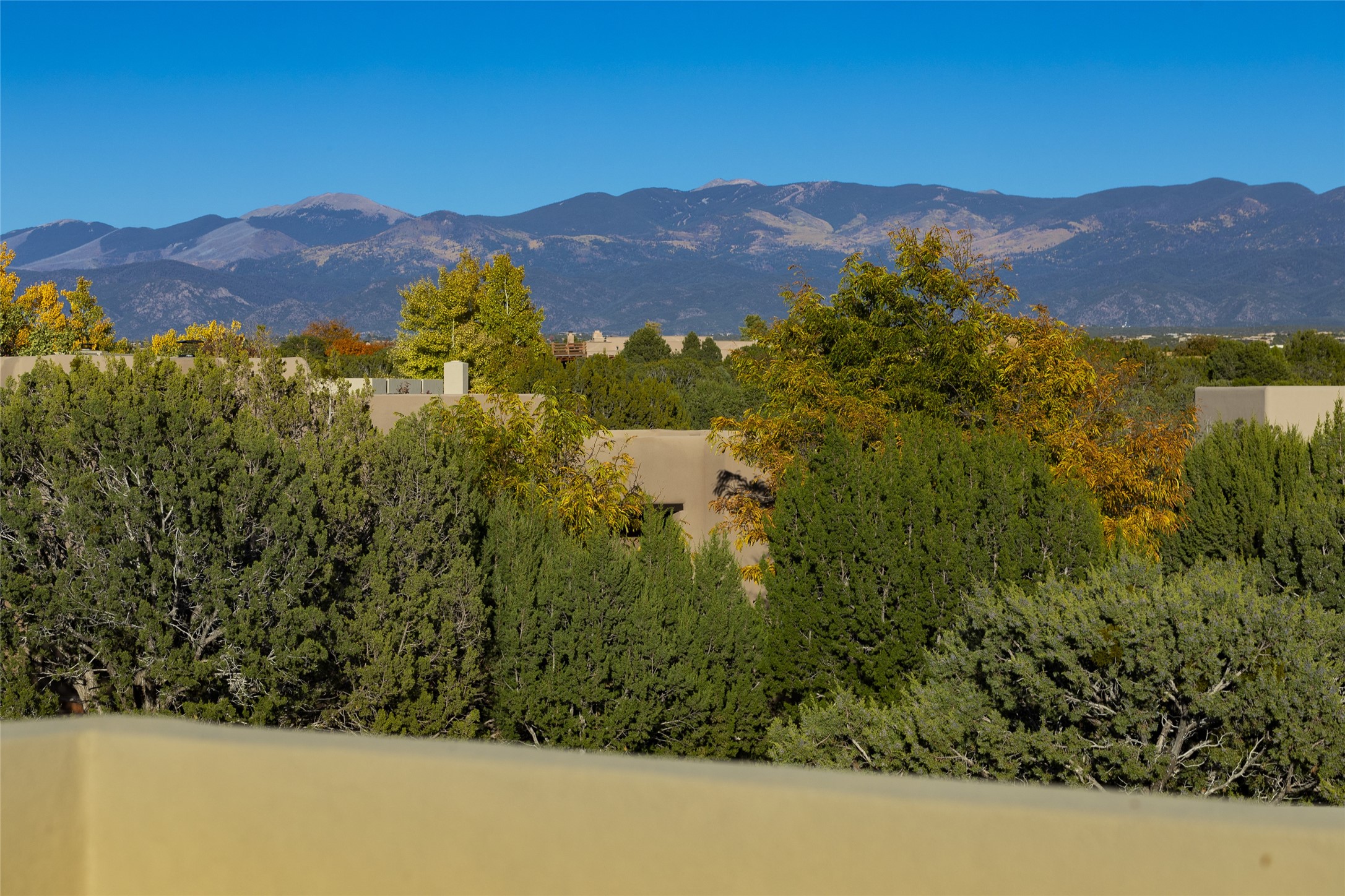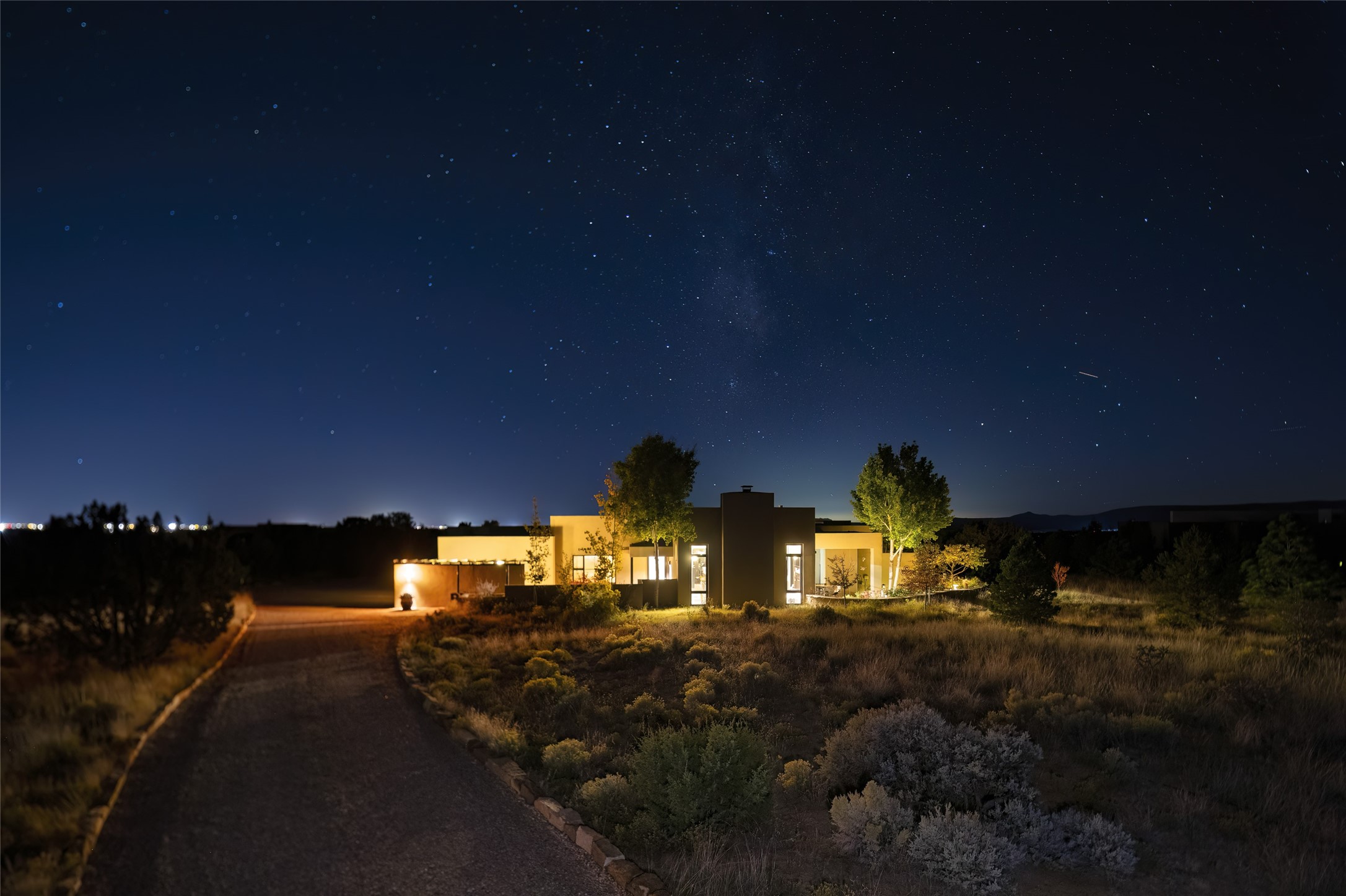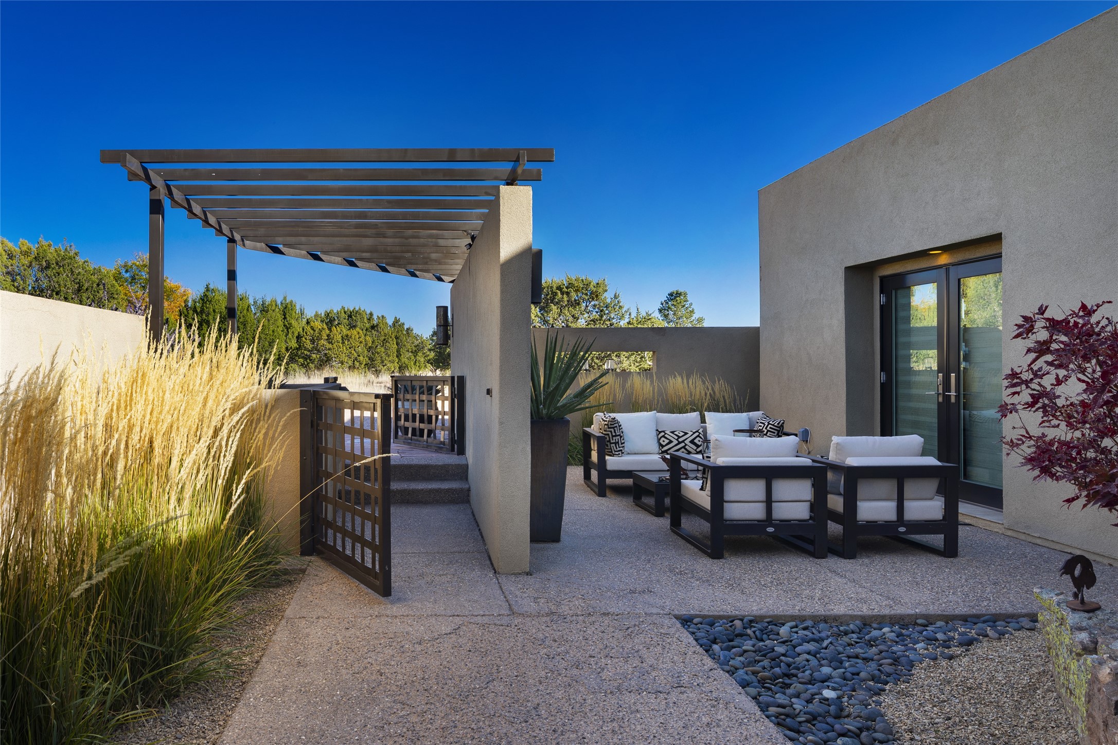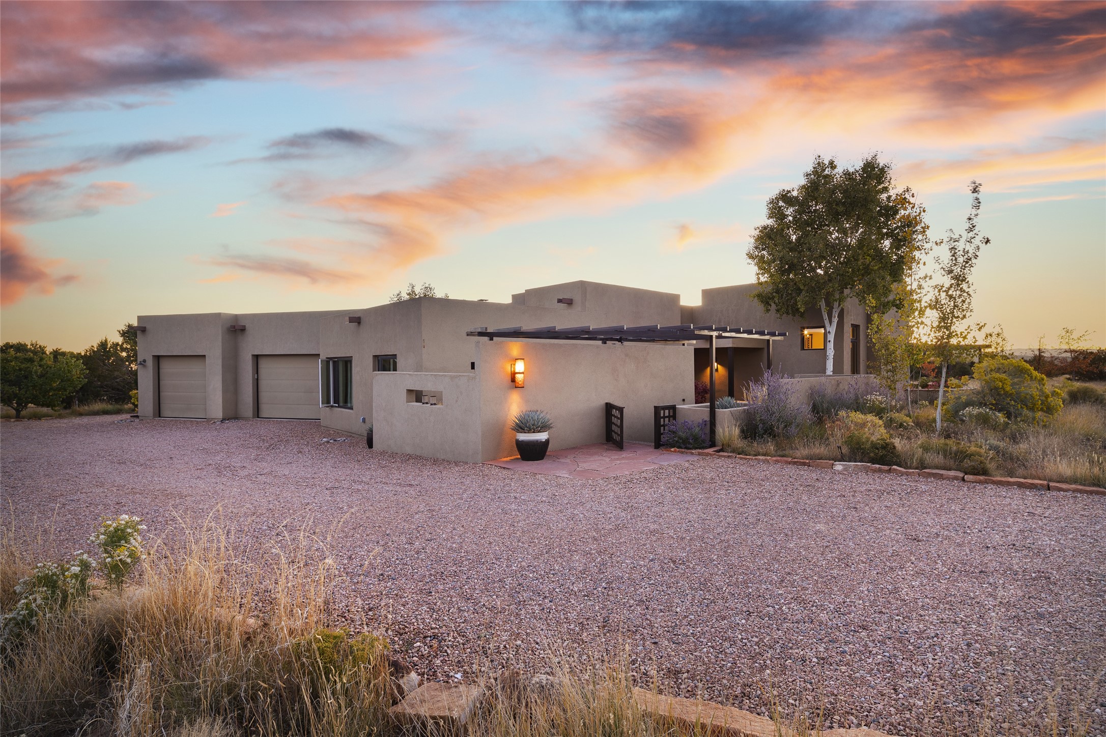 Sophisticated contemporary architecture, by renowned builder, Seth Anderson blended with luxury finishes, a resort-like backyard, and spectacular Mountain views are celebrated at this exciting Las Campanas residence. Designed to enjoy the ultimate Santa Fe lifestyle, this one of a kind residence, located within the master planned community Las Campanas, impresses with exceptional design which seamlessly incorporates the ultimate indoor and outdoor living experience with a newly added elevated portal and fireplace, a modern above ground spa, a substantial roof deck with 360-degree views, vibrant surround landscape, and three separate covered entertainment areas. This exquisite home offers excellent separation of space, with a private owner's suite complete portal access, a spa-like bath with a Victoria Albert soaking tub, a steam shower with glass accents which frame the aspen tree views, custom cabinets, and a spacious wrap around walk-in closet. Flexible design features include two additional bedrooms which share a full bath, plus a newly added modern office or ideal art studio with front courtyard access. The state-of-the-art chef's kitchen delights with Subzero and Wolf appliances, a large island with expansive seating, and a walk-in pantry. Located directly off the kitchen is the ultimate great room for entertaining, which was designed to integrate the surrounding natural landscape and mountain views, complete with a grand gas fireplace, Jemez and Sangre de Cristo Mountain views, and a formal dining area. The outdoor living experience is enhanced by deep portals with mountain views, surround aspen trees, rose gardens, and newly installed photovoltaic landscape lighting. Exceptional features include a spacious heated 3-car garage, a tranquil gated front entrance courtyard, exceptional natural light throughout, radiant in-floor heating with an updated boiler, and custom steel accents which add the highest level of contemporary design.