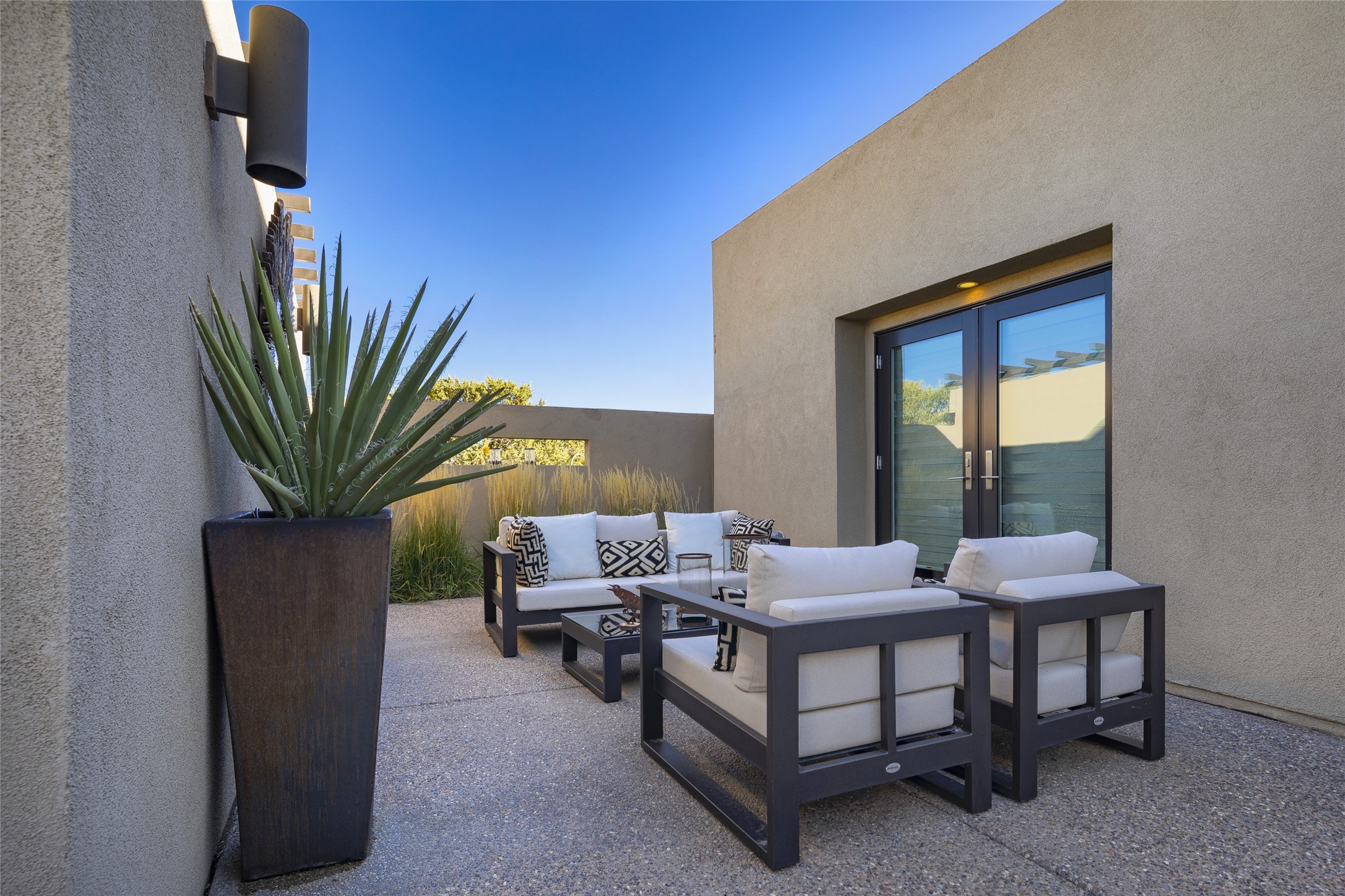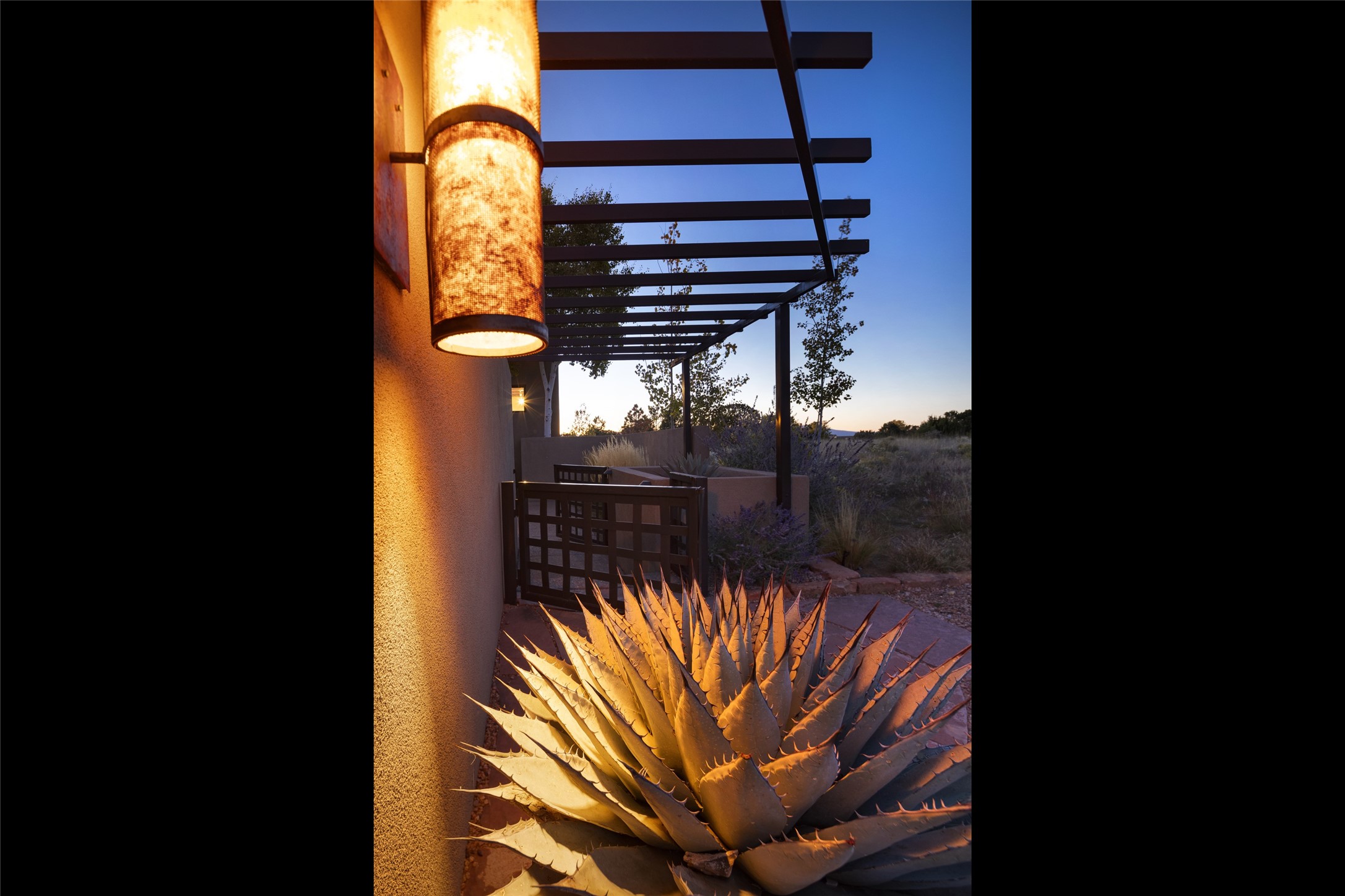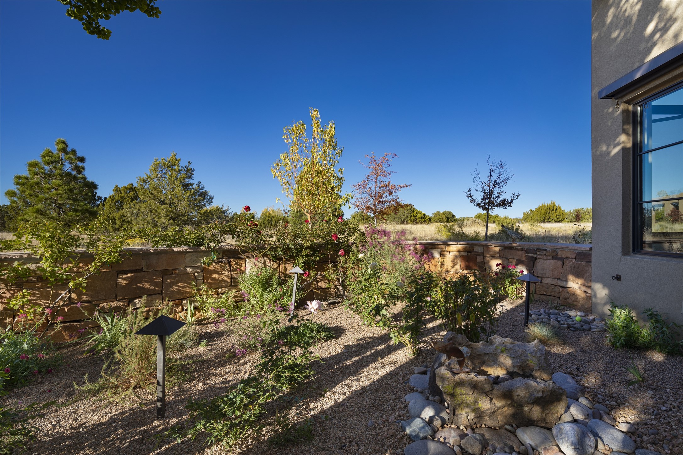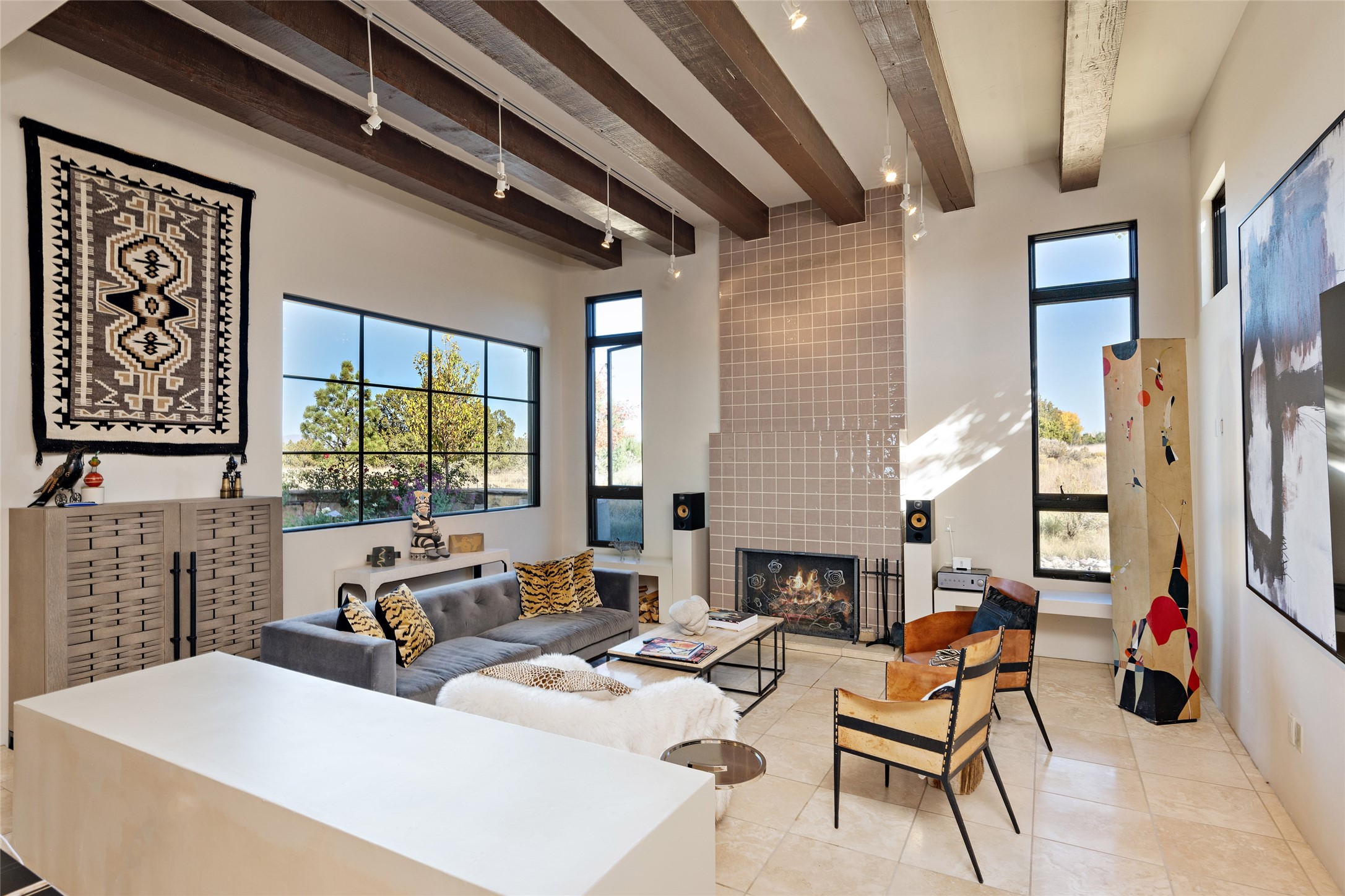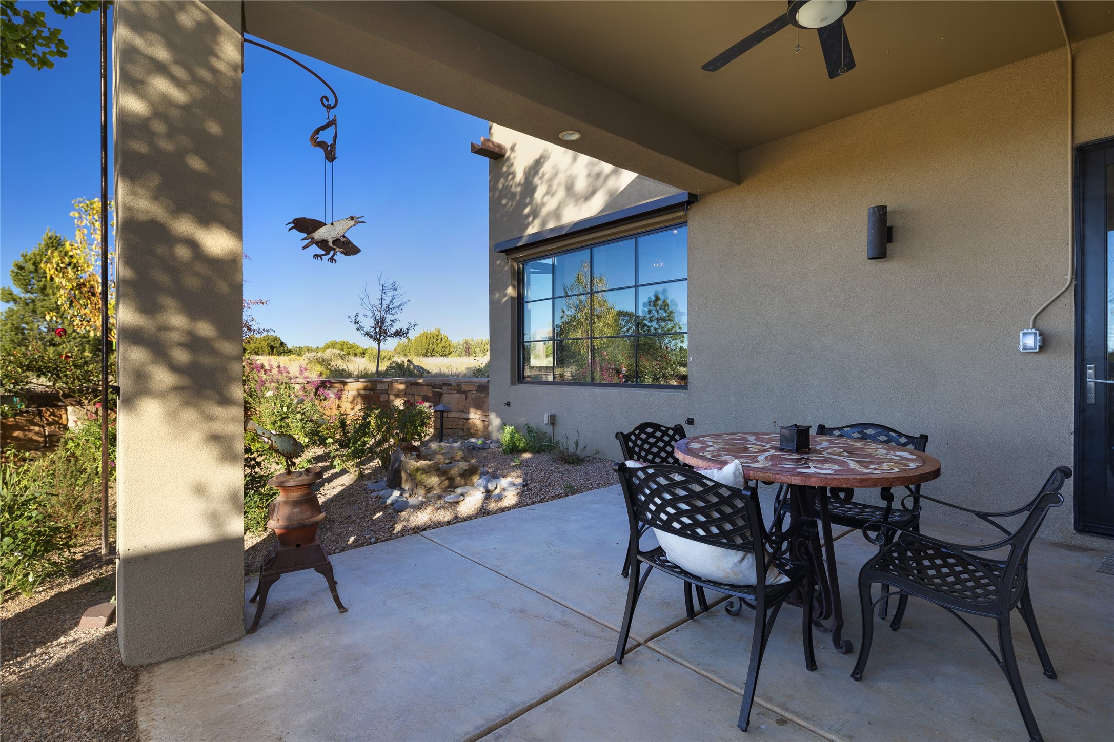 Sophisticated contemporary architecture, by renowned builder, Seth Anderson blended with luxury finishes, a resort-like backyard, and spectacular Mountain views are celebrated at this exciting Las Campanas residence. Designed to enjoy the ultimate Santa Fe lifestyle, this one of a kind residence, located within the master planned community Las Campanas, impresses with exceptional design which seamlessly incorporates the ultimate indoor and outdoor living experience with a newly added elevated portal and fireplace, a modern above ground spa, a substantial roof deck with 360-degree views, vibrant surround landscape, and three separate covered entertainment areas. This exquisite home offers excellent separation of space, with a private owner's suite complete portal access, a spa-like bath with a Victoria Albert soaking tub, a steam shower with glass accents which frame the aspen tree views, custom cabinets, and a spacious wrap around walk-in closet. Flexible design features include two additional bedrooms which share a full bath, plus a newly added modern office or ideal art studio with front courtyard access. The state-of-the-art chef's kitchen delights with Subzero and Wolf appliances, a large island with expansive seating, and a walk-in pantry. Located directly off the kitchen is the ultimate great room for entertaining, which was designed to integrate the surrounding natural landscape and mountain views, complete with a grand gas fireplace, Jemez and Sangre de Cristo Mountain views, and a formal dining area. The outdoor living experience is enhanced by deep portals with mountain views, surround aspen trees, rose gardens, and newly installed photovoltaic landscape lighting. Exceptional features include a spacious heated 3-car garage, a tranquil gated front entrance courtyard, exceptional natural light throughout, radiant in-floor heating with an updated boiler, and custom steel accents which add the highest level of contemporary design.
