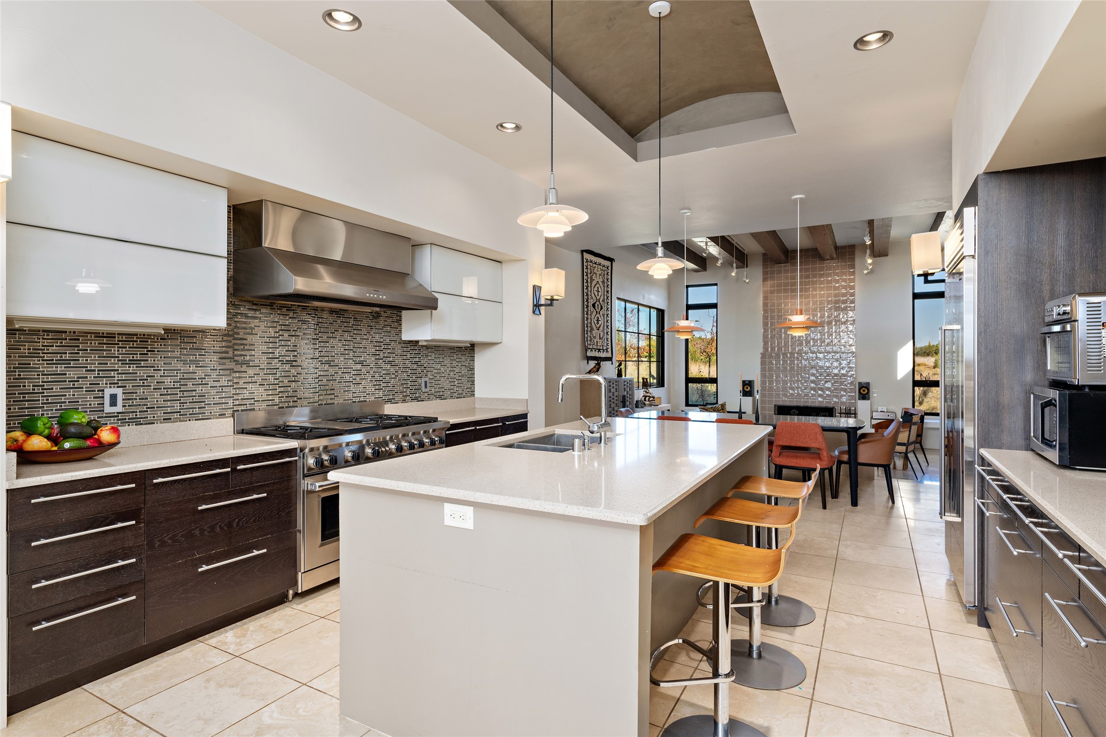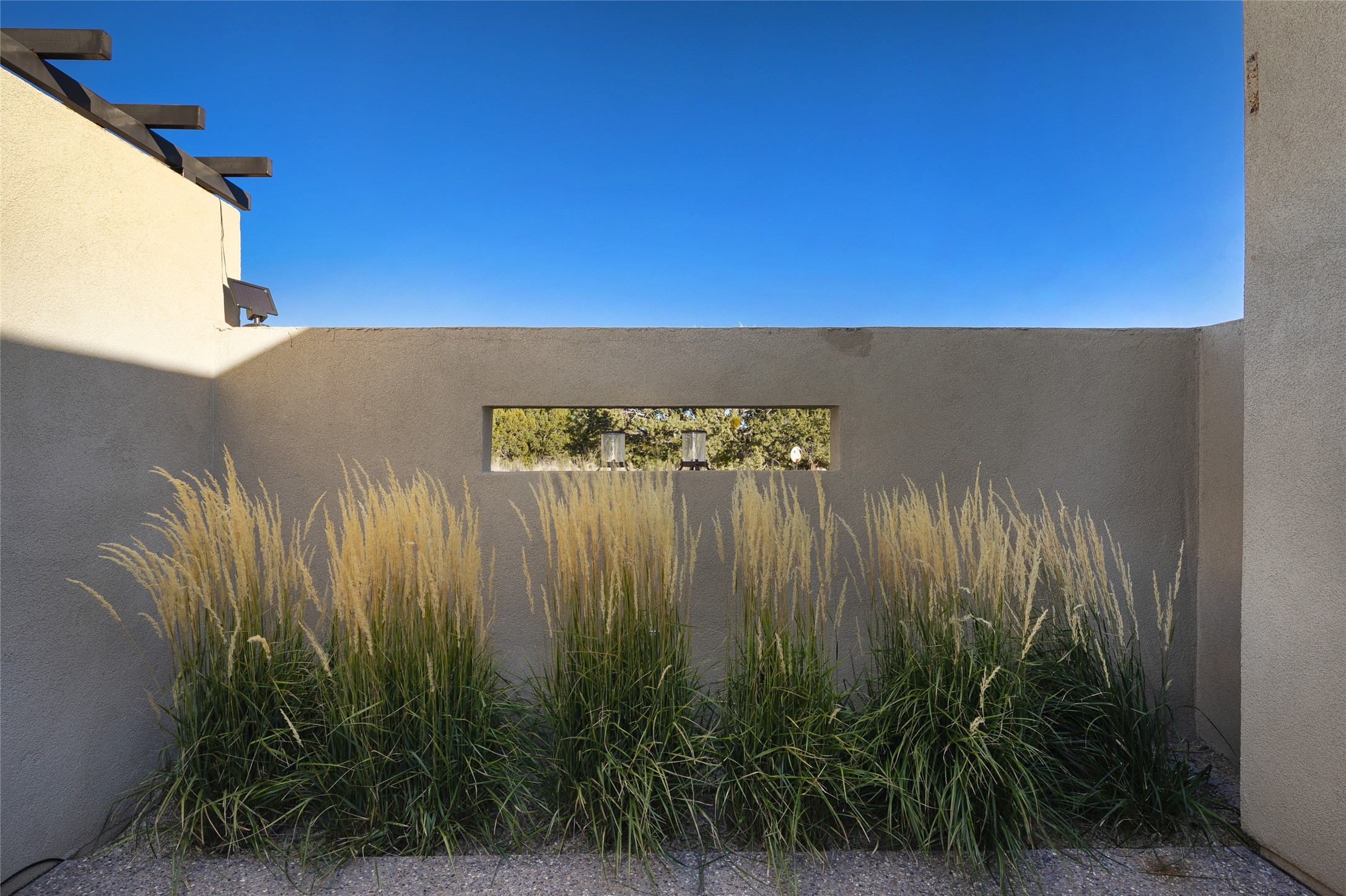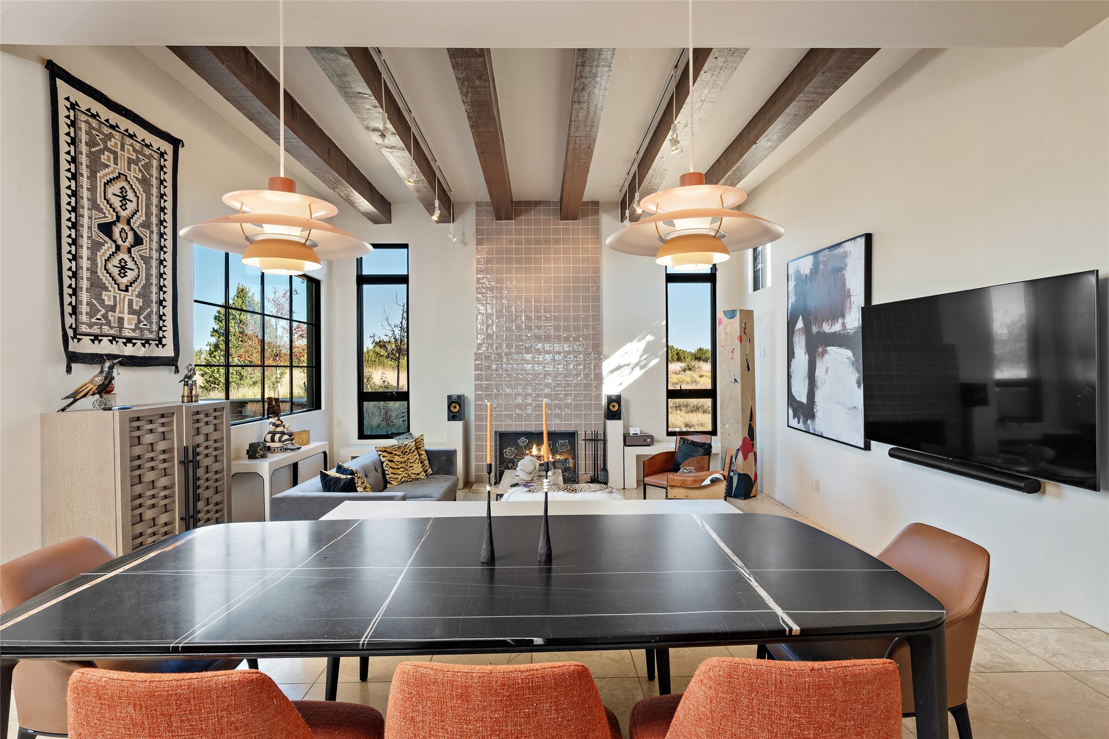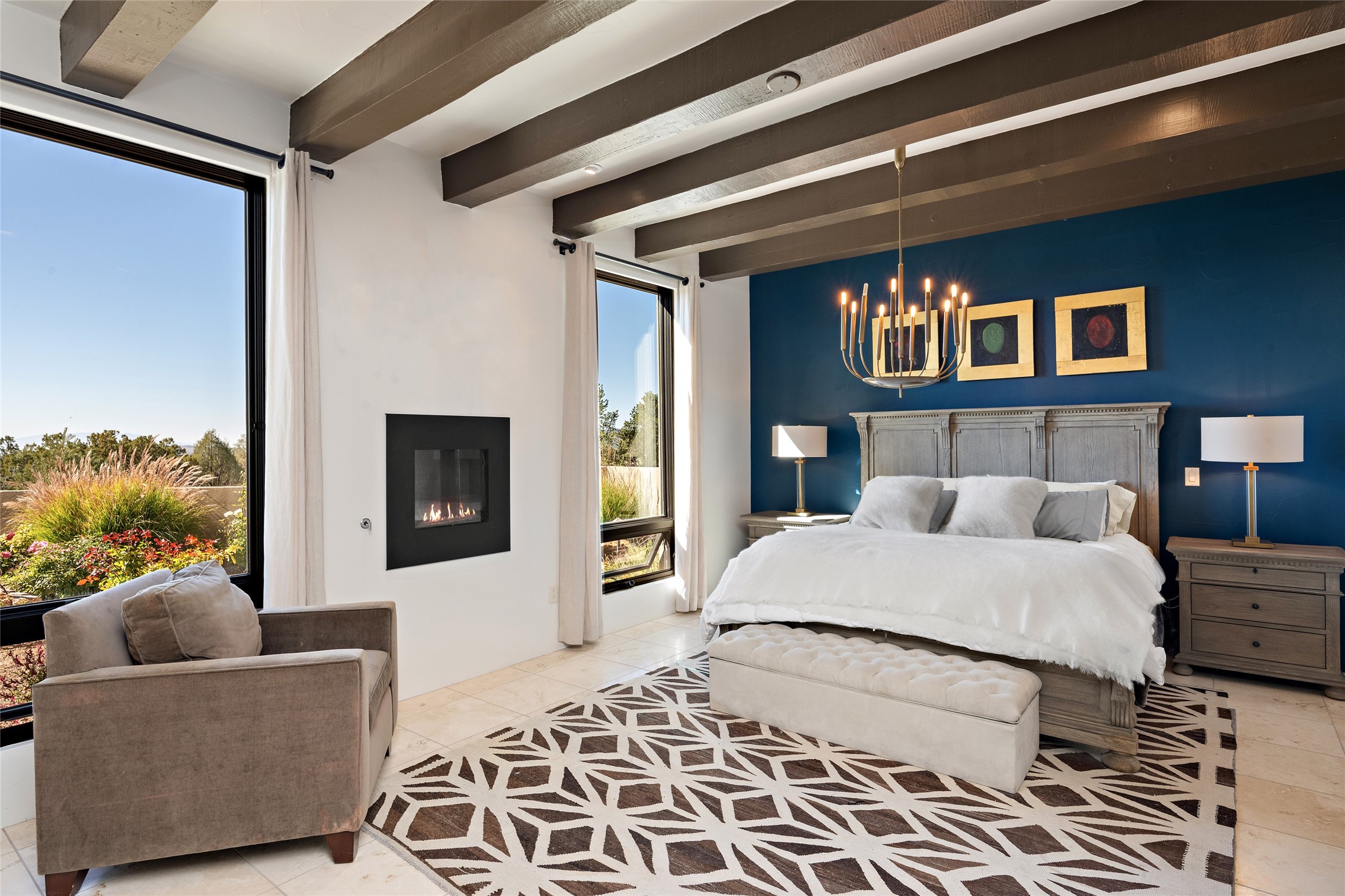 Sophisticated contemporary architecture, by renowned builder, Seth Anderson blended with luxury finishes, a resort-like backyard, and spectacular Mountain views are celebrated at this exciting Las Campanas residence. Designed to enjoy the ultimate Santa Fe lifestyle, this one of a kind residence, located within the master planned community Las Campanas, impresses with exceptional design which seamlessly incorporates the ultimate indoor and outdoor living experience with a newly added elevated portal and fireplace, a modern above ground spa, a substantial roof deck with 360-degree views, vibrant surround landscape, and three separate covered entertainment areas. This exquisite home offers excellent separation of space, with a private owner's suite complete portal access, a spa-like bath with a Victoria Albert soaking tub, a steam shower with glass accents which frame the aspen tree views, custom cabinets, and a spacious wrap around walk-in closet. Flexible design features include two additional bedrooms which share a full bath, plus a newly added modern office or ideal art studio with front courtyard access. The state-of-the-art chef's kitchen delights with Subzero and Wolf appliances, a large island with expansive seating, and a walk-in pantry. Located directly off the kitchen is the ultimate great room for entertaining, which was designed to integrate the surrounding natural landscape and mountain views, complete with a grand gas fireplace, Jemez and Sangre de Cristo Mountain views, and a formal dining area. The outdoor living experience is enhanced by deep portals with mountain views, surround aspen trees, rose gardens, and newly installed photovoltaic landscape lighting. Exceptional features include a spacious heated 3-car garage, a tranquil gated front entrance courtyard, exceptional natural light throughout, radiant in-floor heating with an updated boiler, and custom steel accents which add the highest level of contemporary design.