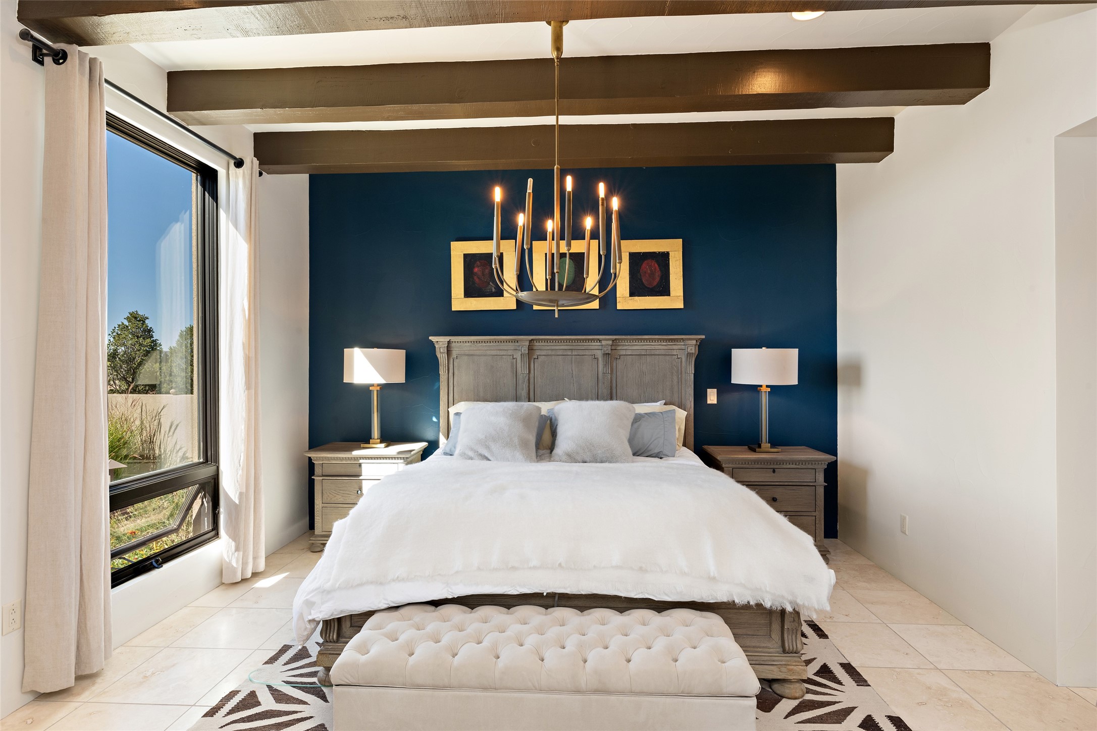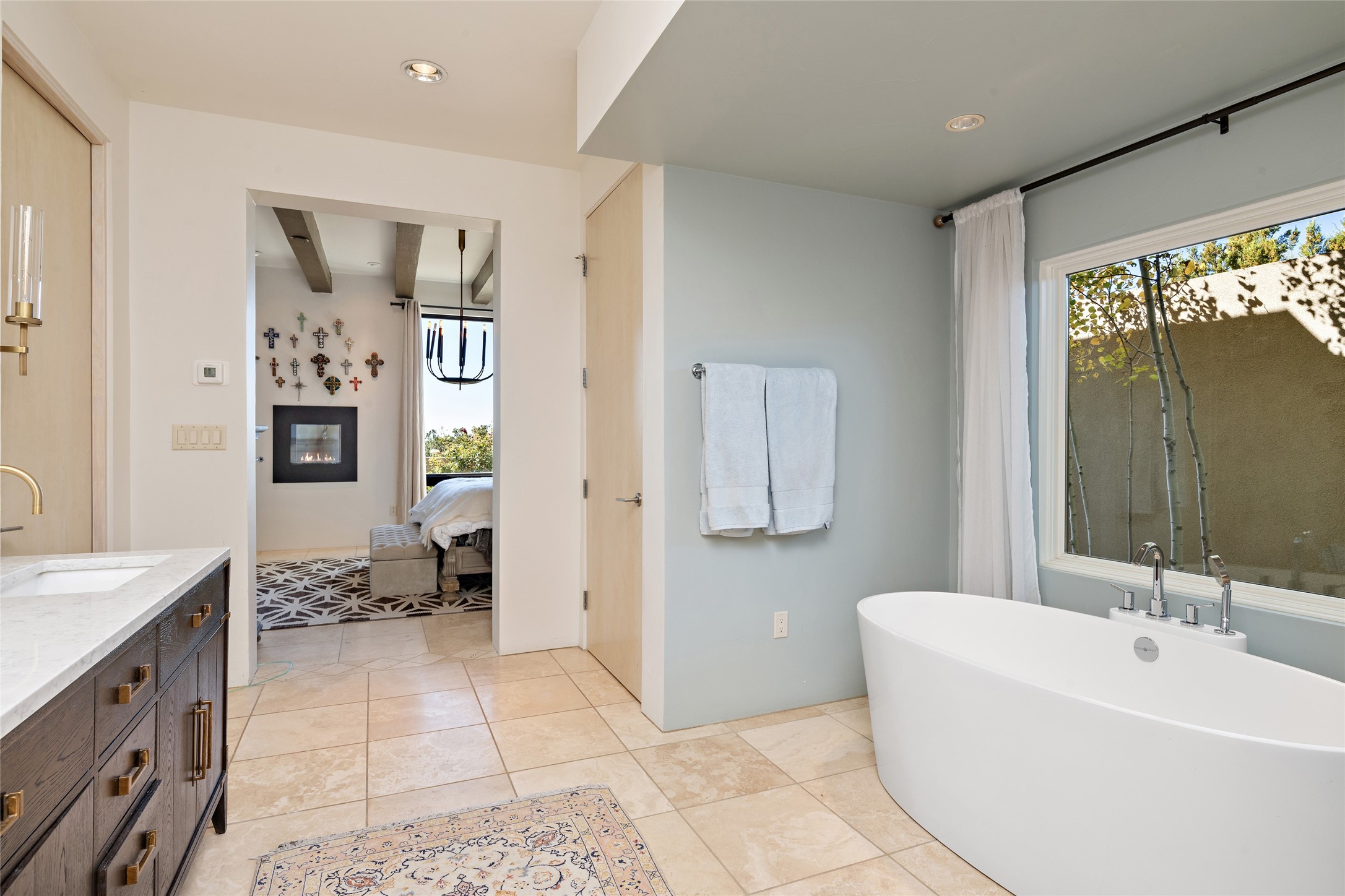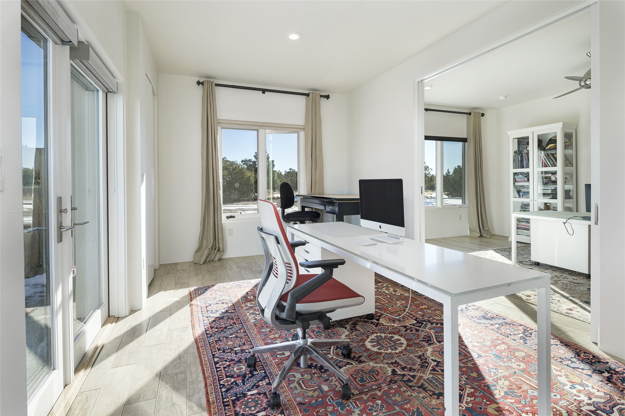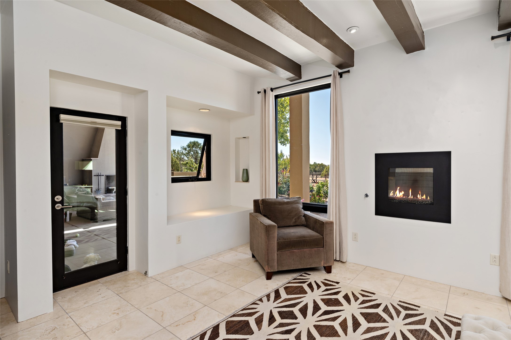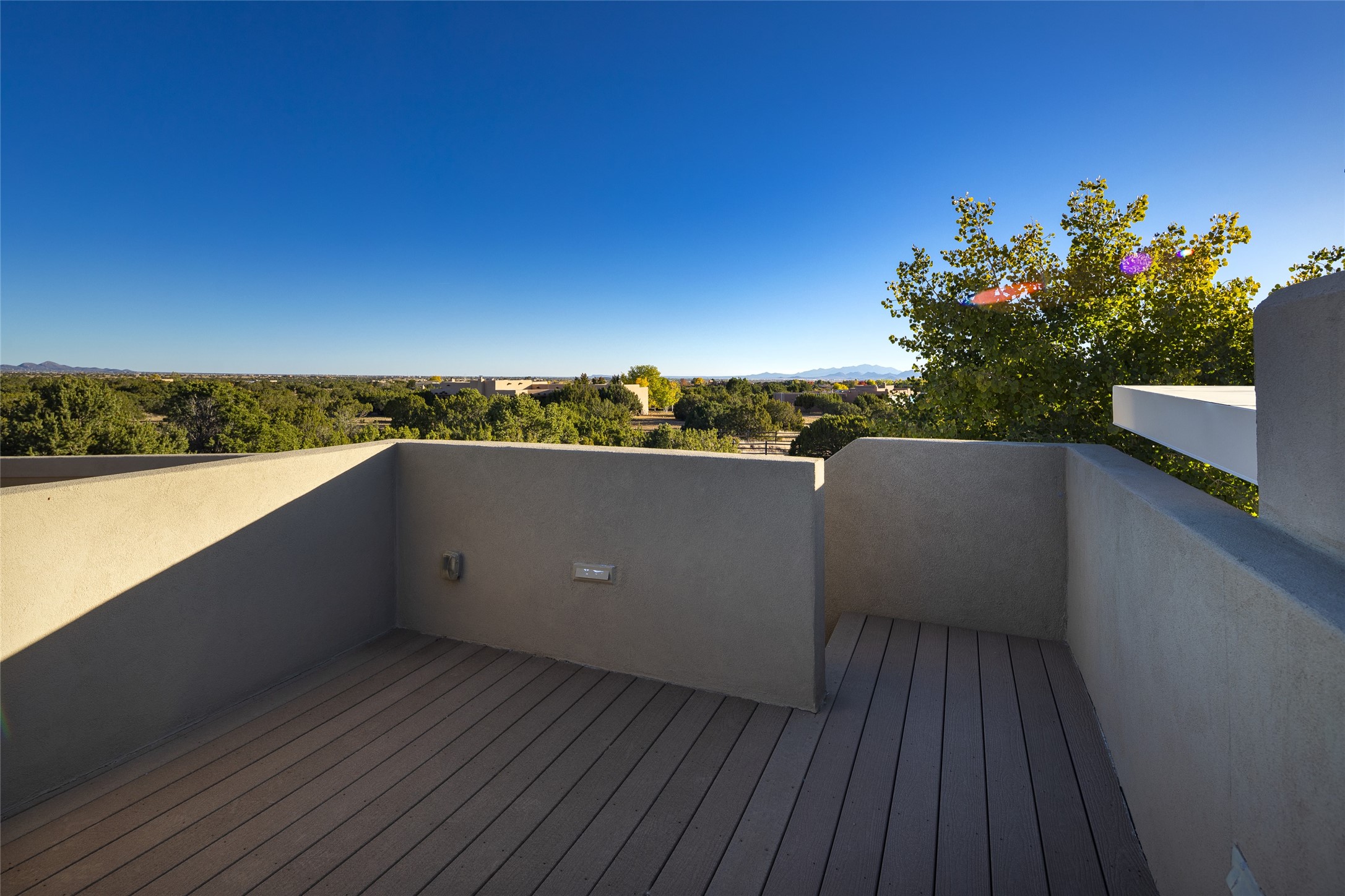 Sophisticated contemporary architecture, by renowned builder, Seth Anderson blended with luxury finishes, a resort-like backyard, and spectacular Mountain views are celebrated at this exciting Las Campanas residence. Designed to enjoy the ultimate Santa Fe lifestyle, this one of a kind residence, located within the master planned community Las Campanas, impresses with exceptional design which seamlessly incorporates the ultimate indoor and outdoor living experience with a newly added elevated portal and fireplace, a modern above ground spa, a substantial roof deck with 360-degree views, vibrant surround landscape, and three separate covered entertainment areas. This exquisite home offers excellent separation of space, with a private owner's suite complete portal access, a spa-like bath with a Victoria Albert soaking tub, a steam shower with glass accents which frame the aspen tree views, custom cabinets, and a spacious wrap around walk-in closet. Flexible design features include two additional bedrooms which share a full bath, plus a newly added modern office or ideal art studio with front courtyard access. The state-of-the-art chef's kitchen delights with Subzero and Wolf appliances, a large island with expansive seating, and a walk-in pantry. Located directly off the kitchen is the ultimate great room for entertaining, which was designed to integrate the surrounding natural landscape and mountain views, complete with a grand gas fireplace, Jemez and Sangre de Cristo Mountain views, and a formal dining area. The outdoor living experience is enhanced by deep portals with mountain views, surround aspen trees, rose gardens, and newly installed photovoltaic landscape lighting. Exceptional features include a spacious heated 3-car garage, a tranquil gated front entrance courtyard, exceptional natural light throughout, radiant in-floor heating with an updated boiler, and custom steel accents which add the highest level of contemporary design.