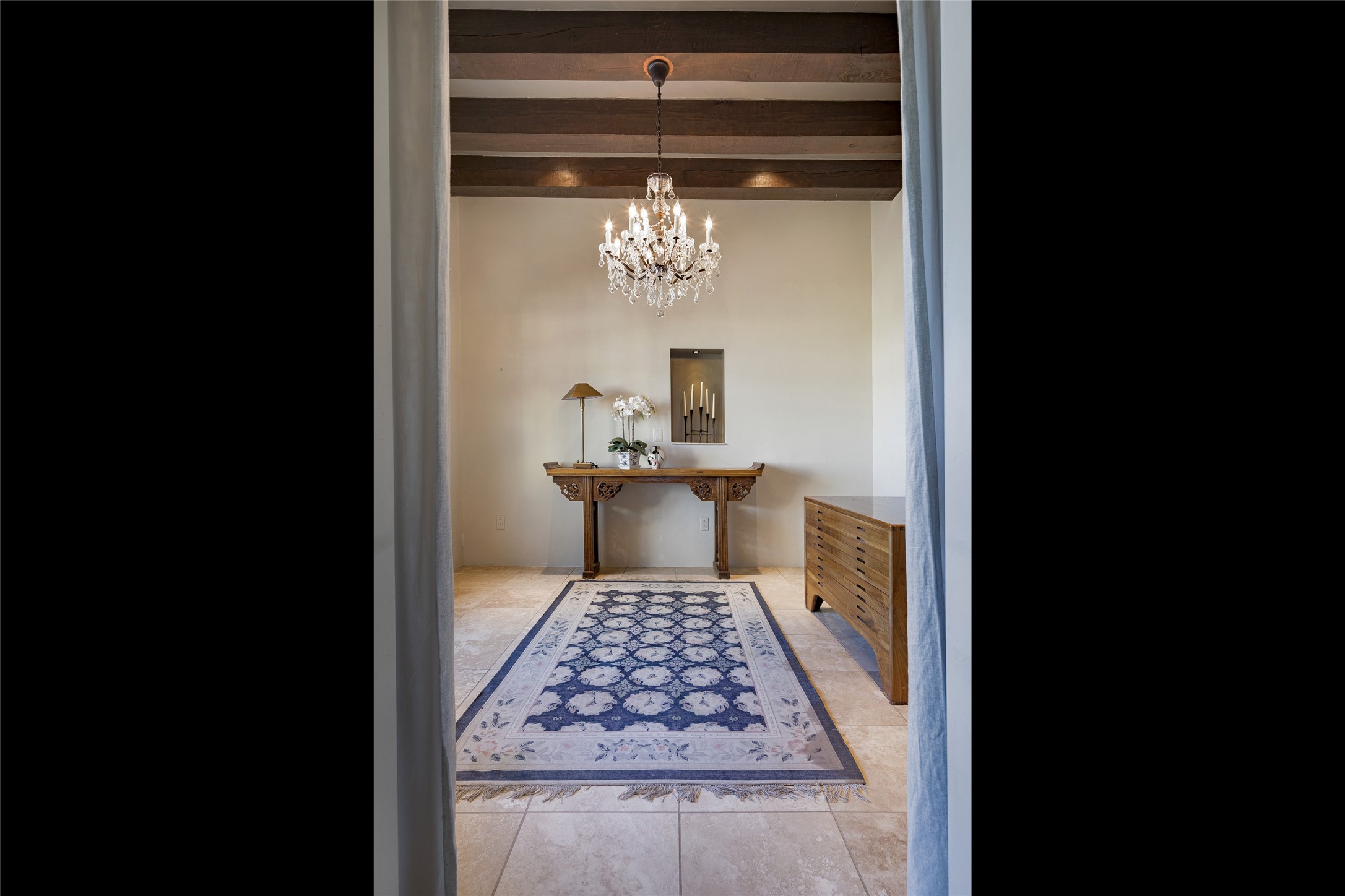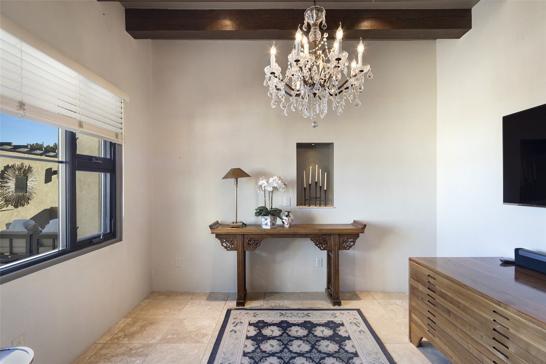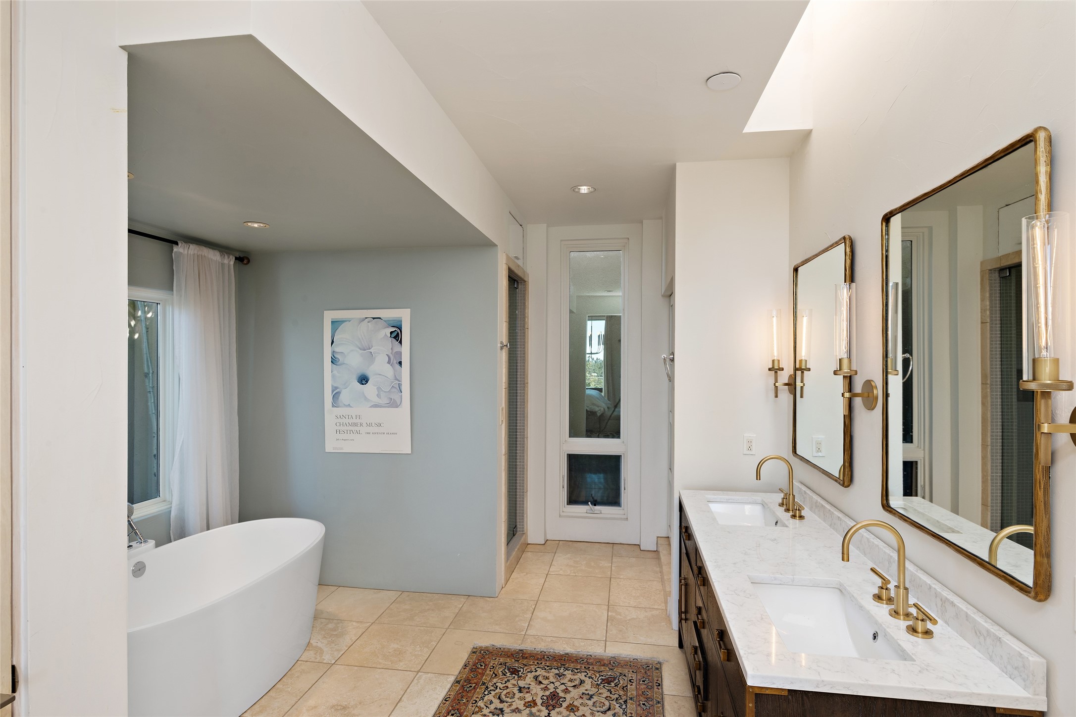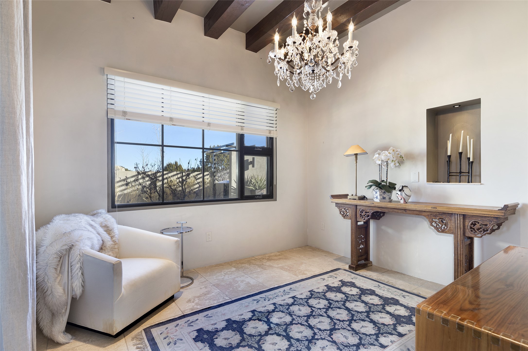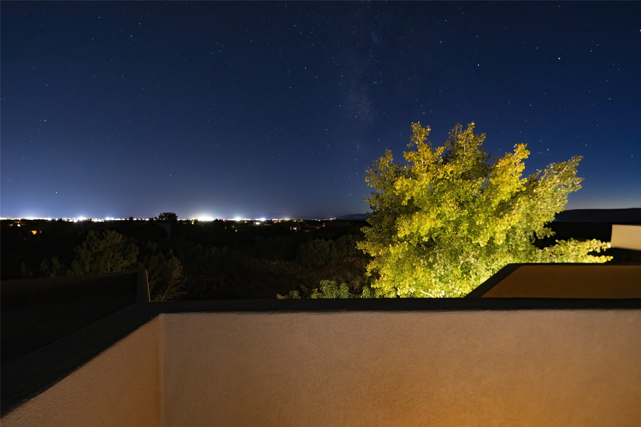 Sophisticated contemporary architecture, by renowned builder, Seth Anderson blended with luxury finishes, a resort-like backyard, and spectacular Mountain views are celebrated at this exciting Las Campanas residence. Designed to enjoy the ultimate Santa Fe lifestyle, this one of a kind residence, located within the master planned community Las Campanas, impresses with exceptional design which seamlessly incorporates the ultimate indoor and outdoor living experience with a newly added elevated portal and fireplace, a modern above ground spa, a substantial roof deck with 360-degree views, vibrant surround landscape, and three separate covered entertainment areas. This exquisite home offers excellent separation of space, with a private owner's suite complete portal access, a spa-like bath with a Victoria Albert soaking tub, a steam shower with glass accents which frame the aspen tree views, custom cabinets, and a spacious wrap around walk-in closet. Flexible design features include two additional bedrooms which share a full bath, plus a newly added modern office or ideal art studio with front courtyard access. The state-of-the-art chef's kitchen delights with Subzero and Wolf appliances, a large island with expansive seating, and a walk-in pantry. Located directly off the kitchen is the ultimate great room for entertaining, which was designed to integrate the surrounding natural landscape and mountain views, complete with a grand gas fireplace, Jemez and Sangre de Cristo Mountain views, and a formal dining area. The outdoor living experience is enhanced by deep portals with mountain views, surround aspen trees, rose gardens, and newly installed photovoltaic landscape lighting. Exceptional features include a spacious heated 3-car garage, a tranquil gated front entrance courtyard, exceptional natural light throughout, radiant in-floor heating with an updated boiler, and custom steel accents which add the highest level of contemporary design.