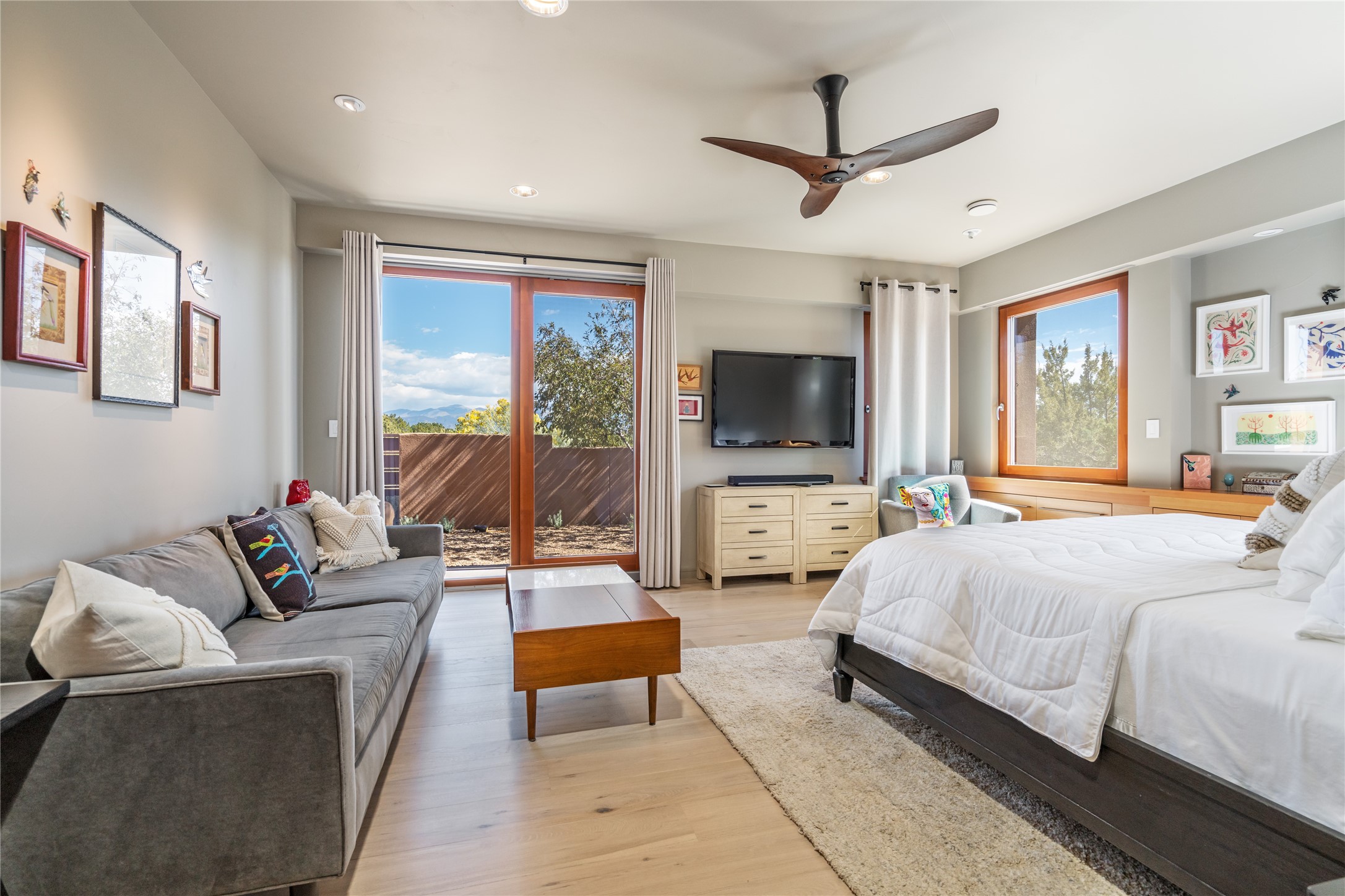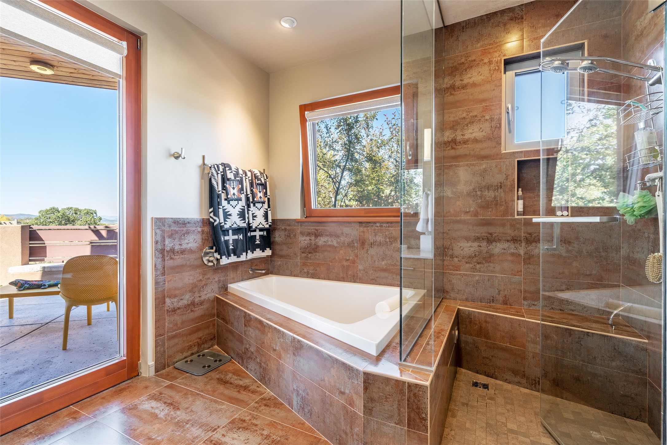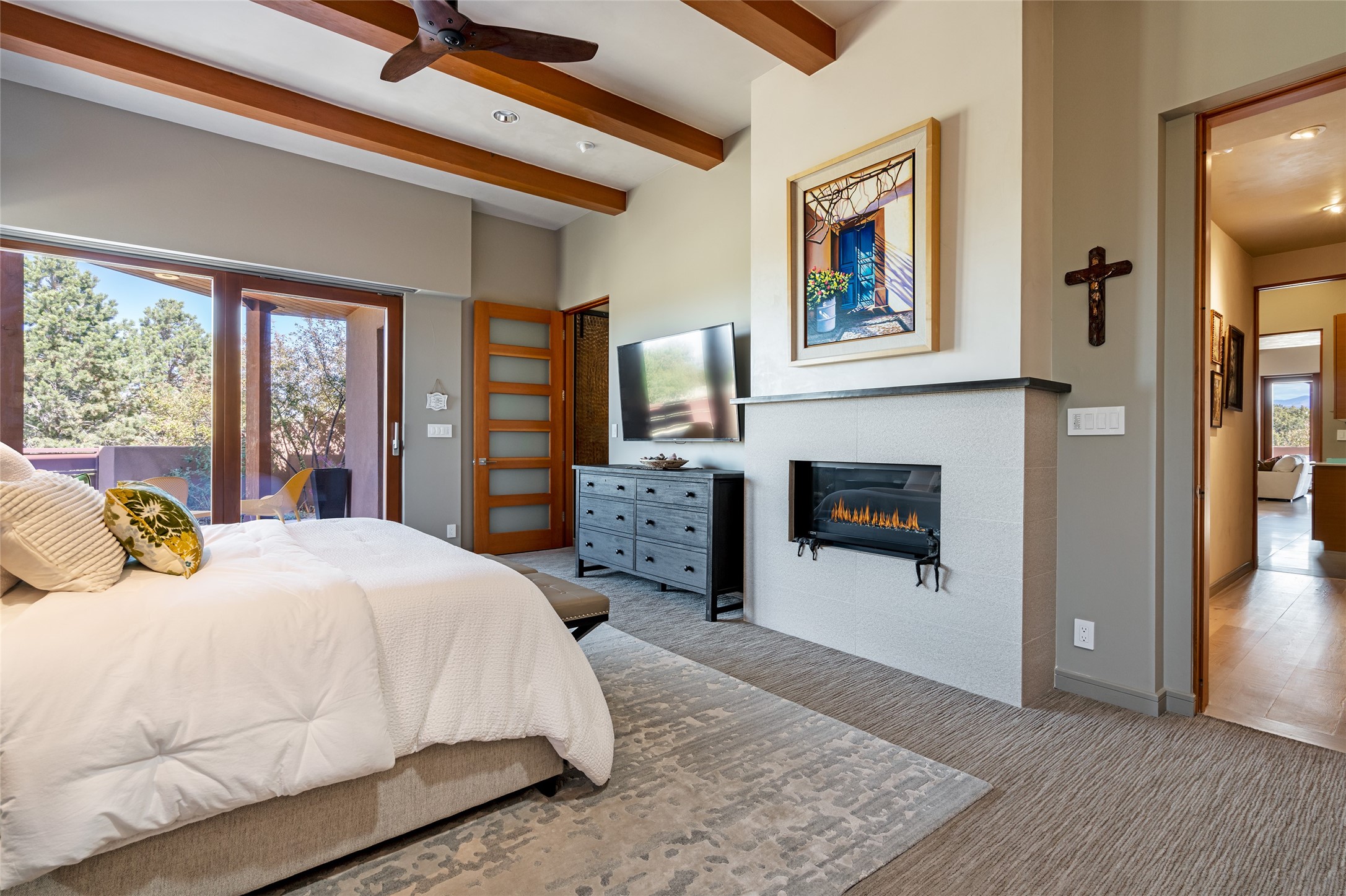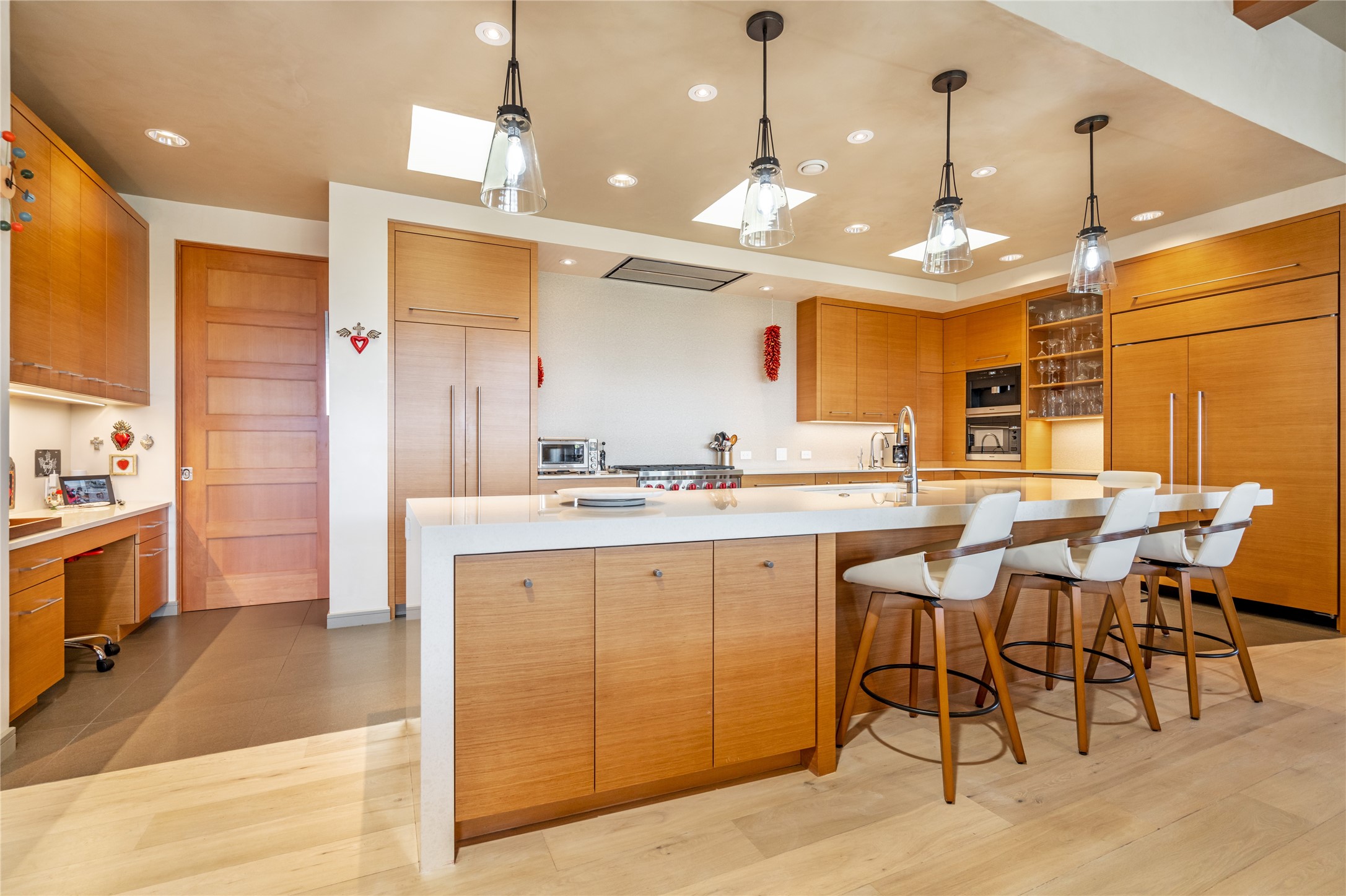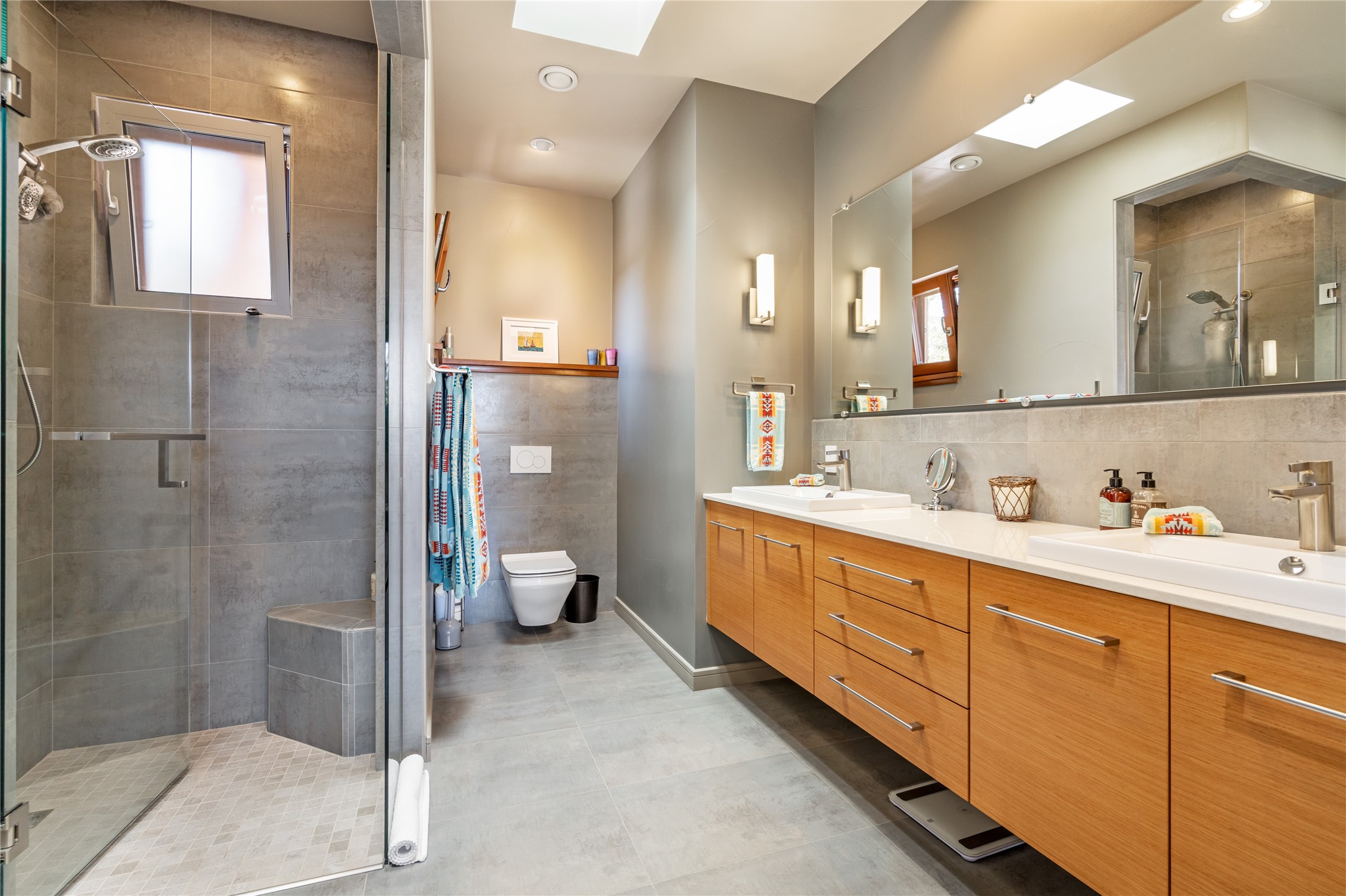 Contemporary living with convenient access to downtown and connection to nature, this stunning home offers the best of all worlds. Spectacular mountain views in all directions from this 1.66 acre lot and 3 bed, 3 bath 'smart home' with highlights including solar electricity and solar water heating system, in-floor radiant heating and cooling, a whole-home water filtration system and whole-home ventilation system to maintain air quality.If you are so inclined, you could run your home using simple apps on your mobile phone. The solar production and consumption, Lutron lighting and window shades, heating and cooling, home security, irrigation system and more can be accessed when you are away from home. This sleek and welcoming home also includes 2 fireplaces, doors and windows by Siegenia that provide energy efficiency and security, high-end Wolf, Sub-Zero, Electrolux and Miele appliances, and green features including a water catchment system that feeds into a 2,000 gal water cistern. Travelers, please note the three-car garage includes a space tall and deep enough for an RV.These incredible features are complemented by a stylish contemporary interior with flex space for an office or home gym, and elegant outdoor spaces including a courtyard and two terraces that are ideal for sunrises and sunsets, peaceful morning coffees and evening entertaining.Experience the beauty and cutting-edge offerings of this advanced home.