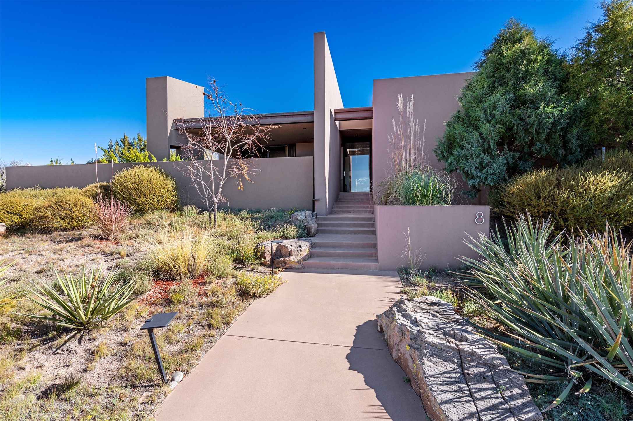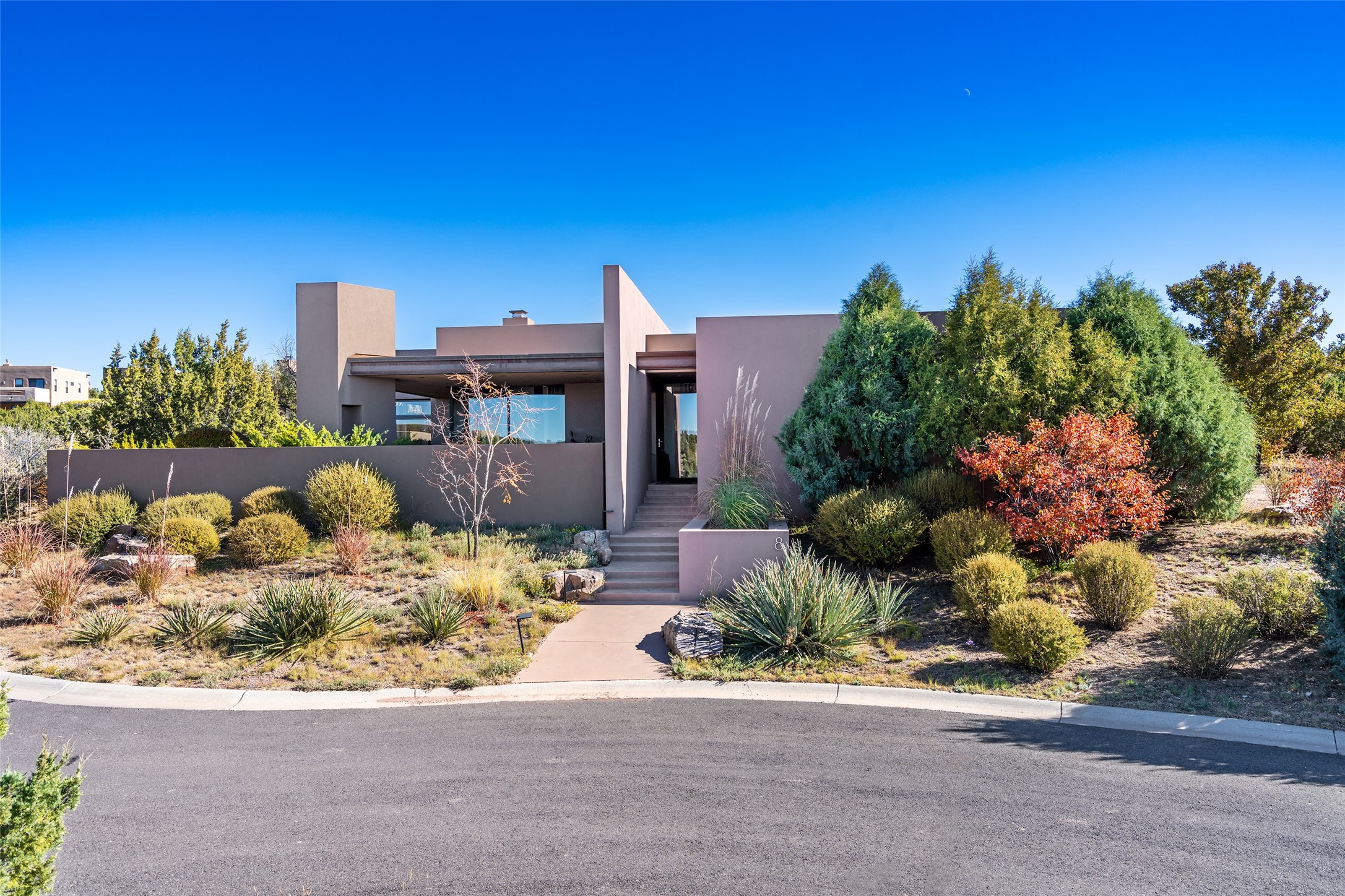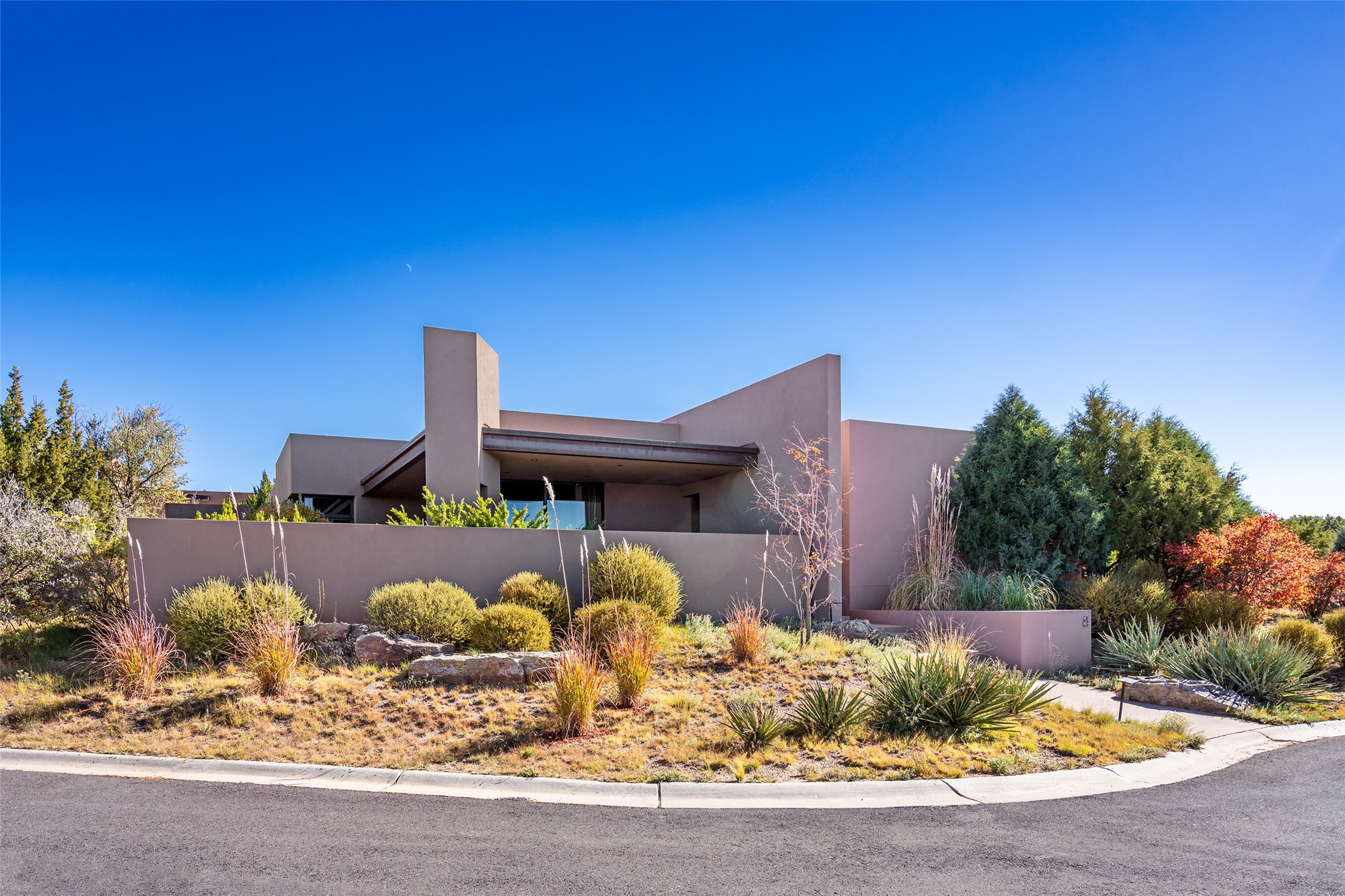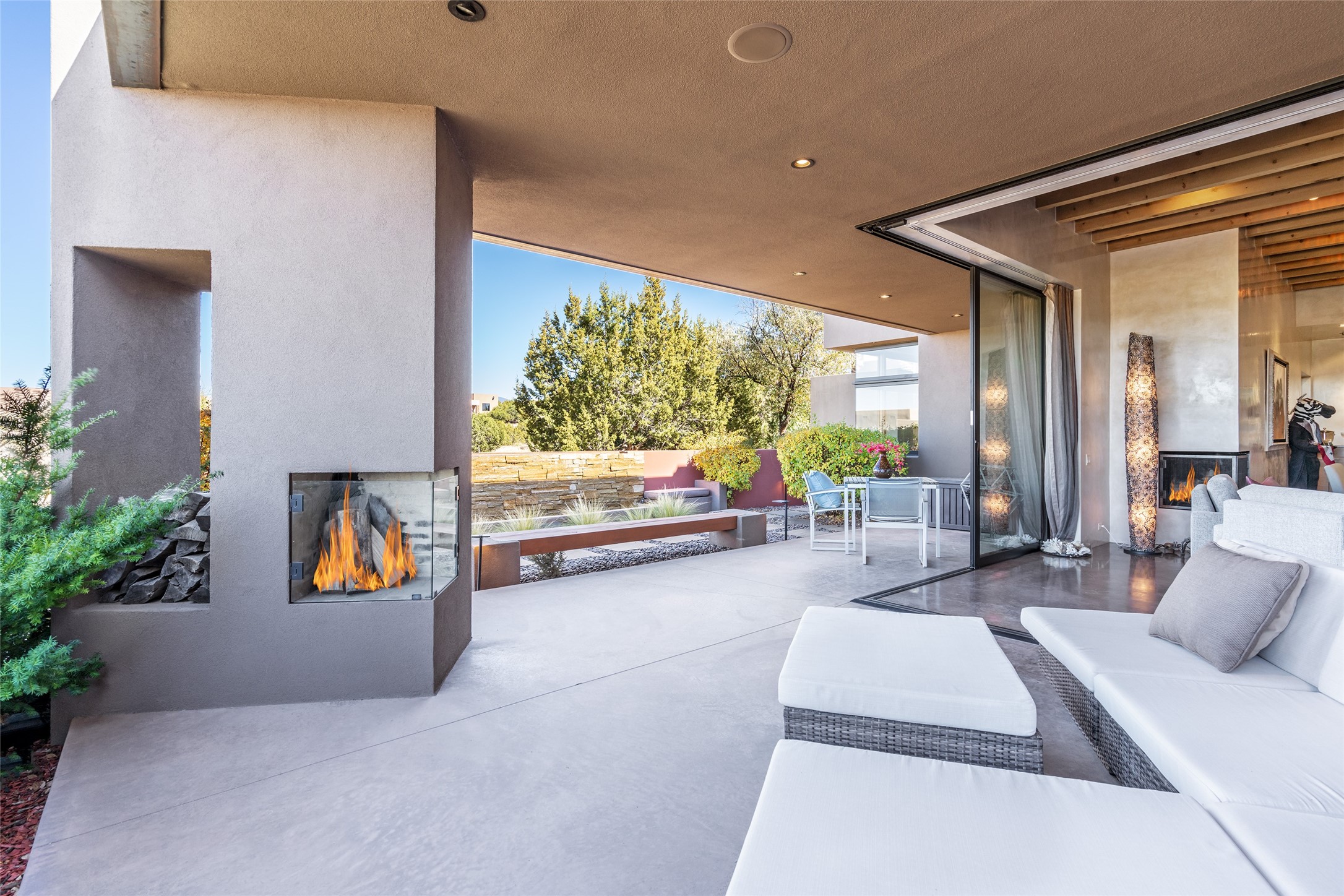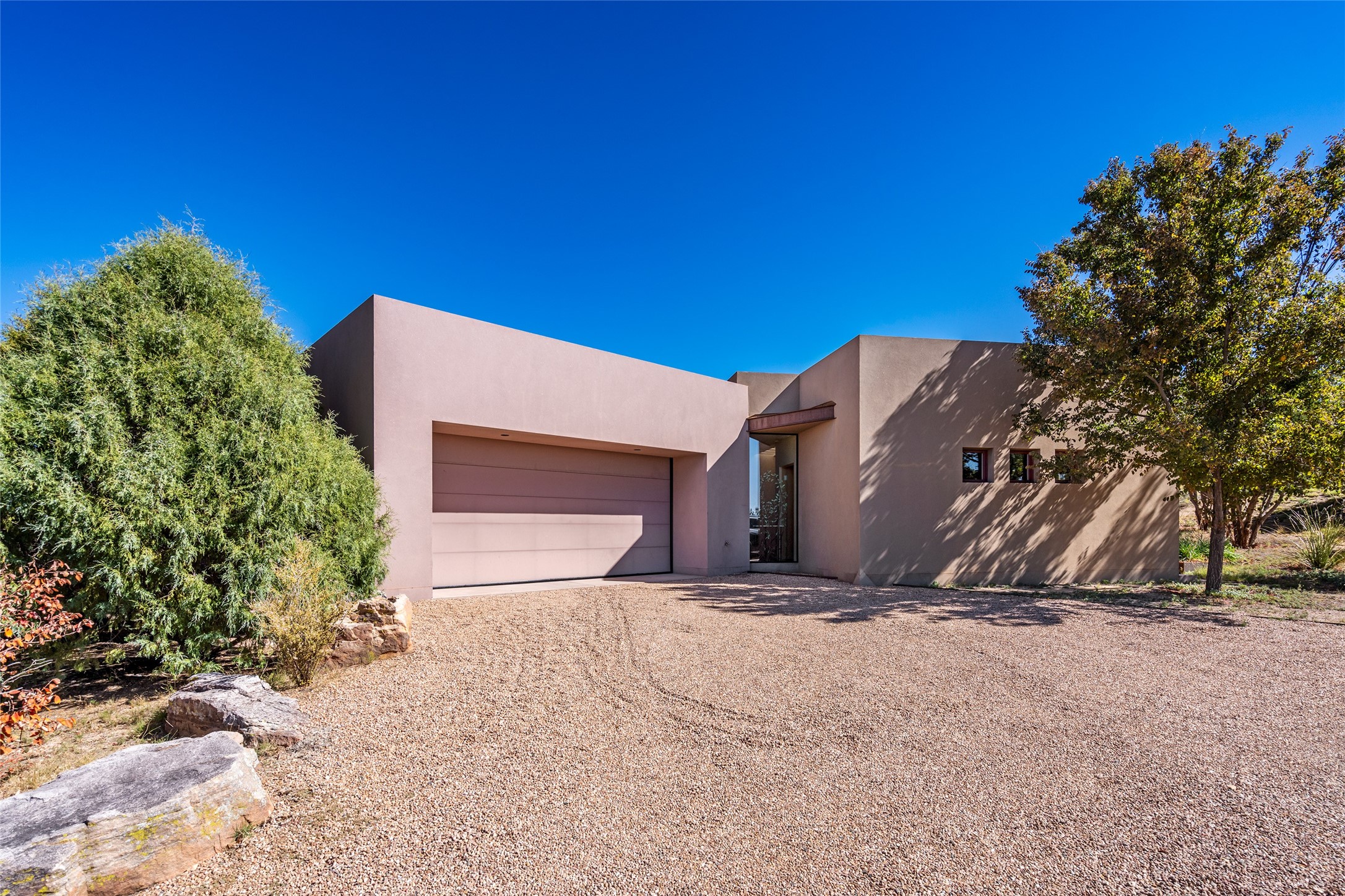 A harmonious fusion of architectural beauty and timeless style, this home stands as a pinnacle of Southwest Contemporary design. Designed by esteemed architect Robert Zachry, AIA, and meticulously crafted by Michael Hurlocker, this 2008 Parade of Homes winner for "Most Creative and Innovative," "Best Craftsmanship," and "Best Exterior Character" will immediately reward. Upon entering through the glass front door, you are immediately aware of the uniqueness of this home. The main living area with dual-sided fireplace and remote-controlled wall-to-wall glass doors seamlessly open to a wraparound portal with fireplace and custom-built wall water feature, providing the perfect indoor-outdoor luxury retreat. The modern and elegant kitchen, adorned with sleek cabinetry and high-end finishes, island seating, informal dining area and private patio ideal for outdoor grilling and gatherings. This home is also equipped with modern comforts, such as central air conditioning, radiant in-floor heating, spa like bath, solar panels for hot water heater and heating, cistern for watering the professionally landscaped grounds. Every aspect transcends time. It's not just a home; it's a statement of enduring excellence. Don't miss this opportunity to own the art of living in a home where innovation, craftsmanship, and style unite to create an extraordinary living environment.
