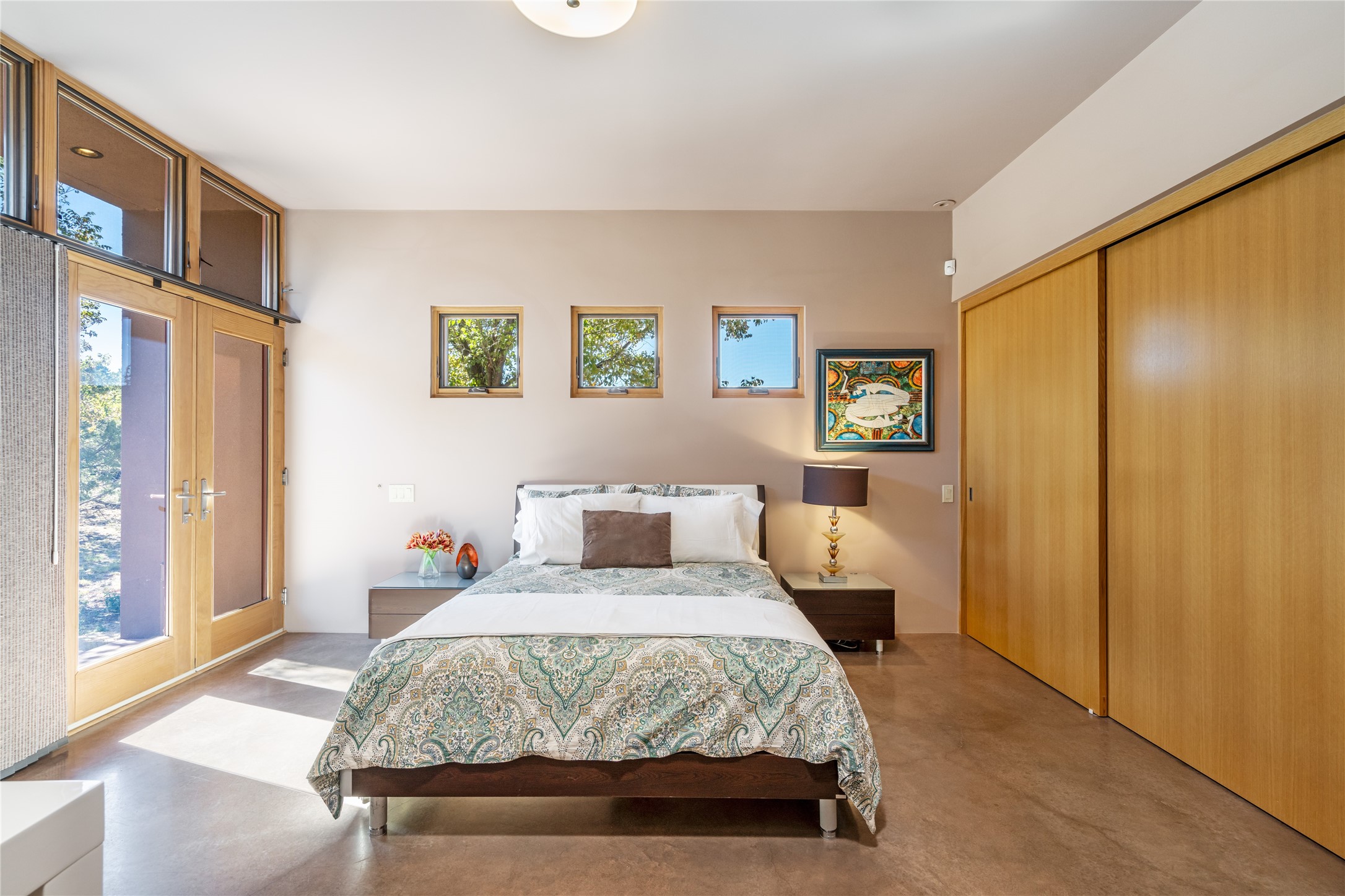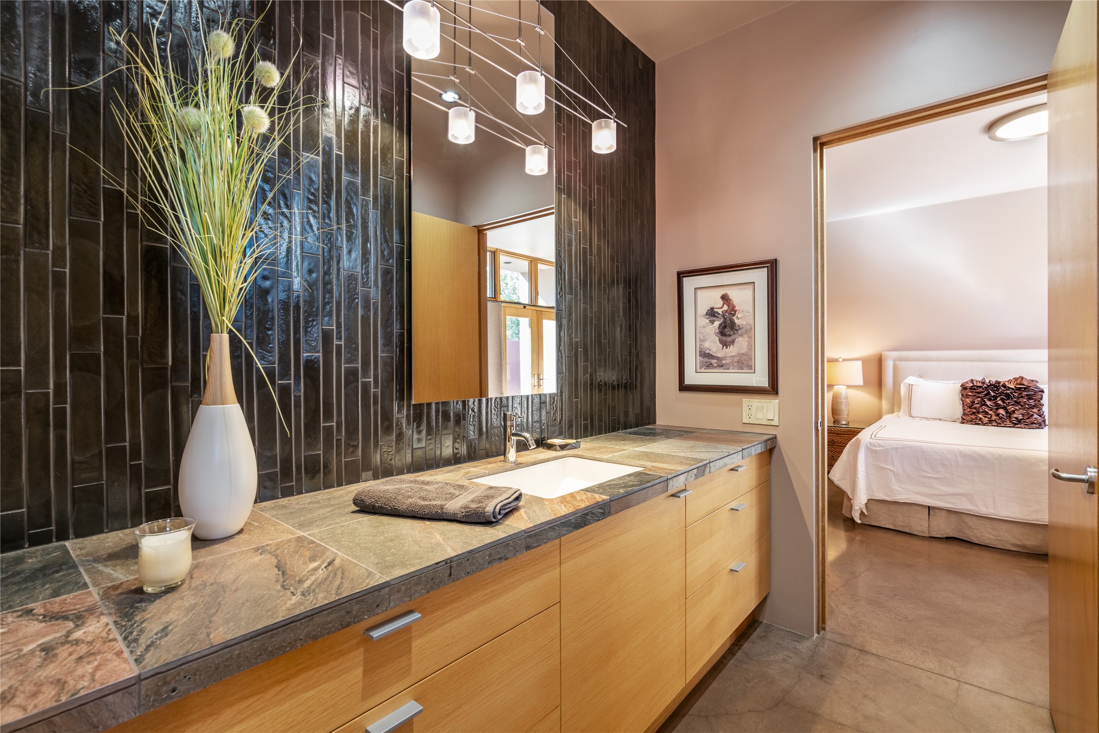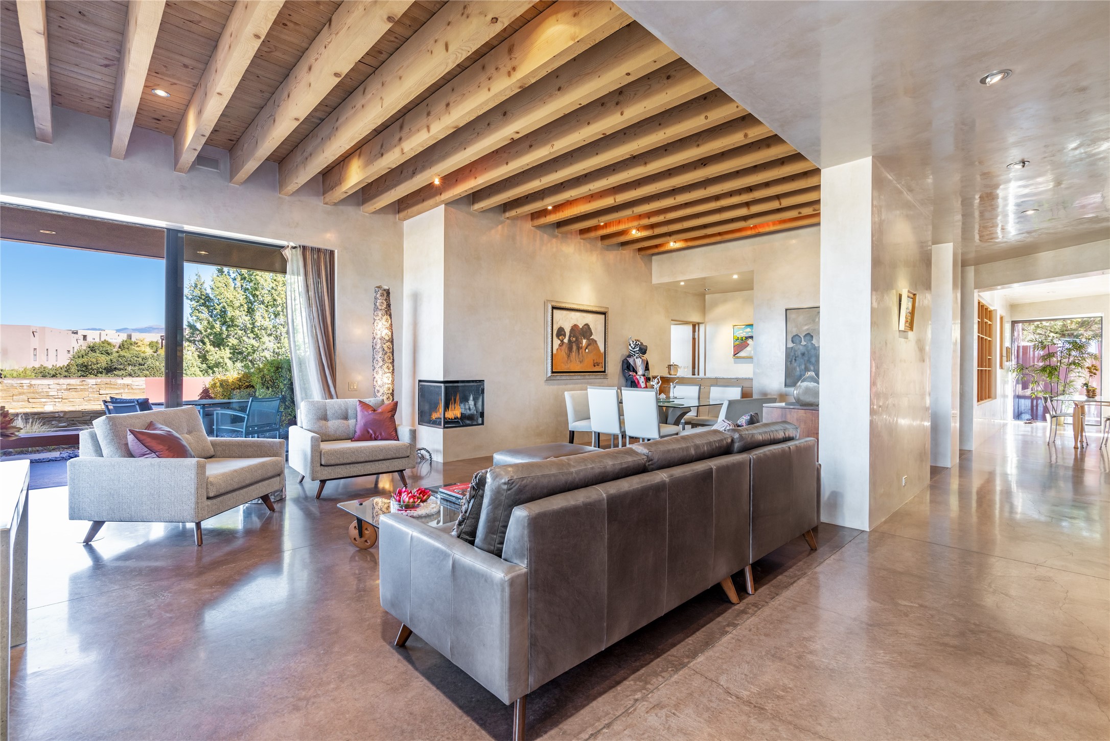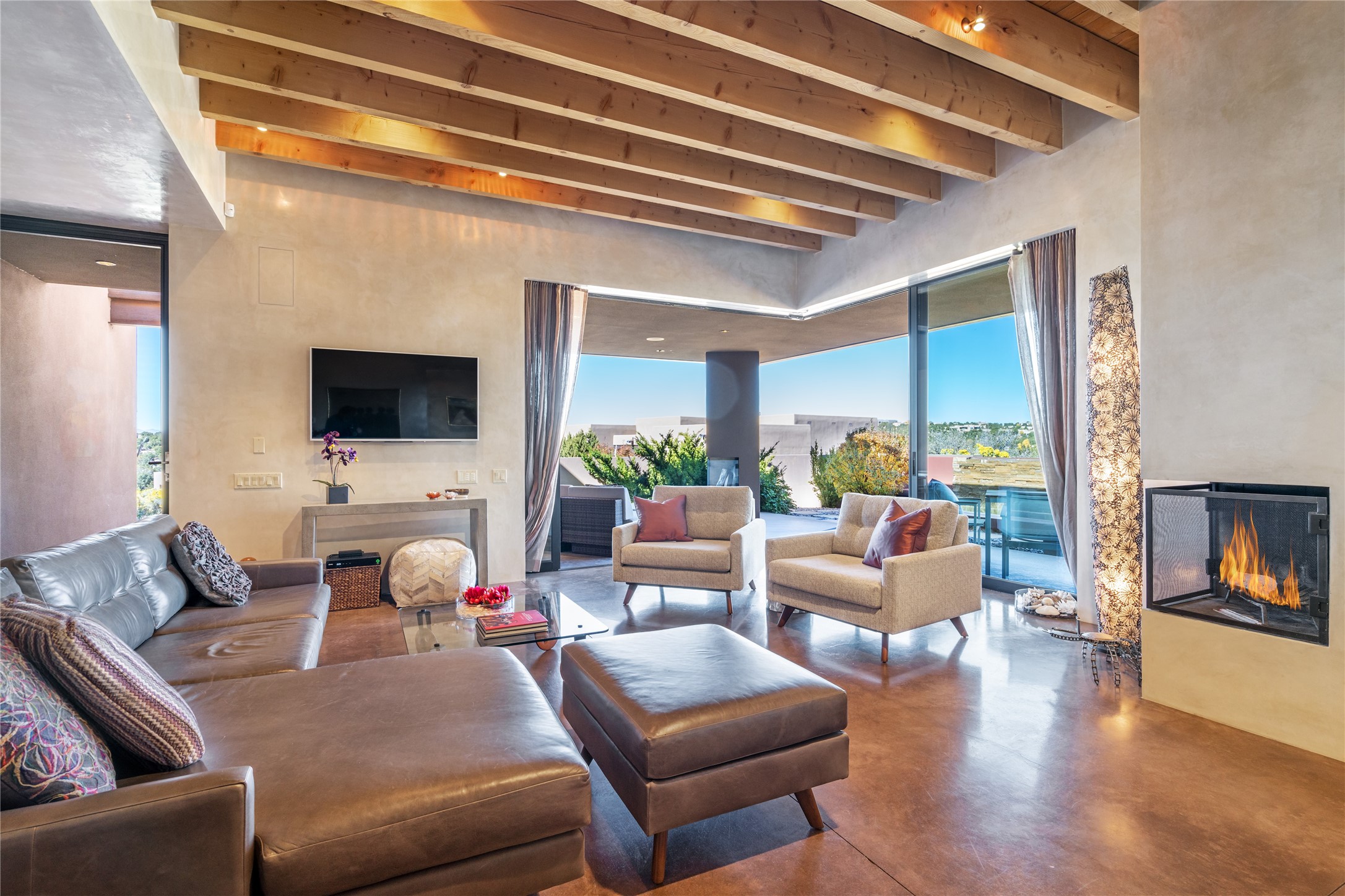 A harmonious fusion of architectural beauty and timeless style, this home stands as a pinnacle of Southwest Contemporary design. Designed by esteemed architect Robert Zachry, AIA, and meticulously crafted by Michael Hurlocker, this 2008 Parade of Homes winner for "Most Creative and Innovative," "Best Craftsmanship," and "Best Exterior Character" will immediately reward. Upon entering through the glass front door, you are immediately aware of the uniqueness of this home. The main living area with dual-sided fireplace and remote-controlled wall-to-wall glass doors seamlessly open to a wraparound portal with fireplace and custom-built wall water feature, providing the perfect indoor-outdoor luxury retreat. The modern and elegant kitchen, adorned with sleek cabinetry and high-end finishes, island seating, informal dining area and private patio ideal for outdoor grilling and gatherings. This home is also equipped with modern comforts, such as central air conditioning, radiant in-floor heating, spa like bath, solar panels for hot water heater and heating, cistern for watering the professionally landscaped grounds. Every aspect transcends time. It's not just a home; it's a statement of enduring excellence. Don't miss this opportunity to own the art of living in a home where innovation, craftsmanship, and style unite to create an extraordinary living environment.