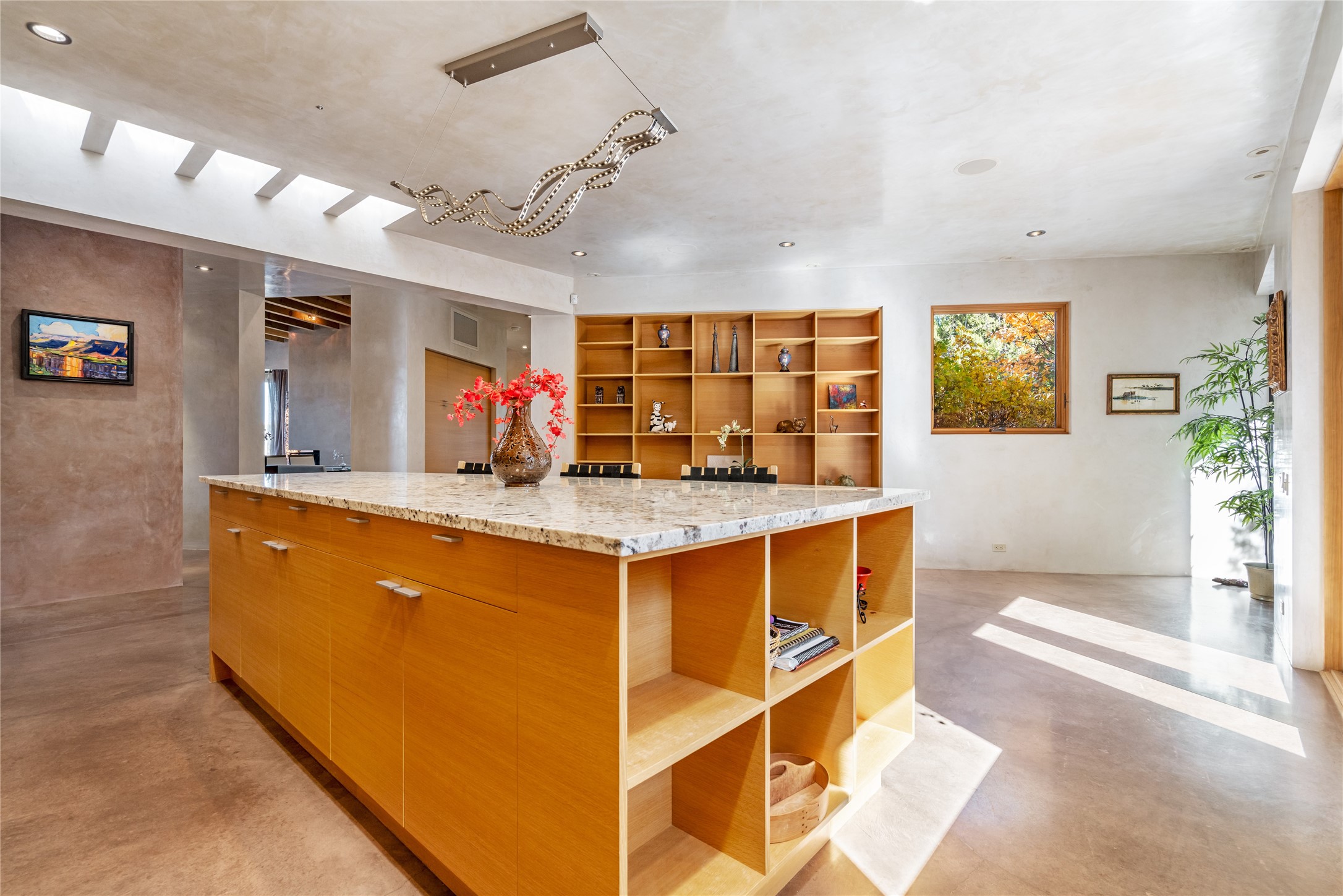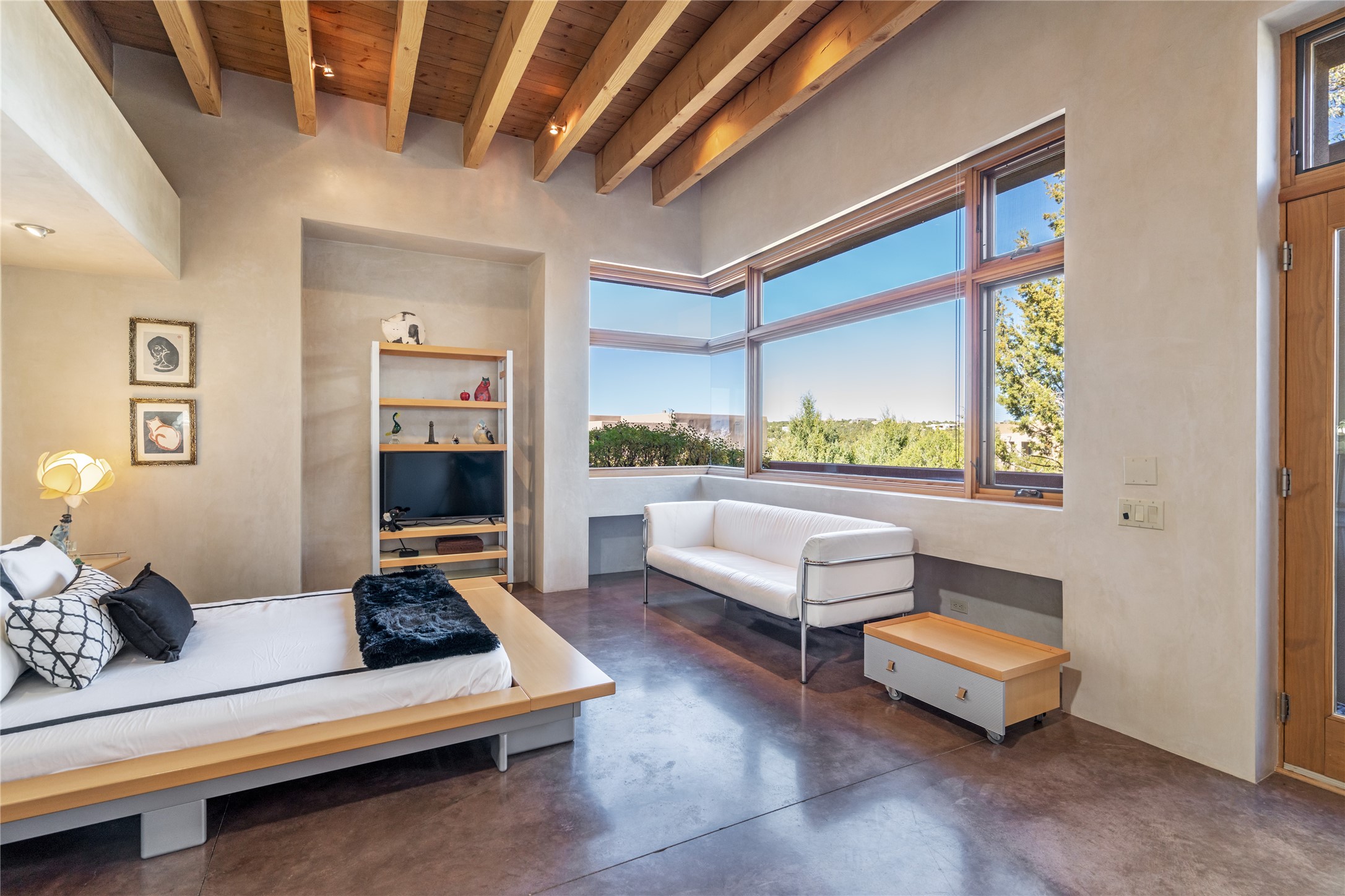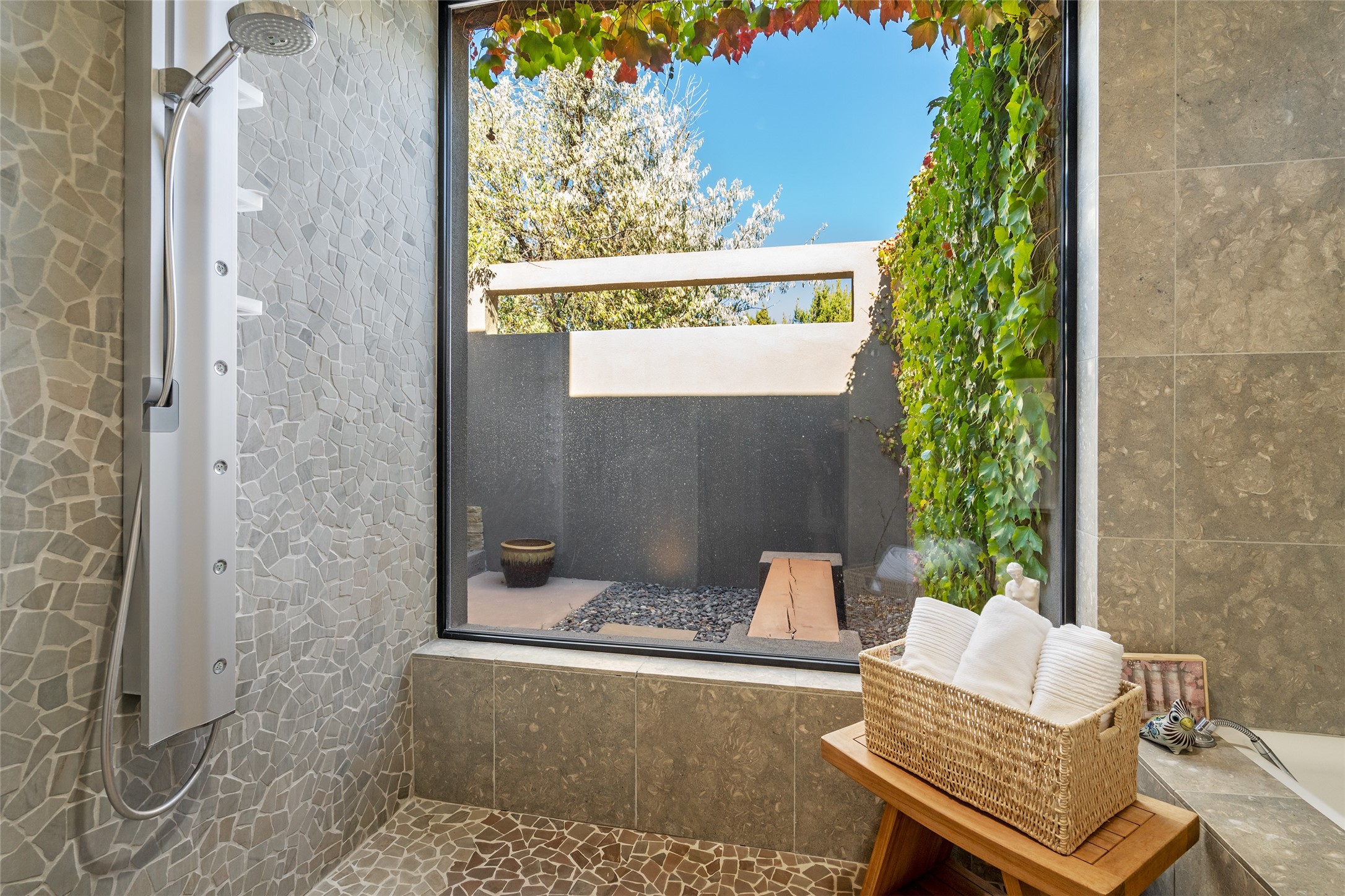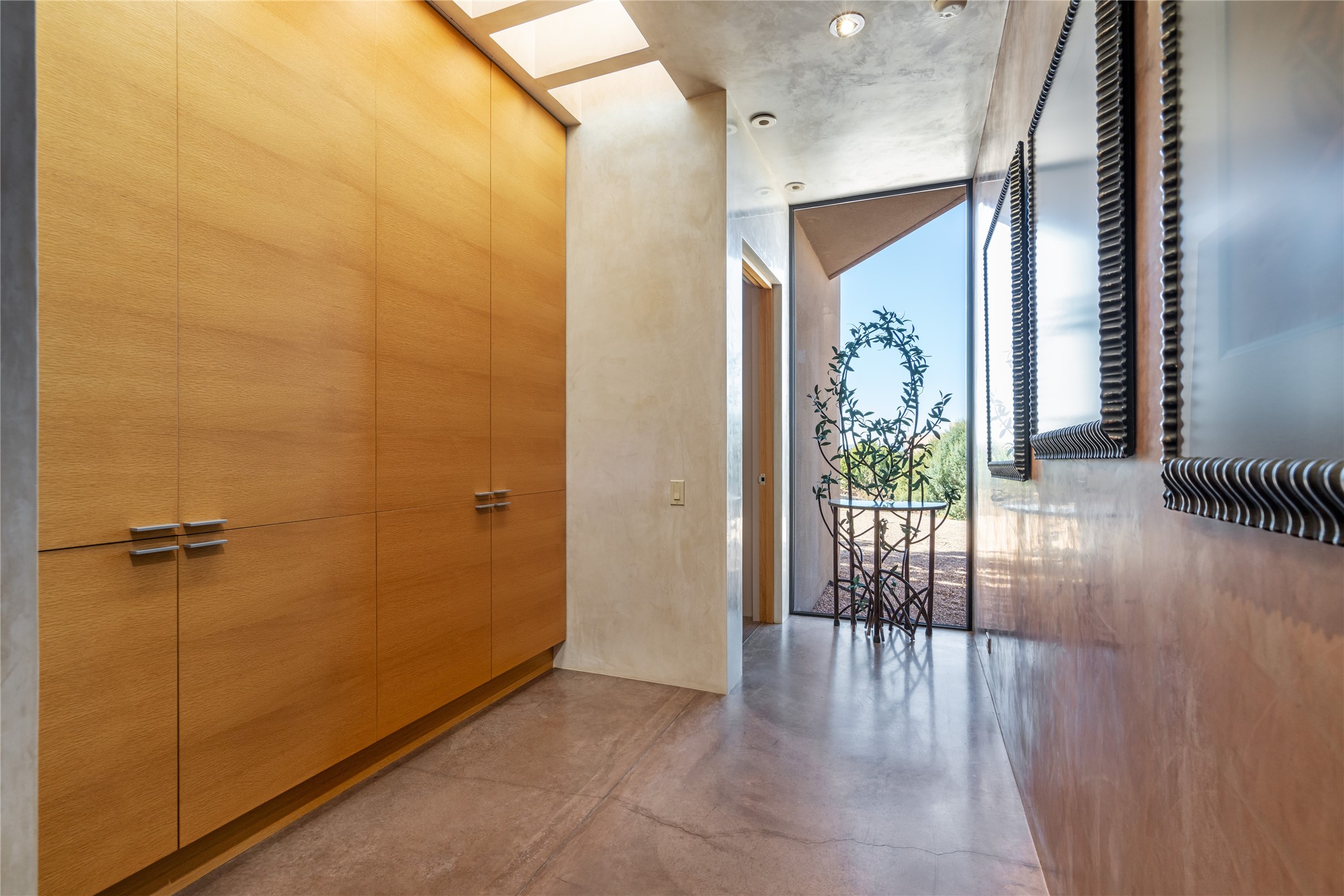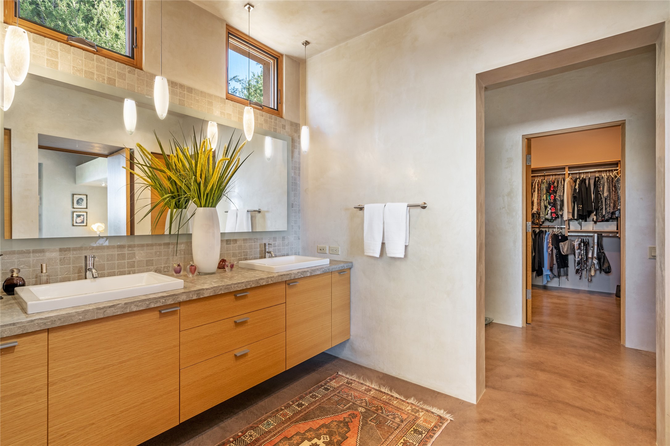 A harmonious fusion of architectural beauty and timeless style, this home stands as a pinnacle of Southwest Contemporary design. Designed by esteemed architect Robert Zachry, AIA, and meticulously crafted by Michael Hurlocker, this 2008 Parade of Homes winner for "Most Creative and Innovative," "Best Craftsmanship," and "Best Exterior Character" will immediately reward. Upon entering through the glass front door, you are immediately aware of the uniqueness of this home. The main living area with dual-sided fireplace and remote-controlled wall-to-wall glass doors seamlessly open to a wraparound portal with fireplace and custom-built wall water feature, providing the perfect indoor-outdoor luxury retreat. The modern and elegant kitchen, adorned with sleek cabinetry and high-end finishes, island seating, informal dining area and private patio ideal for outdoor grilling and gatherings. This home is also equipped with modern comforts, such as central air conditioning, radiant in-floor heating, spa like bath, solar panels for hot water heater and heating, cistern for watering the professionally landscaped grounds. Every aspect transcends time. It's not just a home; it's a statement of enduring excellence. Don't miss this opportunity to own the art of living in a home where innovation, craftsmanship, and style unite to create an extraordinary living environment.