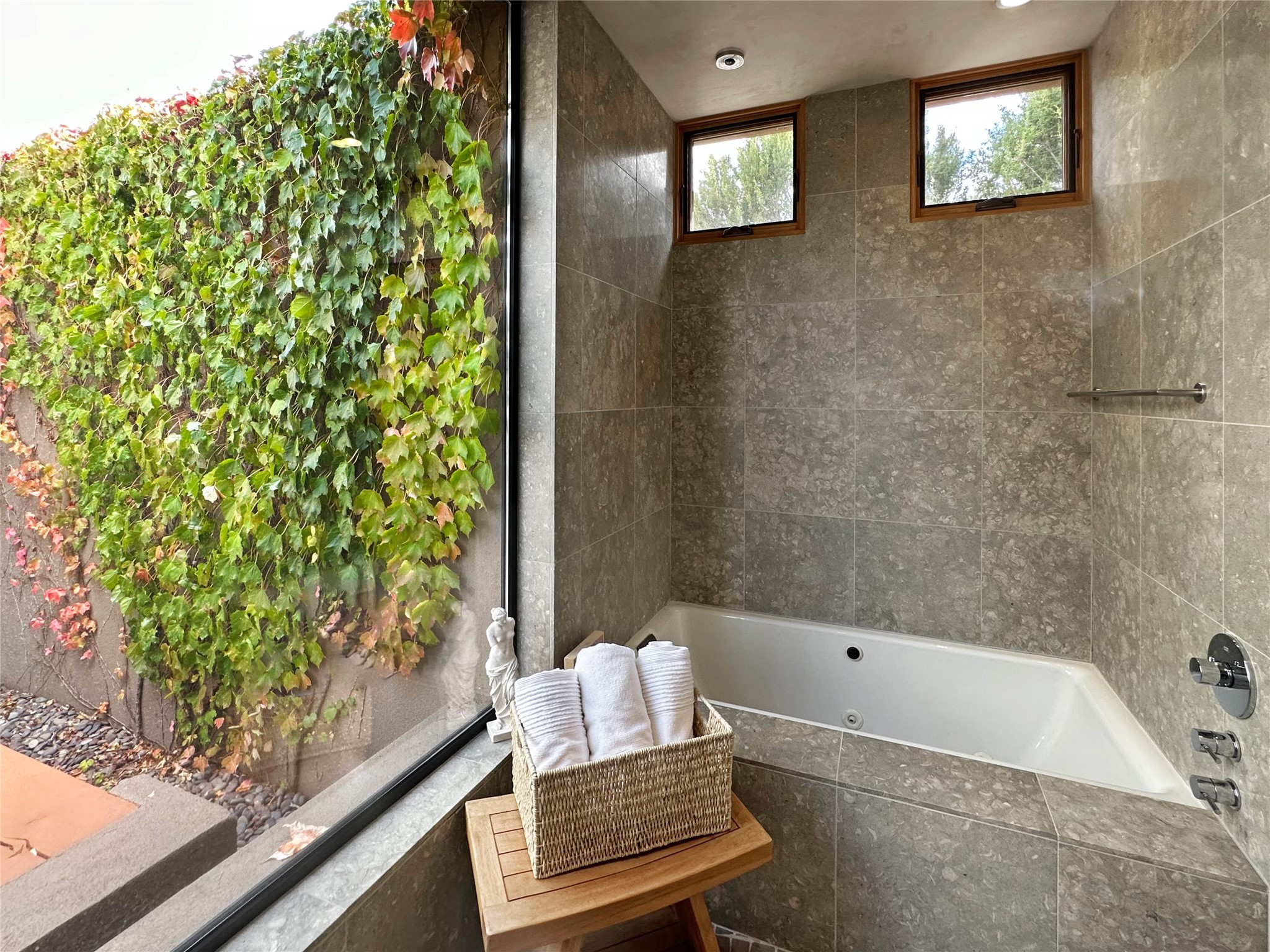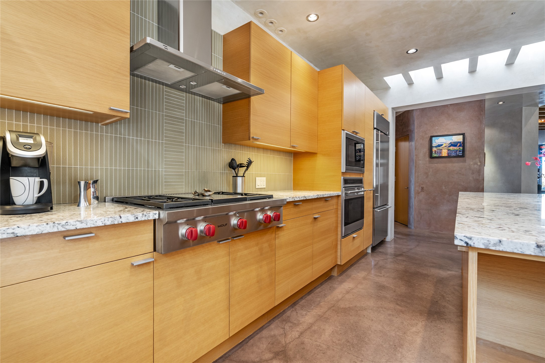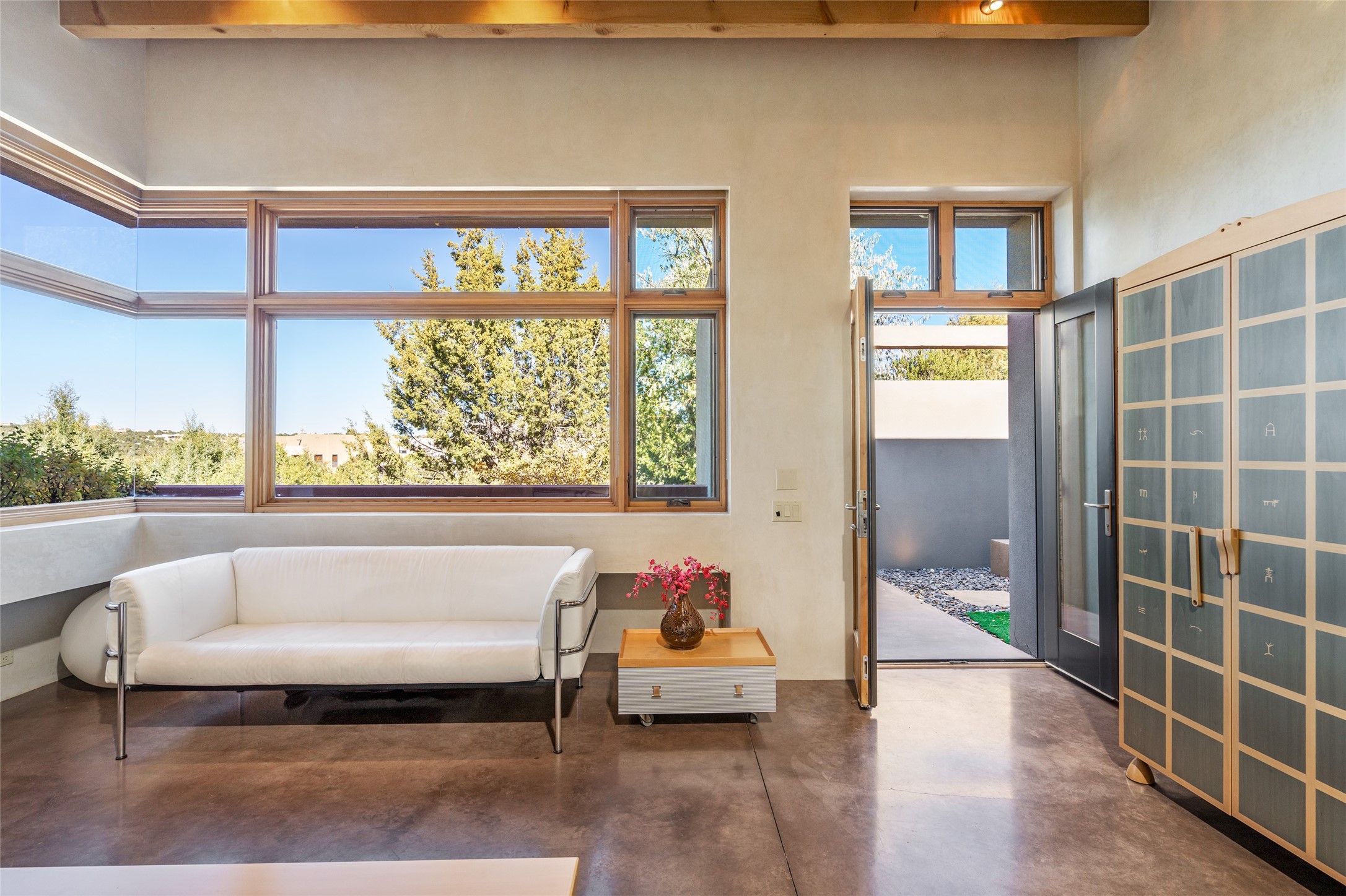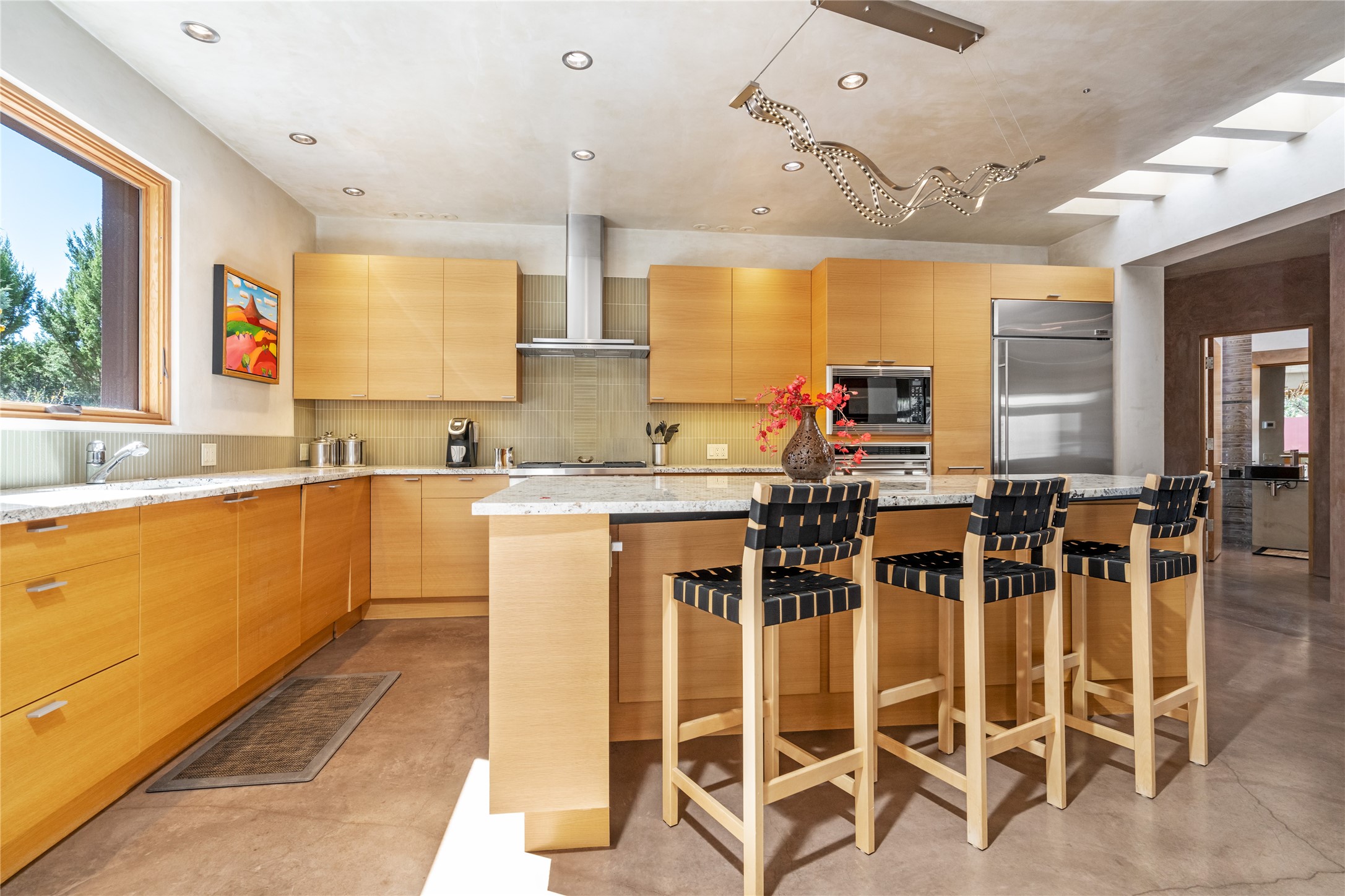 A harmonious fusion of architectural beauty and timeless style, this home stands as a pinnacle of Southwest Contemporary design. Designed by esteemed architect Robert Zachry, AIA, and meticulously crafted by Michael Hurlocker, this 2008 Parade of Homes winner for "Most Creative and Innovative," "Best Craftsmanship," and "Best Exterior Character" will immediately reward. Upon entering through the glass front door, you are immediately aware of the uniqueness of this home. The main living area with dual-sided fireplace and remote-controlled wall-to-wall glass doors seamlessly open to a wraparound portal with fireplace and custom-built wall water feature, providing the perfect indoor-outdoor luxury retreat. The modern and elegant kitchen, adorned with sleek cabinetry and high-end finishes, island seating, informal dining area and private patio ideal for outdoor grilling and gatherings. This home is also equipped with modern comforts, such as central air conditioning, radiant in-floor heating, spa like bath, solar panels for hot water heater and heating, cistern for watering the professionally landscaped grounds. Every aspect transcends time. It's not just a home; it's a statement of enduring excellence. Don't miss this opportunity to own the art of living in a home where innovation, craftsmanship, and style unite to create an extraordinary living environment.