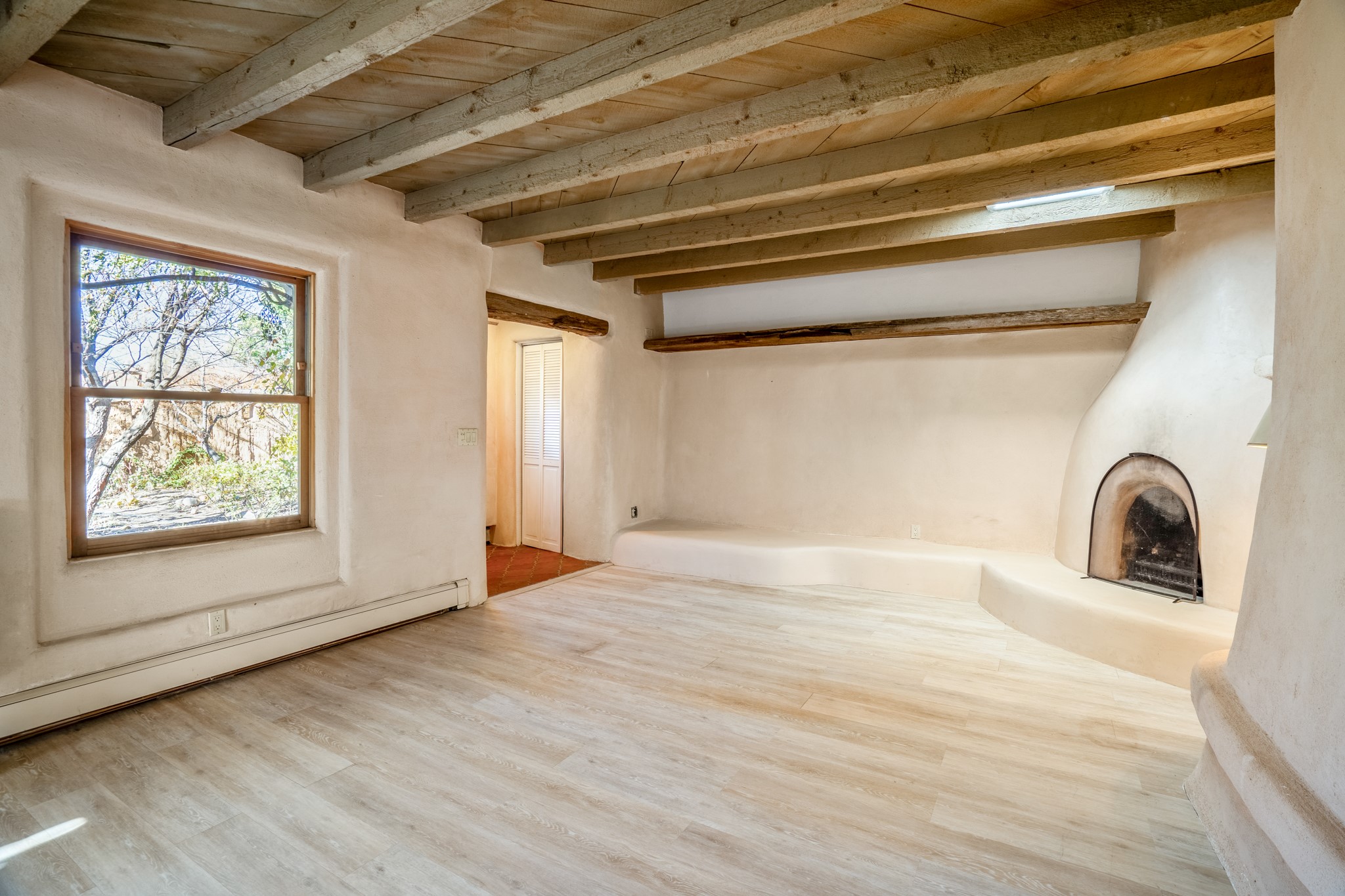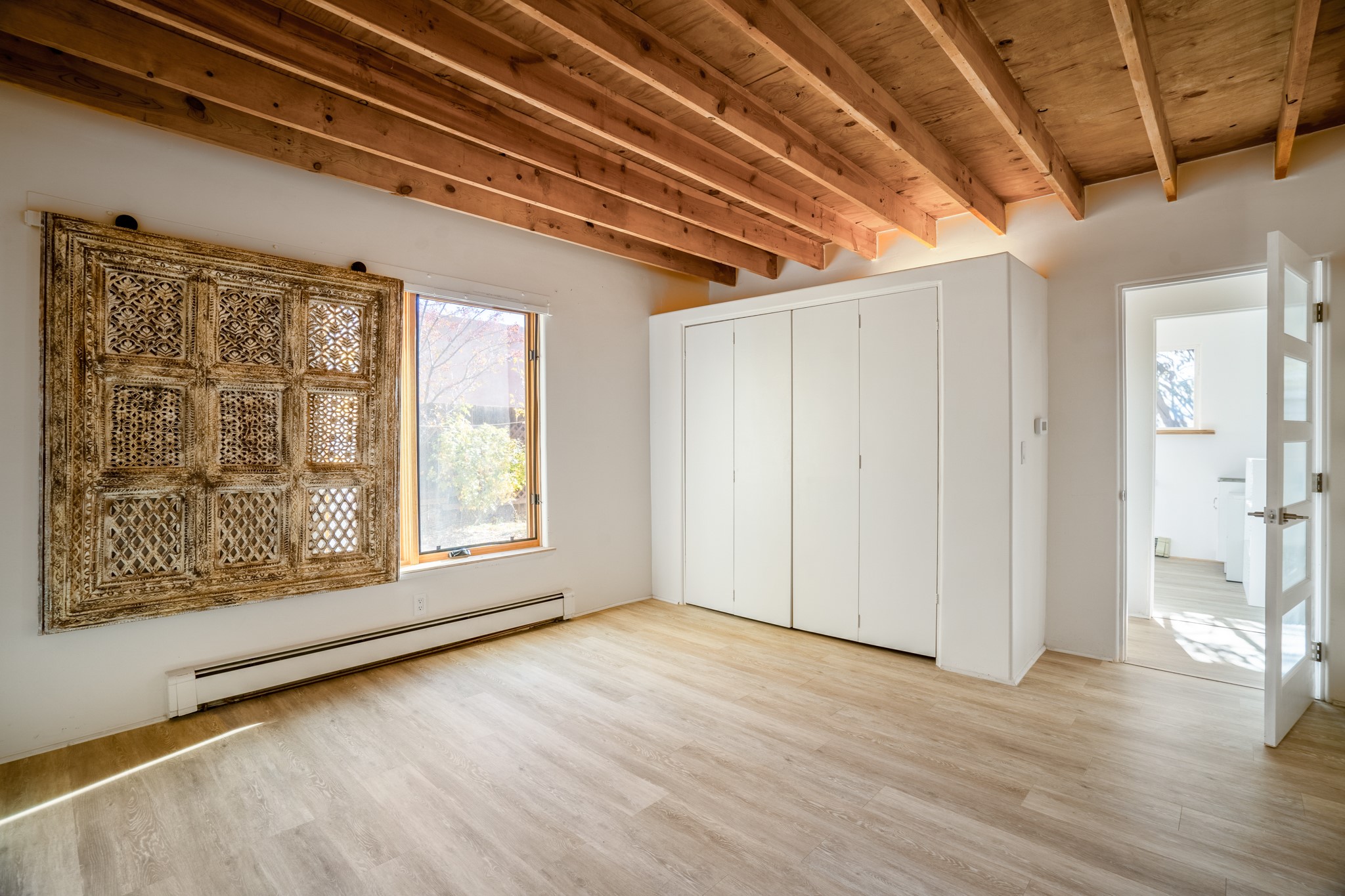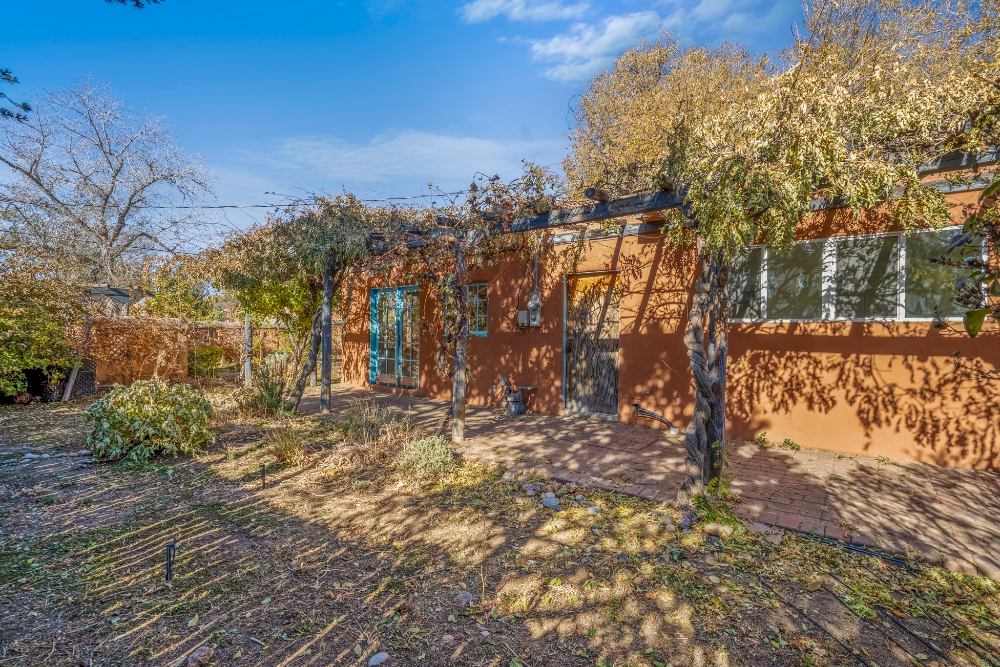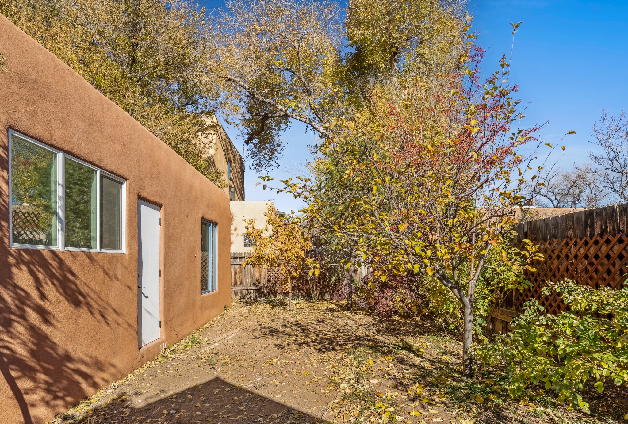 Step through the gate of this magical garden and discover a whimsical and comfortable home just minutes from town. This 2 bedroom, 2 bathroom home offers a great layout... with a living, dining and kitchen open floor plan, a kiva fireplace, and two bedrooms, one with a mini-split and a remodeled ensuite bath. The kitchen showcases updated cabinets, countertops, and new appliances. A pergola covered with mature Wisteria wraps around the front and side of the home overlooking the beautiful gardens. The property has an enclosed front courtyard, a drip irrigation system a storage shed and a driveway with a designated parking spot. Conveniently located near the Santa Fe River walking trail, a grocery store and shopping. Schedule your showing to see this great investment property or primary residence.