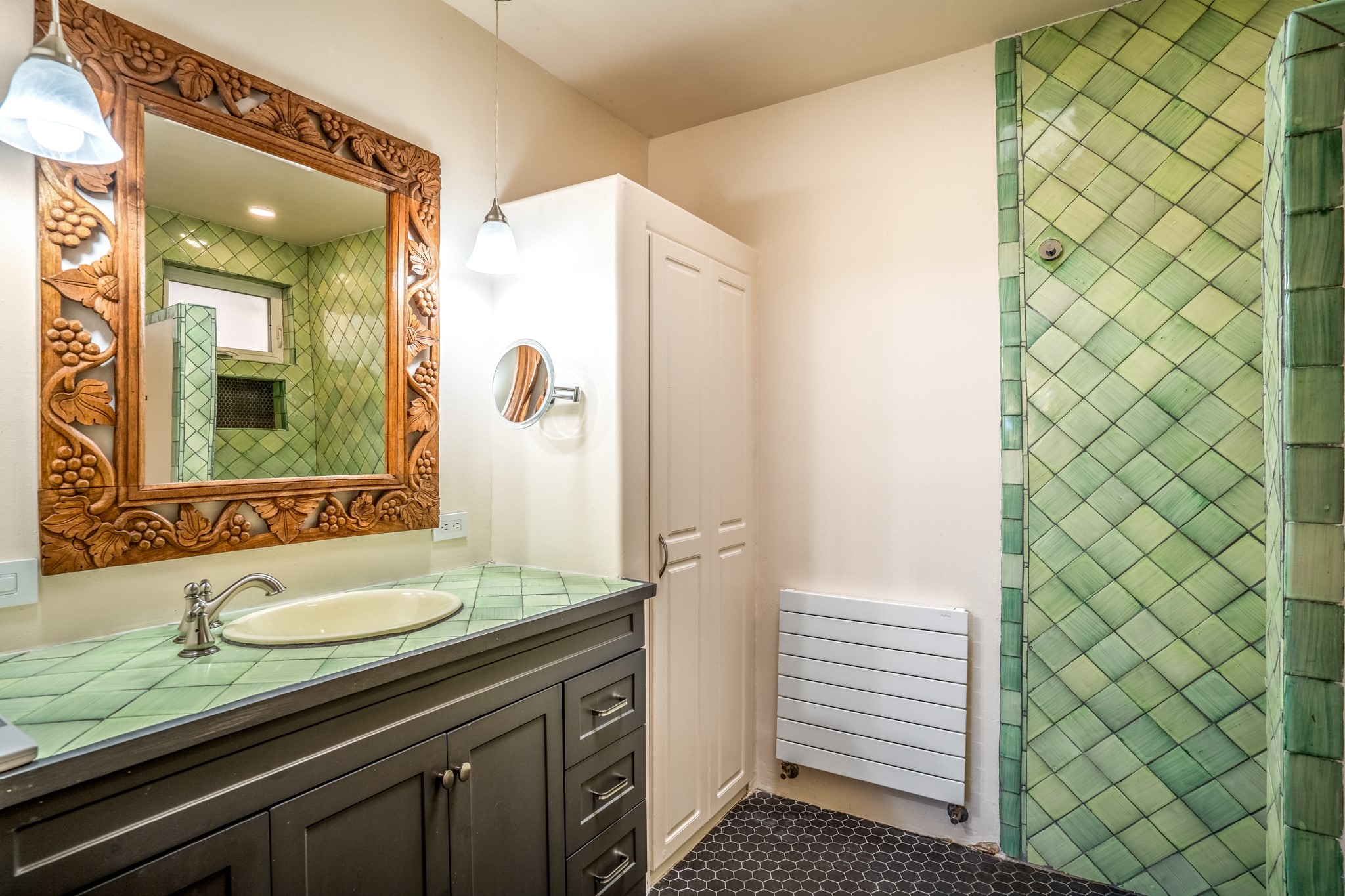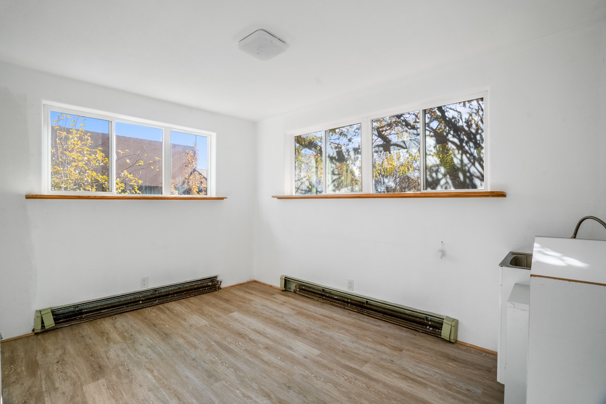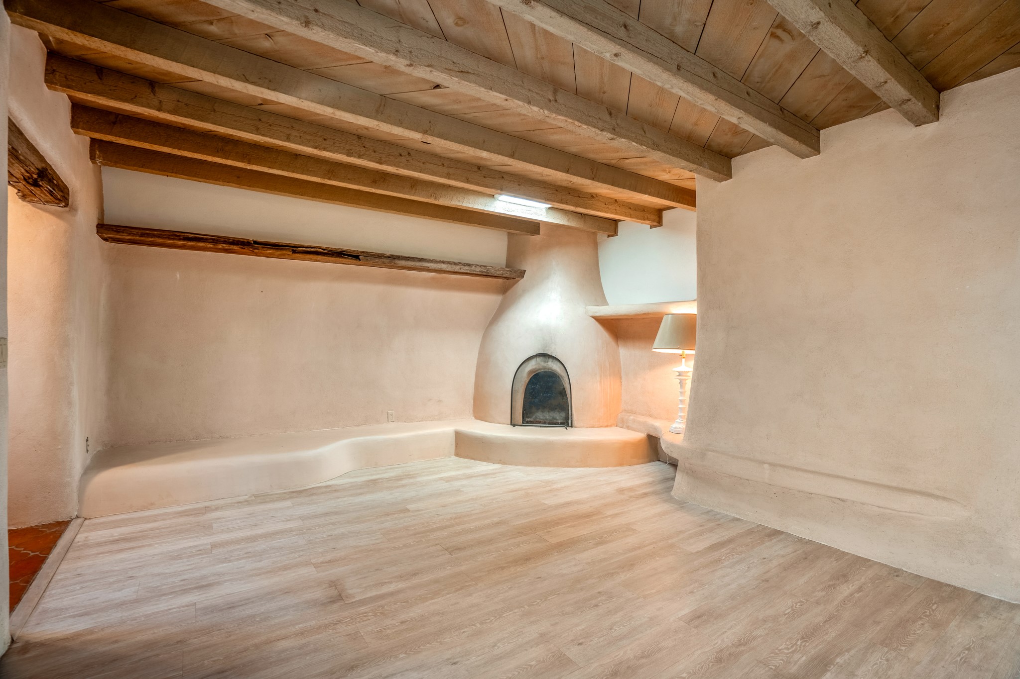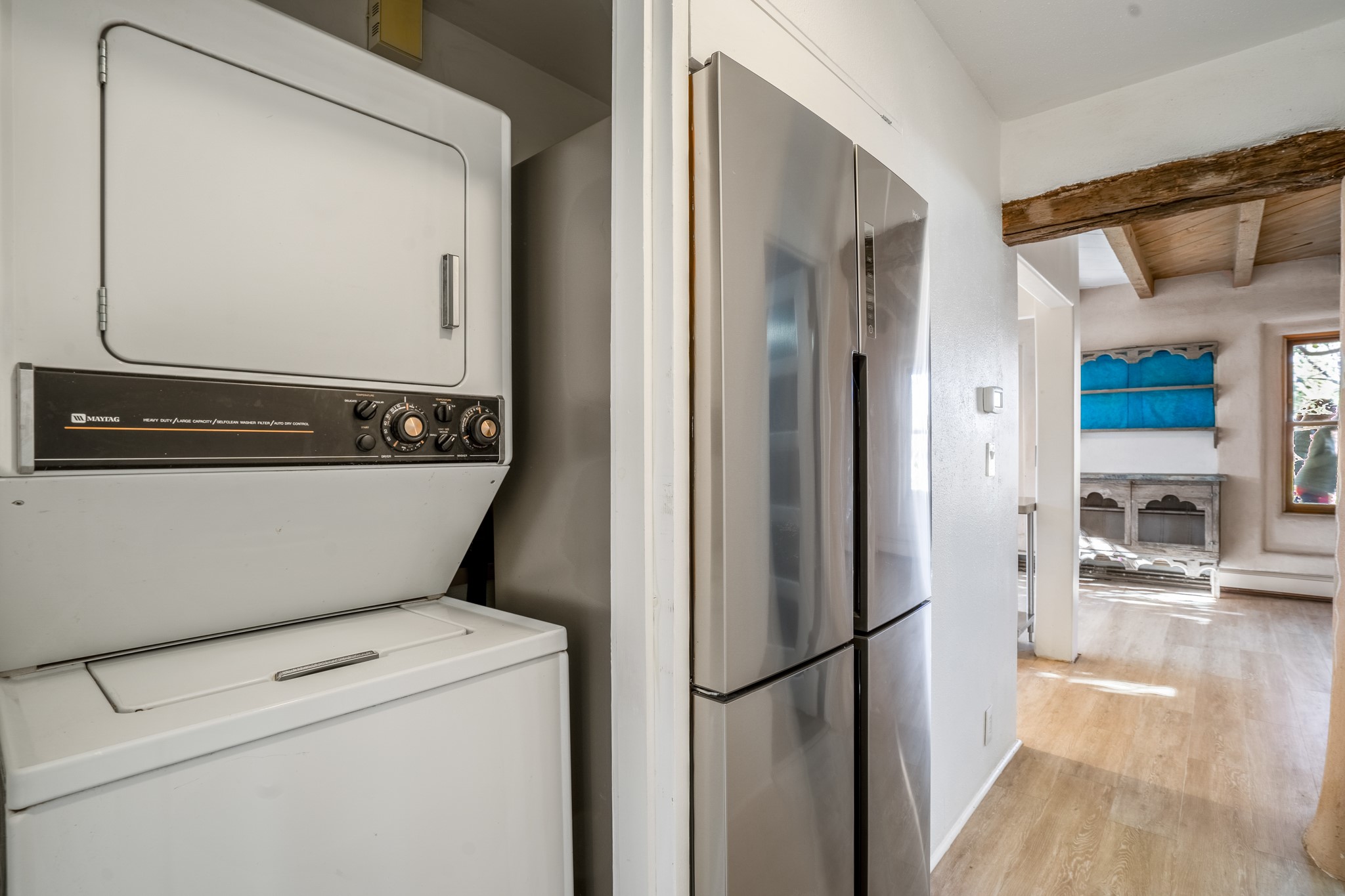 Step through the gate of this magical garden and discover a whimsical and comfortable home just minutes from town. This 2 bedroom, 2 bathroom home offers a great layout... with a living, dining and kitchen open floor plan, a kiva fireplace, and two bedrooms, one with a mini-split and a remodeled ensuite bath. The kitchen showcases updated cabinets, countertops, and new appliances. A pergola covered with mature Wisteria wraps around the front and side of the home overlooking the beautiful gardens. The property has an enclosed front courtyard, a drip irrigation system a storage shed and a driveway with a designated parking spot. Conveniently located near the Santa Fe River walking trail, a grocery store and shopping. Schedule your showing to see this great investment property or primary residence.