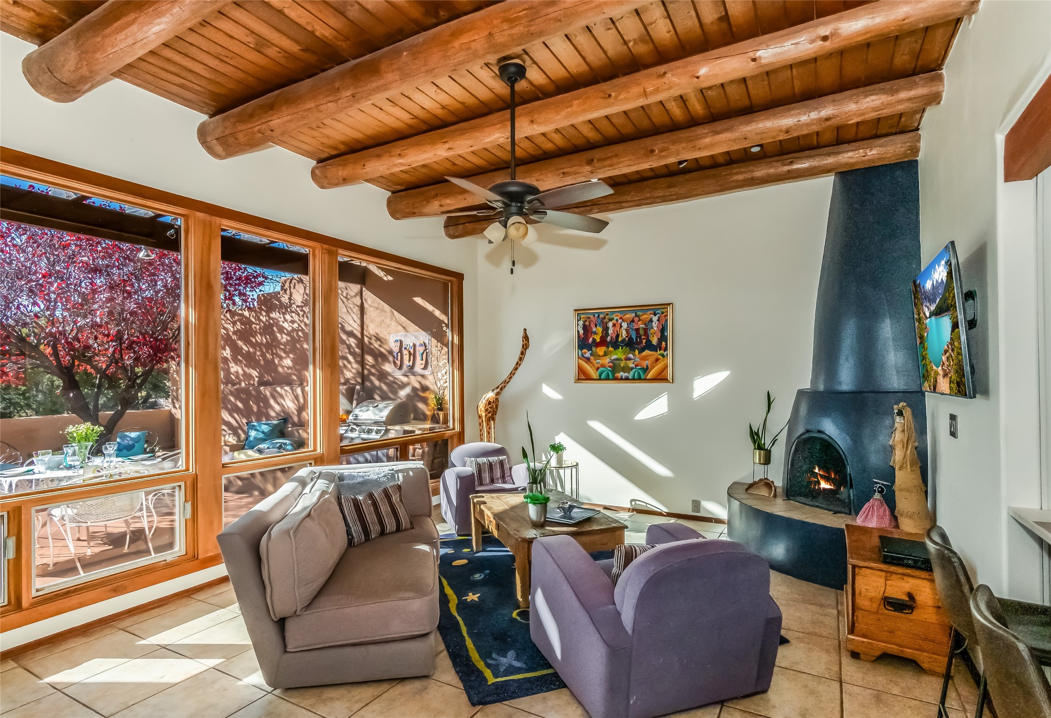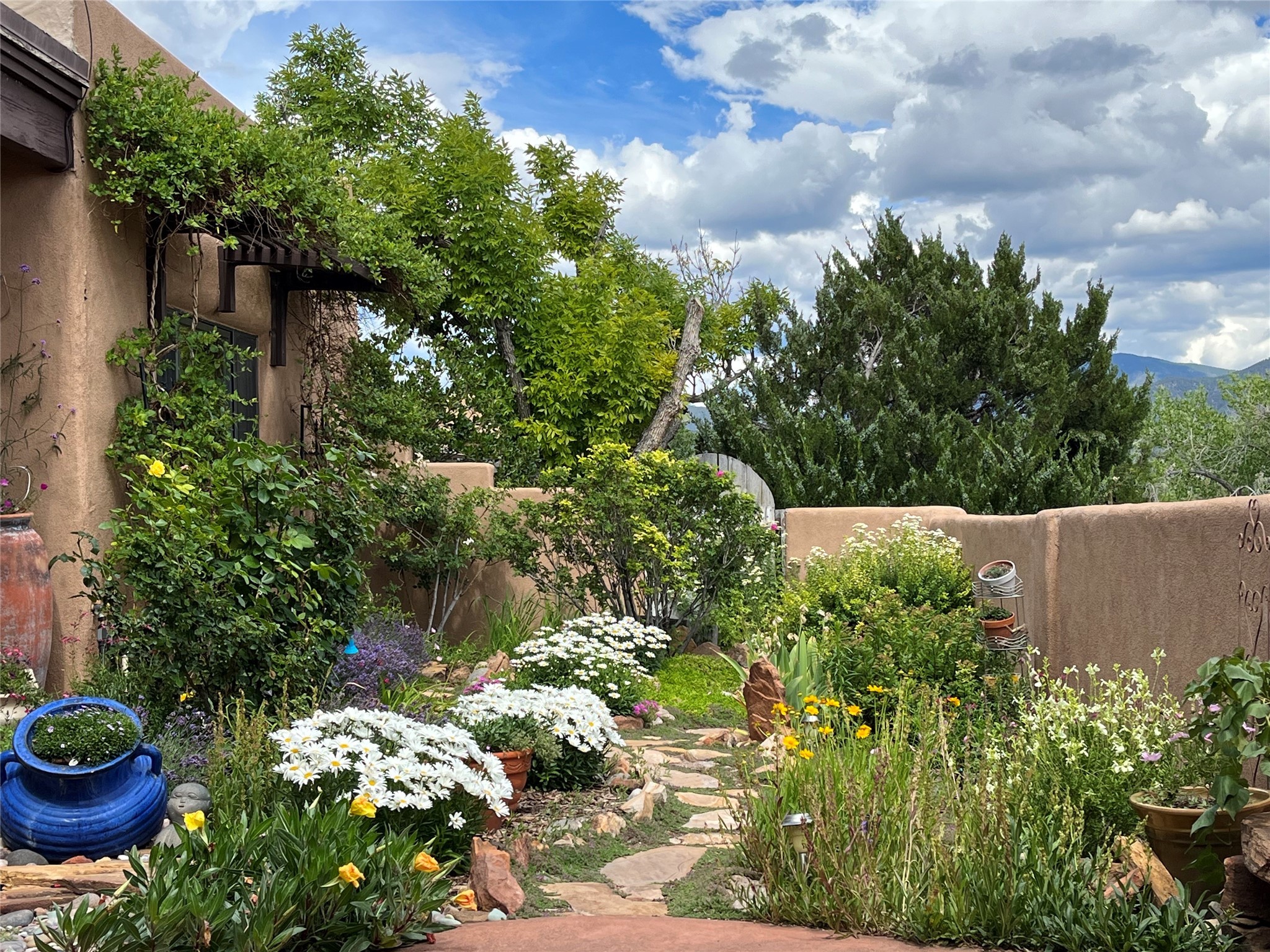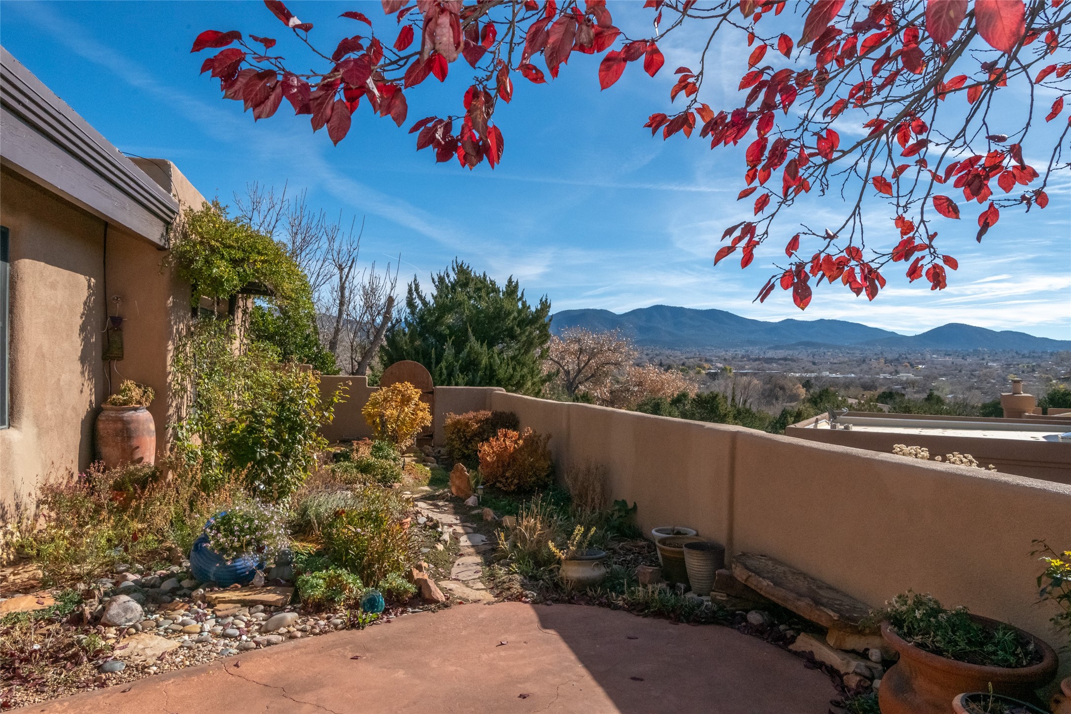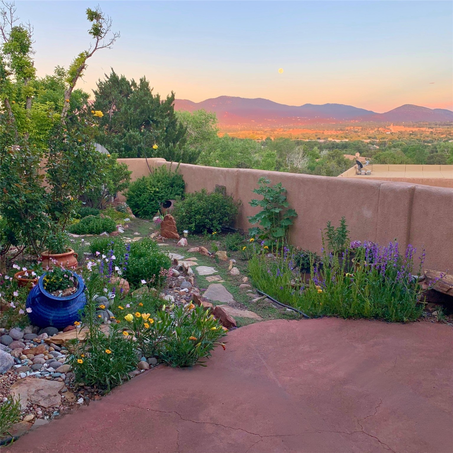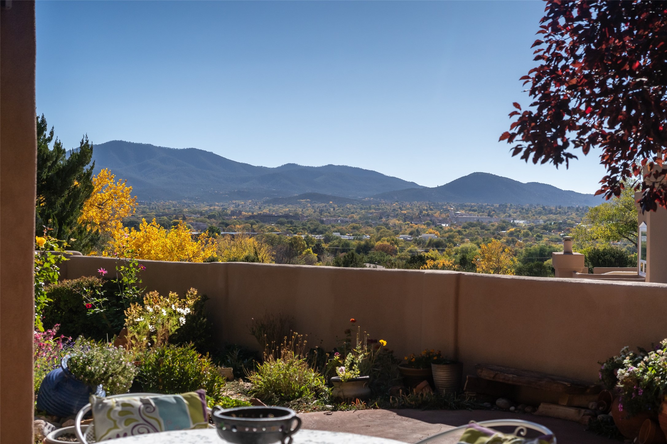HUGE price change!! Check out the stunning Sangre de Cristo mountain views from this exceptional tranquil home. This pocket gem is close to the plaza, shopping, hiking trails and the dog park. This townhome has stunning views of downtown Santa Fe from its private patio. Landscaping is a lush English-style garden and is in full bloom with roses, primrose, salvia and flowering thyme! The home is light-filled and spacious with an open-concept design. Vigas, tile floors, large kiva fireplace, and soaring 12-foot ceilings in the living room and office/studio. The kitchen features limestone countertops, stone floors, elegant backsplash and upgraded appliances, including a Bosch dual-fuel stove. The master bedroom has lovely views of the Sangres, an en suite master bath with natural stone accents and a walk-in California Closet system. Xeriscaped front entry and a newly installed porphyry stone driveway that enhances both the curb appeal and functionality. New silicon roof in 2020 with transferable warranty. This townhome is a delicious combination of location, views, privacy, and modern amenities. You'll love those views!