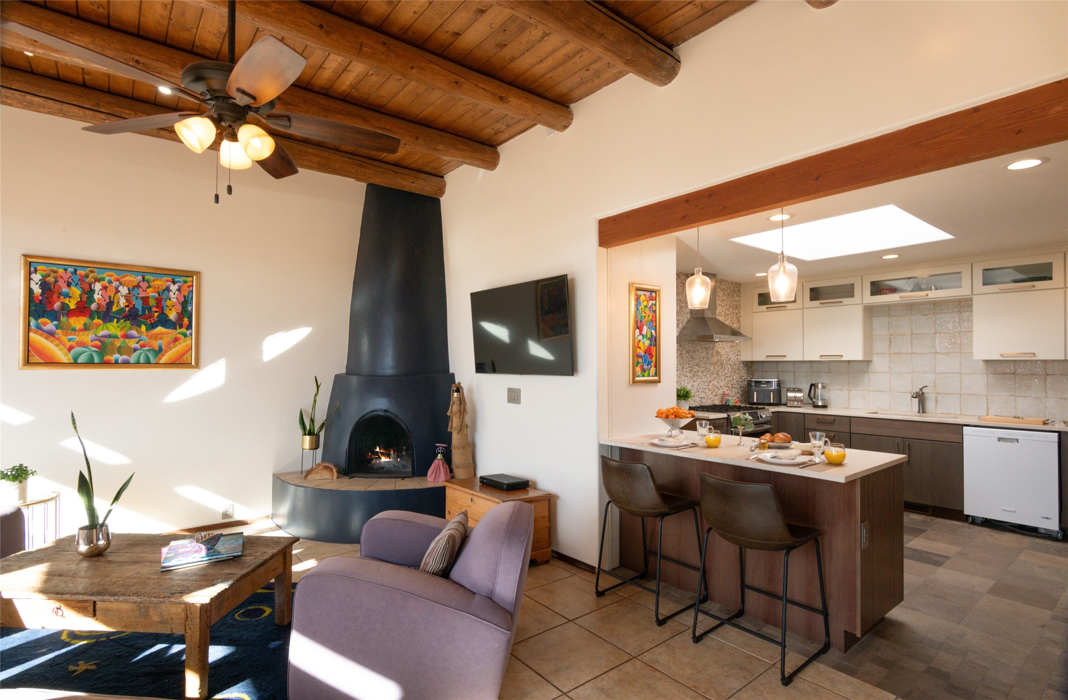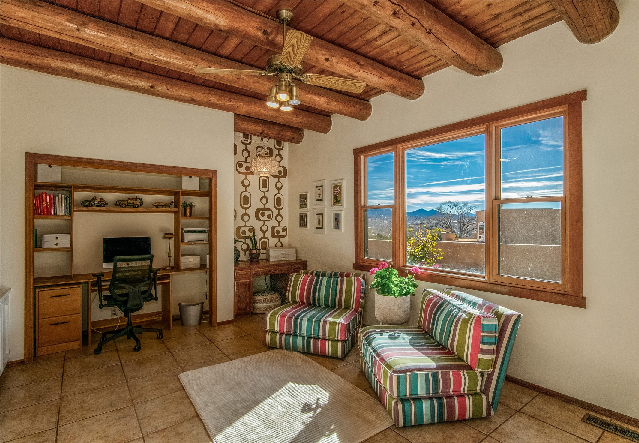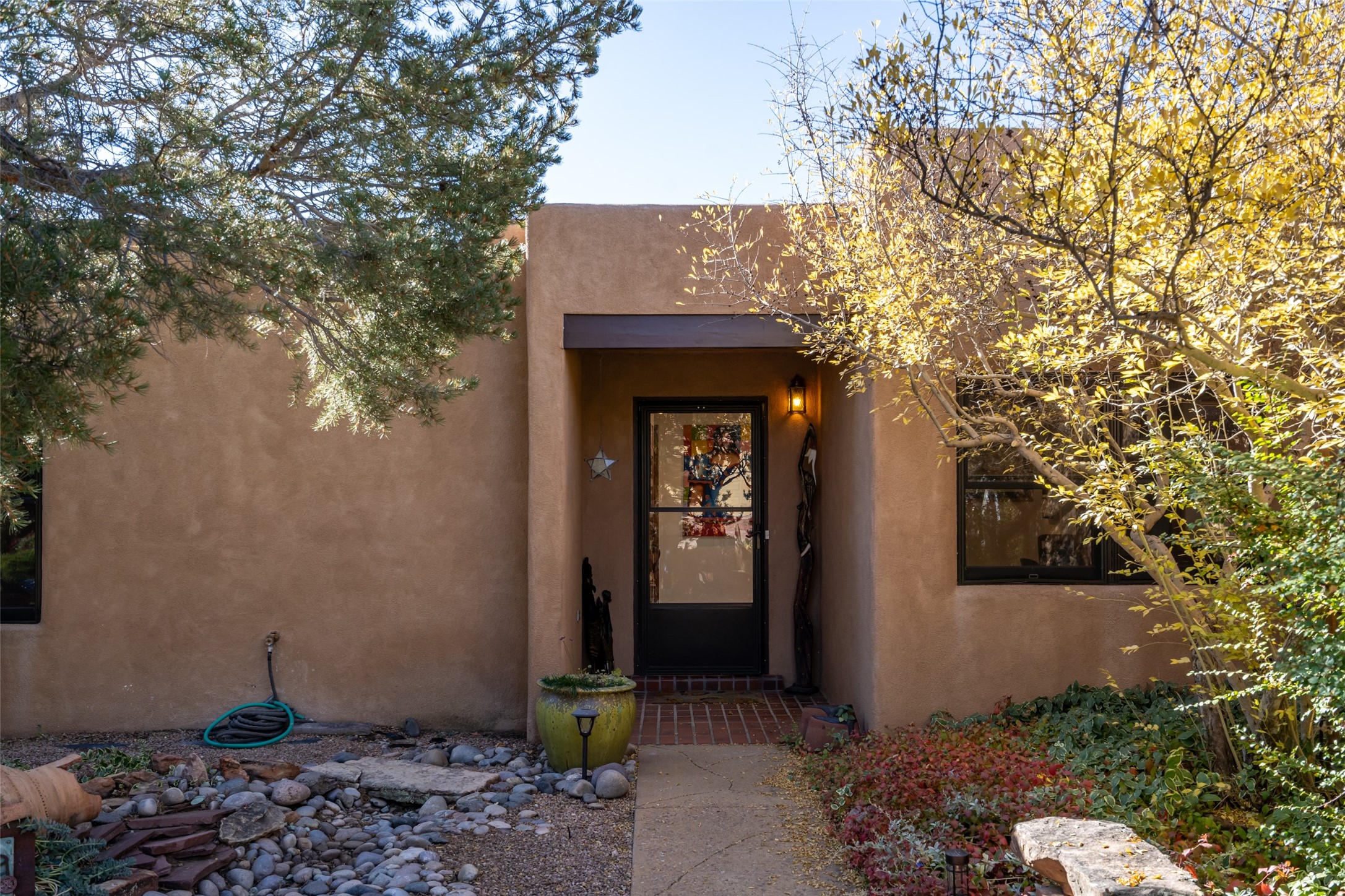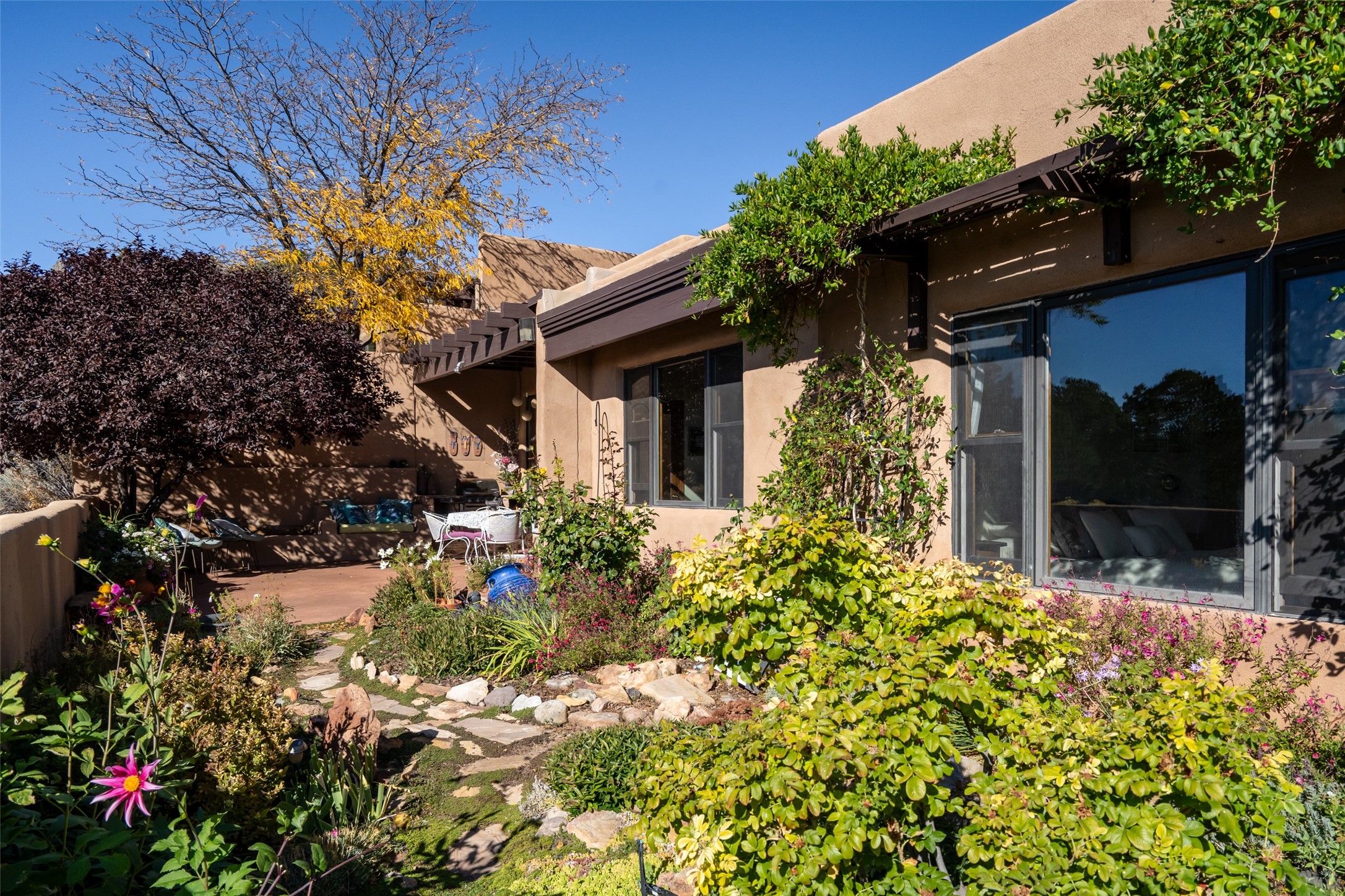 HUGE price change!! Check out the stunning Sangre de Cristo mountain views from this exceptional tranquil home. This pocket gem is close to the plaza, shopping, hiking trails and the dog park. This townhome has stunning views of downtown Santa Fe from its private patio. Landscaping is a lush English-style garden and is in full bloom with roses, primrose, salvia and flowering thyme! The home is light-filled and spacious with an open-concept design. Vigas, tile floors, large kiva fireplace, and soaring 12-foot ceilings in the living room and office/studio. The kitchen features limestone countertops, stone floors, elegant backsplash and upgraded appliances, including a Bosch dual-fuel stove. The master bedroom has lovely views of the Sangres, an en suite master bath with natural stone accents and a walk-in California Closet system. Xeriscaped front entry and a newly installed porphyry stone driveway that enhances both the curb appeal and functionality. New silicon roof in 2020 with transferable warranty. This townhome is a delicious combination of location, views, privacy, and modern amenities. You'll love those views!