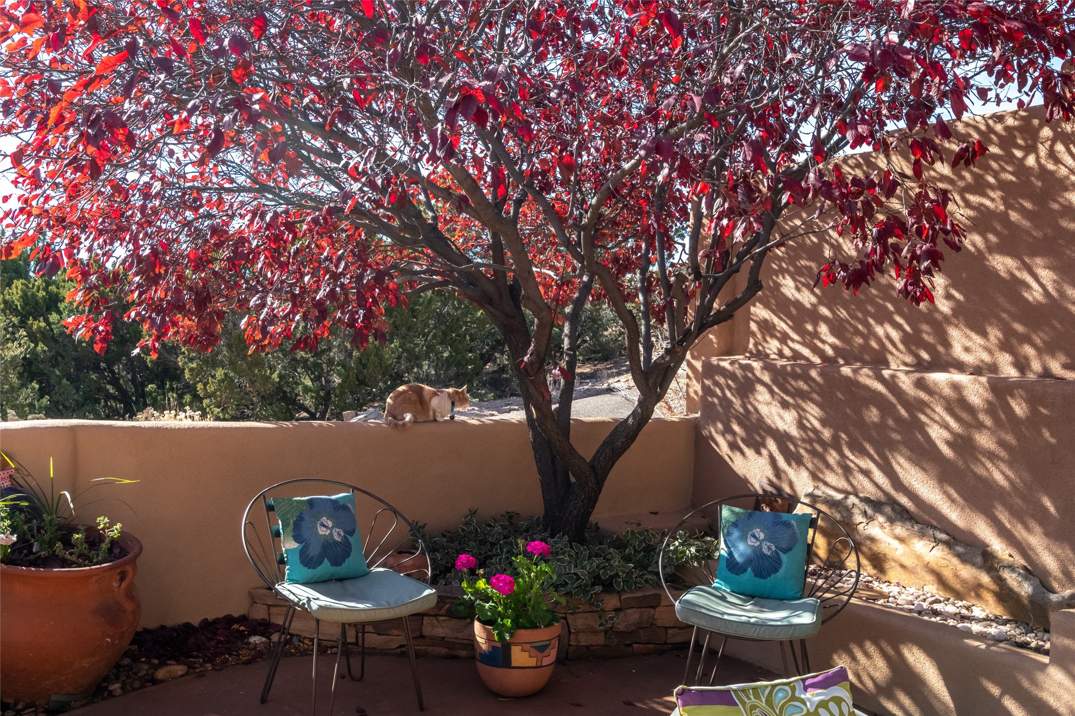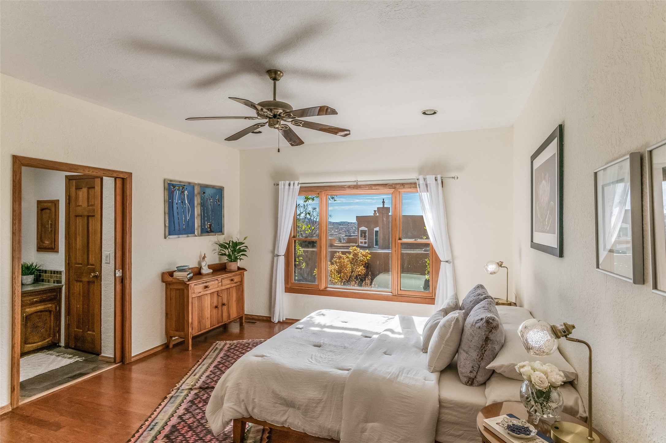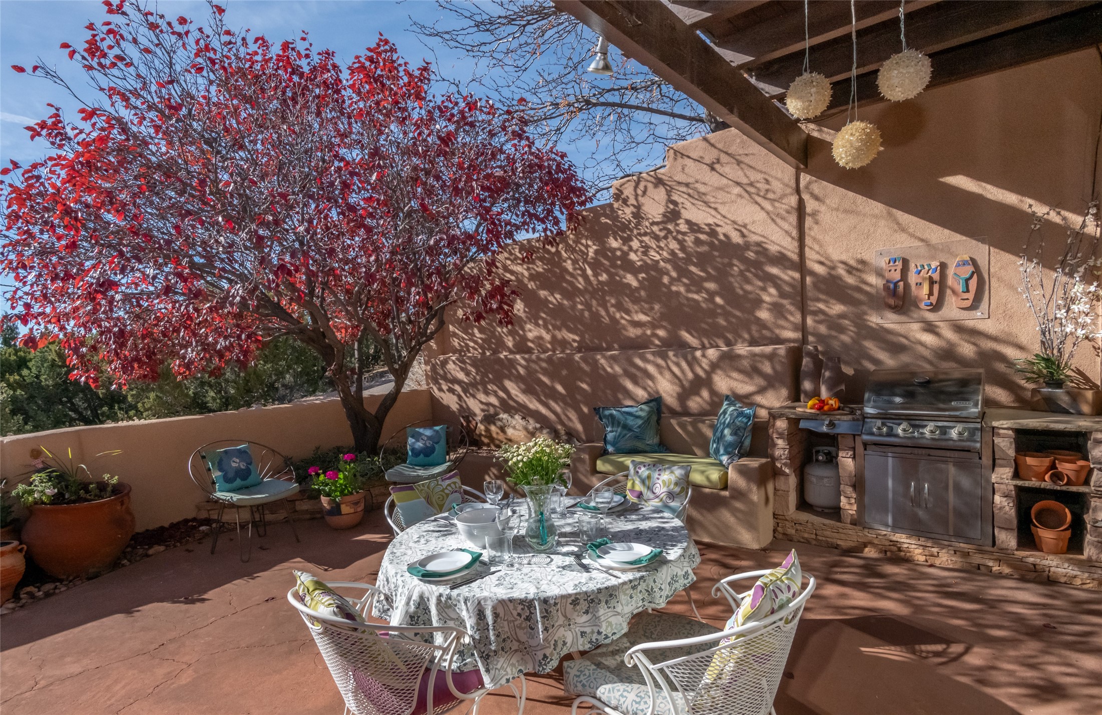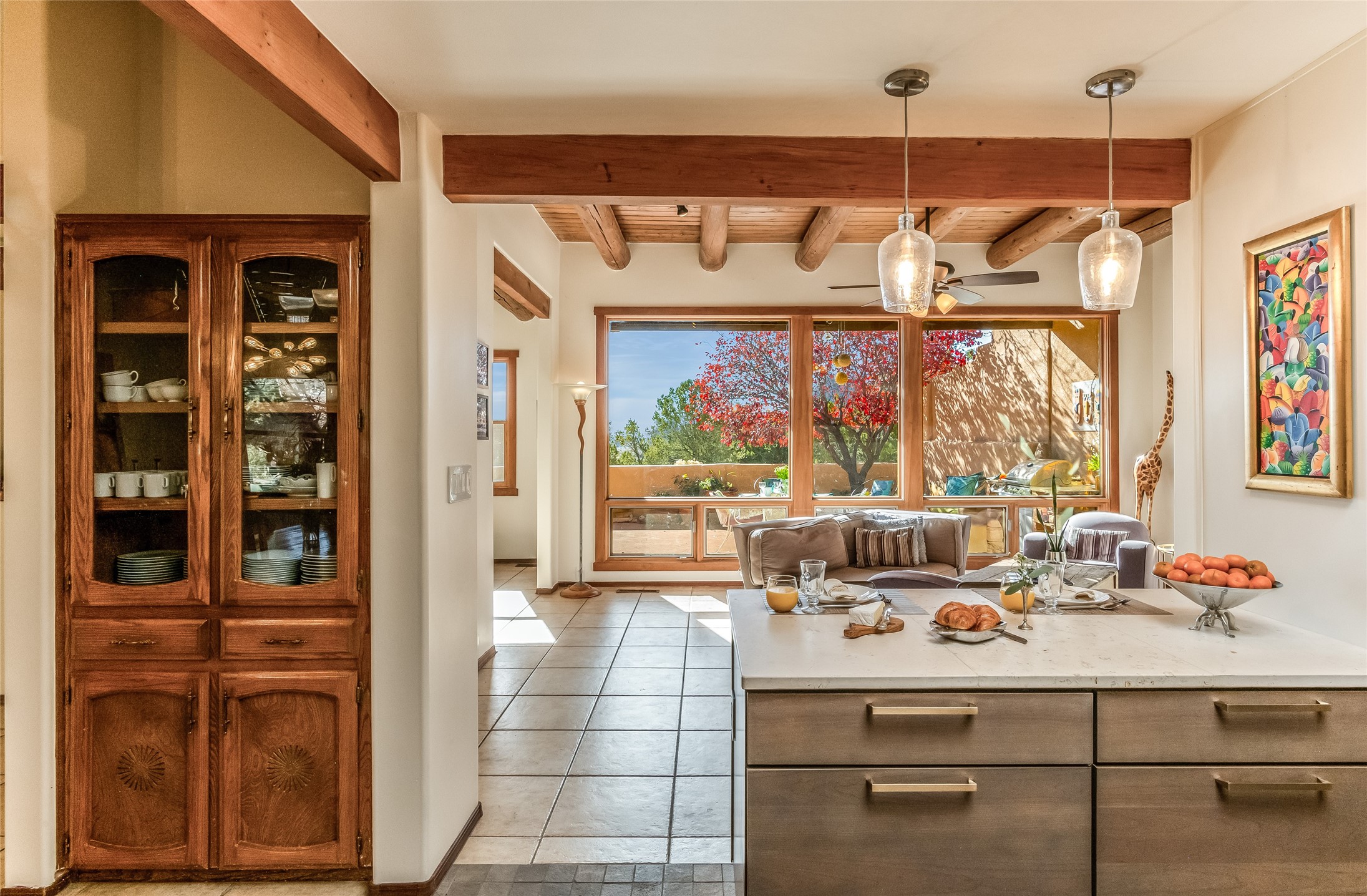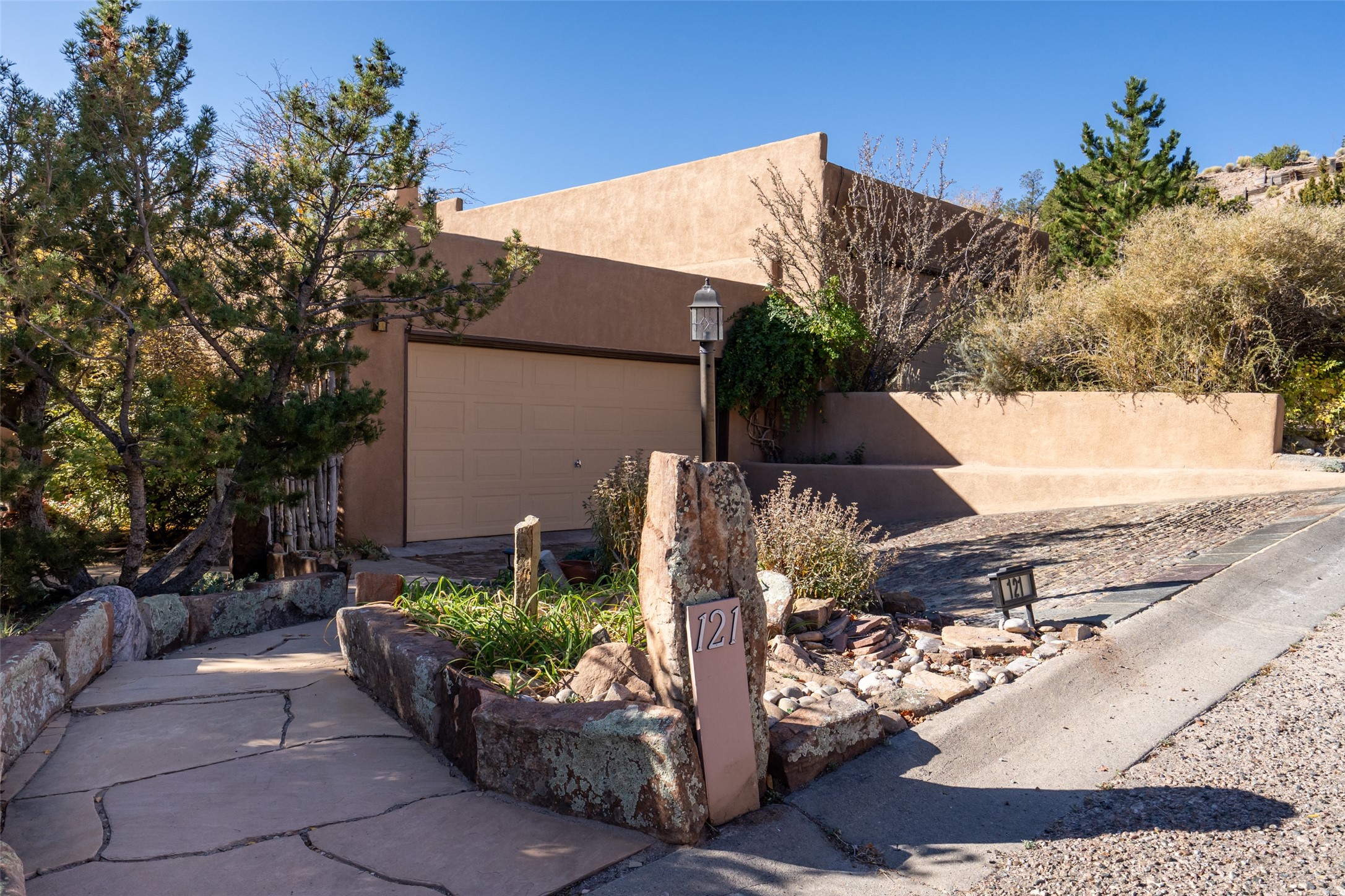 HUGE price change!! Check out the stunning Sangre de Cristo mountain views from this exceptional tranquil home. This pocket gem is close to the plaza, shopping, hiking trails and the dog park. This townhome has stunning views of downtown Santa Fe from its private patio. Landscaping is a lush English-style garden and is in full bloom with roses, primrose, salvia and flowering thyme! The home is light-filled and spacious with an open-concept design. Vigas, tile floors, large kiva fireplace, and soaring 12-foot ceilings in the living room and office/studio. The kitchen features limestone countertops, stone floors, elegant backsplash and upgraded appliances, including a Bosch dual-fuel stove. The master bedroom has lovely views of the Sangres, an en suite master bath with natural stone accents and a walk-in California Closet system. Xeriscaped front entry and a newly installed porphyry stone driveway that enhances both the curb appeal and functionality. New silicon roof in 2020 with transferable warranty. This townhome is a delicious combination of location, views, privacy, and modern amenities. You'll love those views!