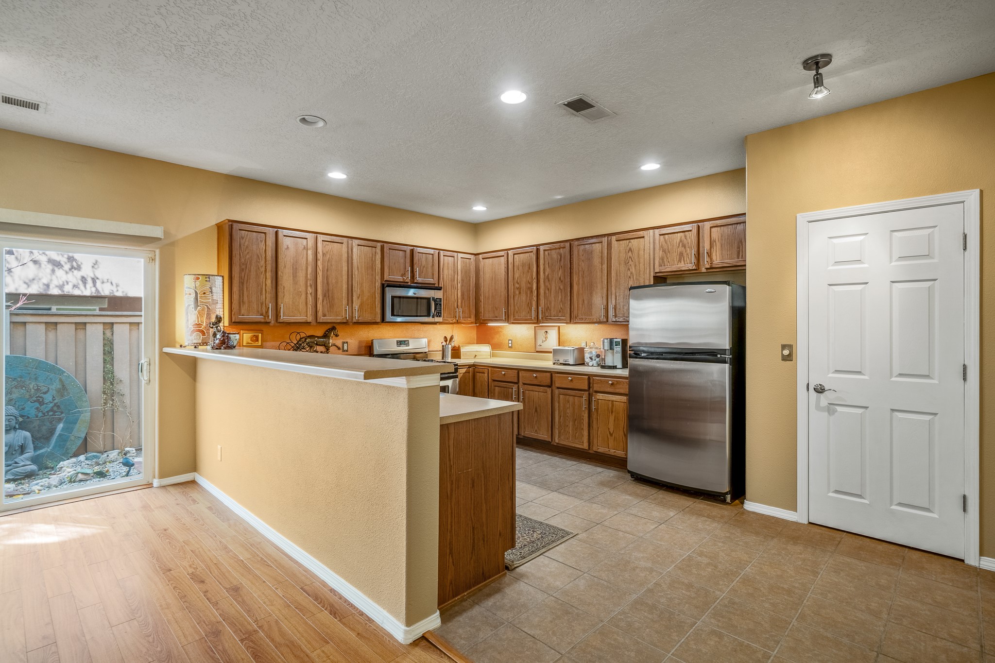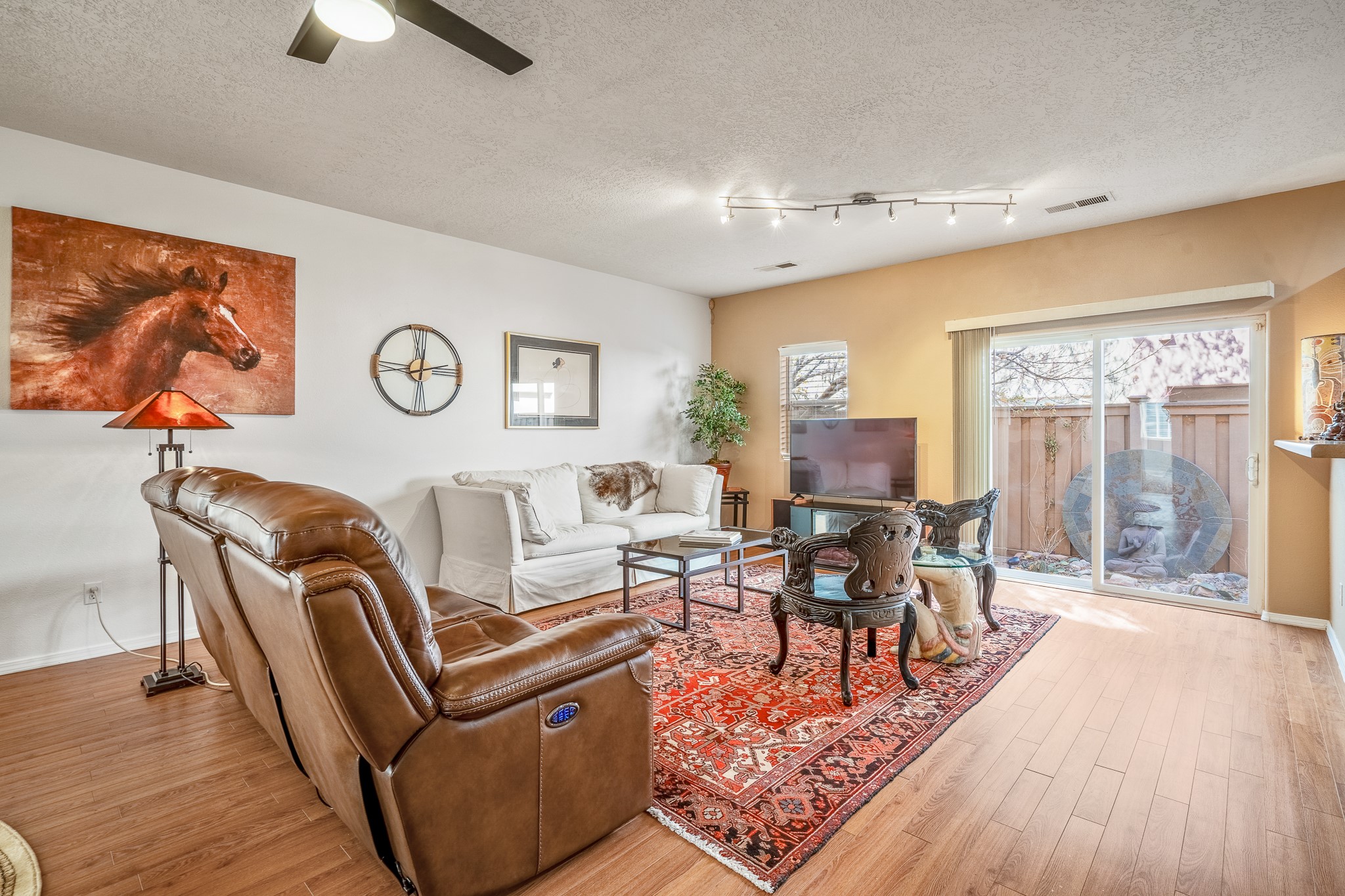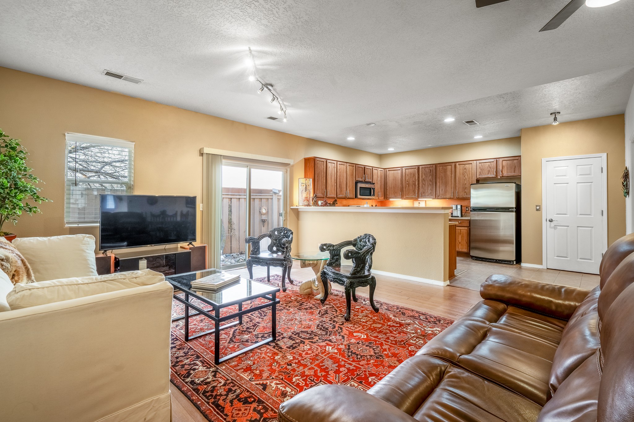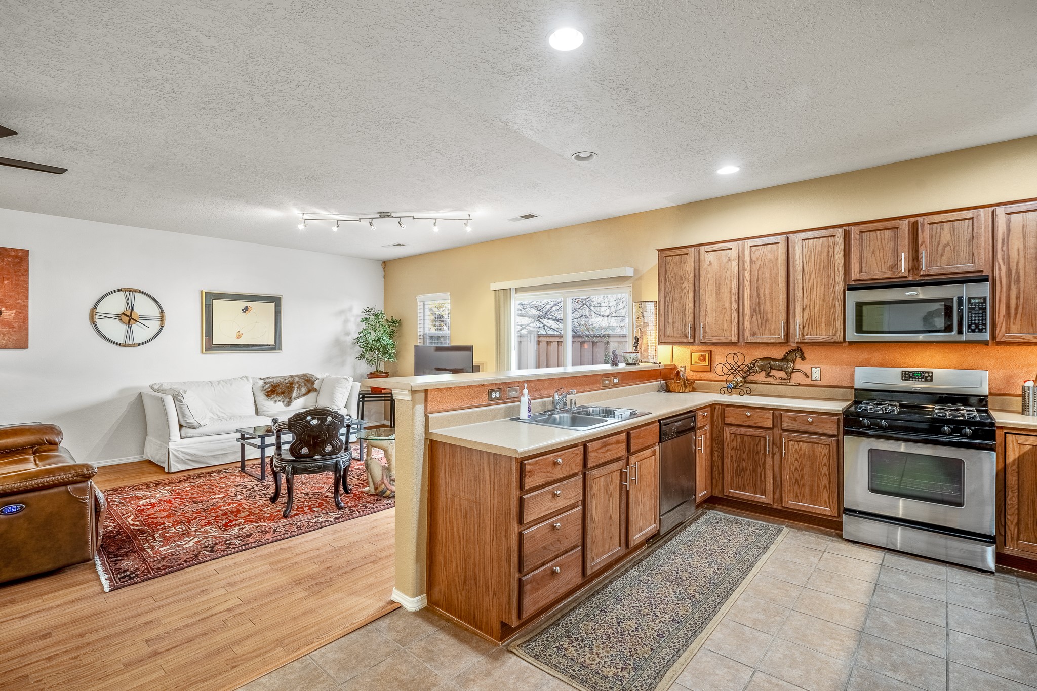 This beautiful well cared for single level 3 bed/2 bath home has so much to love. The kitchen is well equipped with lots of storage, pantry, under mount lighting, microwave and gas cooking, easy for entertaining as it opens to a large living room with wood laminate flooring. The glass sliding doors lead to a wraparound yard ready for your garden and outdoor enjoyment. The spacious primary bedroom includes a huge bathroom with a large walk-in shower. This split floor plan includes a wide hallway that leads to the secondary bedrooms and full bath. Included is a large laundry room and direct entry oversized one car garage, forced air heat and refrigerated A/C. A few upgrades include a recent resurfaced roof, 2022 installed new hot water heater, new ceiling fan and lights, entire home freshly painted and new window blinds. Bonus! Enjoy the beautifully maintained park with ample parking across the street, this home is in the best location in the neighborhood! Come See!