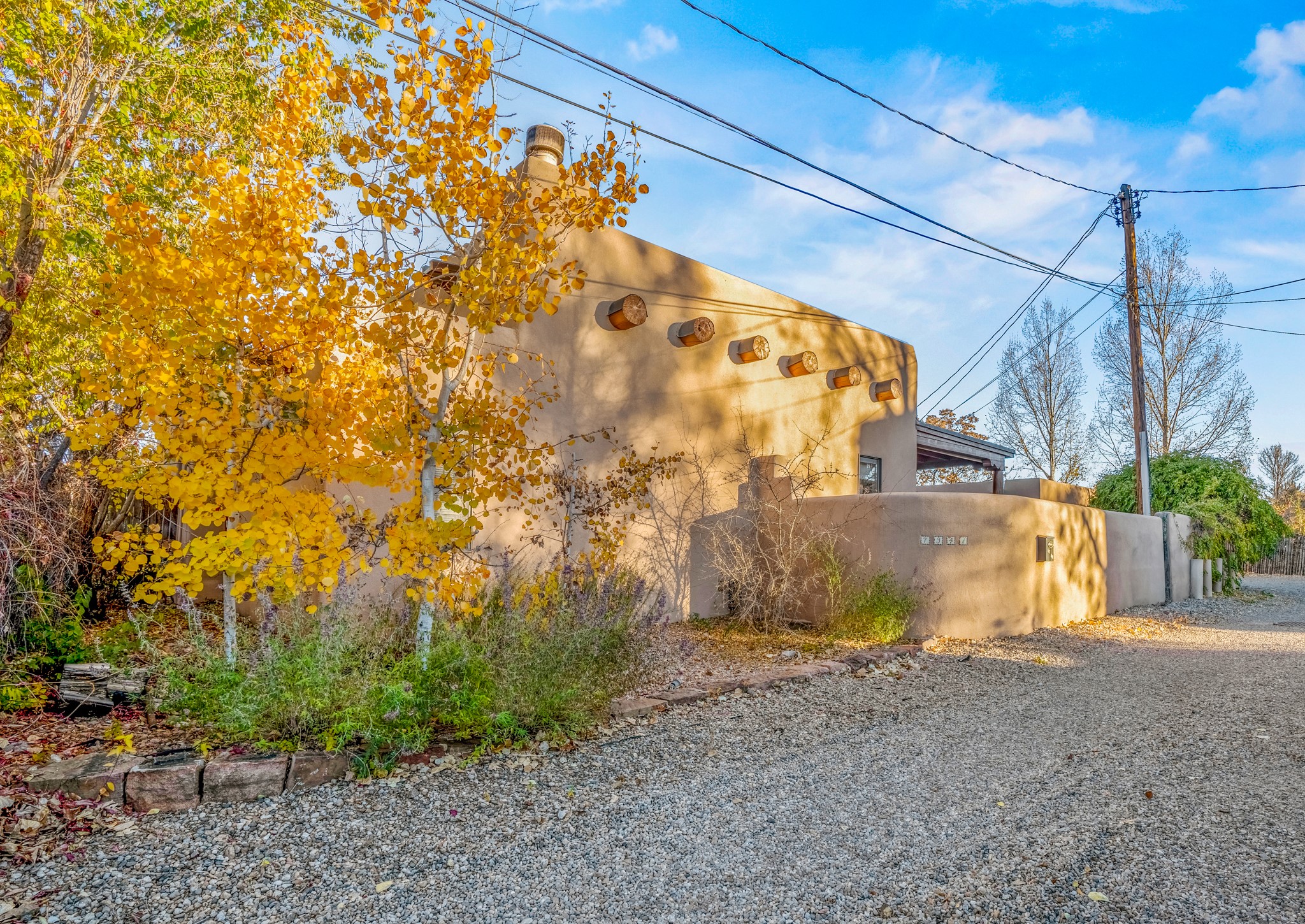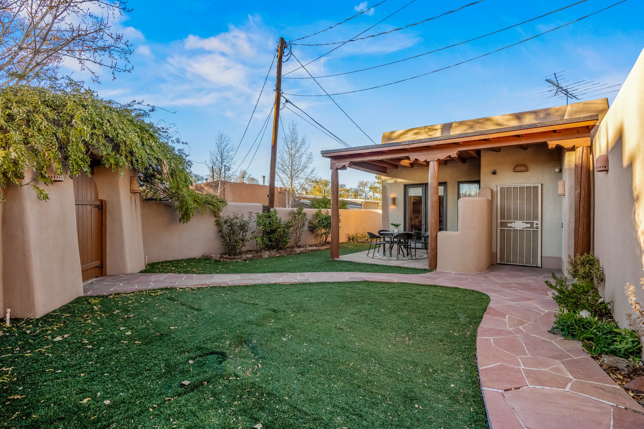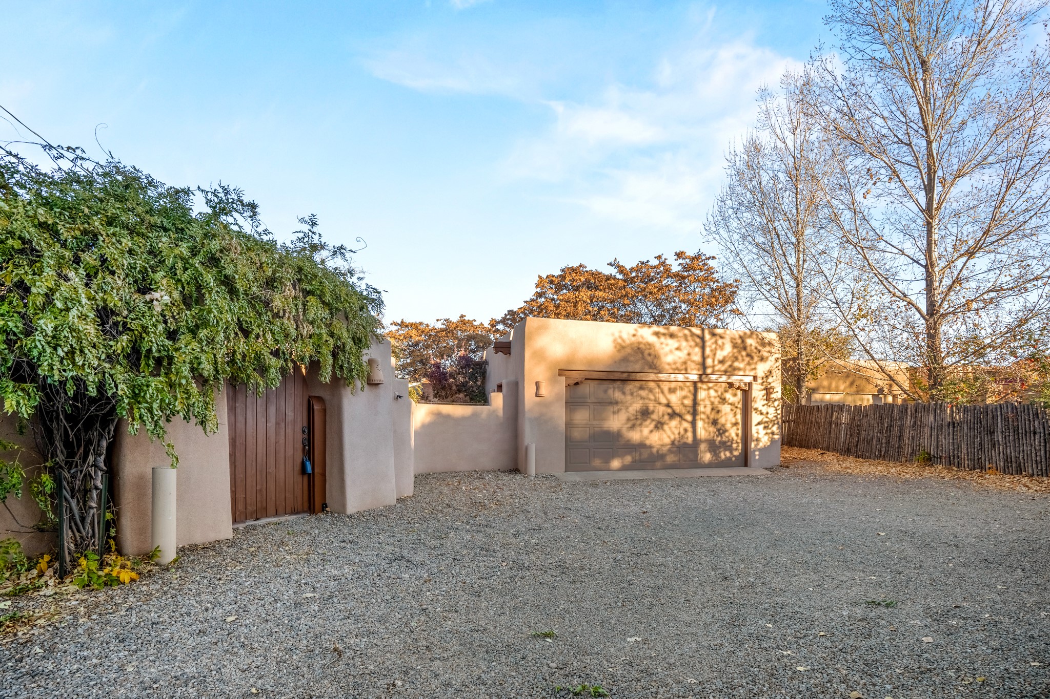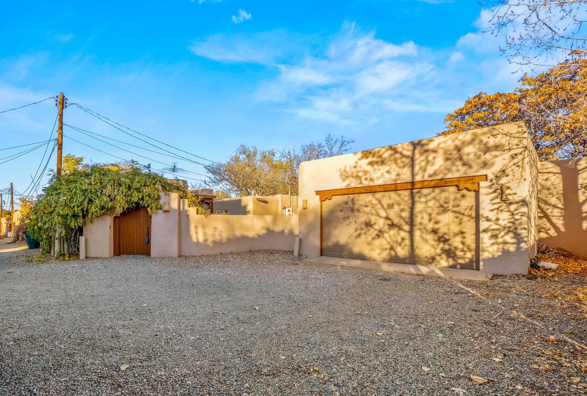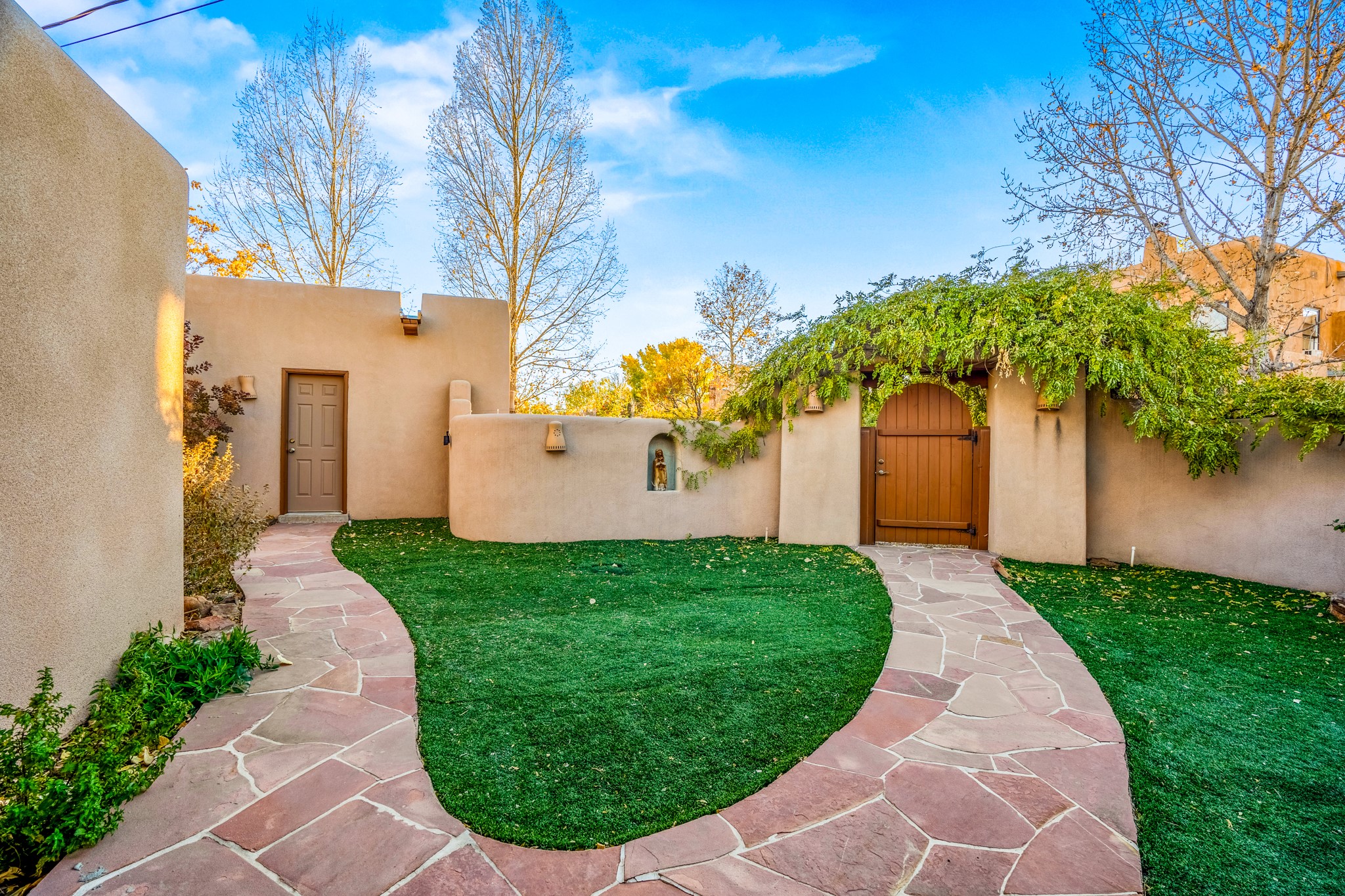 The original portion of this adobe home started off in the 1930's and was lovingly added onto by owner/builder Richard Gorman in the early 2000's. This home is in the tradition of many of our homes and neighborhoods as it is located off the main street on a quaint lane (and the last home) giving it a feeling of privacy and tranquility. The home is walled and gated and opens up to a delightful courtyard and features a portal area that would be lovely for warm weather dining. The addition of the great room with its high beamed ceilings, tile floors and corner fireplace brings in ambient light from the south/southwest. Also added at this time was a powder room and laundry area. The primary bedroom is cozy yet roomy as it has an area that would be perfect for a sitting area or an in-home office. The primary bath area was remodeled a couple of years ago and the primary closet was added on to and it is quite spacious! The stairs off the primary bedroom lead to a storage area that would make a great place to store your wine collection. Last but not least is the roomy two car garage and additional parking for guests, both unusual for the area. Easy walking to the Railyard District which features entertainment during the summer months, the Farmers Market, restaurants and a great movie theater. This home is a must-see if you would like to be closer to the downtown area and Railyard District.