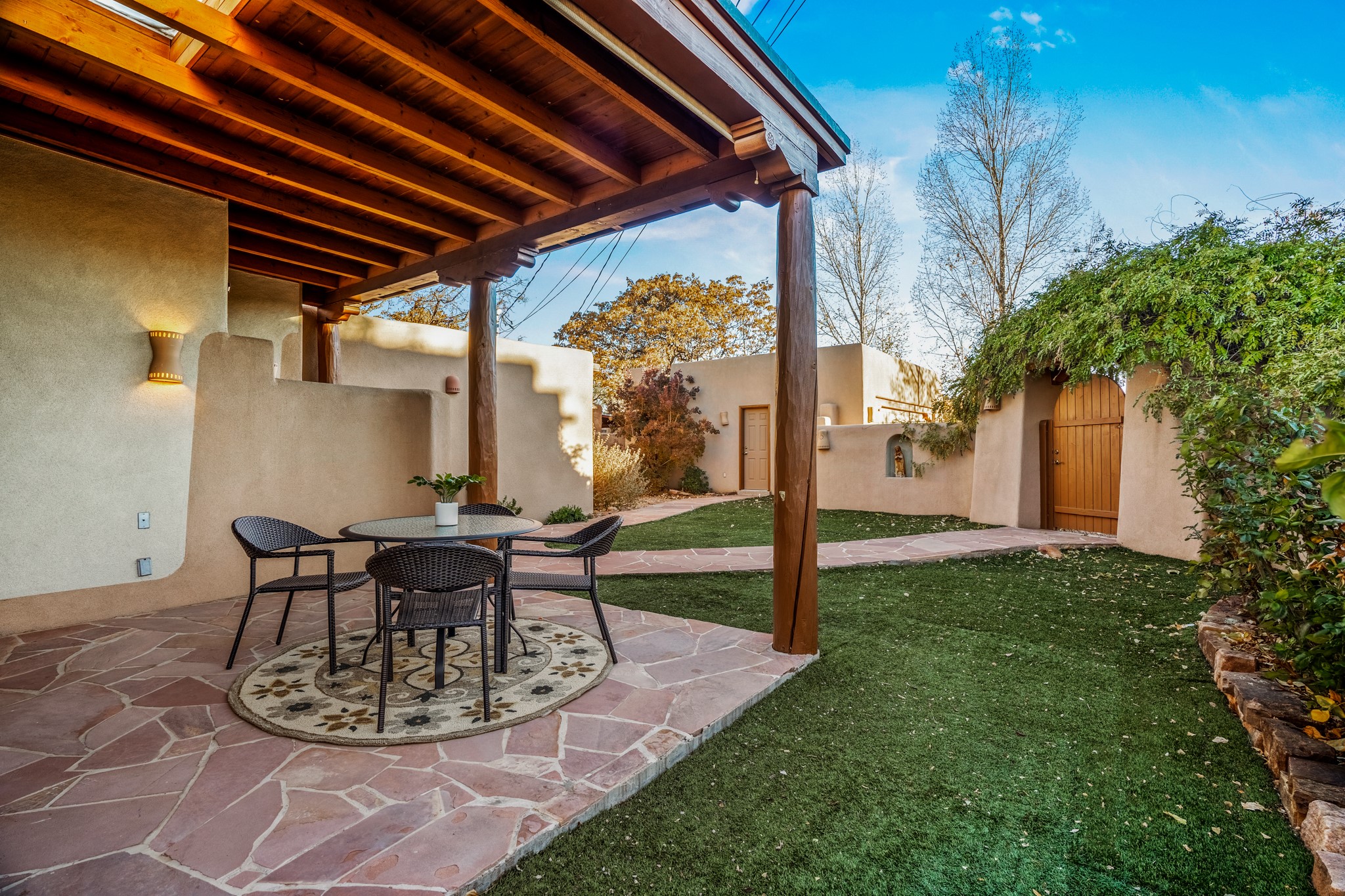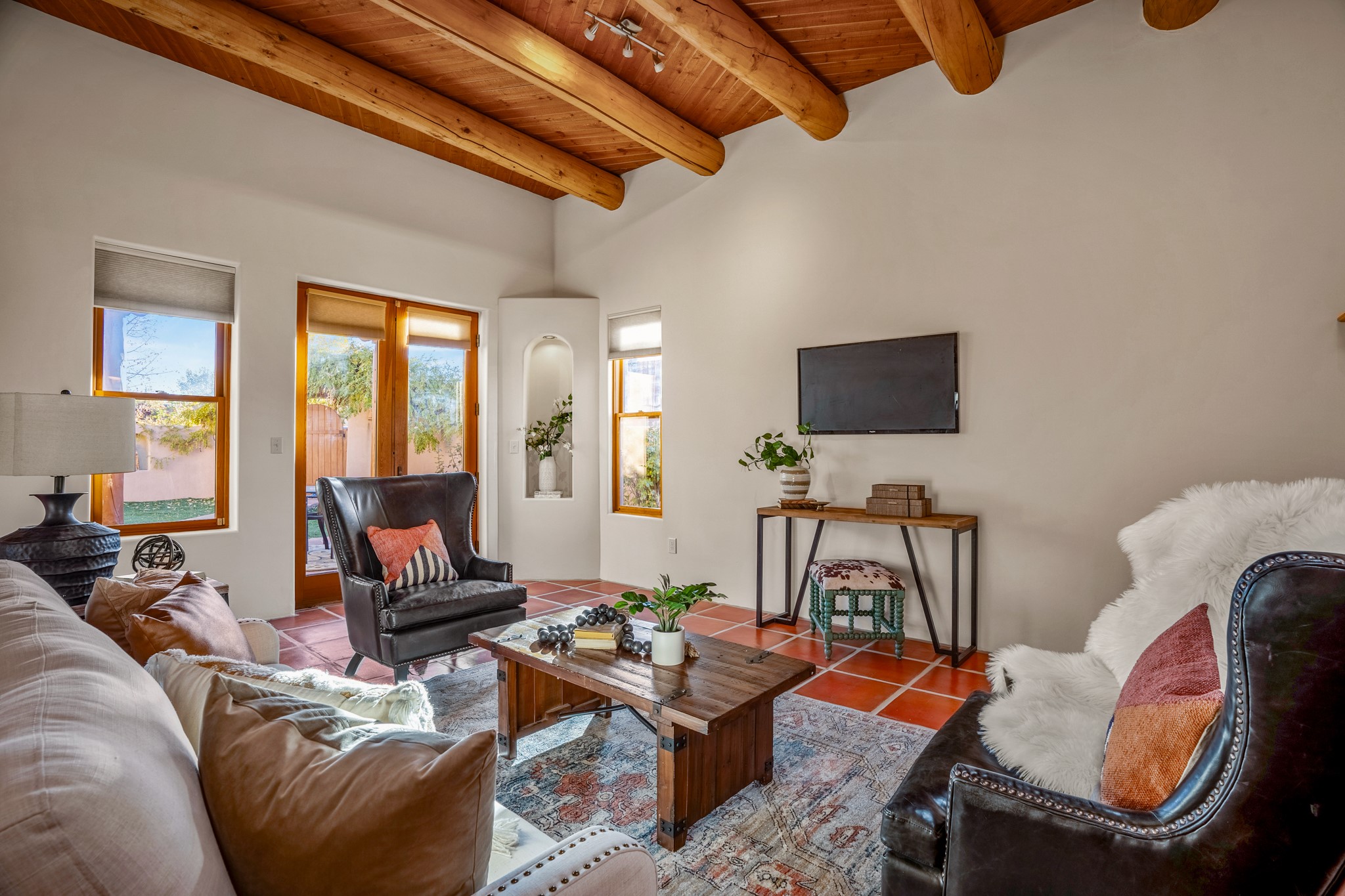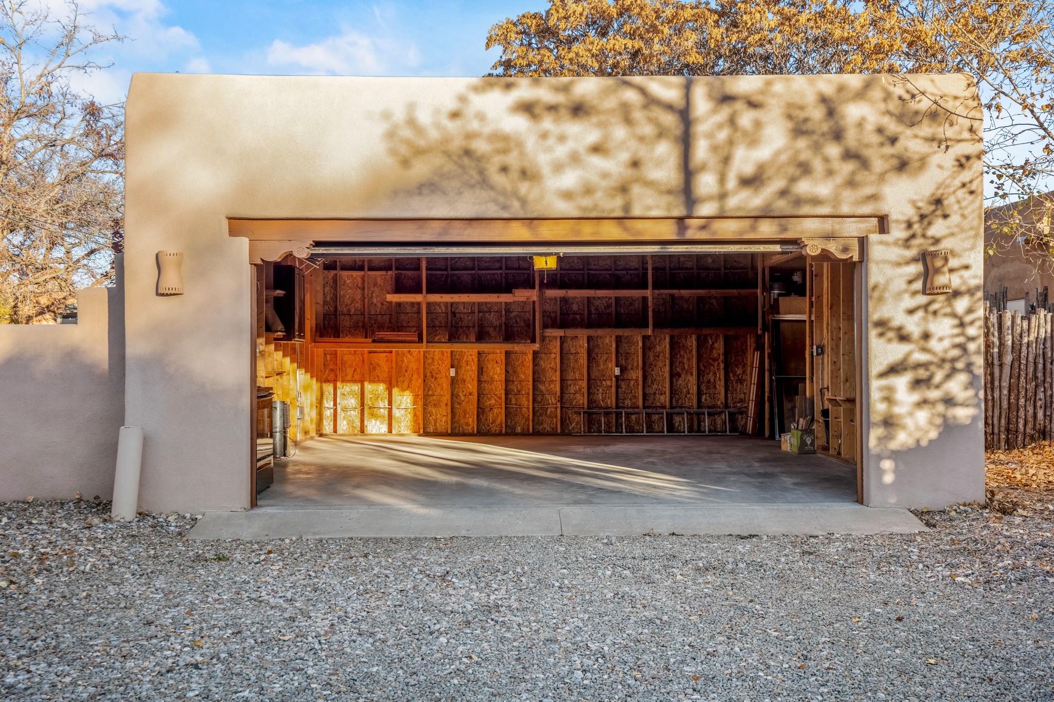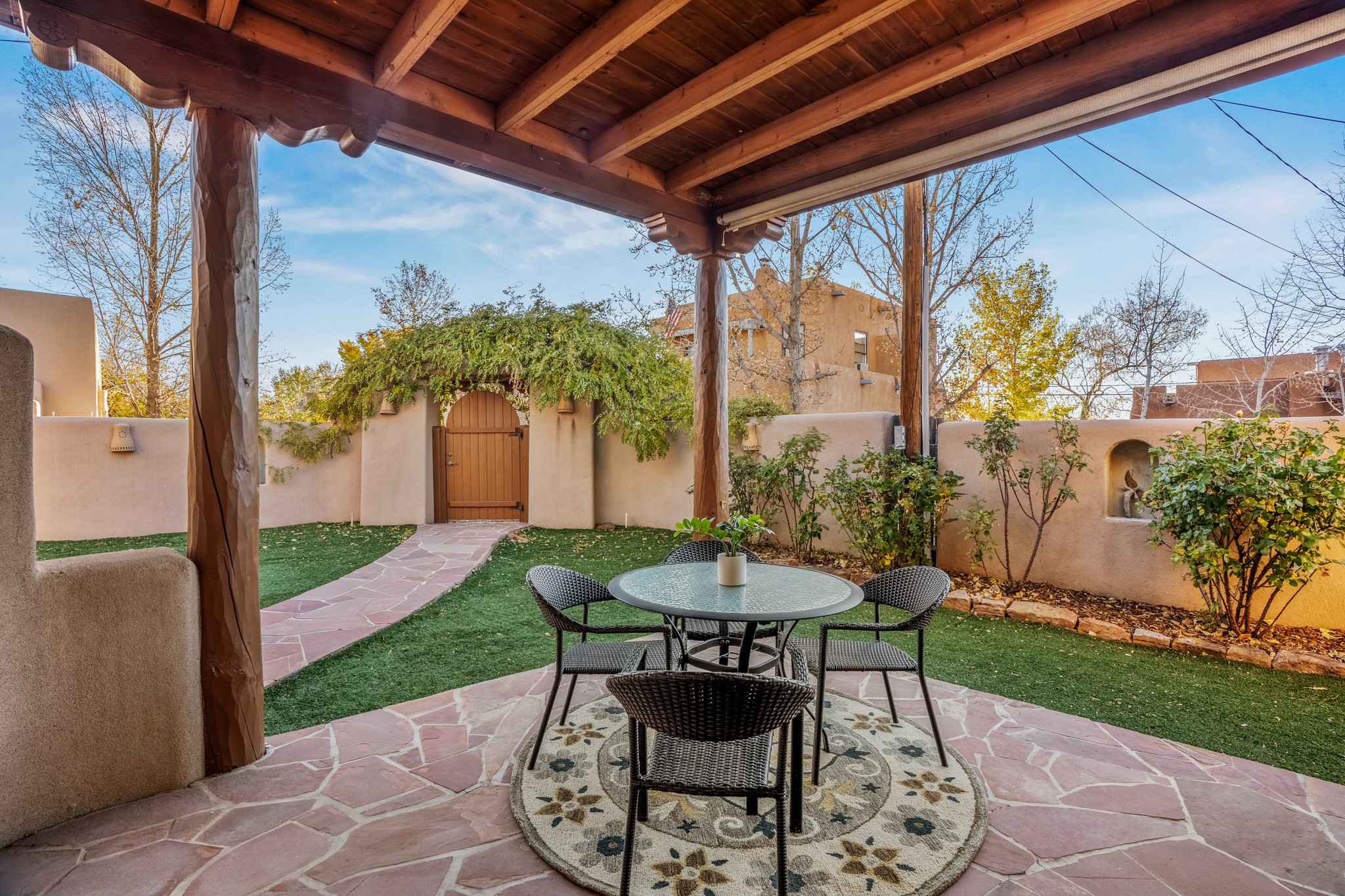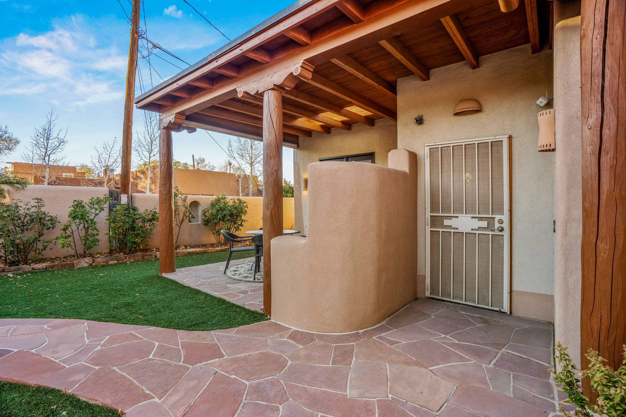 The original portion of this adobe home started off in the 1930's and was lovingly added onto by owner/builder Richard Gorman in the early 2000's. This home is in the tradition of many of our homes and neighborhoods as it is located off the main street on a quaint lane (and the last home) giving it a feeling of privacy and tranquility. The home is walled and gated and opens up to a delightful courtyard and features a portal area that would be lovely for warm weather dining. The addition of the great room with its high beamed ceilings, tile floors and corner fireplace brings in ambient light from the south/southwest. Also added at this time was a powder room and laundry area. The primary bedroom is cozy yet roomy as it has an area that would be perfect for a sitting area or an in-home office. The primary bath area was remodeled a couple of years ago and the primary closet was added on to and it is quite spacious! The stairs off the primary bedroom lead to a storage area that would make a great place to store your wine collection. Last but not least is the roomy two car garage and additional parking for guests, both unusual for the area. Easy walking to the Railyard District which features entertainment during the summer months, the Farmers Market, restaurants and a great movie theater. This home is a must-see if you would like to be closer to the downtown area and Railyard District.