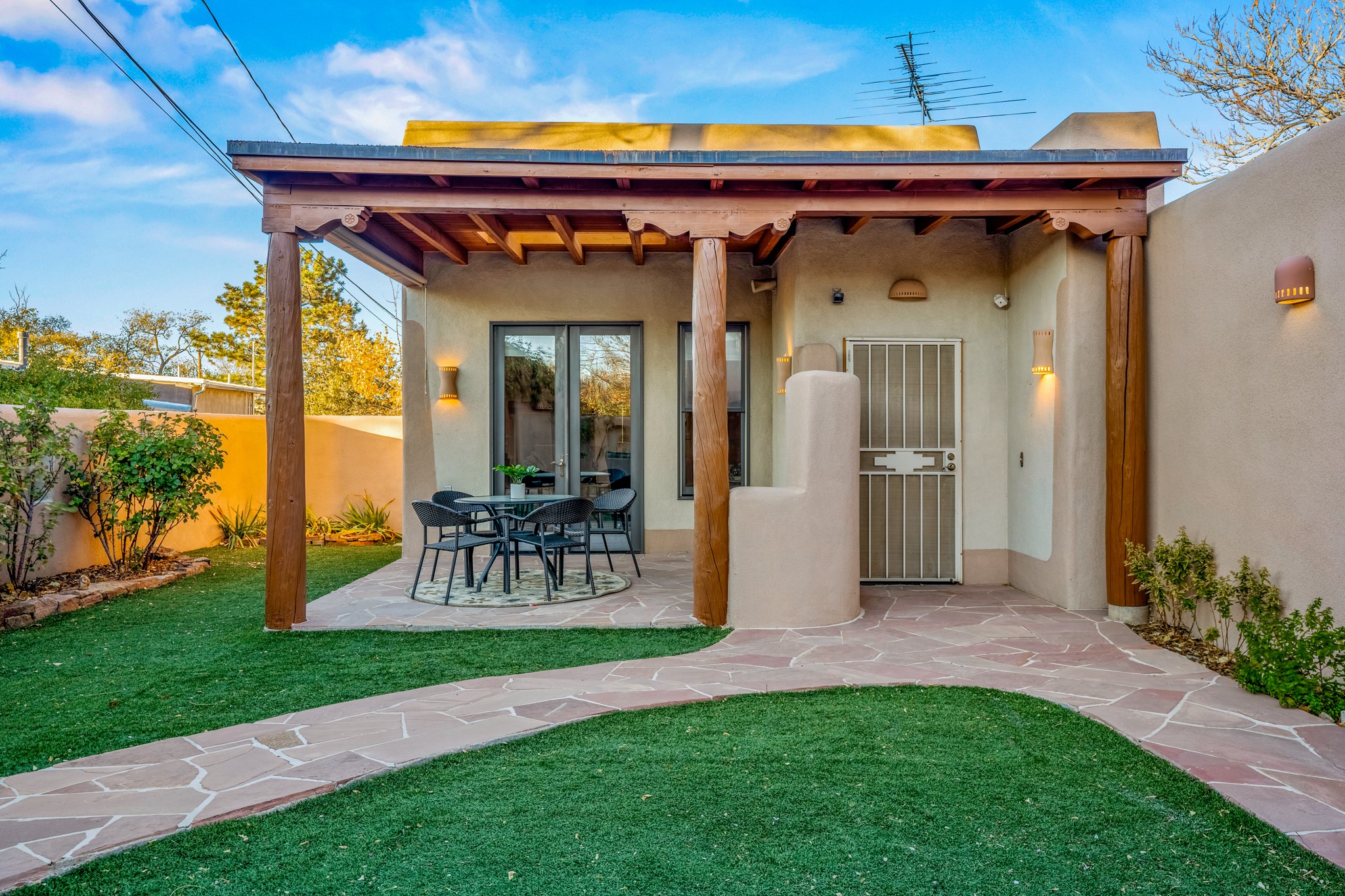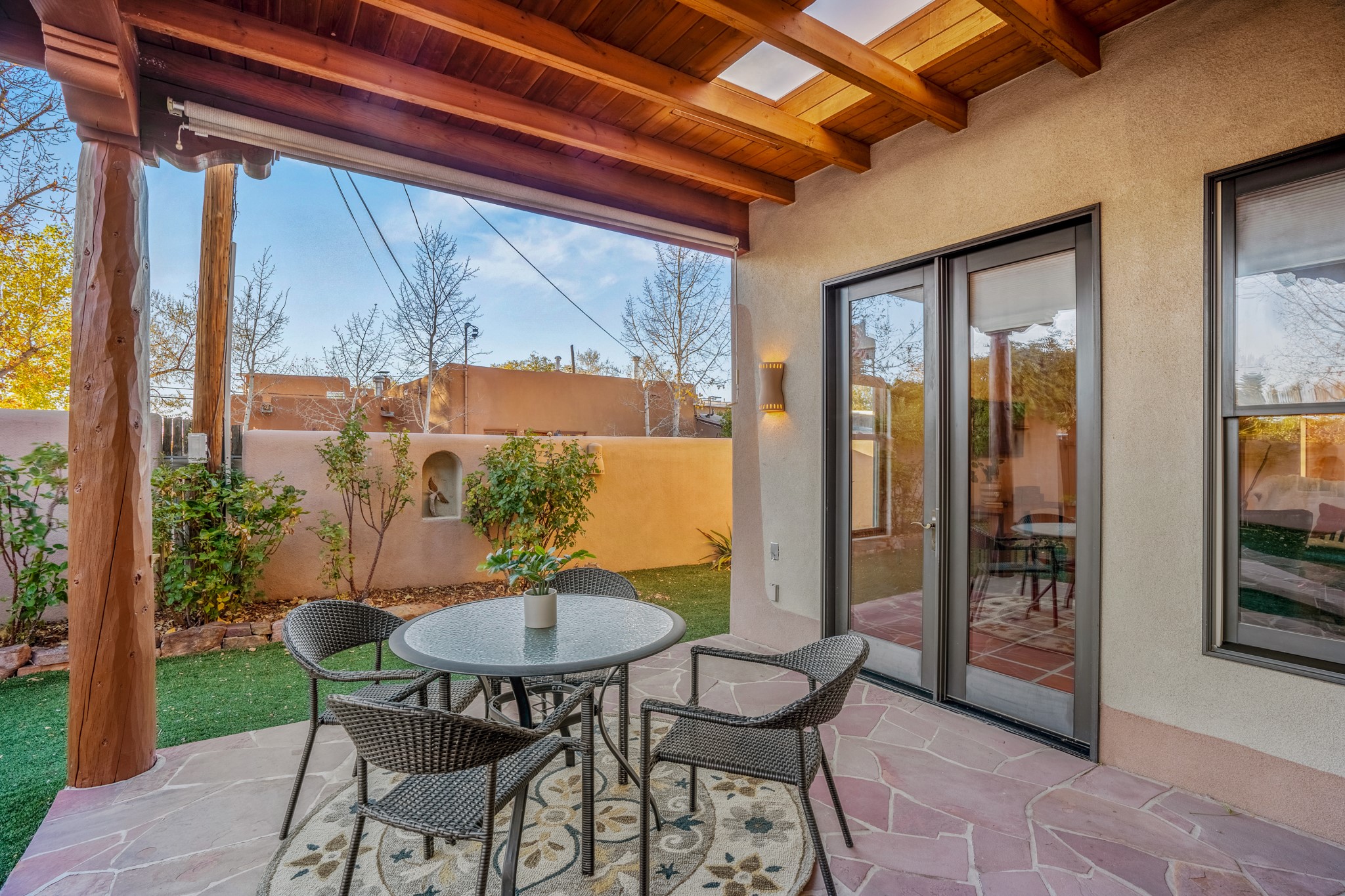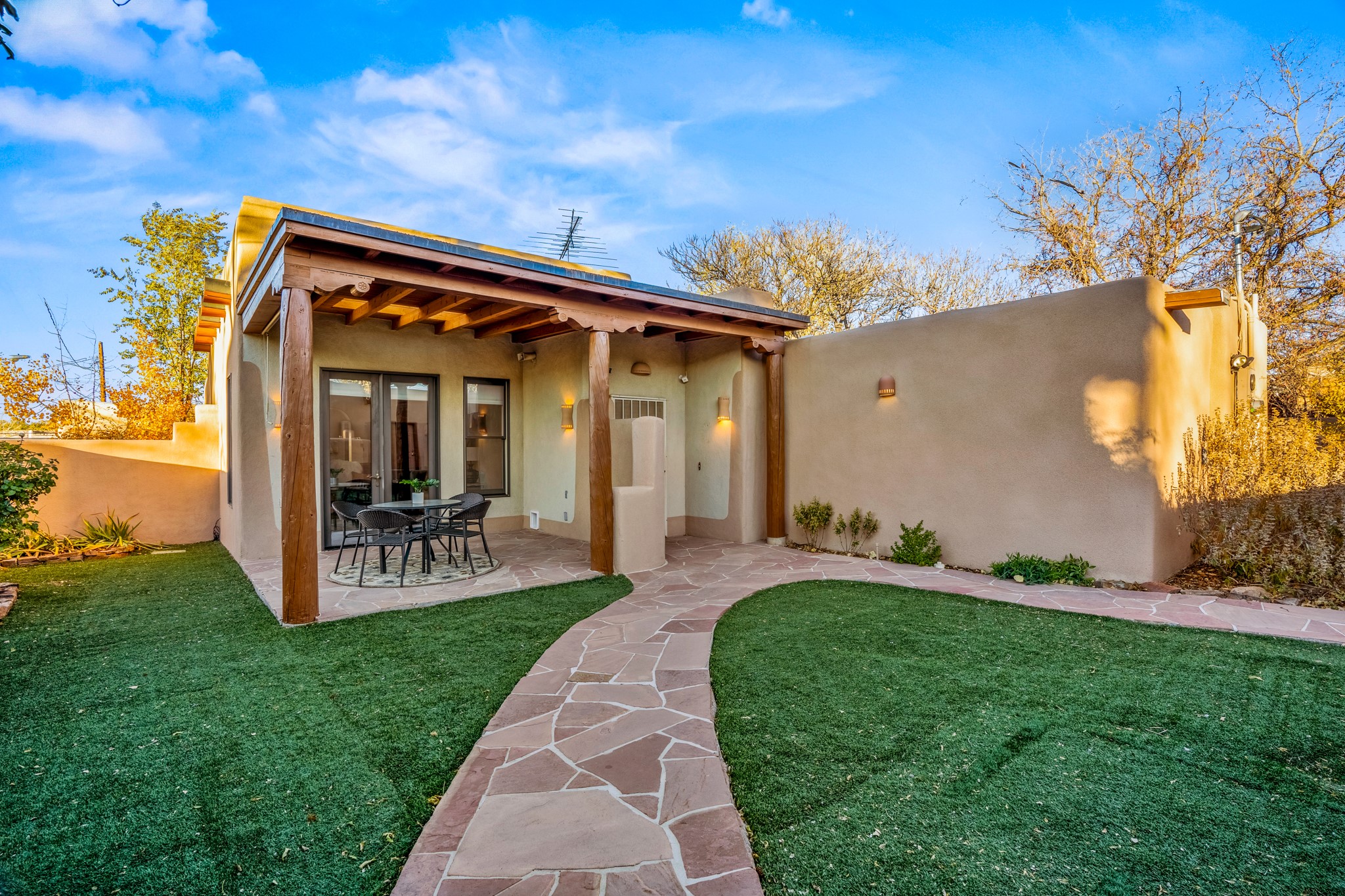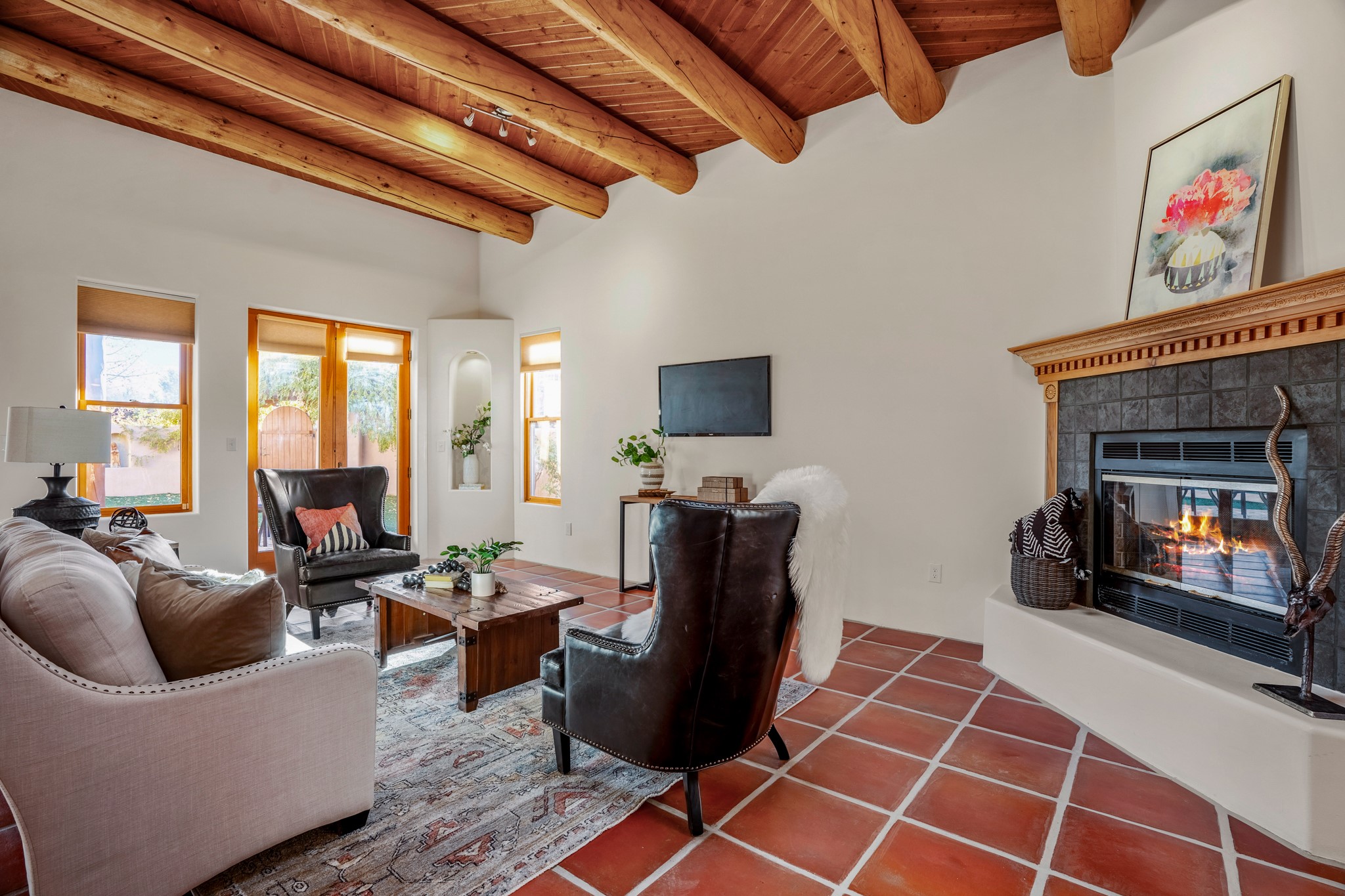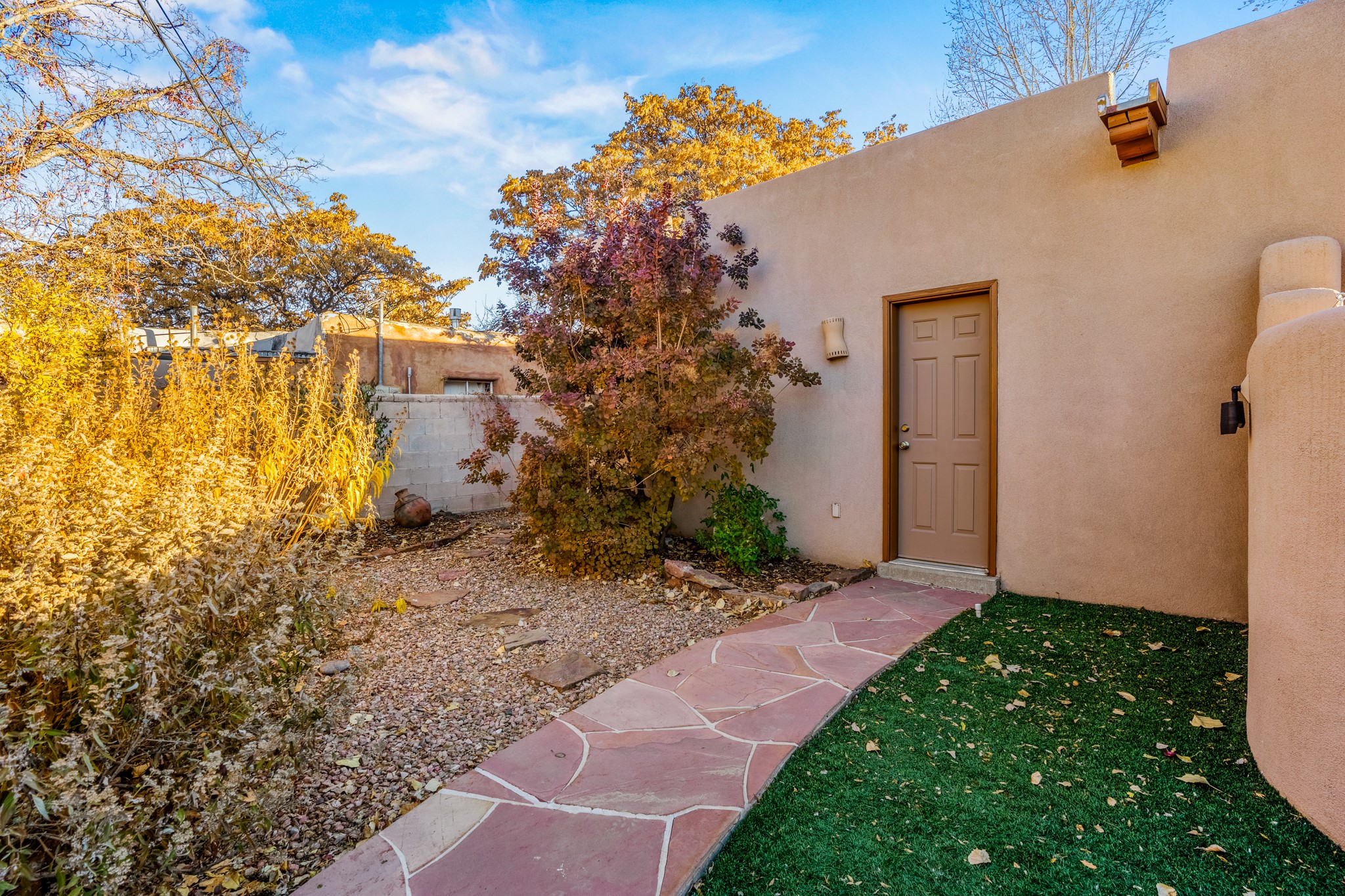 The original portion of this adobe home started off in the 1930's and was lovingly added onto by owner/builder Richard Gorman in the early 2000's. This home is in the tradition of many of our homes and neighborhoods as it is located off the main street on a quaint lane (and the last home) giving it a feeling of privacy and tranquility. The home is walled and gated and opens up to a delightful courtyard and features a portal area that would be lovely for warm weather dining. The addition of the great room with its high beamed ceilings, tile floors and corner fireplace brings in ambient light from the south/southwest. Also added at this time was a powder room and laundry area. The primary bedroom is cozy yet roomy as it has an area that would be perfect for a sitting area or an in-home office. The primary bath area was remodeled a couple of years ago and the primary closet was added on to and it is quite spacious! The stairs off the primary bedroom lead to a storage area that would make a great place to store your wine collection. Last but not least is the roomy two car garage and additional parking for guests, both unusual for the area. Easy walking to the Railyard District which features entertainment during the summer months, the Farmers Market, restaurants and a great movie theater. This home is a must-see if you would like to be closer to the downtown area and Railyard District.
