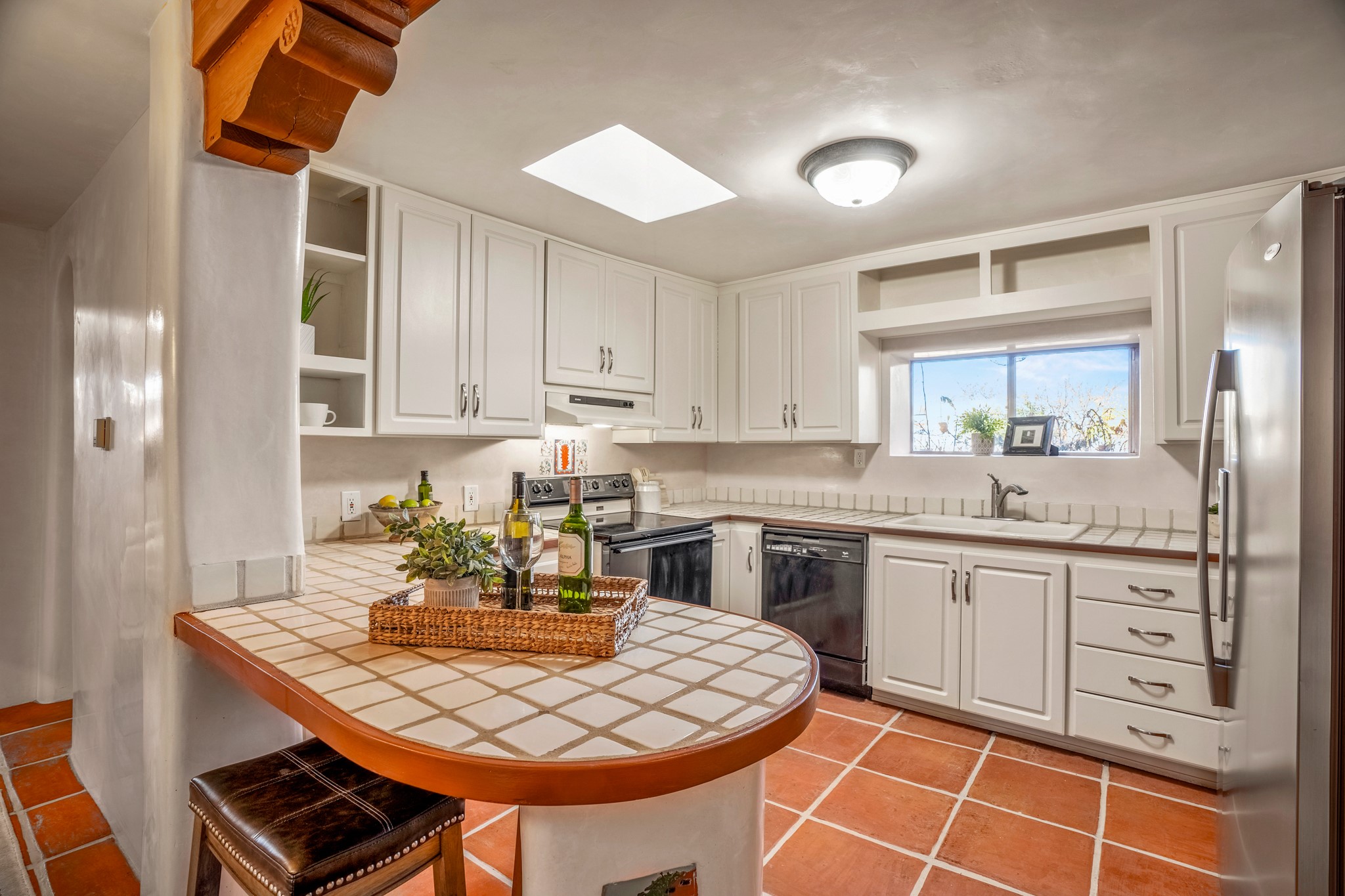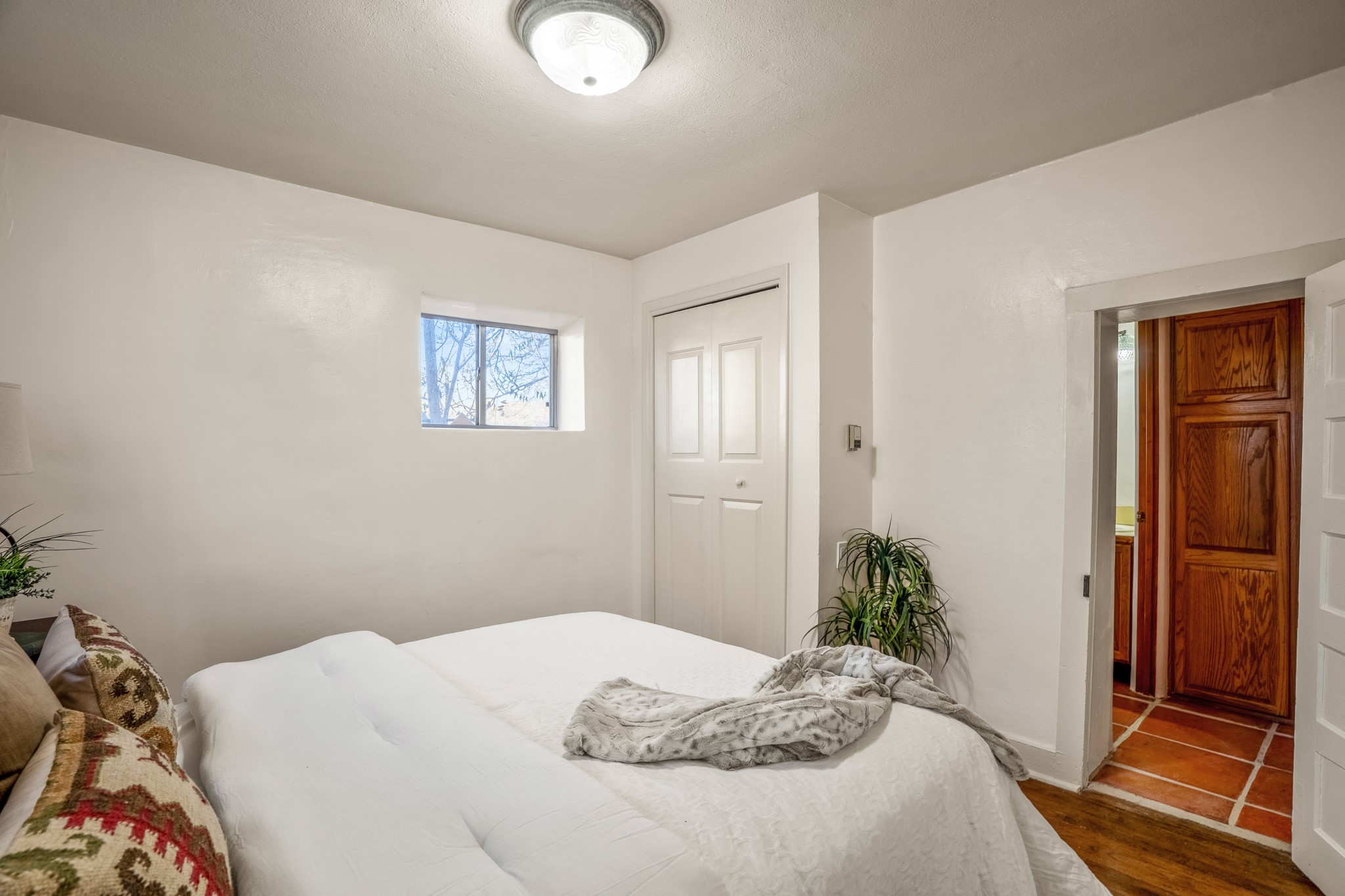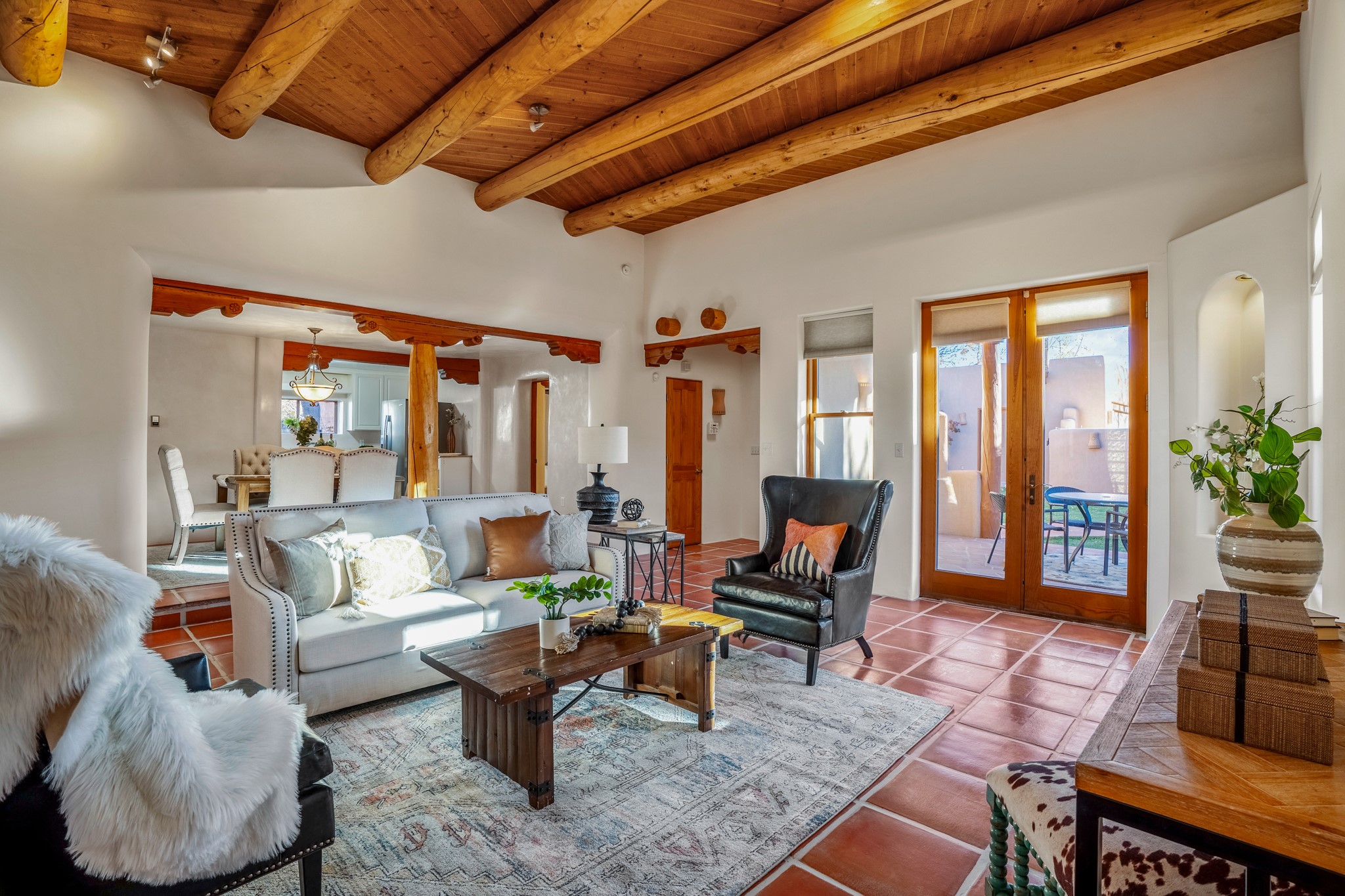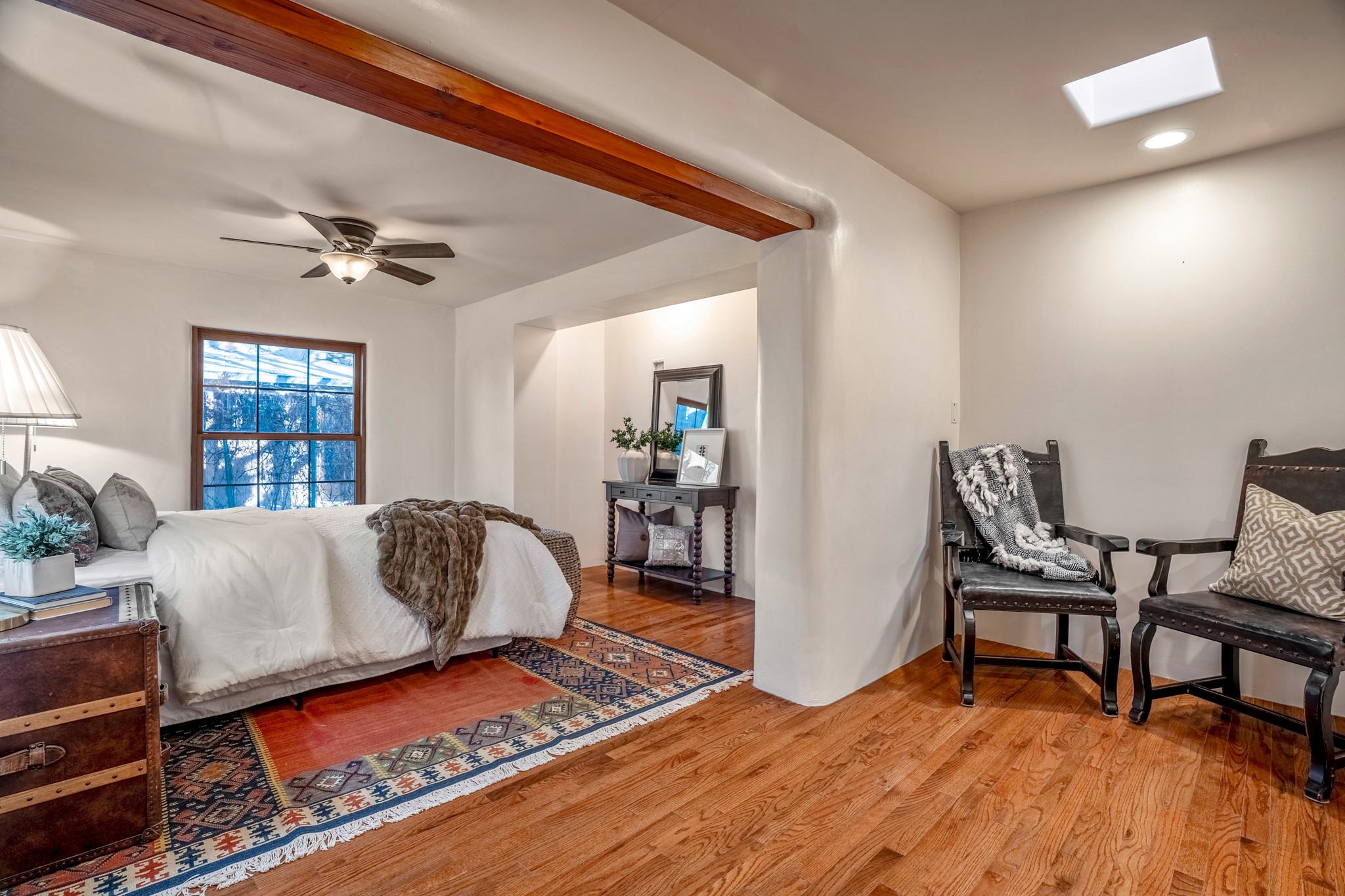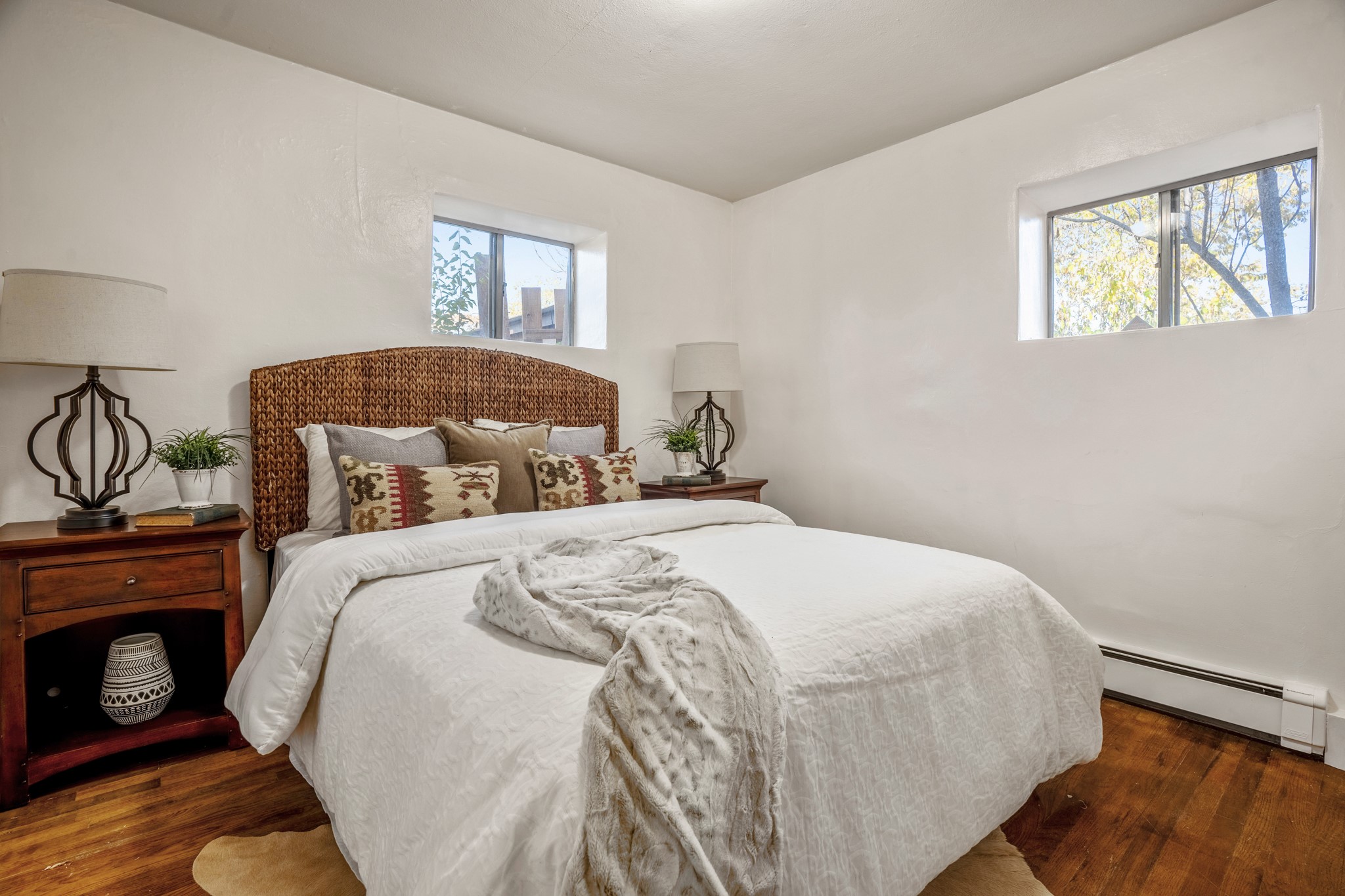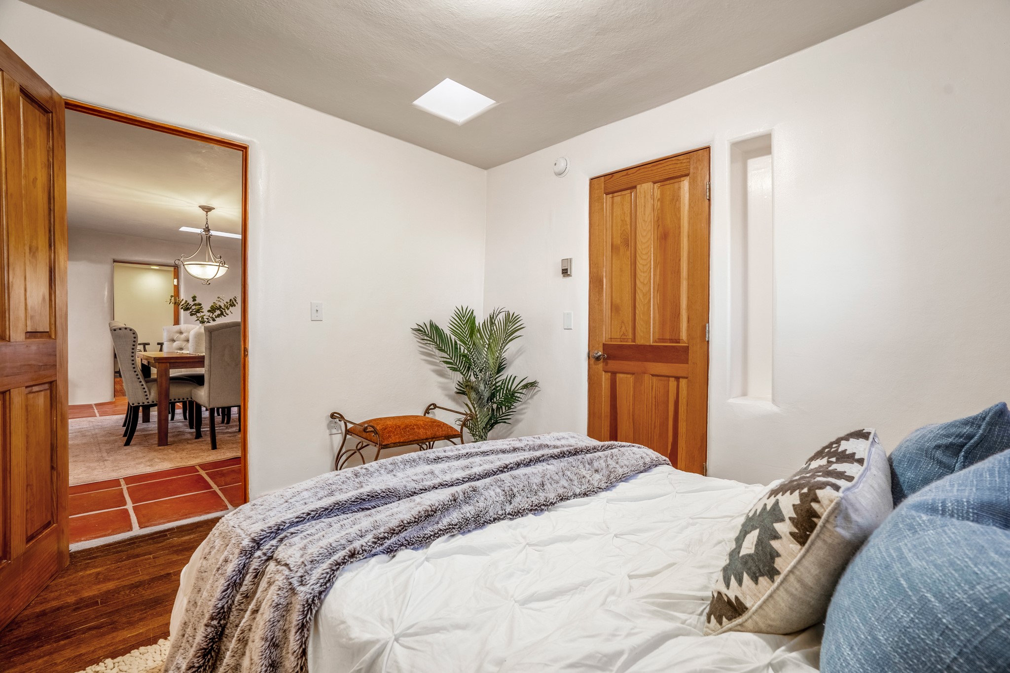 The original portion of this adobe home started off in the 1930's and was lovingly added onto by owner/builder Richard Gorman in the early 2000's. This home is in the tradition of many of our homes and neighborhoods as it is located off the main street on a quaint lane (and the last home) giving it a feeling of privacy and tranquility. The home is walled and gated and opens up to a delightful courtyard and features a portal area that would be lovely for warm weather dining. The addition of the great room with its high beamed ceilings, tile floors and corner fireplace brings in ambient light from the south/southwest. Also added at this time was a powder room and laundry area. The primary bedroom is cozy yet roomy as it has an area that would be perfect for a sitting area or an in-home office. The primary bath area was remodeled a couple of years ago and the primary closet was added on to and it is quite spacious! The stairs off the primary bedroom lead to a storage area that would make a great place to store your wine collection. Last but not least is the roomy two car garage and additional parking for guests, both unusual for the area. Easy walking to the Railyard District which features entertainment during the summer months, the Farmers Market, restaurants and a great movie theater. This home is a must-see if you would like to be closer to the downtown area and Railyard District.