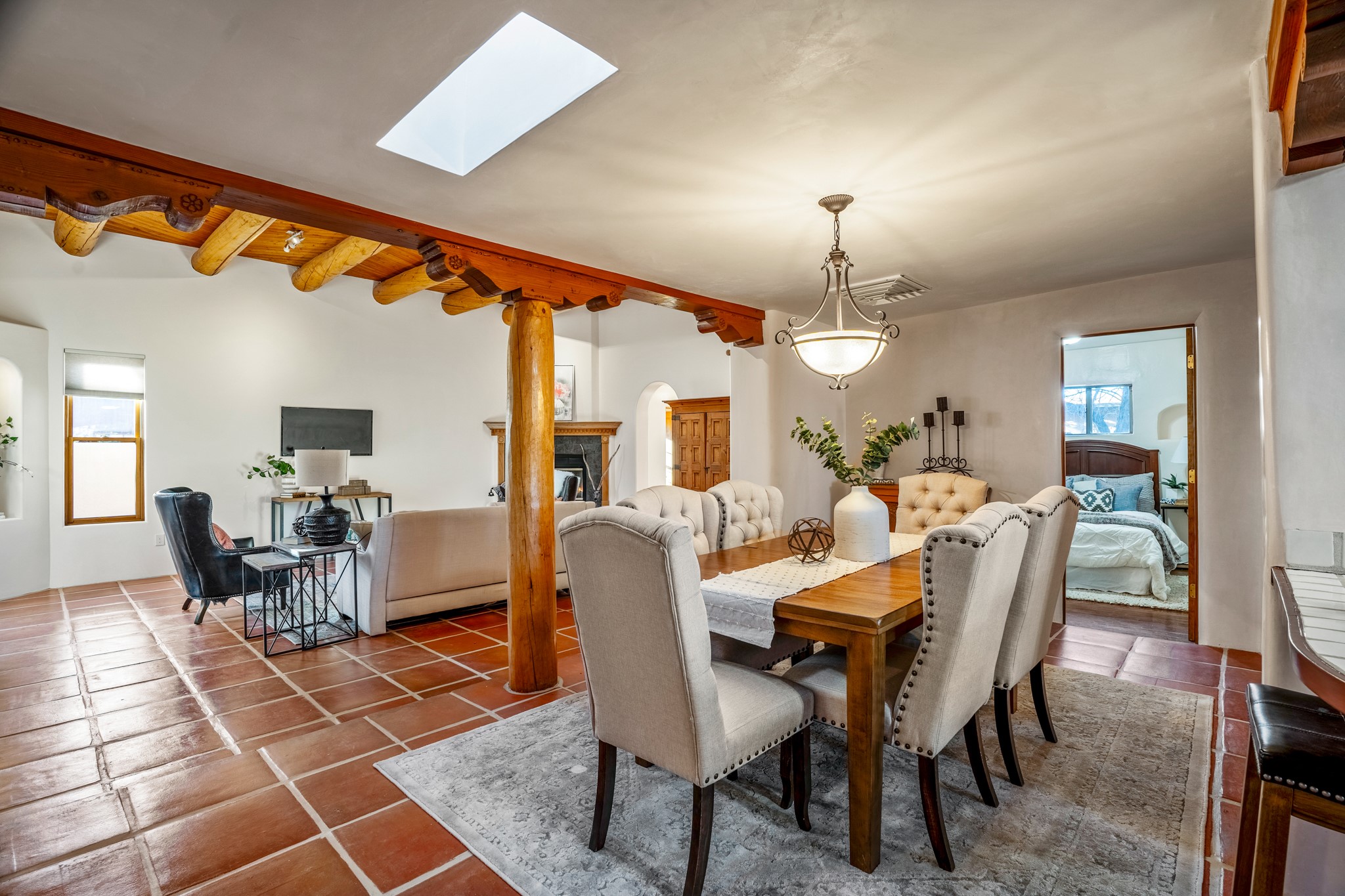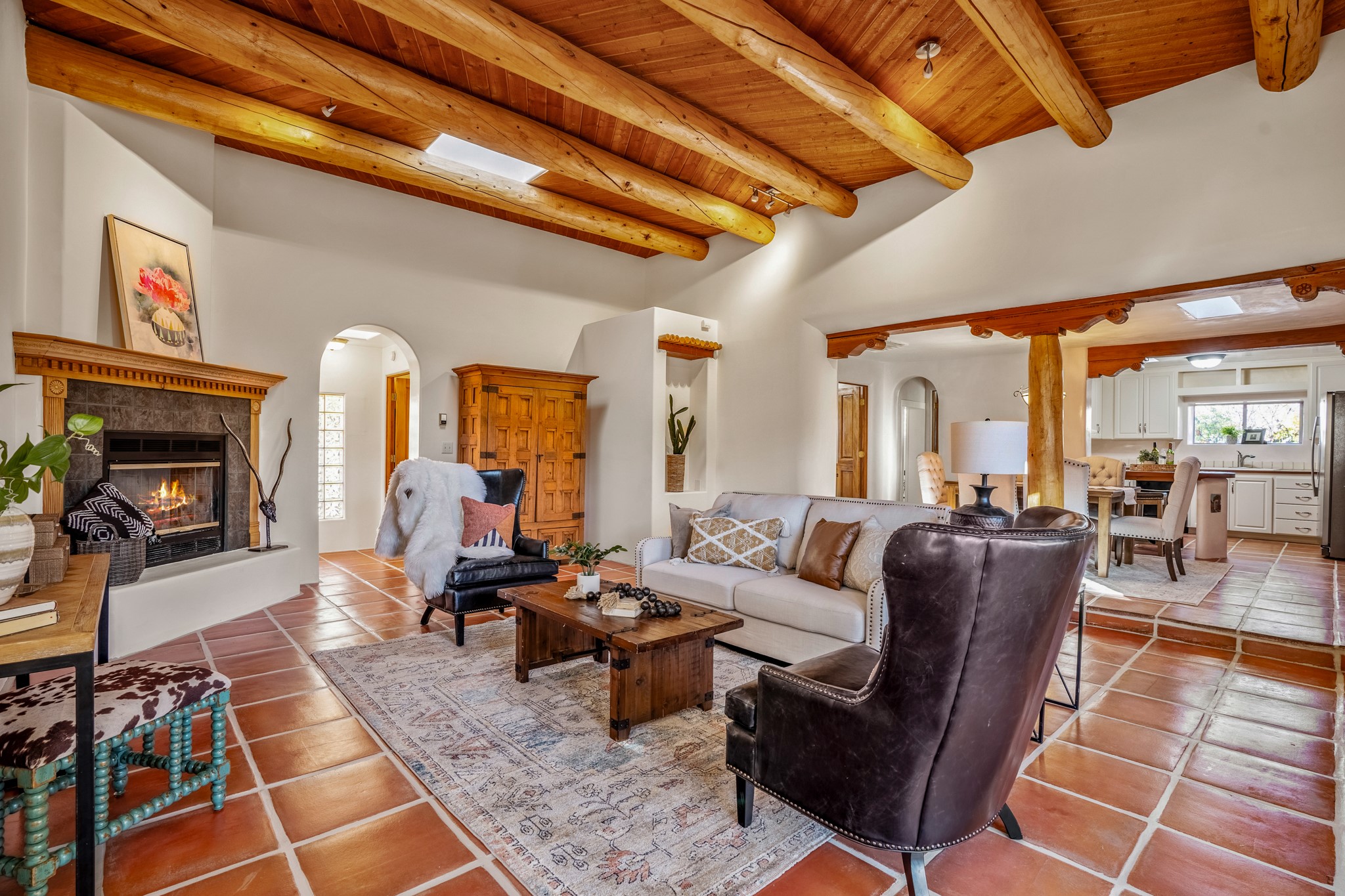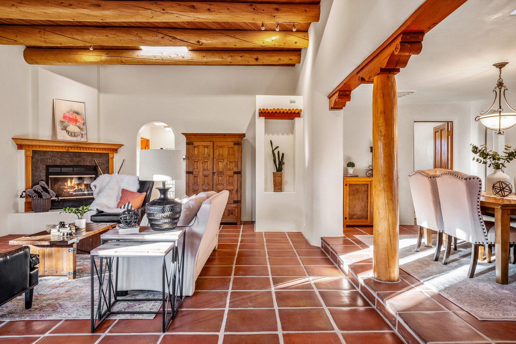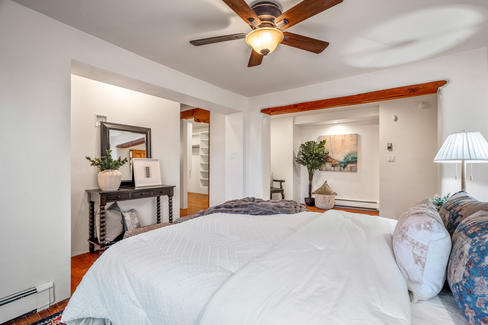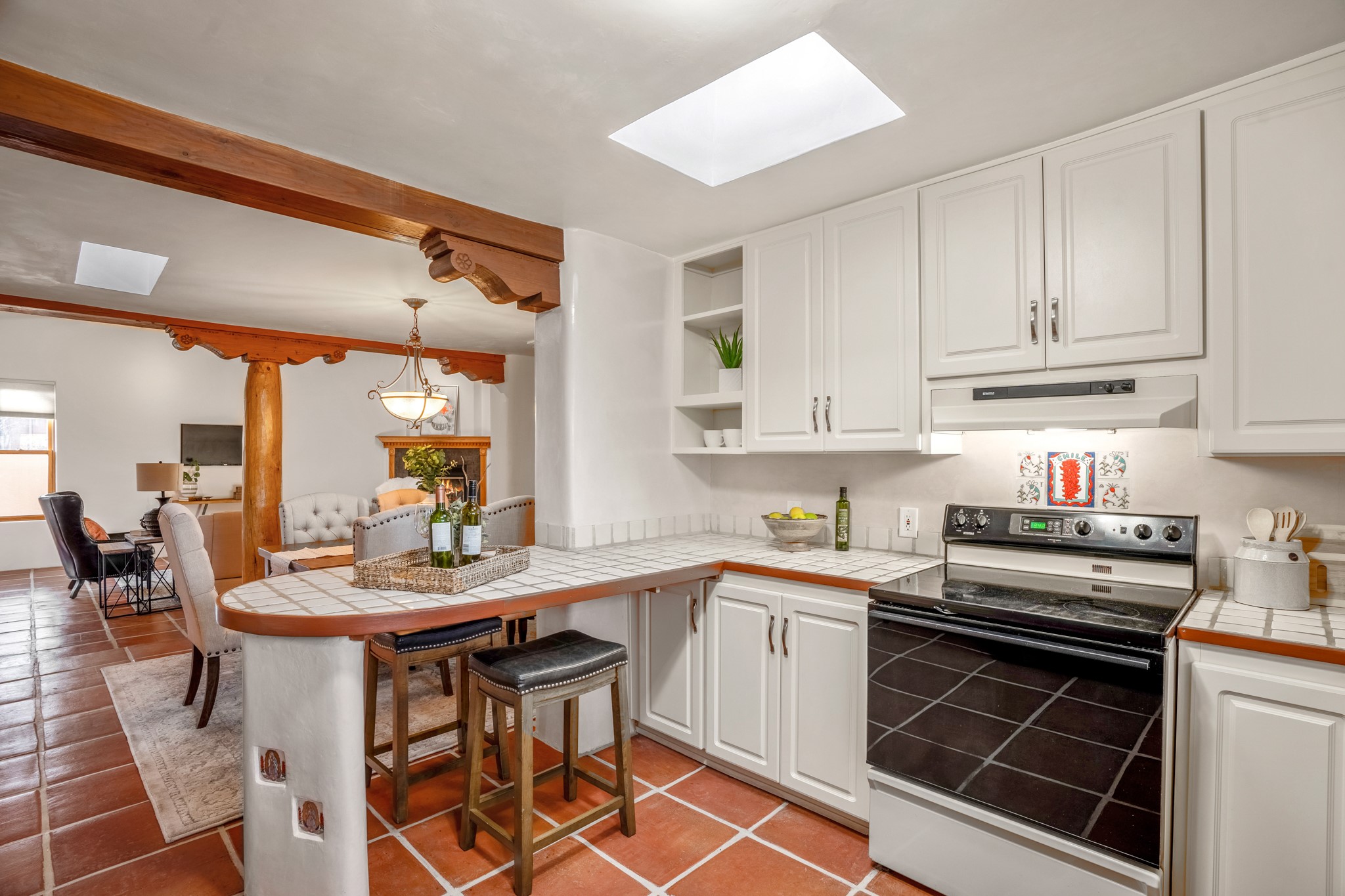 The original portion of this adobe home started off in the 1930's and was lovingly added onto by owner/builder Richard Gorman in the early 2000's. This home is in the tradition of many of our homes and neighborhoods as it is located off the main street on a quaint lane (and the last home) giving it a feeling of privacy and tranquility. The home is walled and gated and opens up to a delightful courtyard and features a portal area that would be lovely for warm weather dining. The addition of the great room with its high beamed ceilings, tile floors and corner fireplace brings in ambient light from the south/southwest. Also added at this time was a powder room and laundry area. The primary bedroom is cozy yet roomy as it has an area that would be perfect for a sitting area or an in-home office. The primary bath area was remodeled a couple of years ago and the primary closet was added on to and it is quite spacious! The stairs off the primary bedroom lead to a storage area that would make a great place to store your wine collection. Last but not least is the roomy two car garage and additional parking for guests, both unusual for the area. Easy walking to the Railyard District which features entertainment during the summer months, the Farmers Market, restaurants and a great movie theater. This home is a must-see if you would like to be closer to the downtown area and Railyard District.