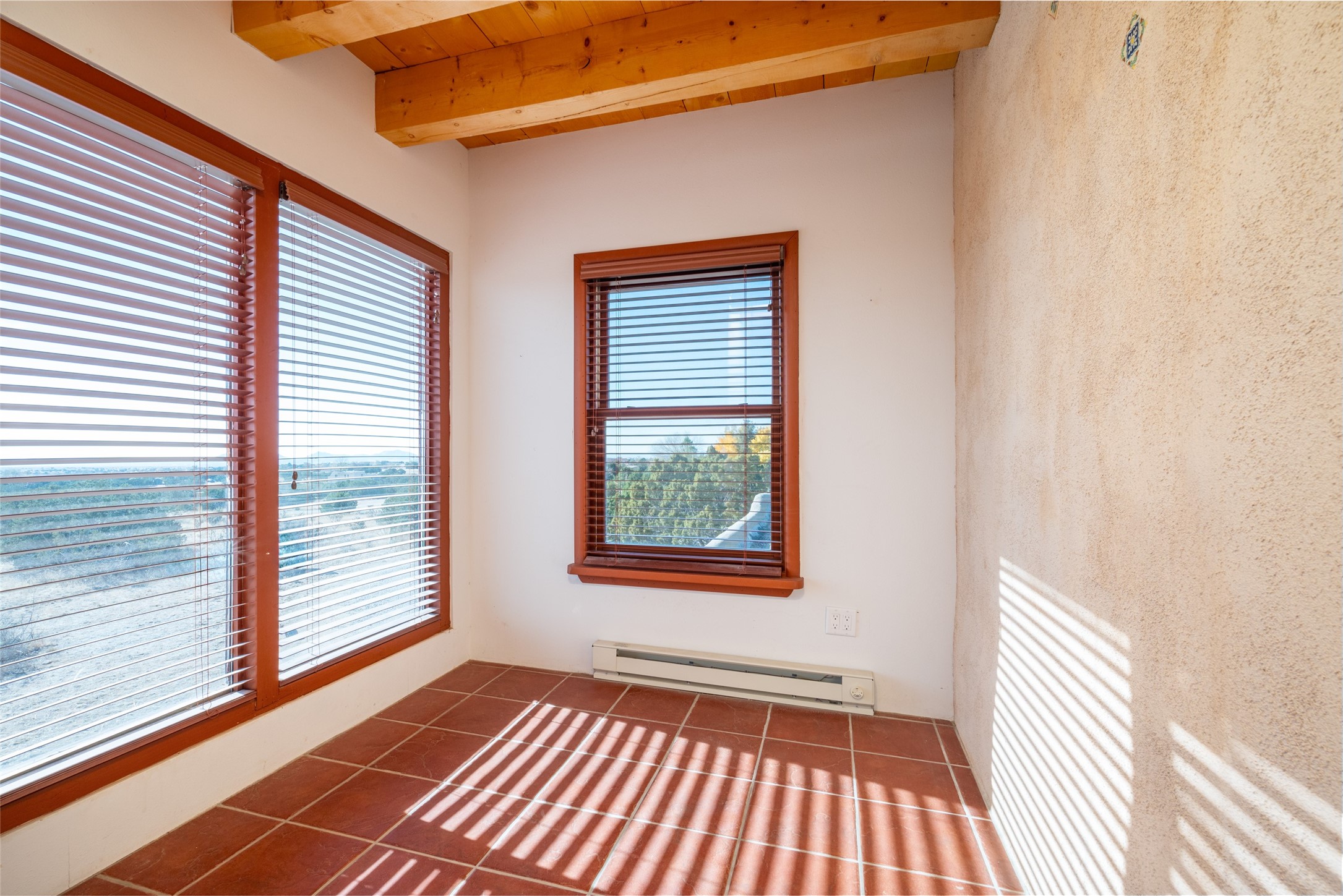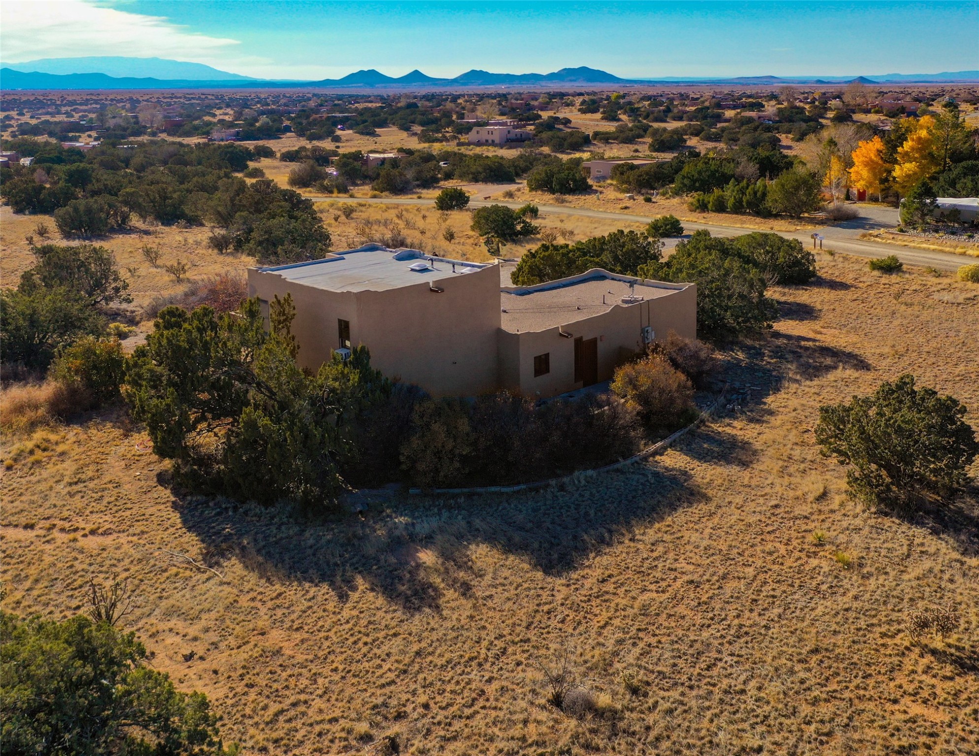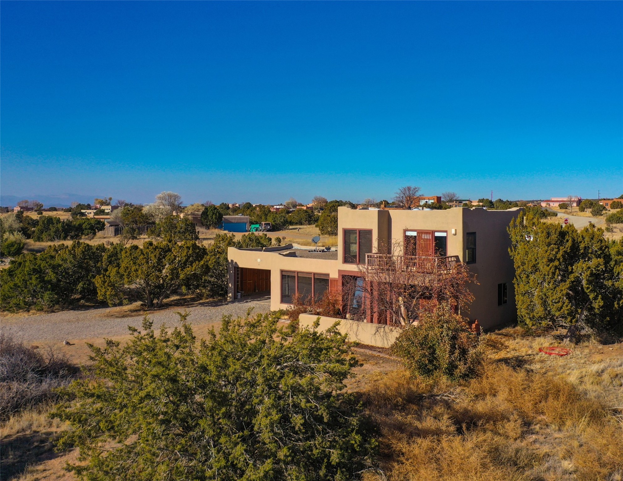 Home for the Holidays!! Come view this charming passive solar style home, strategically positioned to capture breathtaking views of the Turquoise Hills, Ortiz Mountains, and Sandia Mountains. Experience the beauty of New Mexico's stunning sunsets and stormy skies from the comfort of the enclosed and heated sunroom, located off the upstairs primary bedroom. Situated on almost an acre and a half of land, this property offers ample space for outdoor activities. With two full baths, including one in the primary bedroom upstairs, convenience is ensured for all occupants. The main living area features an open floor plan with Saltillo-style flooring and beamed ceilings, adding a touch of warmth and character to the space, while the bedrooms are carpeted for added comfort. The well-appointed kitchen boasts essential appliances such as a dishwasher, electric range, and refrigerator, providing all you need for culinary endeavors. Additional features include a newer hot water heater for your comfort and efficiency. The home is all-electric with natural gas available if desired. Water supply is through a shared well. This property offers a unique opportunity to enjoy New Mexico's natural beauty while providing comfortable living spaces. Don't miss out on this wonderful home - schedule a showing today!