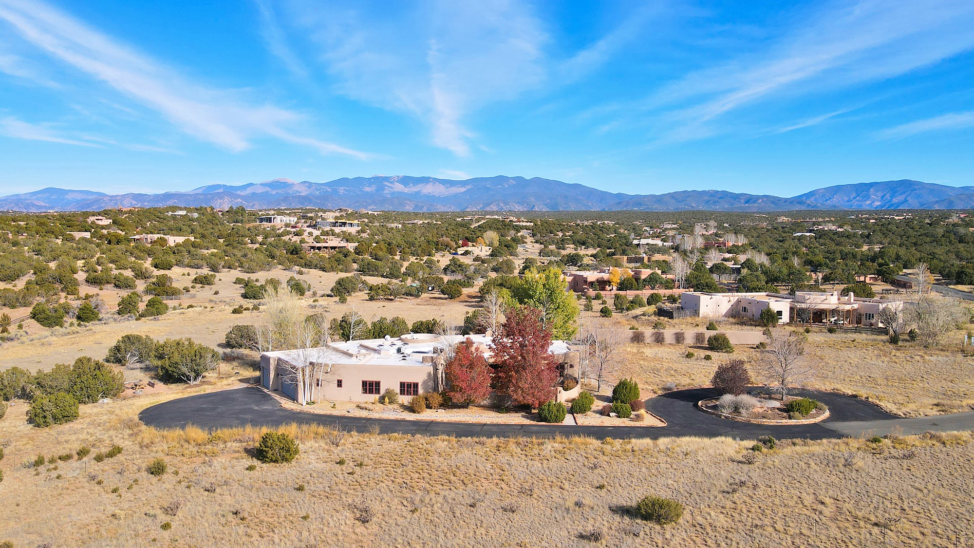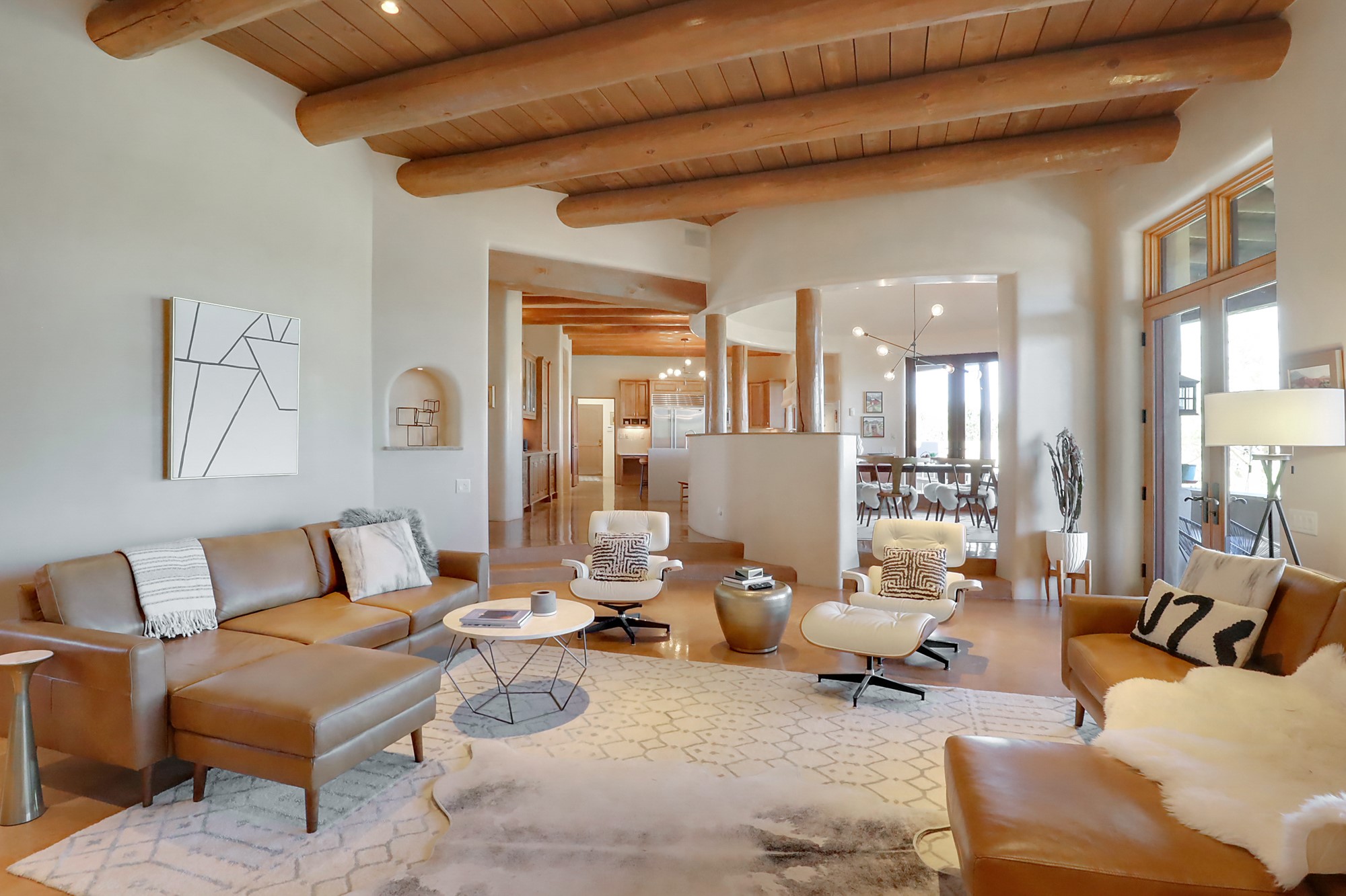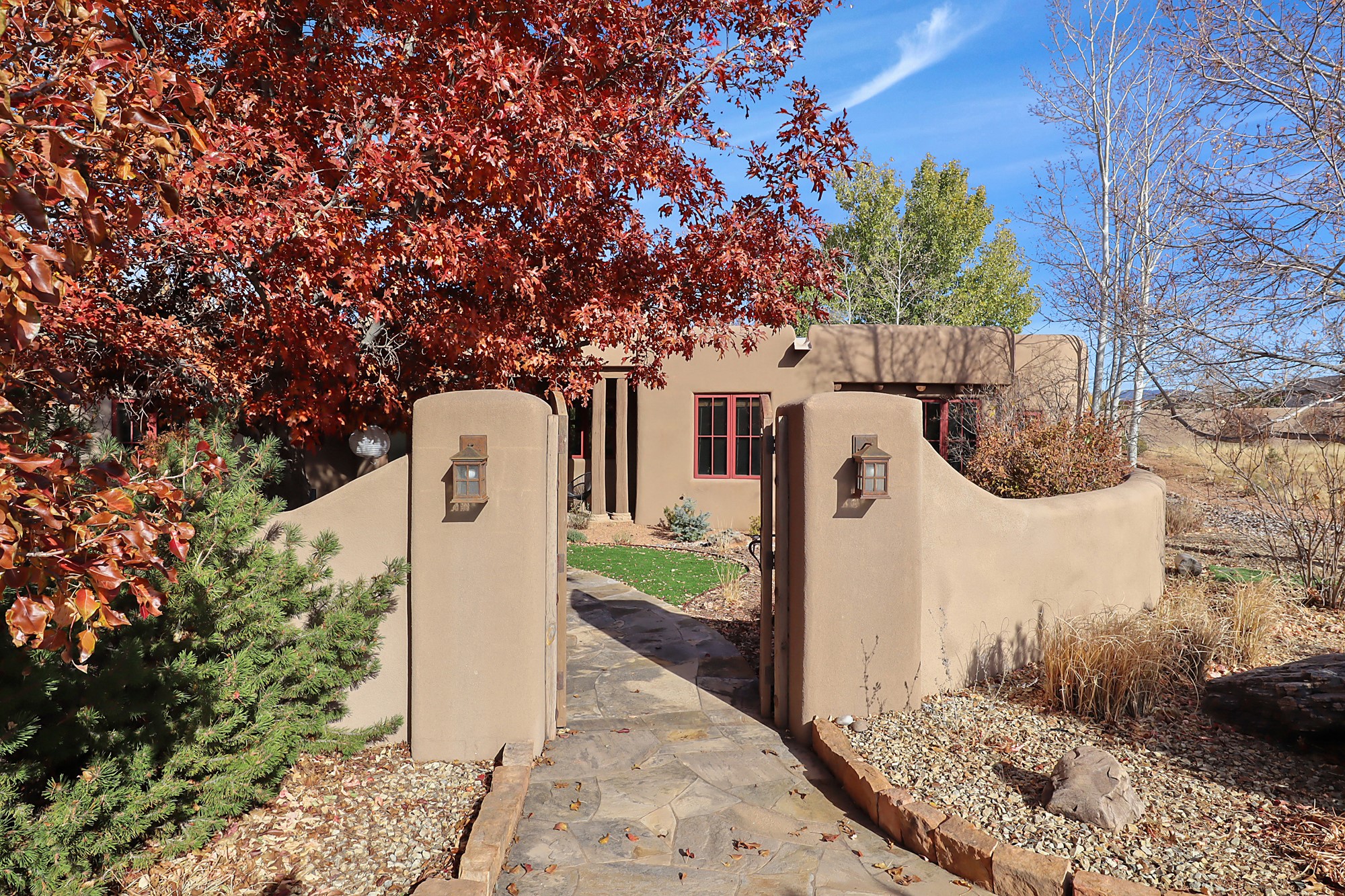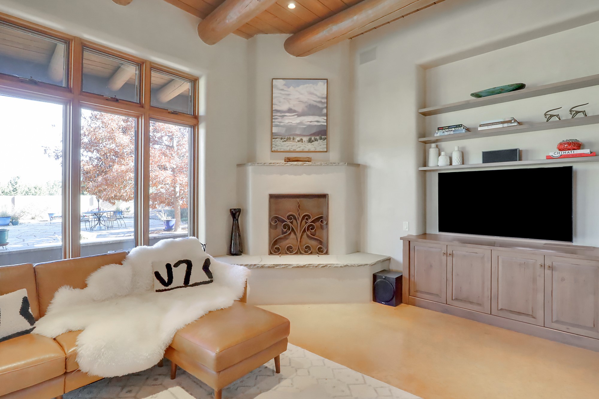 Discover an air of sophistication in this 4-bedroom, 4.5-bathroom residence spanning over 4,000 sq ft, including an executive office and charming attached casita, all nestled on 3 .5 acres in the serene enclave of Tierra Preciosa. Magnificent views of the Sangre de Cristo and Jemez mountains add a touch of splendor throughout the home. A spacious portal beckons you to the backyard oasis with an outdoor kitchen and fireplace that provides an idyllic setting for stylish and comfortable entertaining. Inside, the living room and master bedroom fireplaces, coupled with vigas and beams, infuse the ambiance with warmth and charm. The master suite boasts an adjoining flexible living space with a wet bar, complemented by a spacious master bath and walk-in closet. The generously appointed chef's kitchen, equipped with high-end appliances and a built-in hutch, transforms hosting into a delightful experience. The attached casita includes a full bath and a kiva fireplace to graciously accommodate visitors or serve as an ideal work-at-home space. Throughout the home, a harmonious blend of stone and natural wood textures enhances the overall design, creating an aesthetic of timeless luxury with modern features. Practical amenities abound, including a three-car heated garage, spacious closets, lighted niches, a well-equipped laundry room with plenty of storage and a sink, a walk-in pantry, ensuite bathrooms in every bedroom, integrated stereo speakers throughout. Radiant in-floor heating and central A/C provide year-round comfort. Notably, there are no HOA dues, and road maintenance is handled by a dedicated REUMA board.