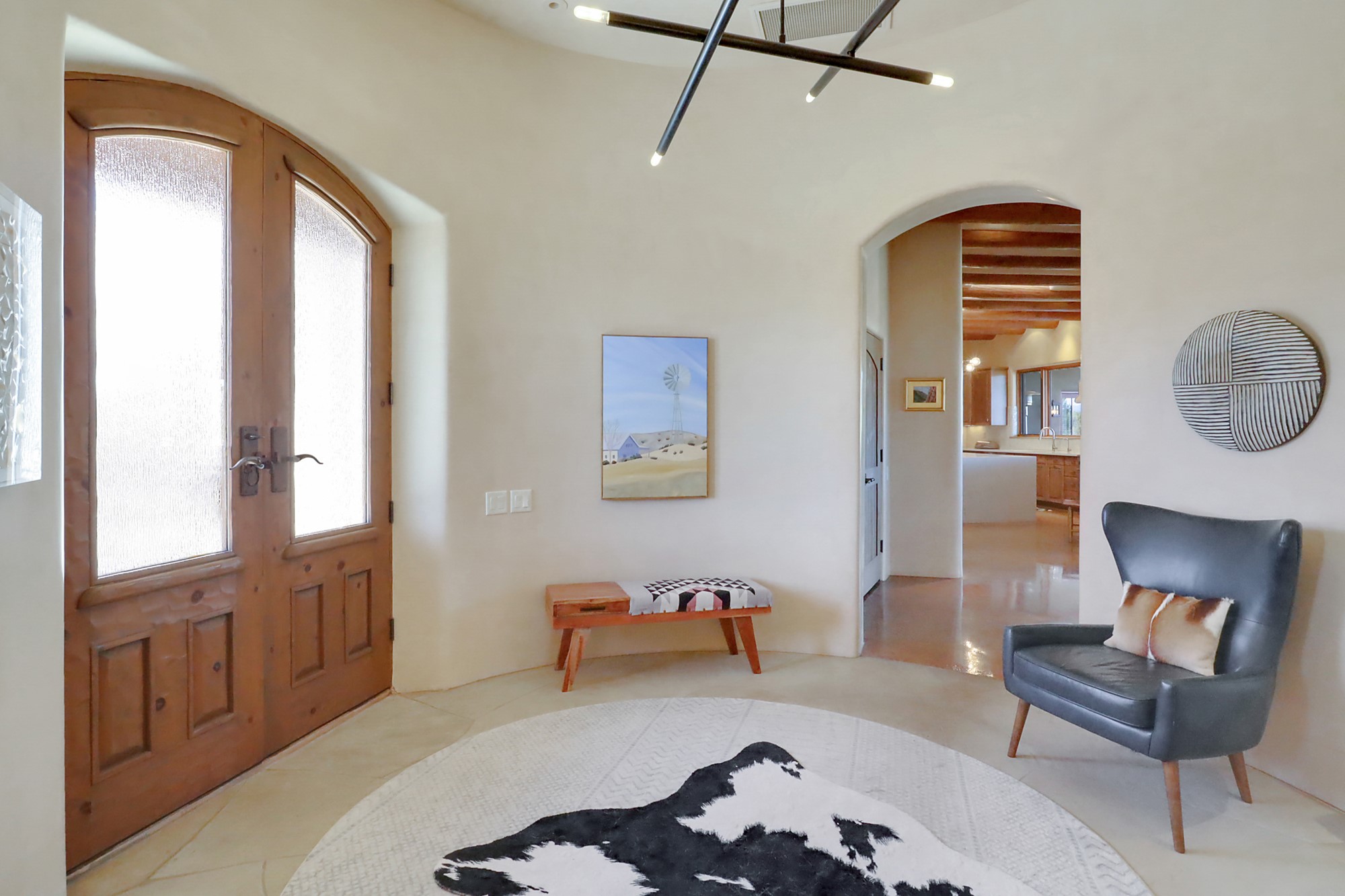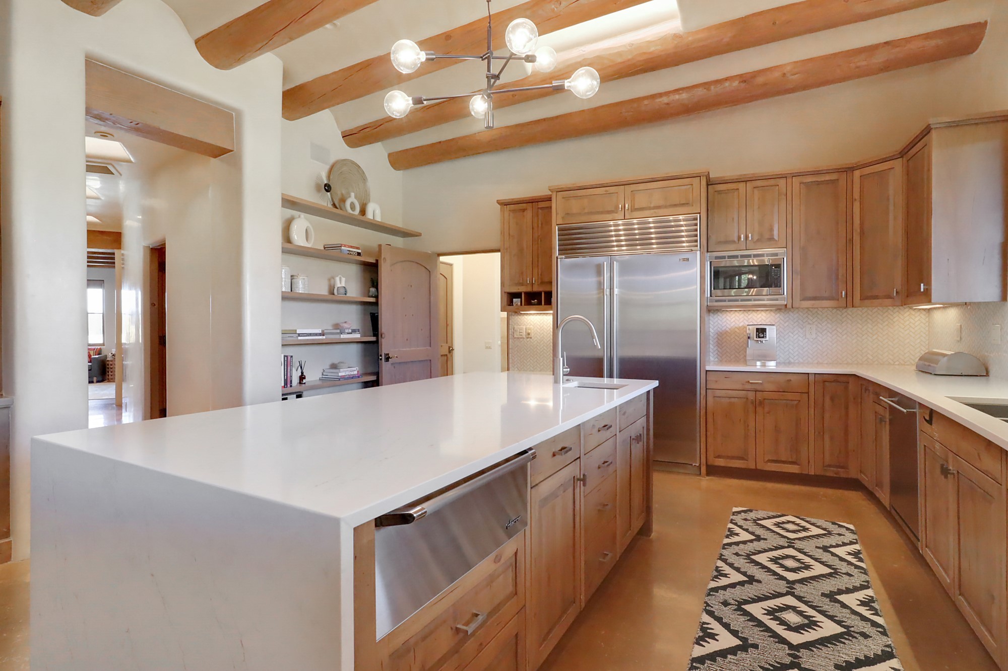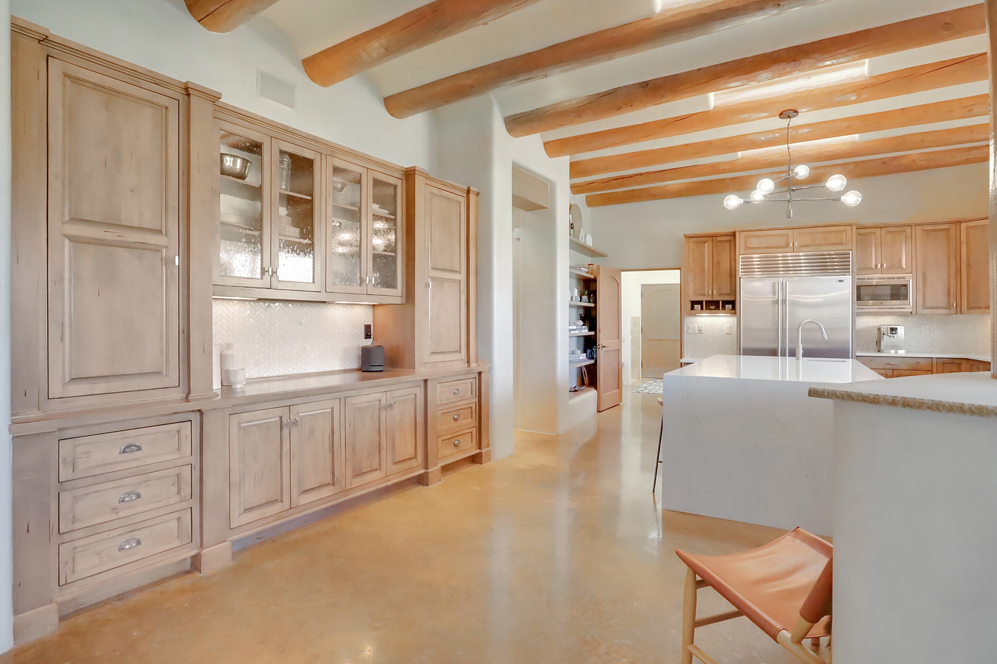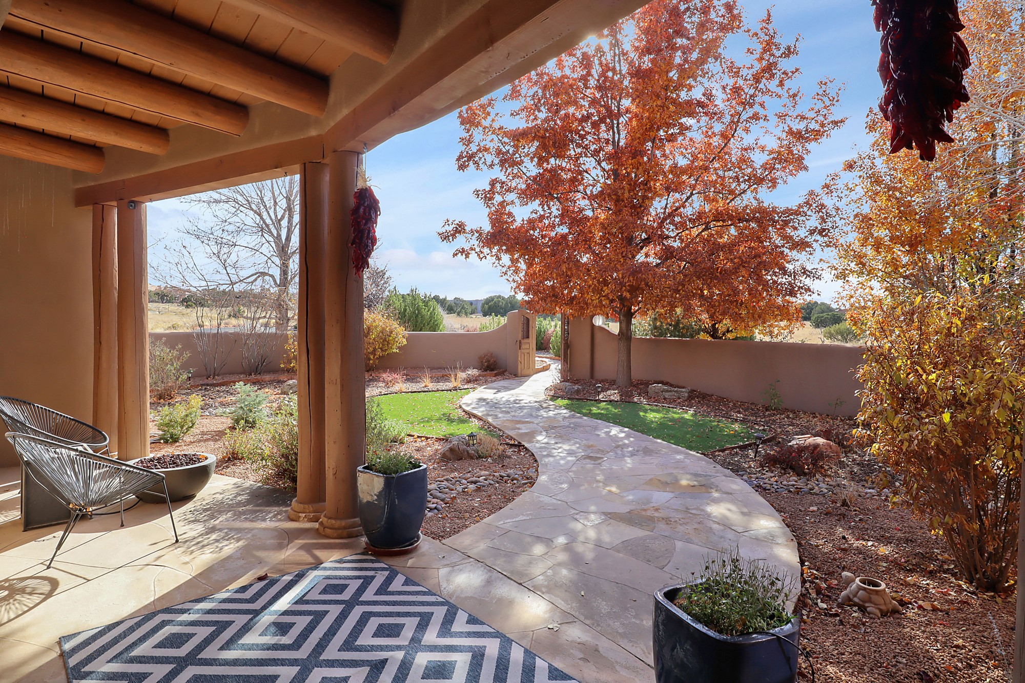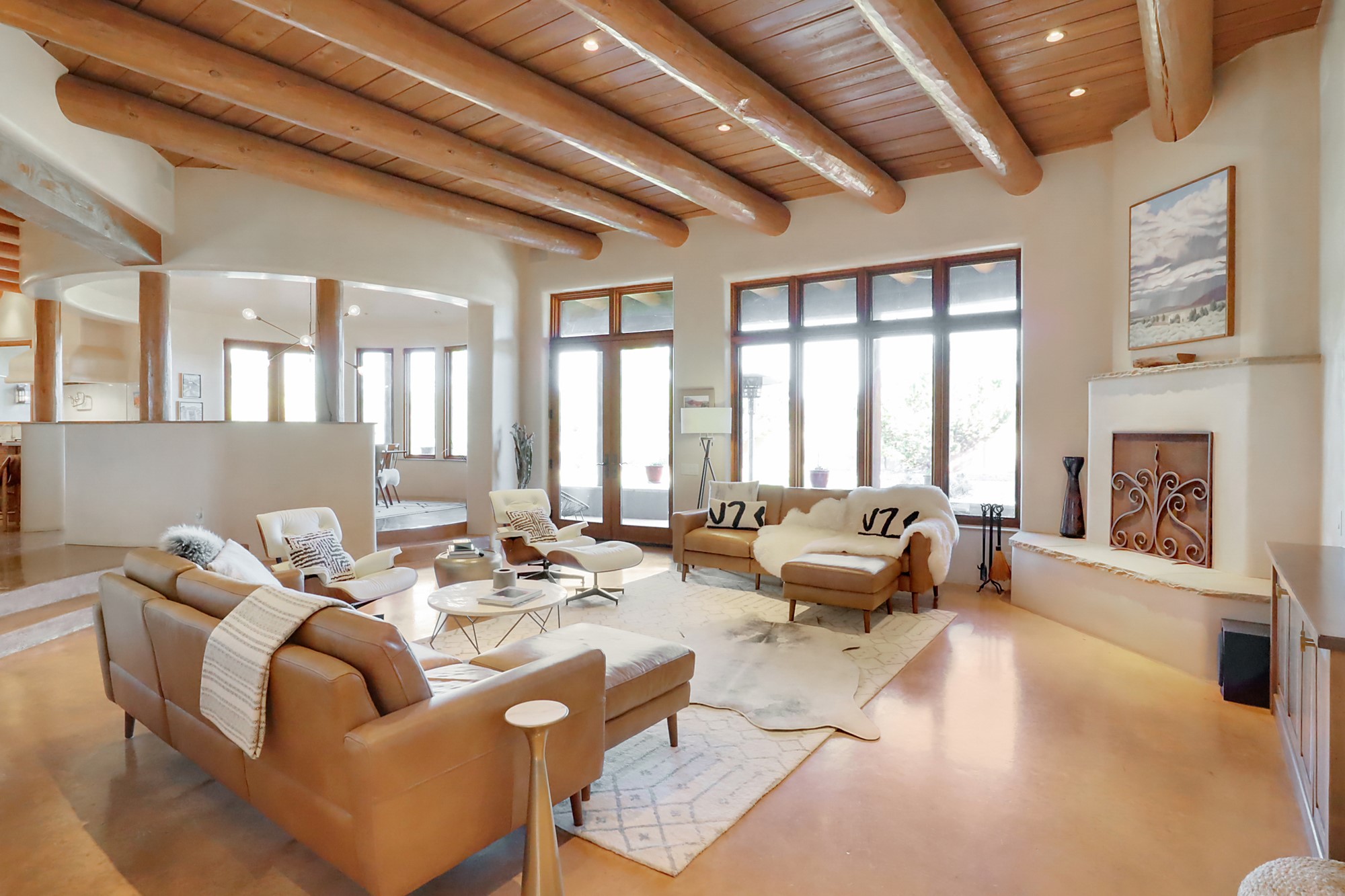 Discover an air of sophistication in this 4-bedroom, 4.5-bathroom residence spanning over 4,000 sq ft, including an executive office and charming attached casita, all nestled on 3 .5 acres in the serene enclave of Tierra Preciosa. Magnificent views of the Sangre de Cristo and Jemez mountains add a touch of splendor throughout the home. A spacious portal beckons you to the backyard oasis with an outdoor kitchen and fireplace that provides an idyllic setting for stylish and comfortable entertaining. Inside, the living room and master bedroom fireplaces, coupled with vigas and beams, infuse the ambiance with warmth and charm. The master suite boasts an adjoining flexible living space with a wet bar, complemented by a spacious master bath and walk-in closet. The generously appointed chef's kitchen, equipped with high-end appliances and a built-in hutch, transforms hosting into a delightful experience. The attached casita includes a full bath and a kiva fireplace to graciously accommodate visitors or serve as an ideal work-at-home space. Throughout the home, a harmonious blend of stone and natural wood textures enhances the overall design, creating an aesthetic of timeless luxury with modern features. Practical amenities abound, including a three-car heated garage, spacious closets, lighted niches, a well-equipped laundry room with plenty of storage and a sink, a walk-in pantry, ensuite bathrooms in every bedroom, integrated stereo speakers throughout. Radiant in-floor heating and central A/C provide year-round comfort. Notably, there are no HOA dues, and road maintenance is handled by a dedicated REUMA board.