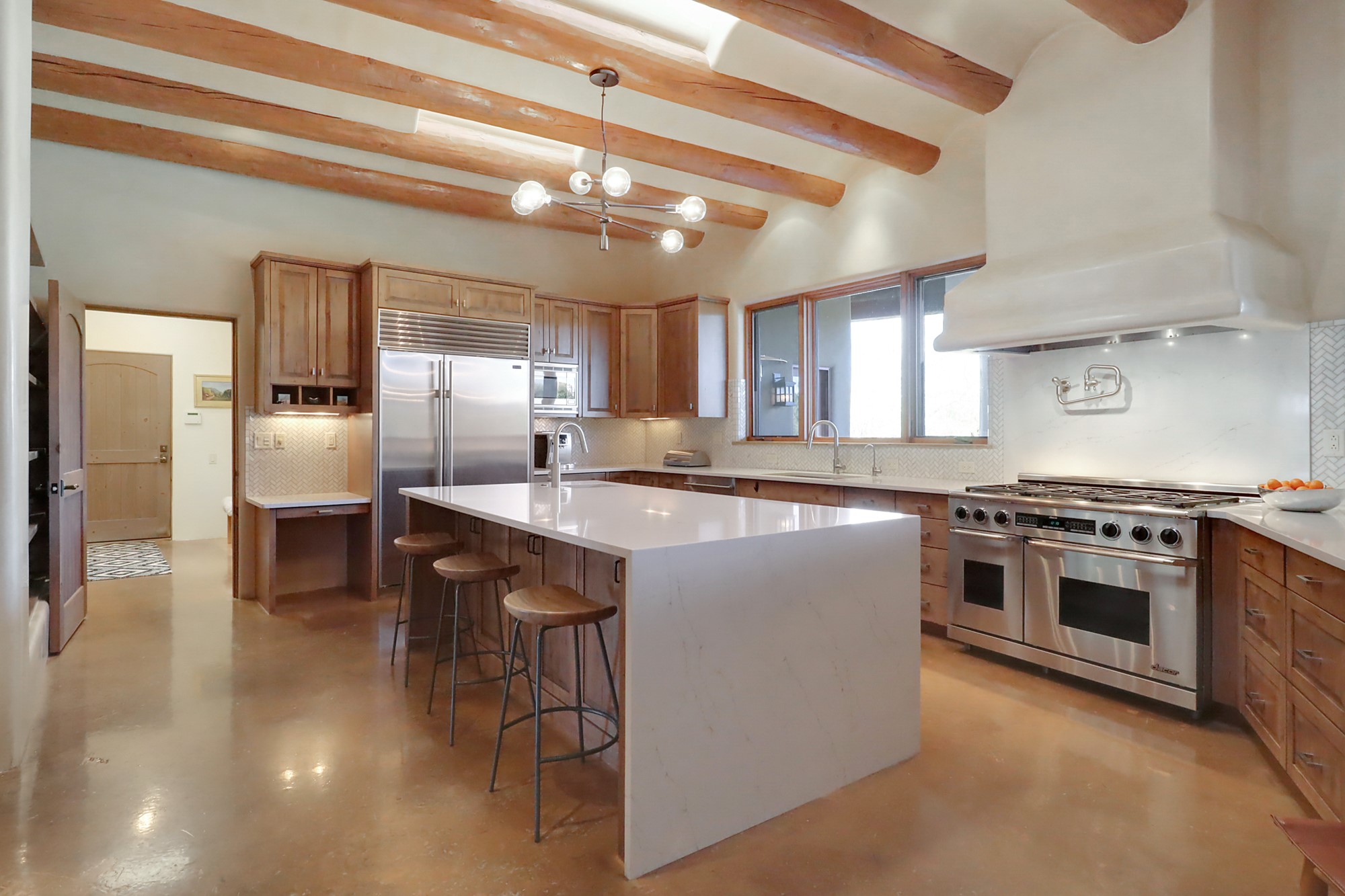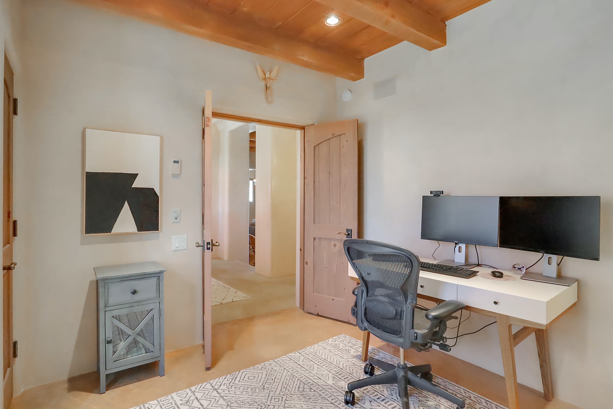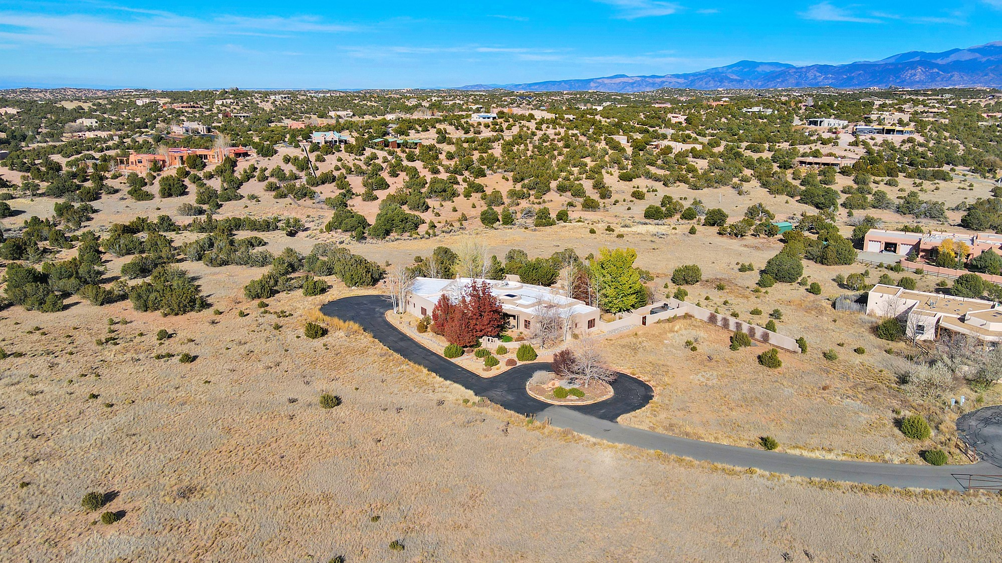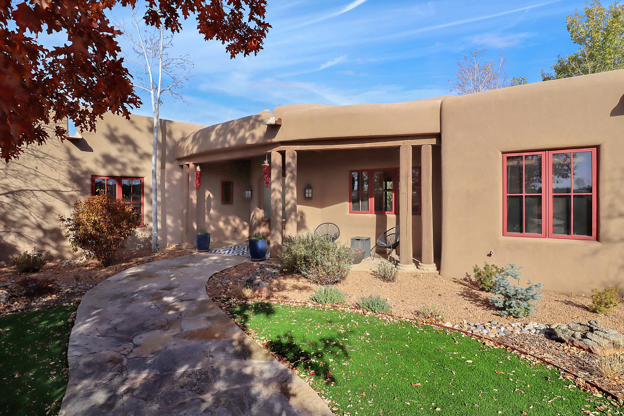 Discover an air of sophistication in this 4-bedroom, 4.5-bathroom residence spanning over 4,000 sq ft, including an executive office and charming attached casita, all nestled on 3 .5 acres in the serene enclave of Tierra Preciosa. Magnificent views of the Sangre de Cristo and Jemez mountains add a touch of splendor throughout the home. A spacious portal beckons you to the backyard oasis with an outdoor kitchen and fireplace that provides an idyllic setting for stylish and comfortable entertaining. Inside, the living room and master bedroom fireplaces, coupled with vigas and beams, infuse the ambiance with warmth and charm. The master suite boasts an adjoining flexible living space with a wet bar, complemented by a spacious master bath and walk-in closet. The generously appointed chef's kitchen, equipped with high-end appliances and a built-in hutch, transforms hosting into a delightful experience. The attached casita includes a full bath and a kiva fireplace to graciously accommodate visitors or serve as an ideal work-at-home space. Throughout the home, a harmonious blend of stone and natural wood textures enhances the overall design, creating an aesthetic of timeless luxury with modern features. Practical amenities abound, including a three-car heated garage, spacious closets, lighted niches, a well-equipped laundry room with plenty of storage and a sink, a walk-in pantry, ensuite bathrooms in every bedroom, integrated stereo speakers throughout. Radiant in-floor heating and central A/C provide year-round comfort. Notably, there are no HOA dues, and road maintenance is handled by a dedicated REUMA board.
