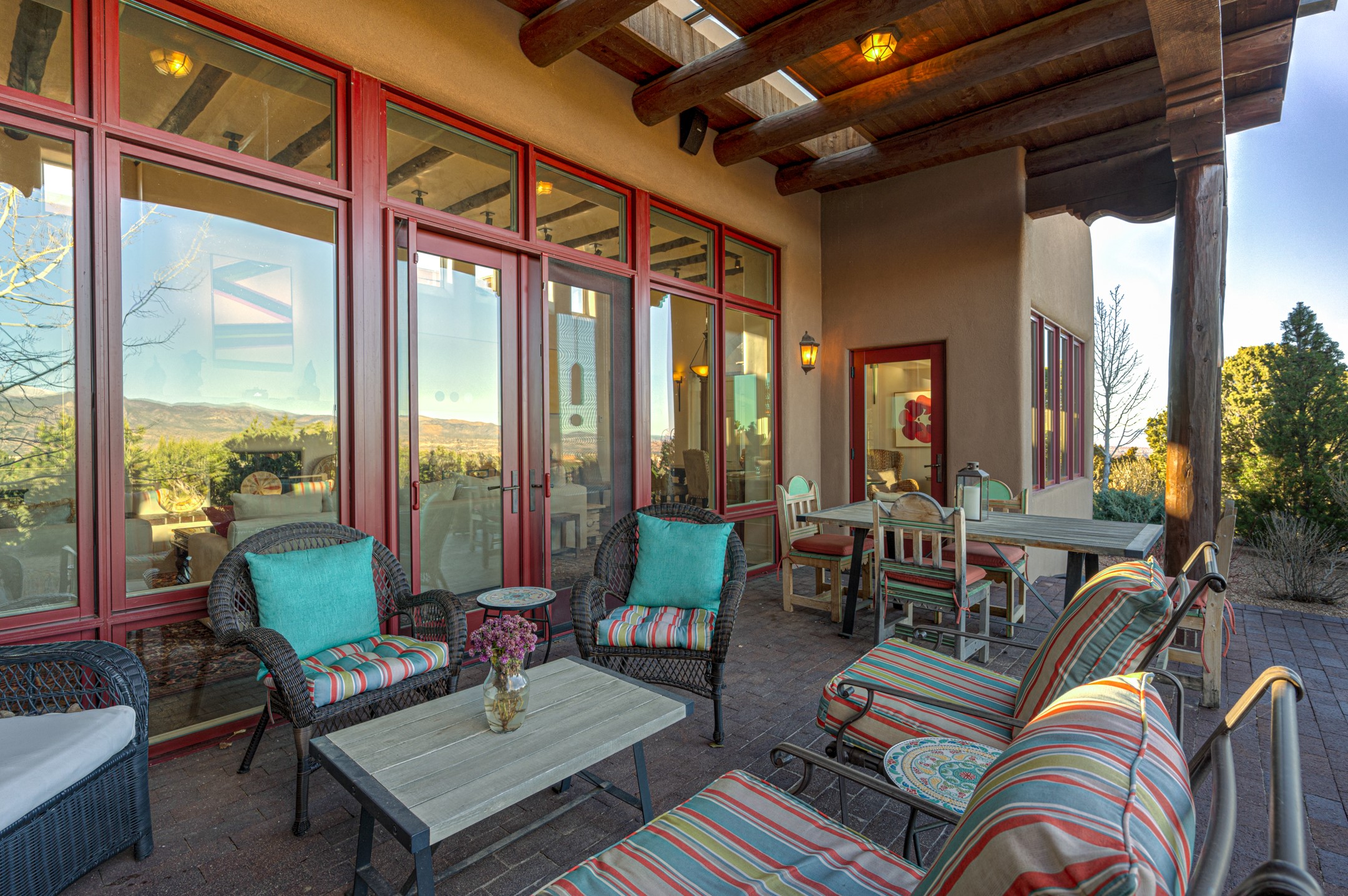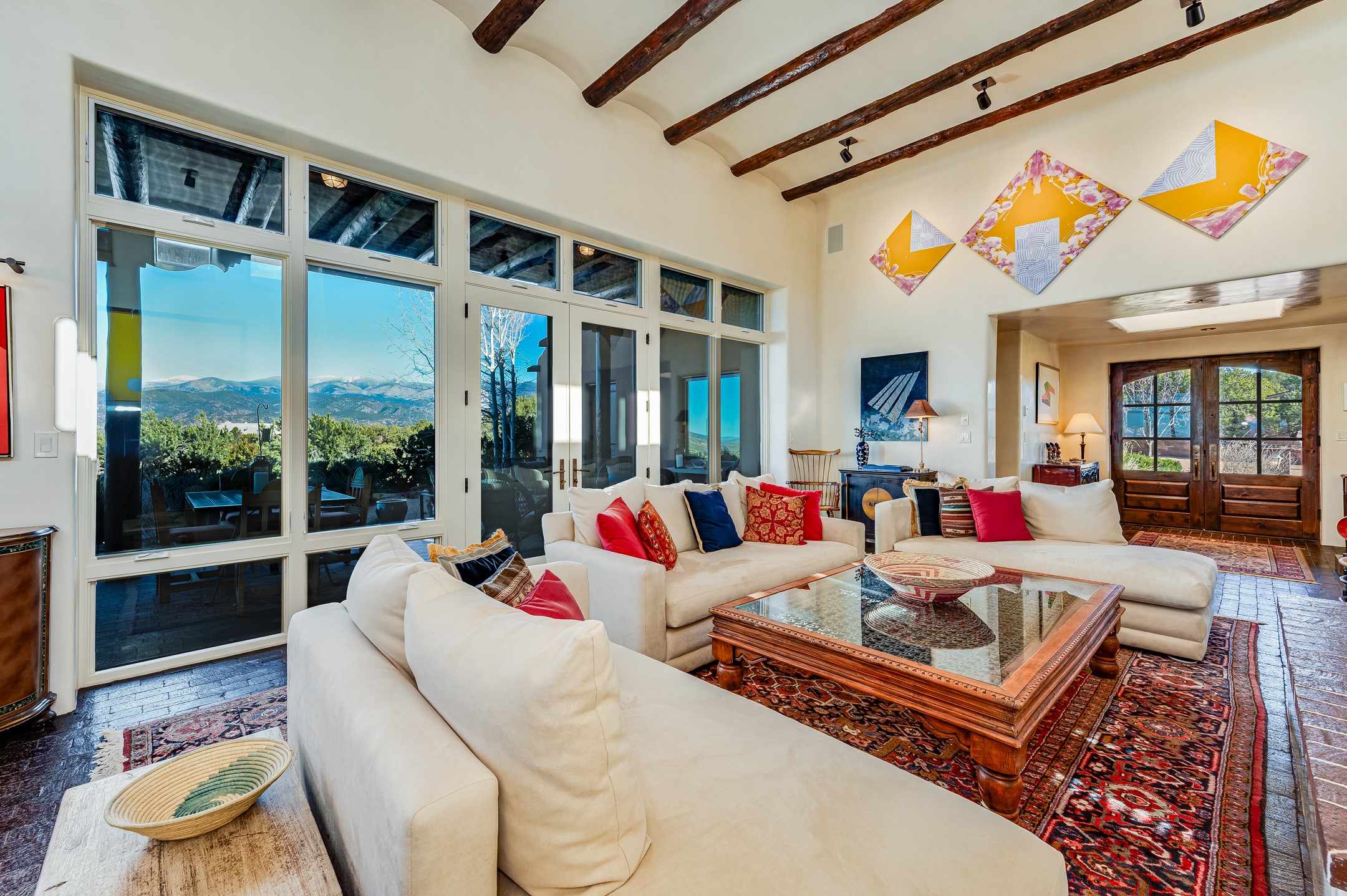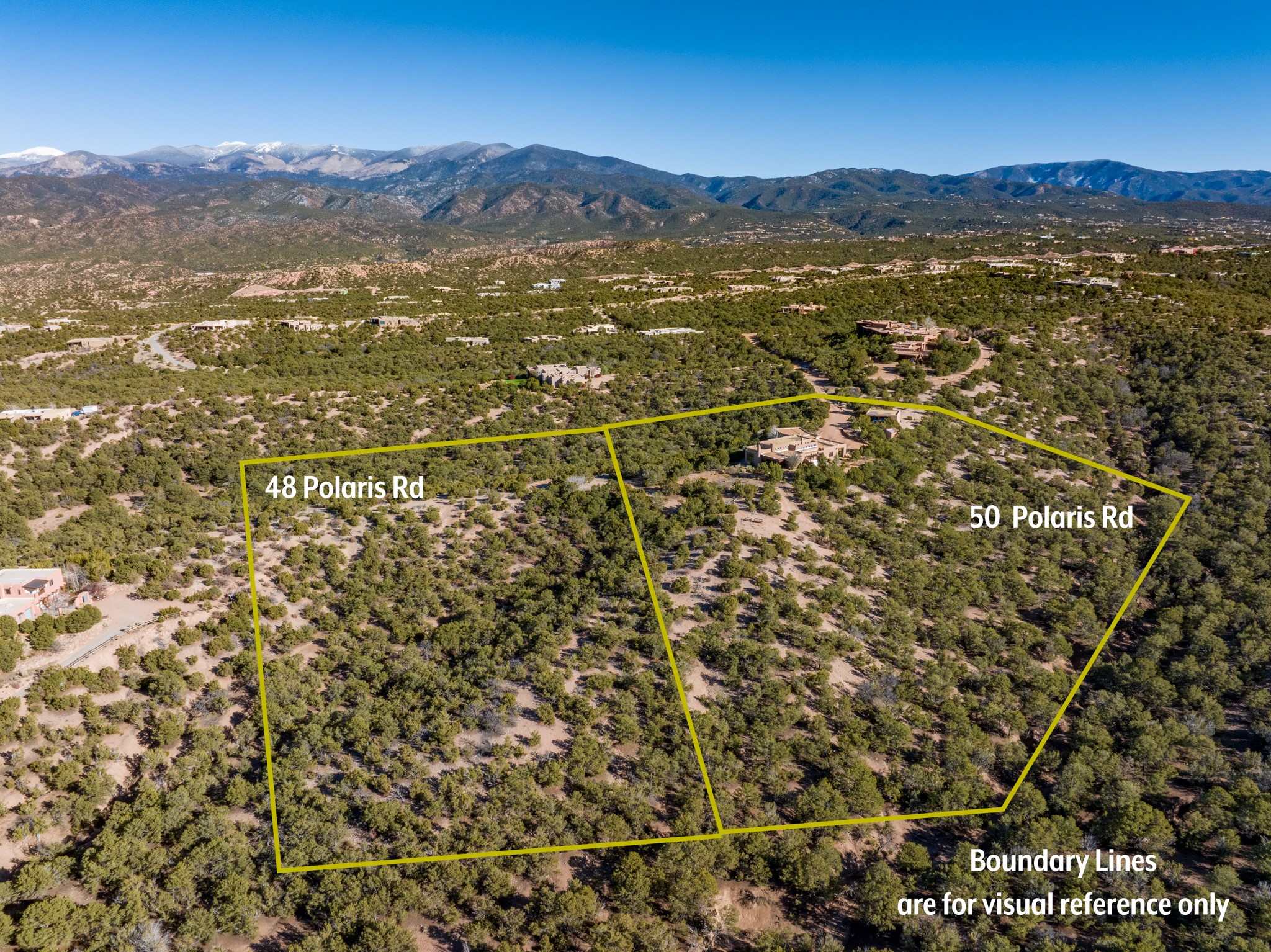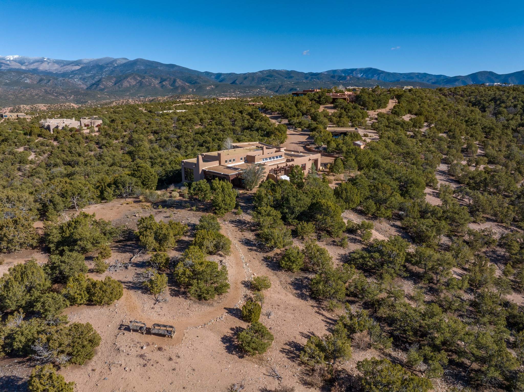 Extraordinary single-level home sited on 6.3 acres off Tano Road offers unobstructed views of the Barrancas, Sangres, and Jemez mountains. Perched on a knoll and at the end of a private drive, a short 8 minutes from the Plaza, this singular property features a main house of +/- 2850sqft with an attached oversize 2-car garage, a 2-car carport, and shed/workshop. Originally built in 1981, the Dave Gibbons design was masterfully renovated in 2011 by Sharon Woods to seamlessly marry Southwestern and soft- contemporary elements in a grand, light-filled, open-concept living space. The refined aesthetic showcases 14-foot high coved ceilings, diamond plaster walls, museum-quality lighting, and endless walls of windows, all grounded by brick floors, fireplaces, and solid custom cabinetry. The chef's kitchen features Wolf and SubZero appliances, stone countertops, and walk-in pantry. Taking a cue from its celestial name, the Polaris home offers deep portals facing each cardinal direction for uninterrupted views of the spectacular night sky, high desert terrain, and jaw-dropping vistas. Timeless architecture, enchanting views, manicured gardens, and a serene setting come together in a one-of-a-kind offering that will provide comfort and tranquility for years to come. This listing includes a separately deeded 3-acre lot (MLS 202341954). The home on 6.3 acres can be purchased as MLS 202341949.