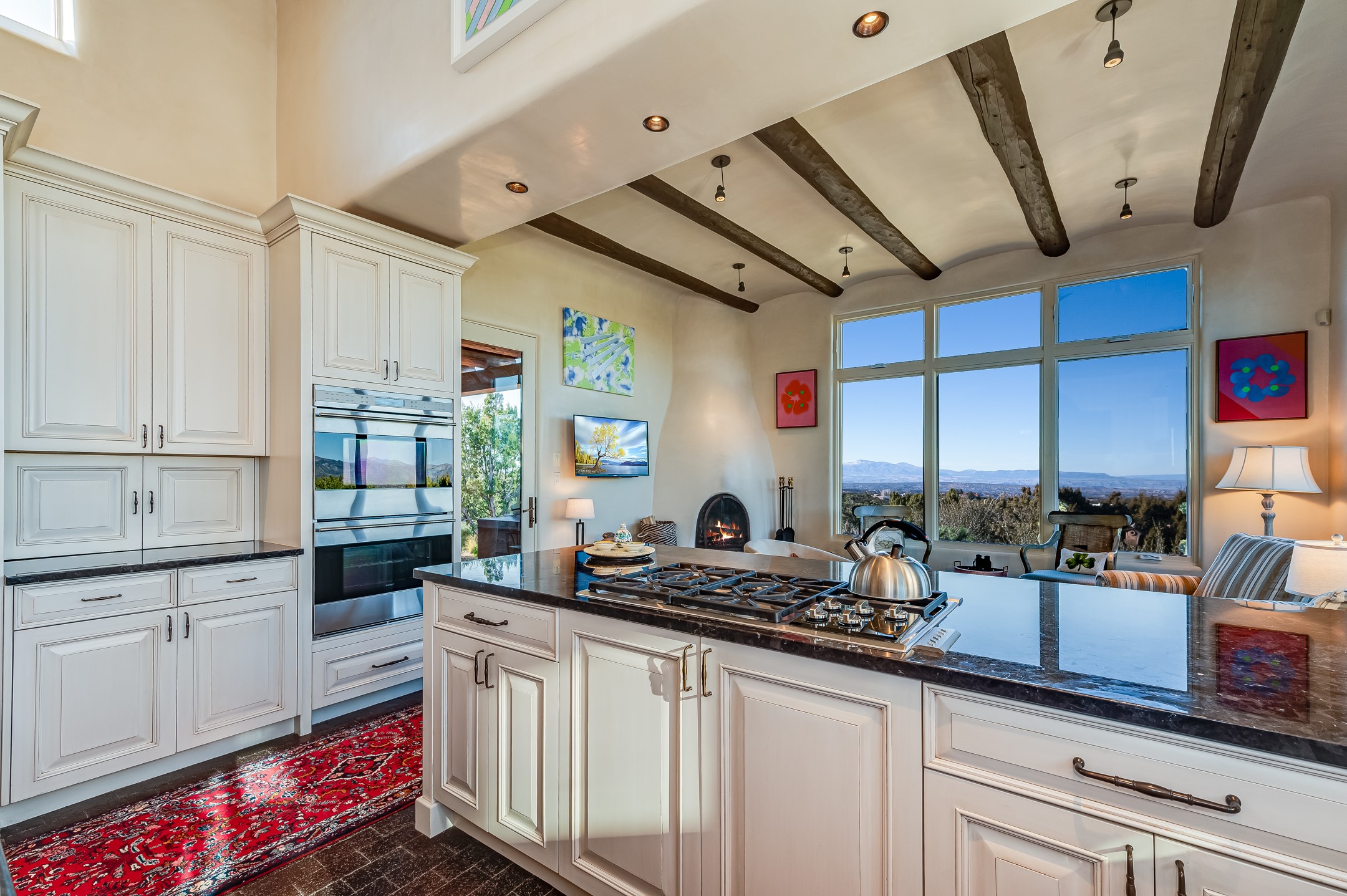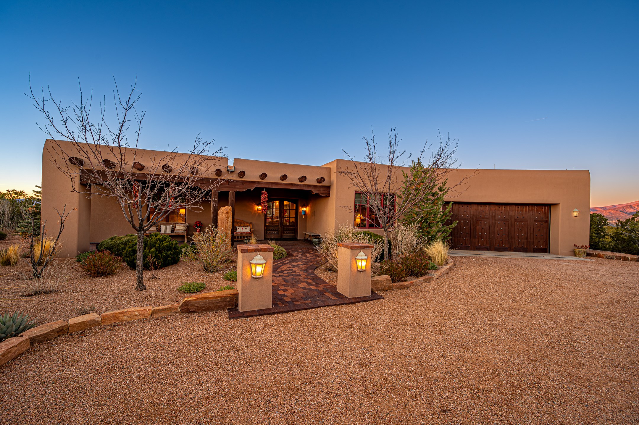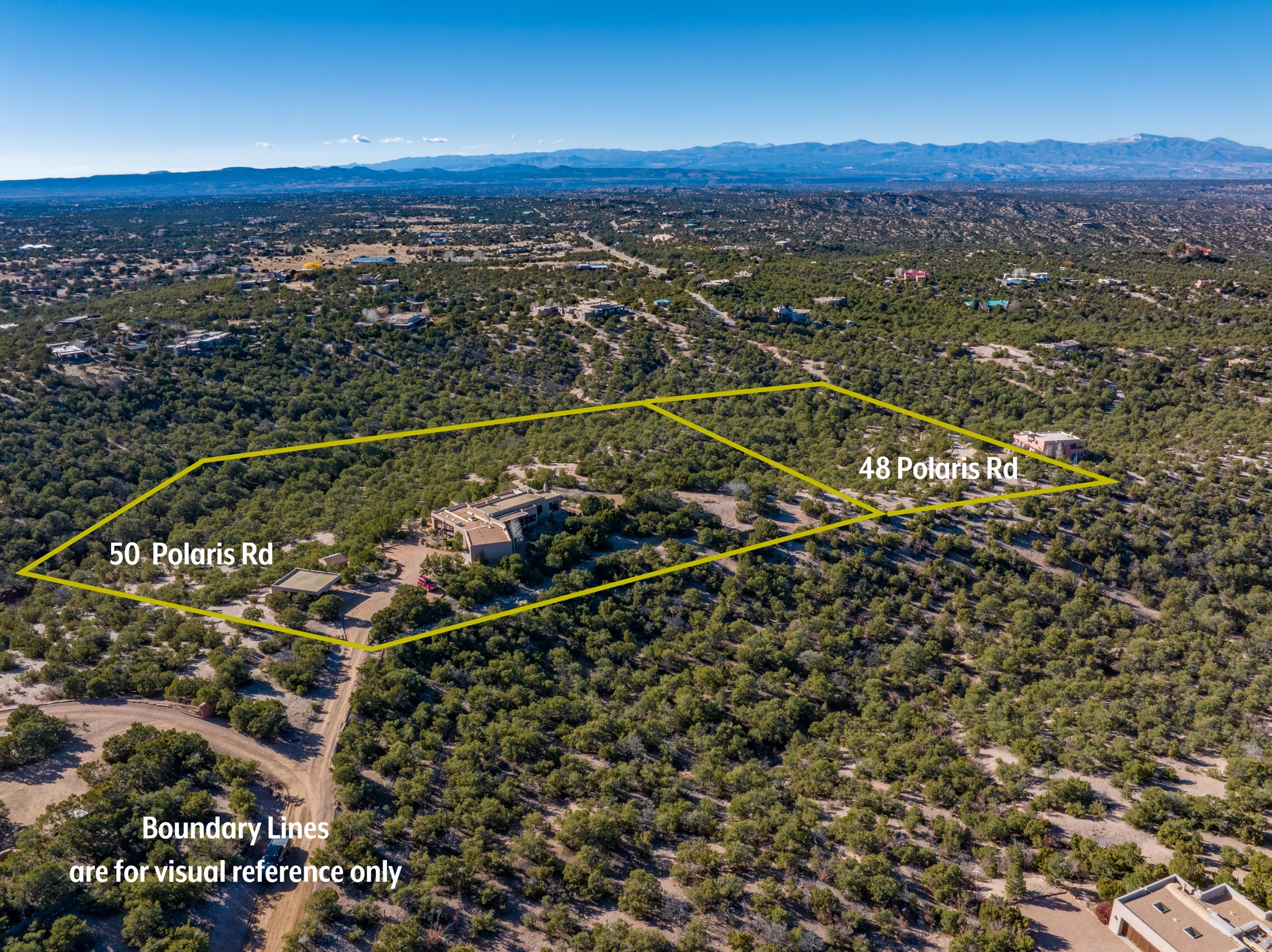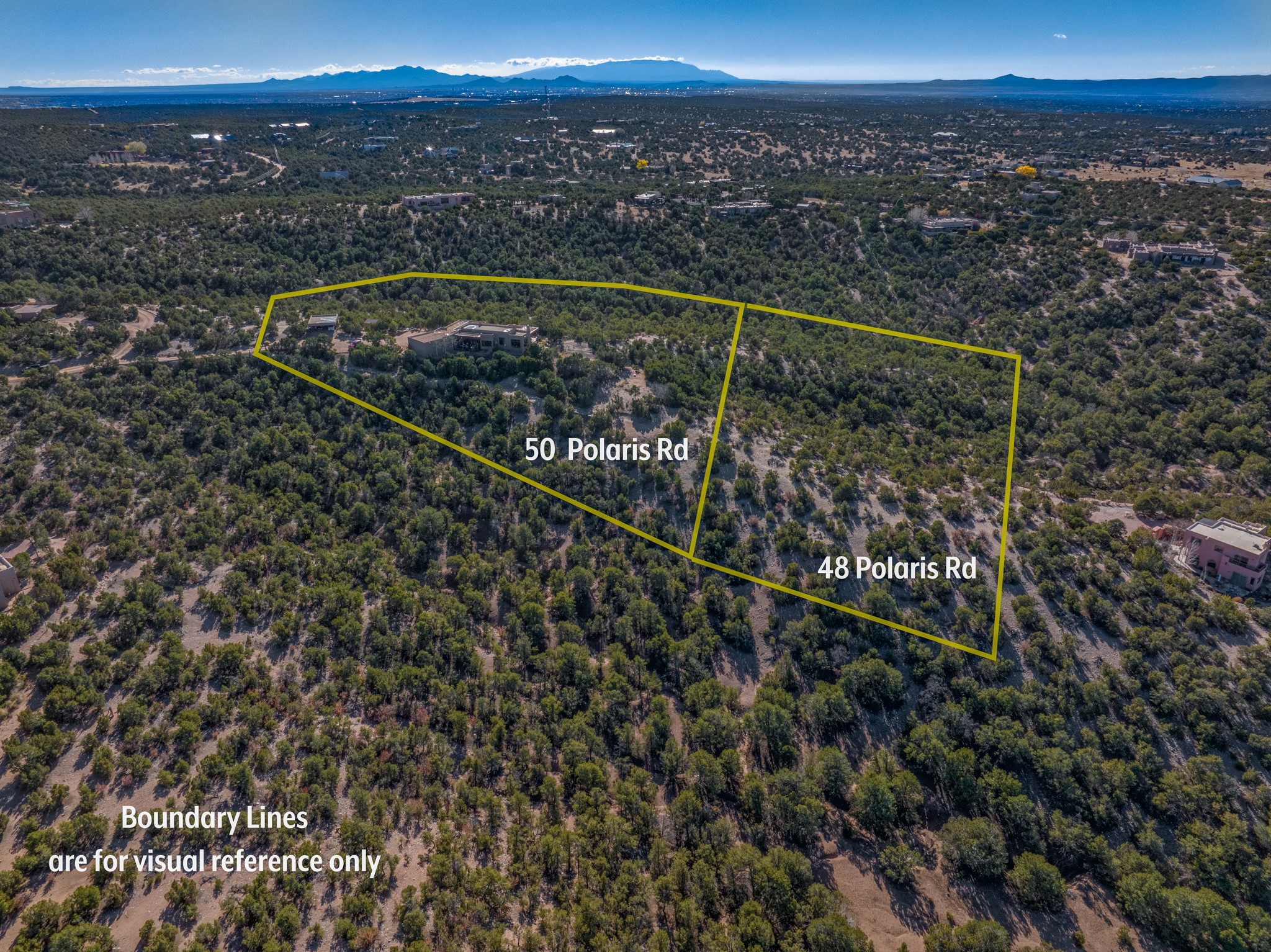 Extraordinary single-level home sited on 6.3 acres off Tano Road offers unobstructed views of the Barrancas, Sangres, and Jemez mountains. Perched on a knoll and at the end of a private drive, a short 8 minutes from the Plaza, this singular property features a main house of +/- 2850sqft with an attached oversize 2-car garage, a 2-car carport, and shed/workshop. Originally built in 1981, the Dave Gibbons design was masterfully renovated in 2011 by Sharon Woods to seamlessly marry Southwestern and soft- contemporary elements in a grand, light-filled, open-concept living space. The refined aesthetic showcases 14-foot high coved ceilings, diamond plaster walls, museum-quality lighting, and endless walls of windows, all grounded by brick floors, fireplaces, and solid custom cabinetry. The chef's kitchen features Wolf and SubZero appliances, stone countertops, and walk-in pantry. Taking a cue from its celestial name, the Polaris home offers deep portals facing each cardinal direction for uninterrupted views of the spectacular night sky, high desert terrain, and jaw-dropping vistas. Timeless architecture, enchanting views, manicured gardens, and a serene setting come together in a one-of-a-kind offering that will provide comfort and tranquility for years to come. This listing includes a separately deeded 3-acre lot (MLS 202341954). The home on 6.3 acres can be purchased as MLS 202341949.