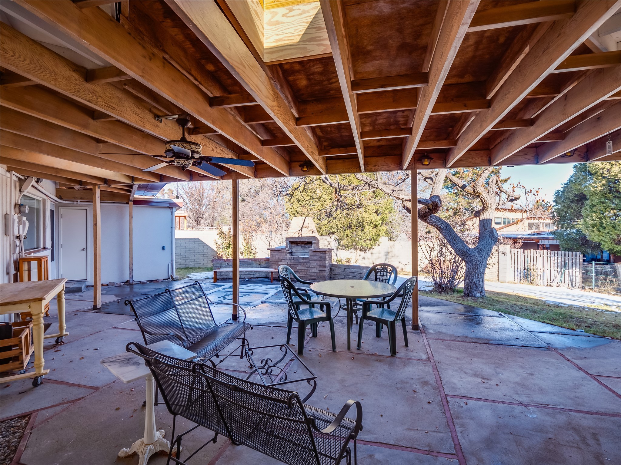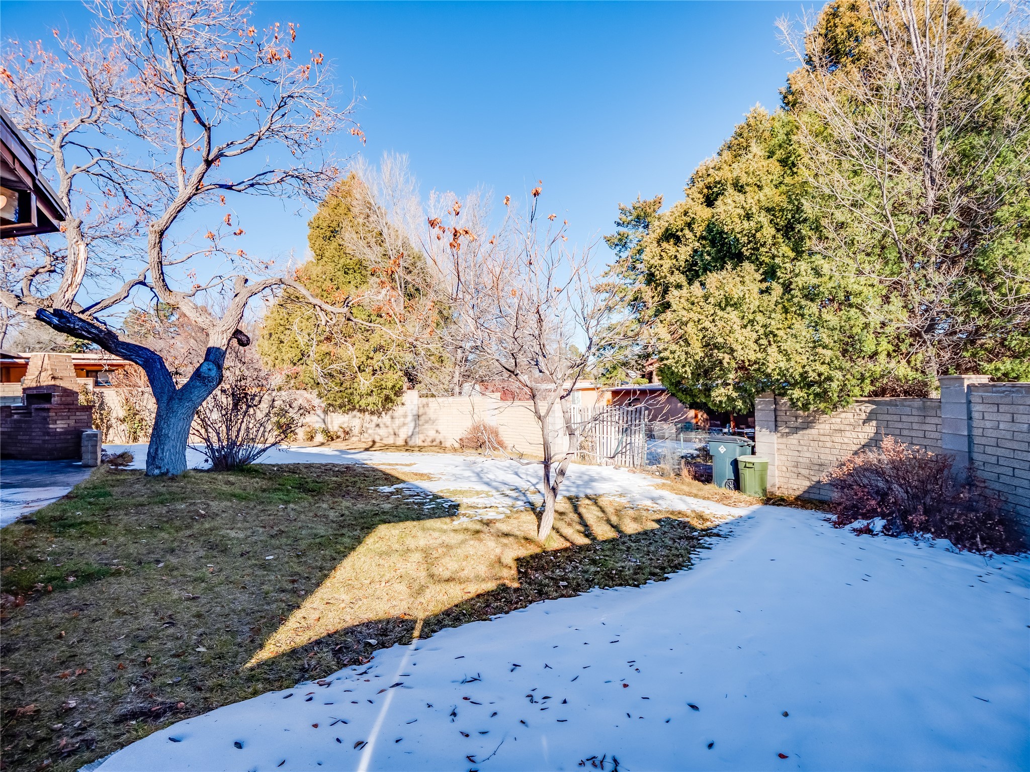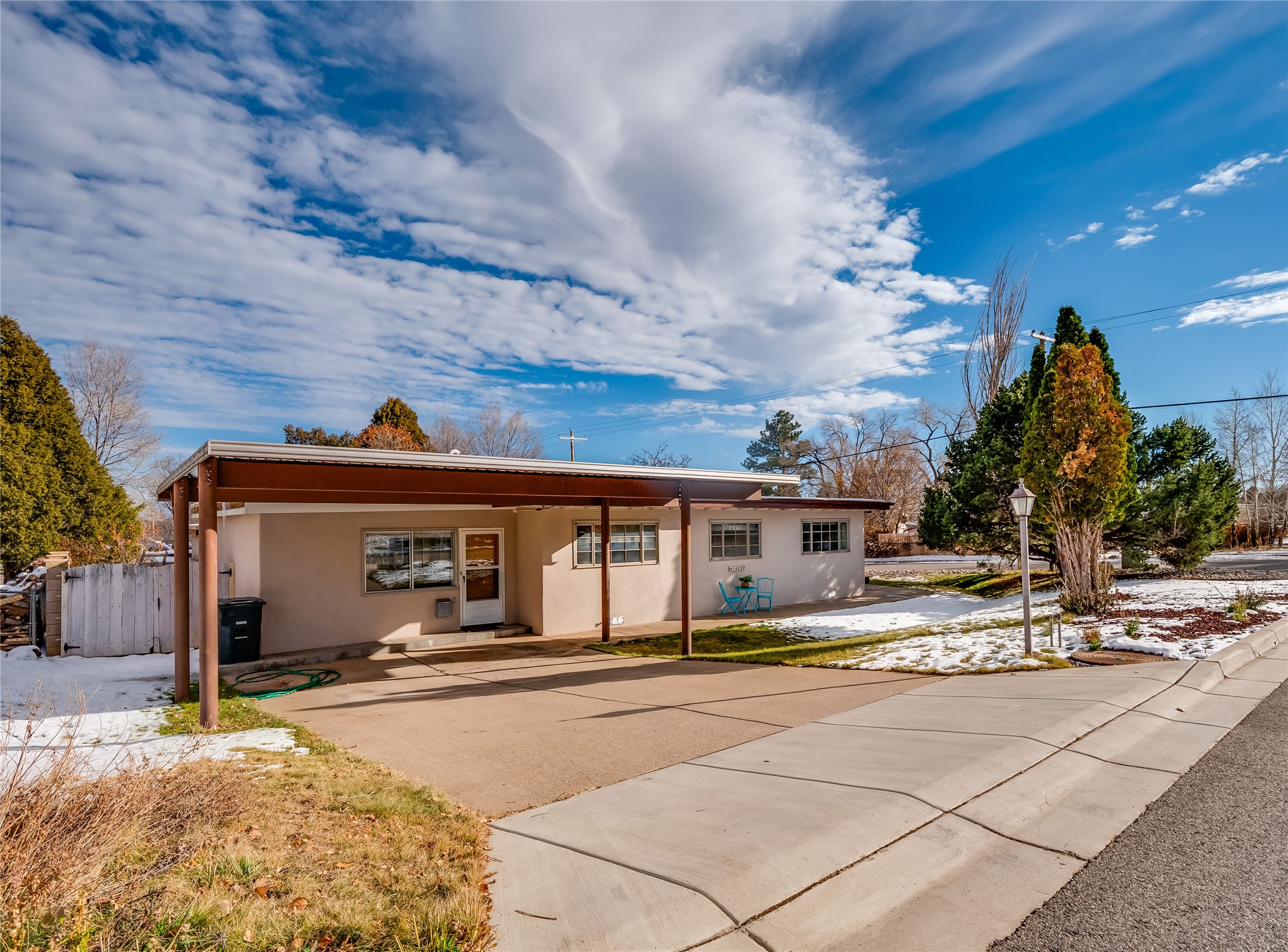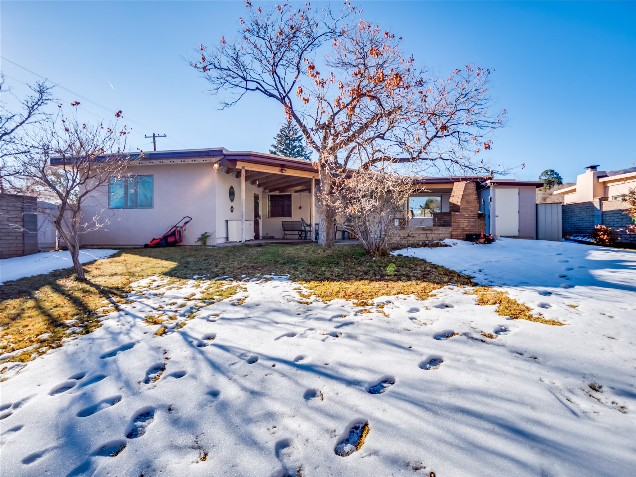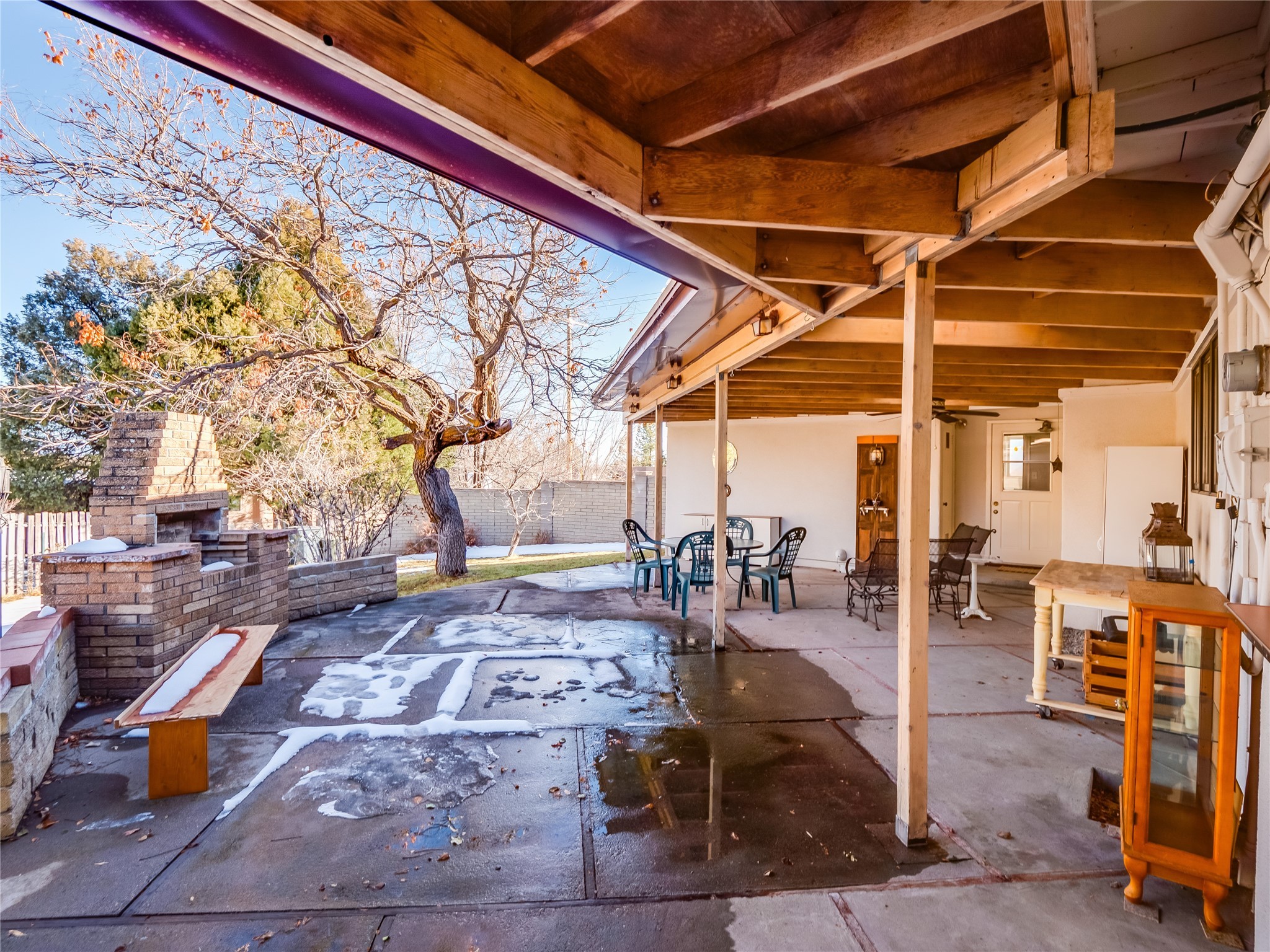 Welcome to this charming single-story corner lot home located in the West area, where classic elegance meets modern comfort! Beautiful front lawn with mature landscaping wraps around to the side yard and leads you to the front entrance. As you step inside, the warm ambiance of the wood floors invites you to explore further. The spacious living area features stunning wood coffered ceilings that add depth and character to the space. The centerpiece is a wood burning fireplace that just beckons you to unwind and relax and a cozy alcove with built-in shelves makes for the perfect place to curl up and read a book. The galley-style kitchen has ample Countertop space for meal preparation, cooking, and hosting. The open-faced shelving creates an airy and inviting atmosphere, providing both storage and an opportunity to showcase your favorite kitchenware or decorative pieces. Connected is the bright expansive family room and dining space. A standout feature in this space is a paneled wall that conceals hidden built-in shelves, a clever addition that combines sophistication with practicality. Large windows and strategically placed doors provide easy access to the two-car carport and the backyard patio. Bedroom Hallway with built in storage houses three nicely sized bedrooms with built in storage and a full guest bath with tile flooring and single sink vanity. From the Living Room there's a separate private hallway with access to the backyard and the large Primary En-Suite with laundry closet. A full bath with tile floors and shower/tub surround, and single sink vanity. A large fenced in backyard with grass, mature landscaping and trees create a beautiful private oasis. A covered patio adorned with skylights ensures the patio remains bright and inviting even during overcast days, or Gather around the built-in brick fireplace for stories and s'mores on cool evenings. Don't miss out in making this delightful home yours, book your tour today!