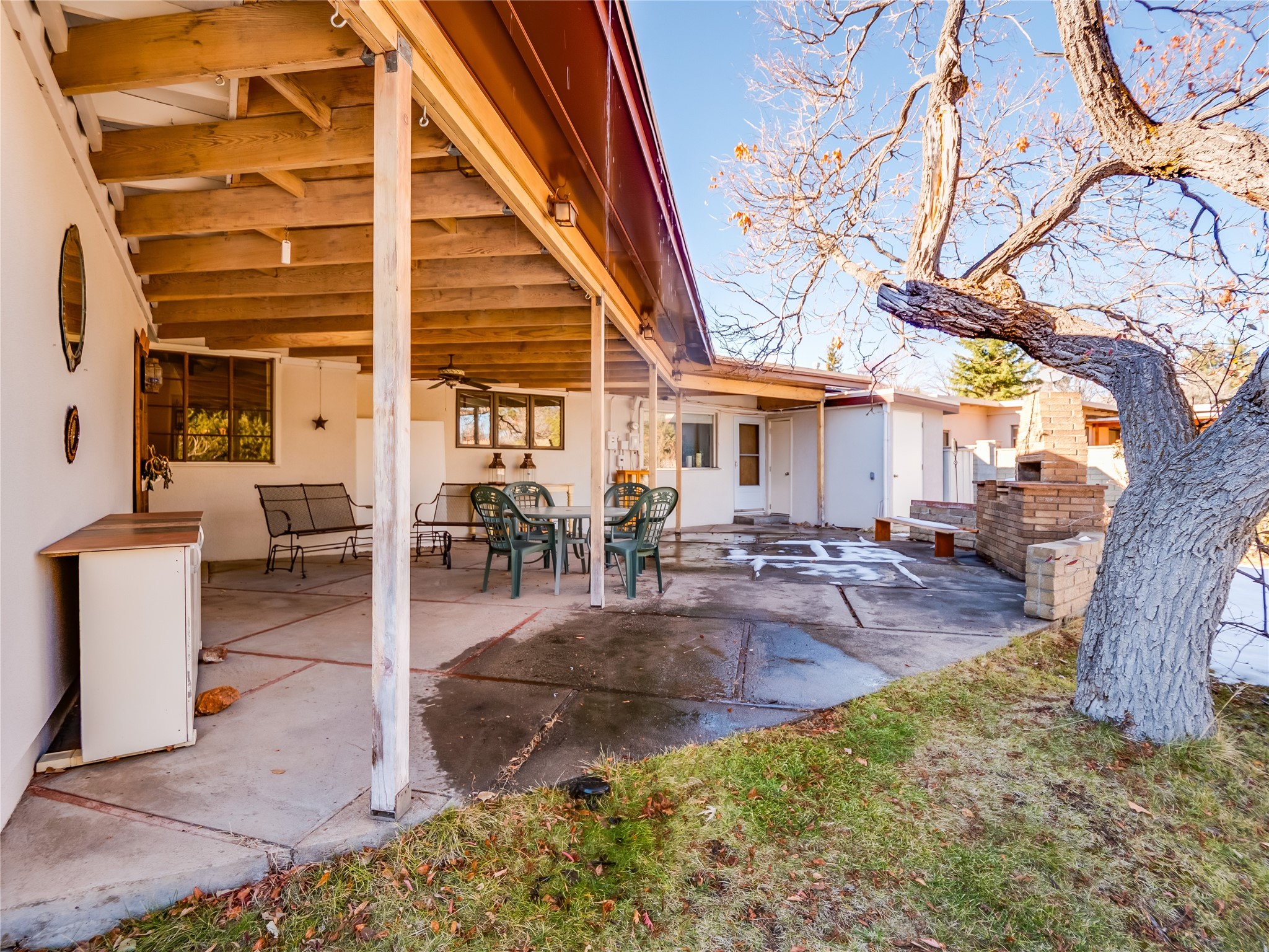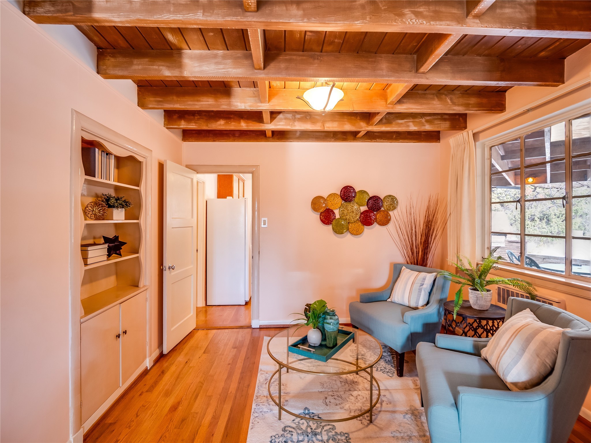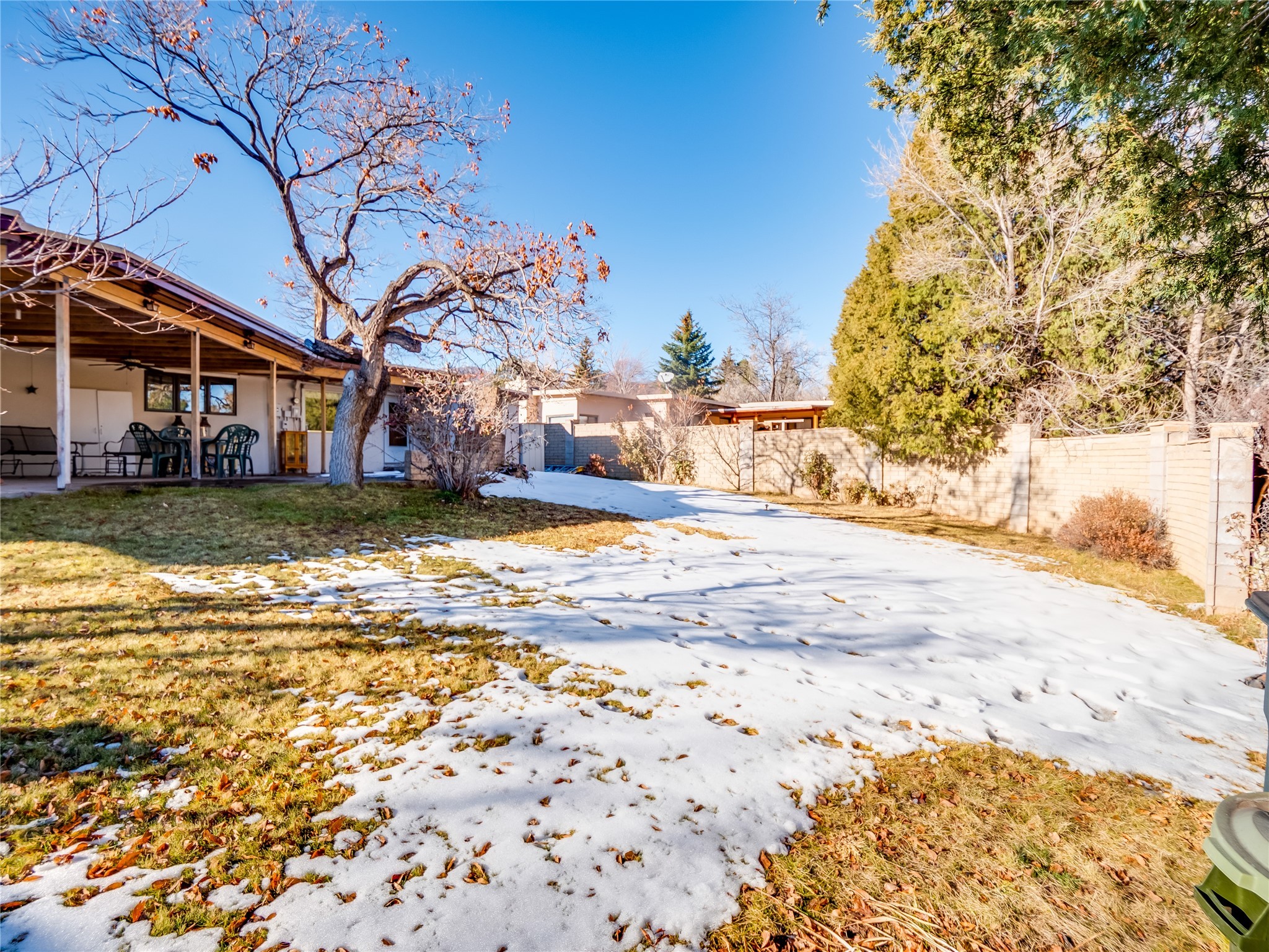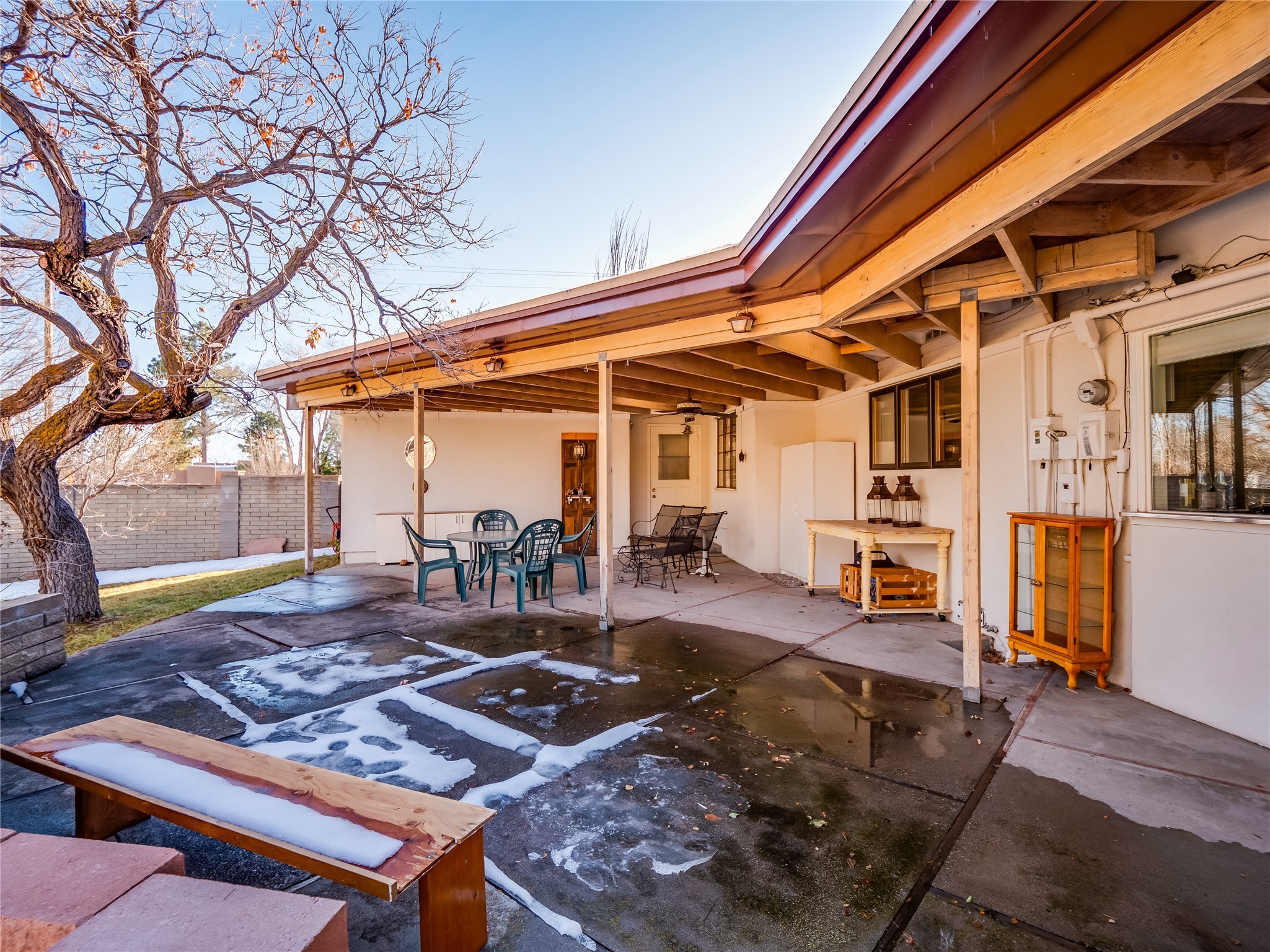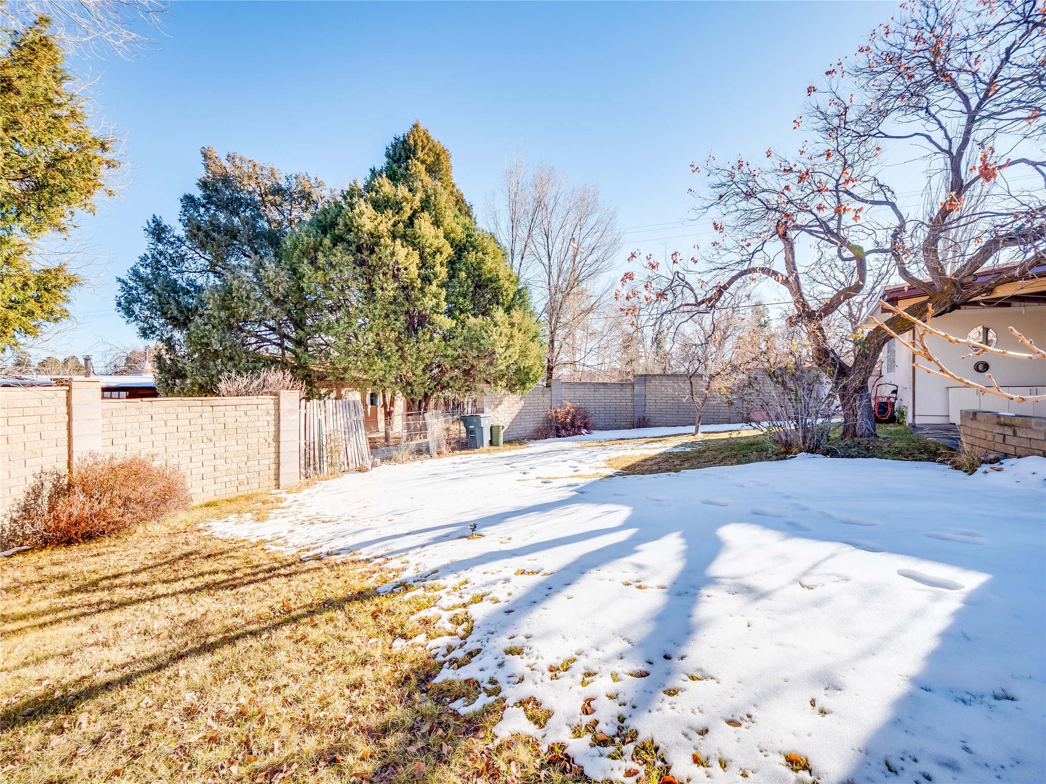 Welcome to this charming single-story corner lot home located in the West area, where classic elegance meets modern comfort! Beautiful front lawn with mature landscaping wraps around to the side yard and leads you to the front entrance. As you step inside, the warm ambiance of the wood floors invites you to explore further. The spacious living area features stunning wood coffered ceilings that add depth and character to the space. The centerpiece is a wood burning fireplace that just beckons you to unwind and relax and a cozy alcove with built-in shelves makes for the perfect place to curl up and read a book. The galley-style kitchen has ample Countertop space for meal preparation, cooking, and hosting. The open-faced shelving creates an airy and inviting atmosphere, providing both storage and an opportunity to showcase your favorite kitchenware or decorative pieces. Connected is the bright expansive family room and dining space. A standout feature in this space is a paneled wall that conceals hidden built-in shelves, a clever addition that combines sophistication with practicality. Large windows and strategically placed doors provide easy access to the two-car carport and the backyard patio. Bedroom Hallway with built in storage houses three nicely sized bedrooms with built in storage and a full guest bath with tile flooring and single sink vanity. From the Living Room there's a separate private hallway with access to the backyard and the large Primary En-Suite with laundry closet. A full bath with tile floors and shower/tub surround, and single sink vanity. A large fenced in backyard with grass, mature landscaping and trees create a beautiful private oasis. A covered patio adorned with skylights ensures the patio remains bright and inviting even during overcast days, or Gather around the built-in brick fireplace for stories and s'mores on cool evenings. Don't miss out in making this delightful home yours, book your tour today!
