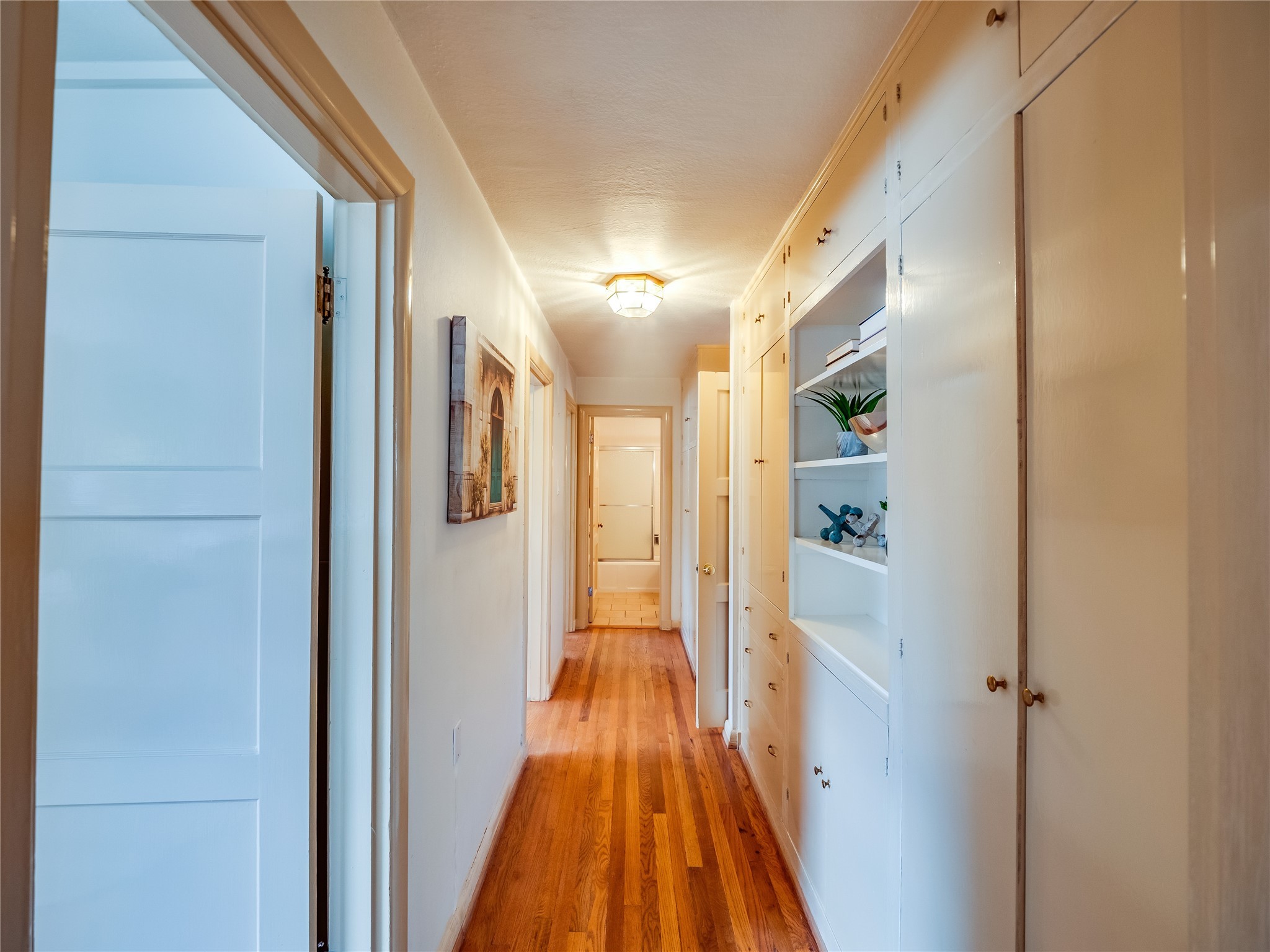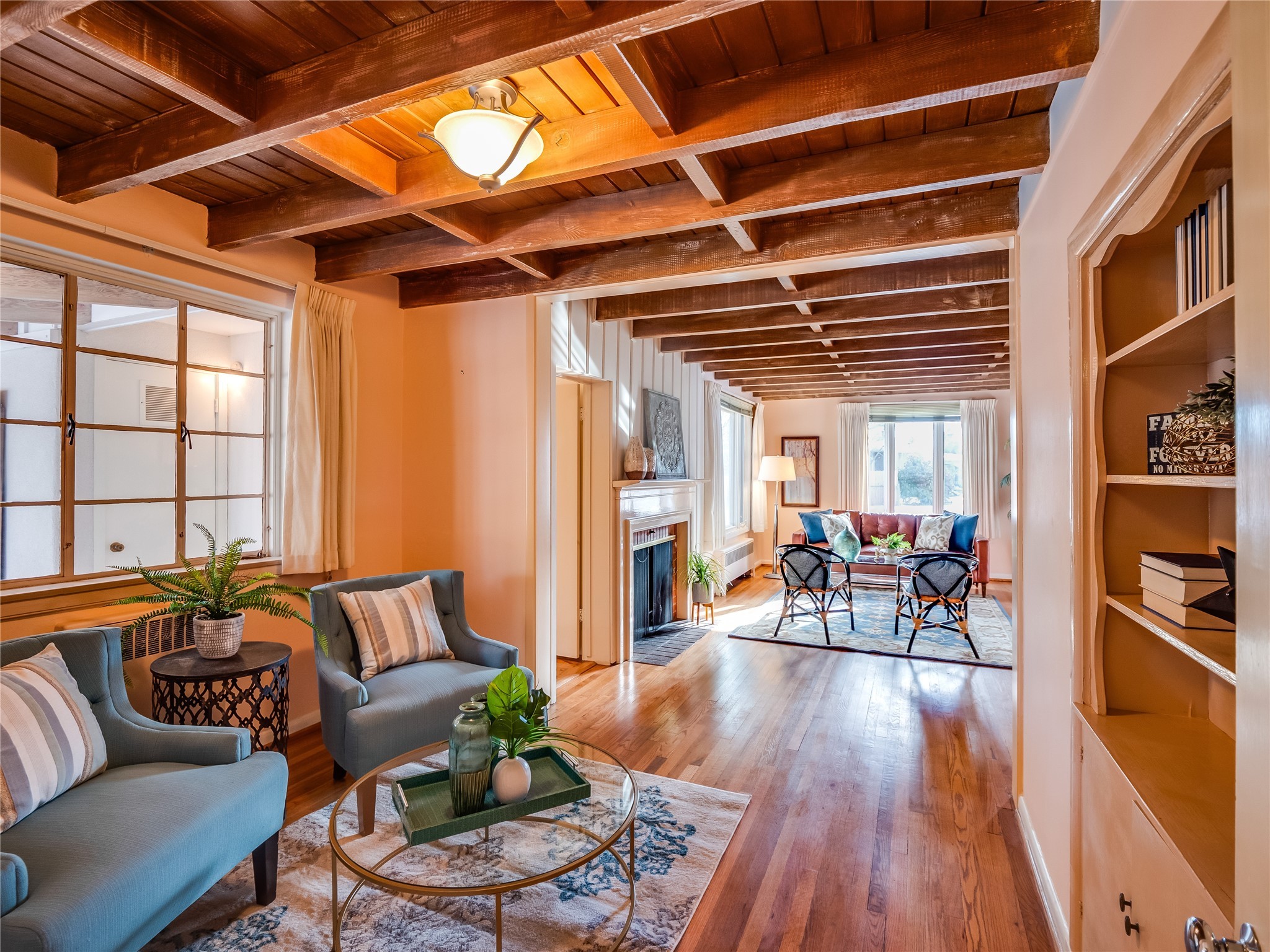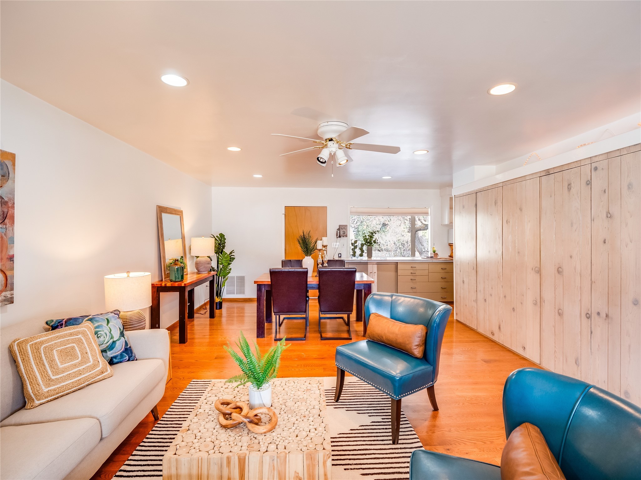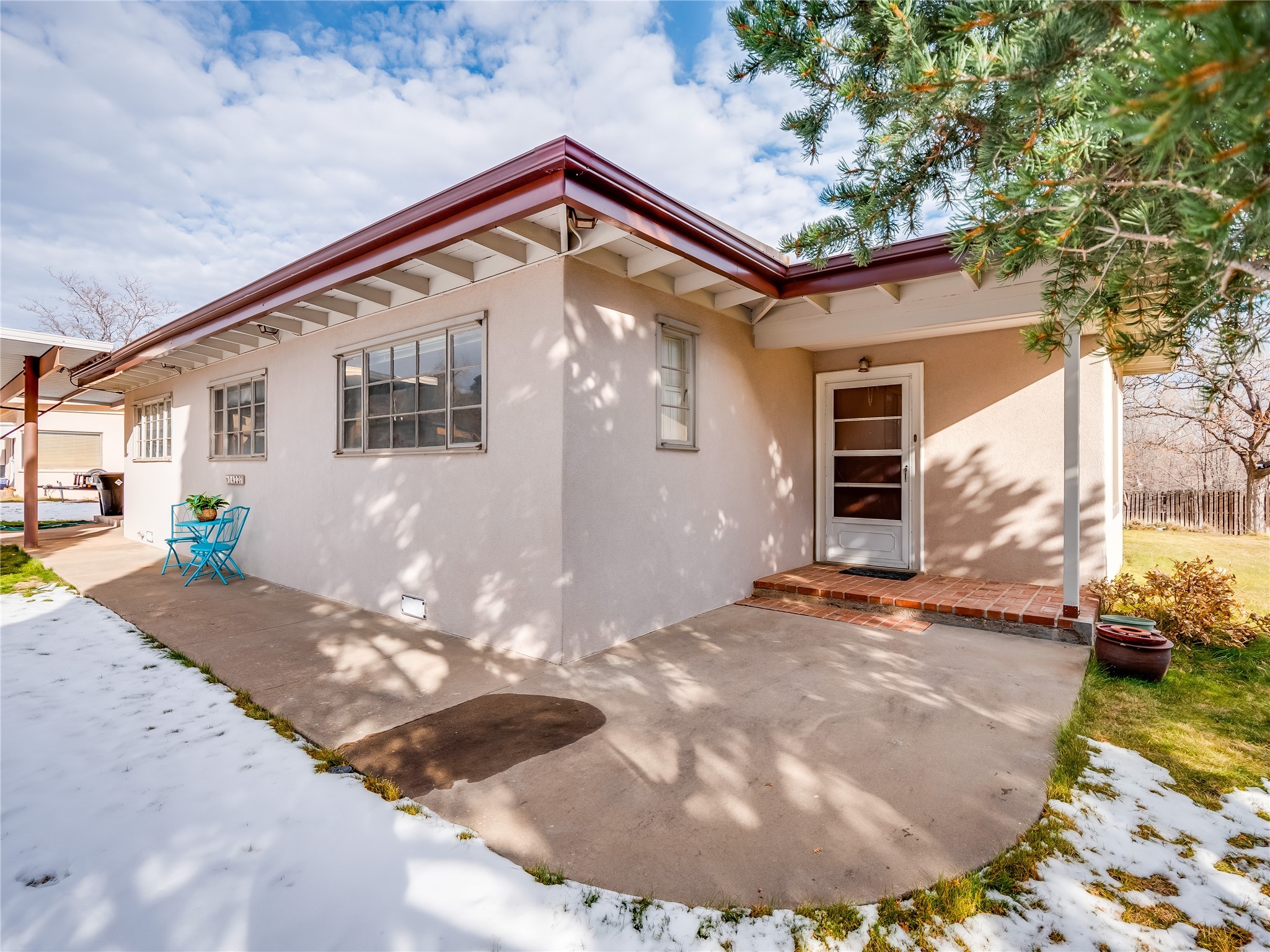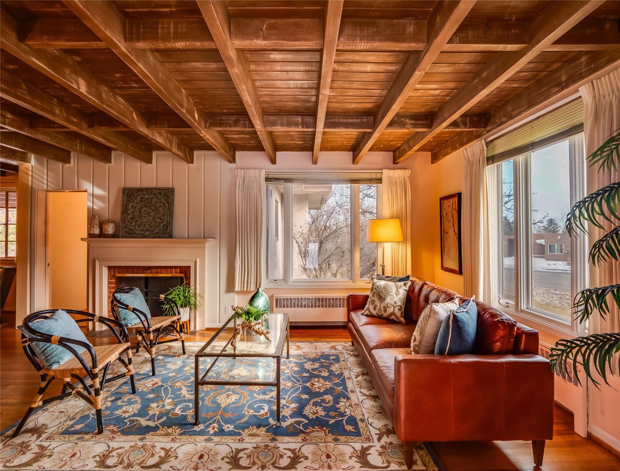 Welcome to this charming single-story corner lot home located in the West area, where classic elegance meets modern comfort! Beautiful front lawn with mature landscaping wraps around to the side yard and leads you to the front entrance. As you step inside, the warm ambiance of the wood floors invites you to explore further. The spacious living area features stunning wood coffered ceilings that add depth and character to the space. The centerpiece is a wood burning fireplace that just beckons you to unwind and relax and a cozy alcove with built-in shelves makes for the perfect place to curl up and read a book. The galley-style kitchen has ample Countertop space for meal preparation, cooking, and hosting. The open-faced shelving creates an airy and inviting atmosphere, providing both storage and an opportunity to showcase your favorite kitchenware or decorative pieces. Connected is the bright expansive family room and dining space. A standout feature in this space is a paneled wall that conceals hidden built-in shelves, a clever addition that combines sophistication with practicality. Large windows and strategically placed doors provide easy access to the two-car carport and the backyard patio. Bedroom Hallway with built in storage houses three nicely sized bedrooms with built in storage and a full guest bath with tile flooring and single sink vanity. From the Living Room there's a separate private hallway with access to the backyard and the large Primary En-Suite with laundry closet. A full bath with tile floors and shower/tub surround, and single sink vanity. A large fenced in backyard with grass, mature landscaping and trees create a beautiful private oasis. A covered patio adorned with skylights ensures the patio remains bright and inviting even during overcast days, or Gather around the built-in brick fireplace for stories and s'mores on cool evenings. Don't miss out in making this delightful home yours, book your tour today!
