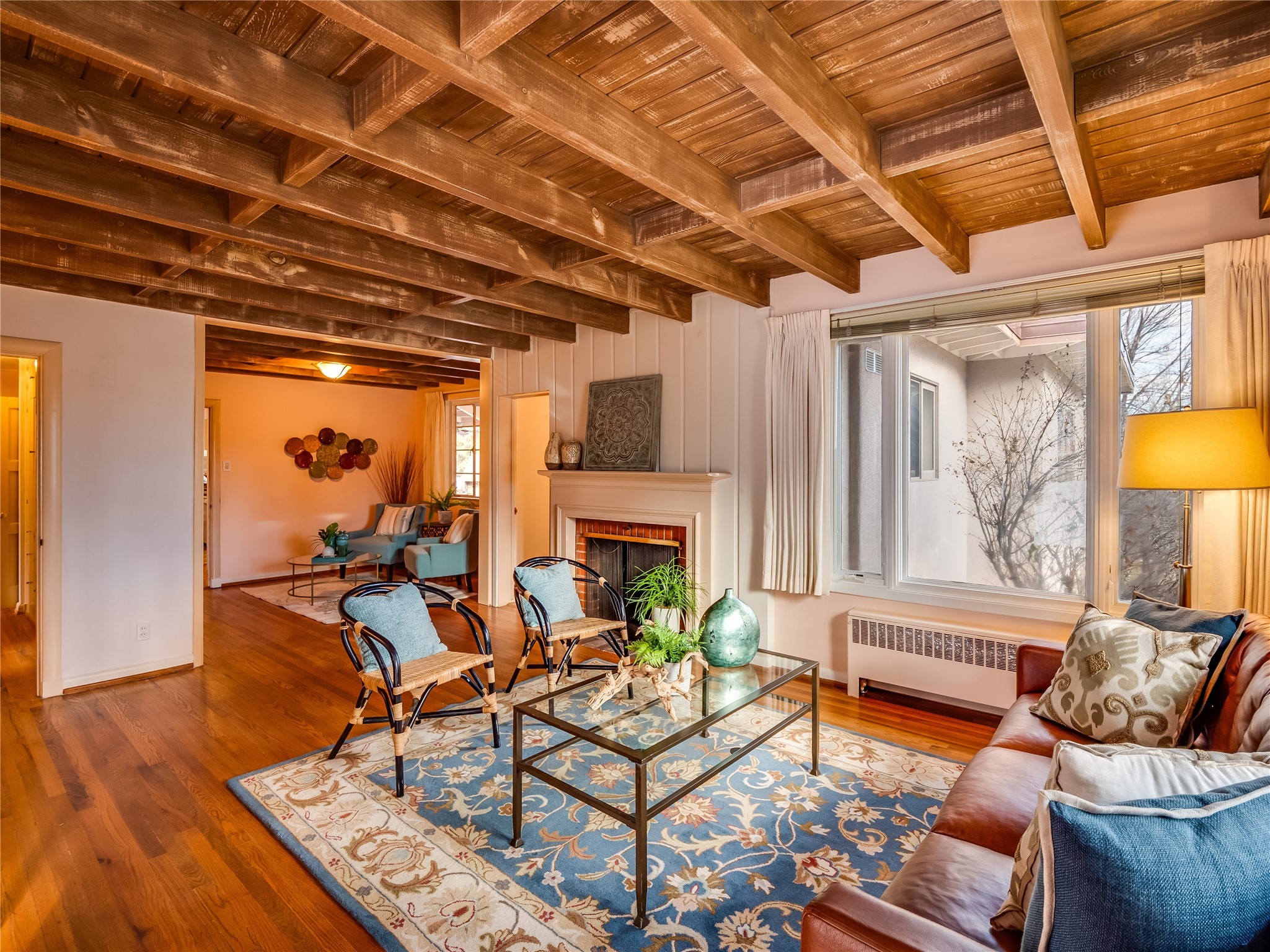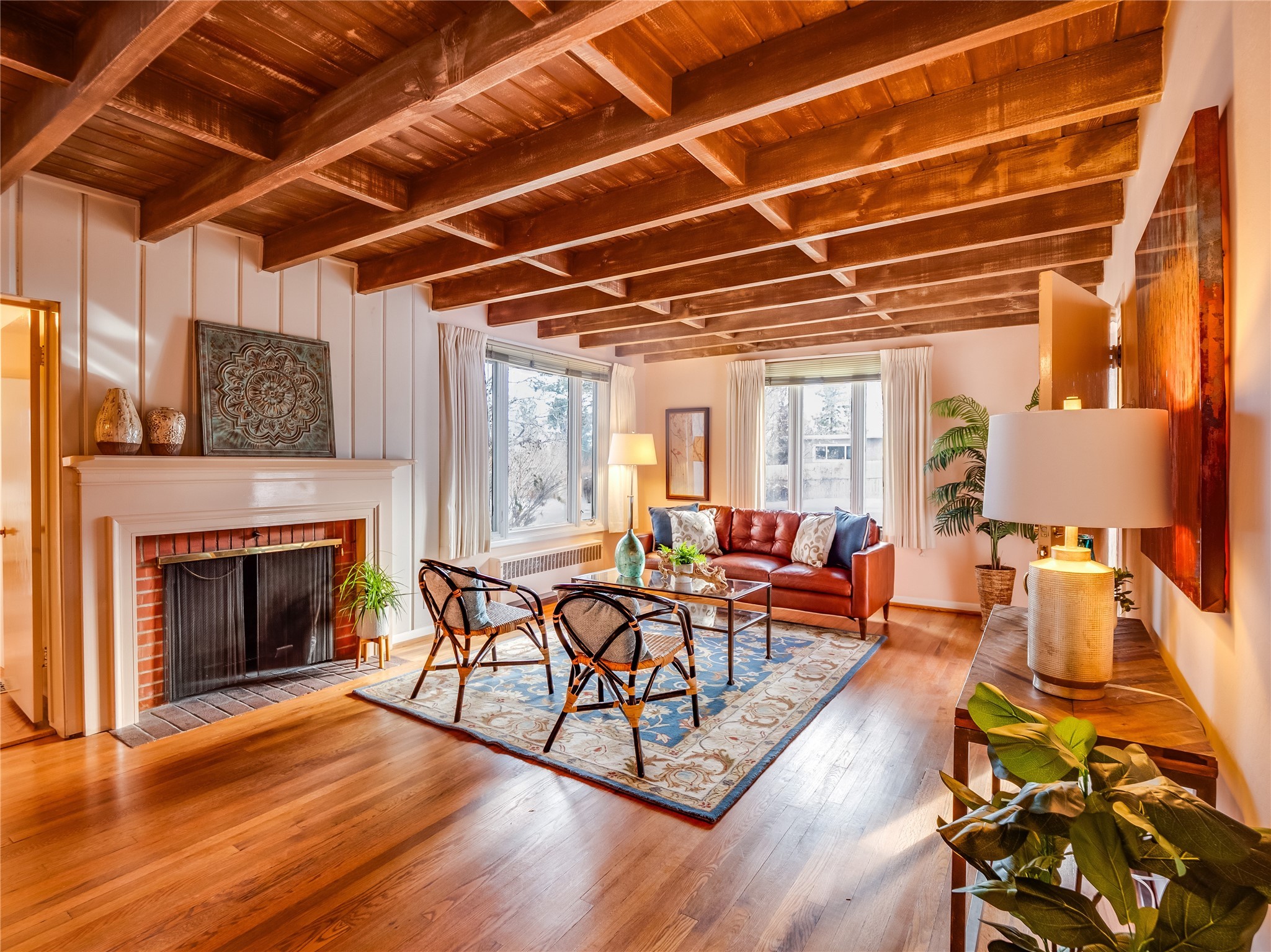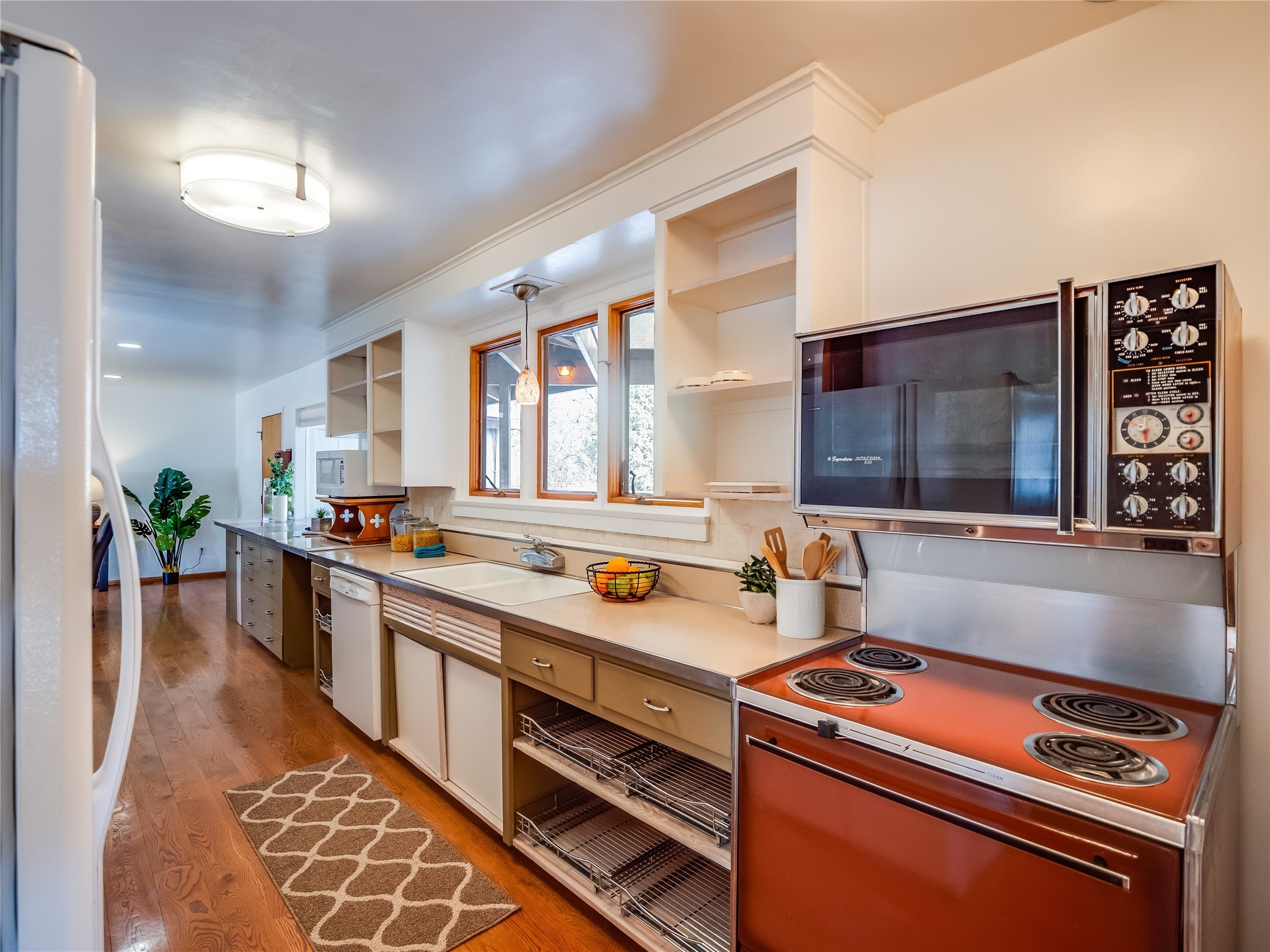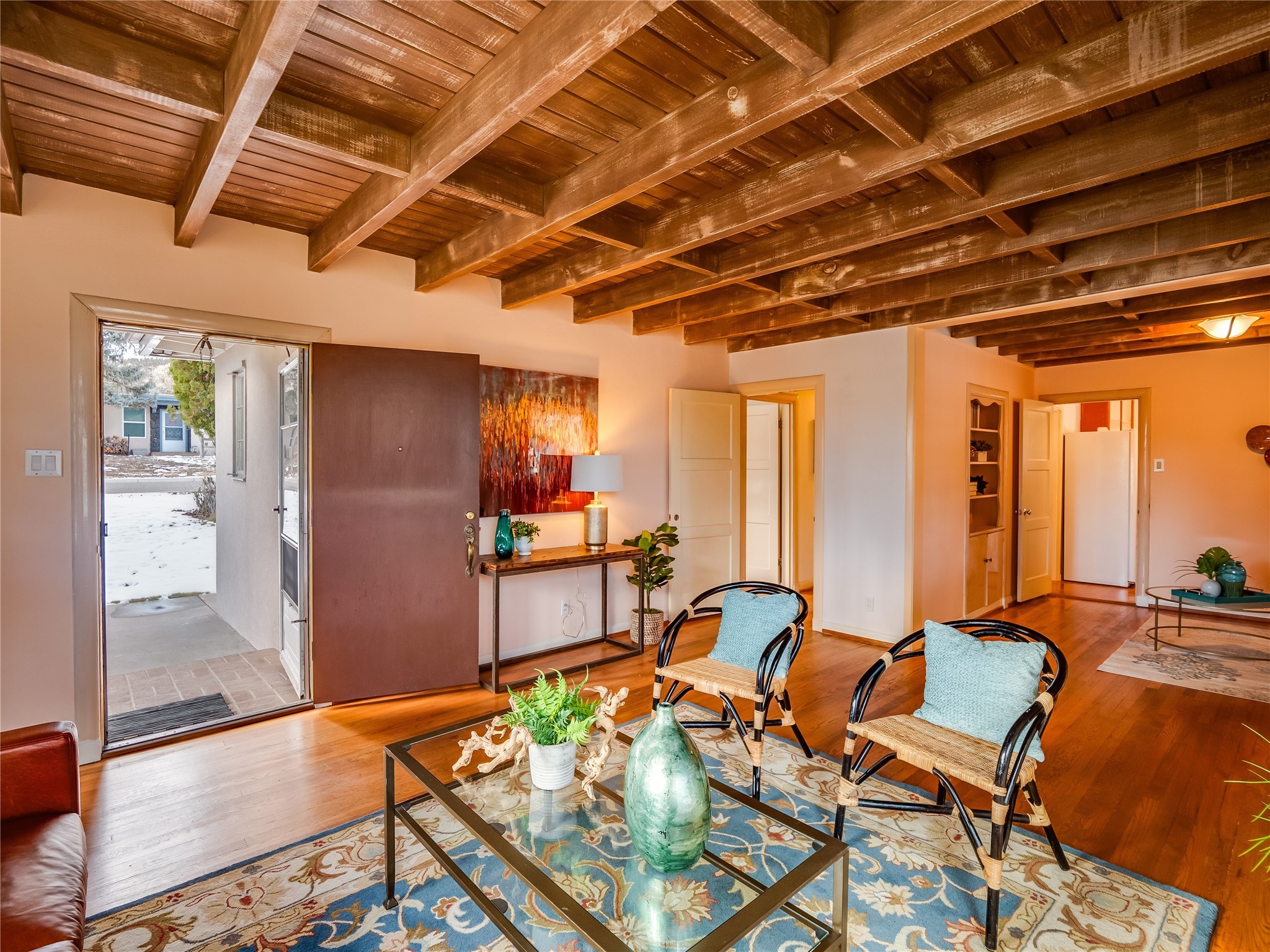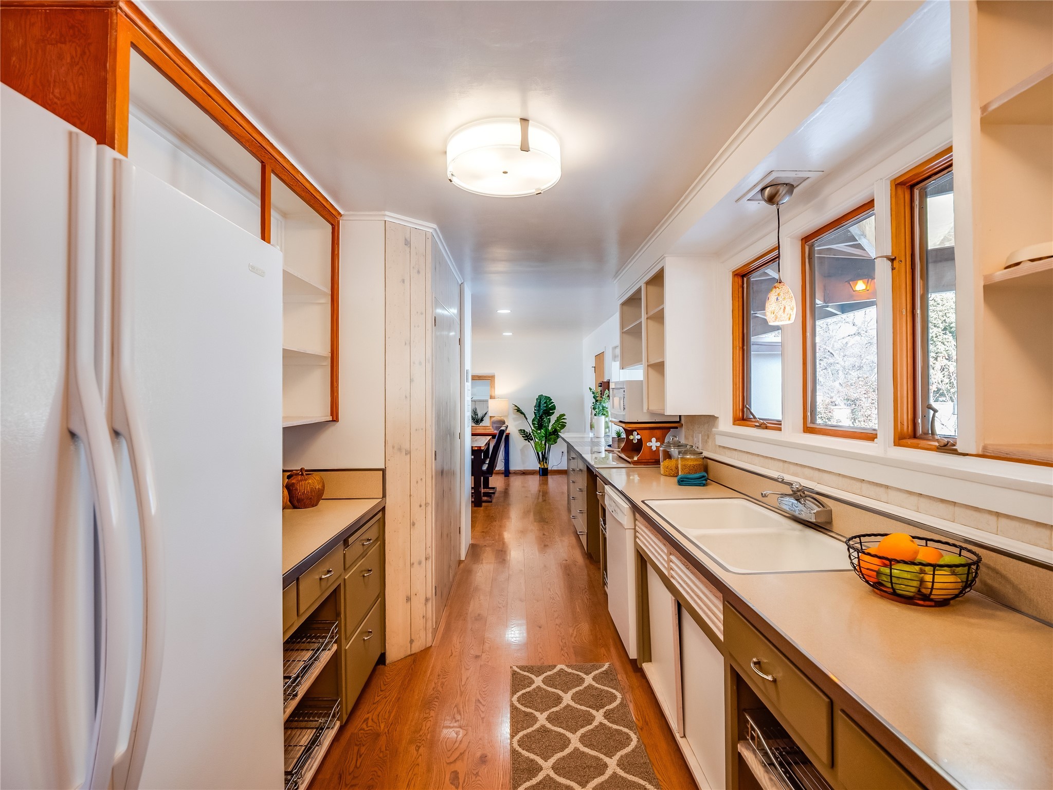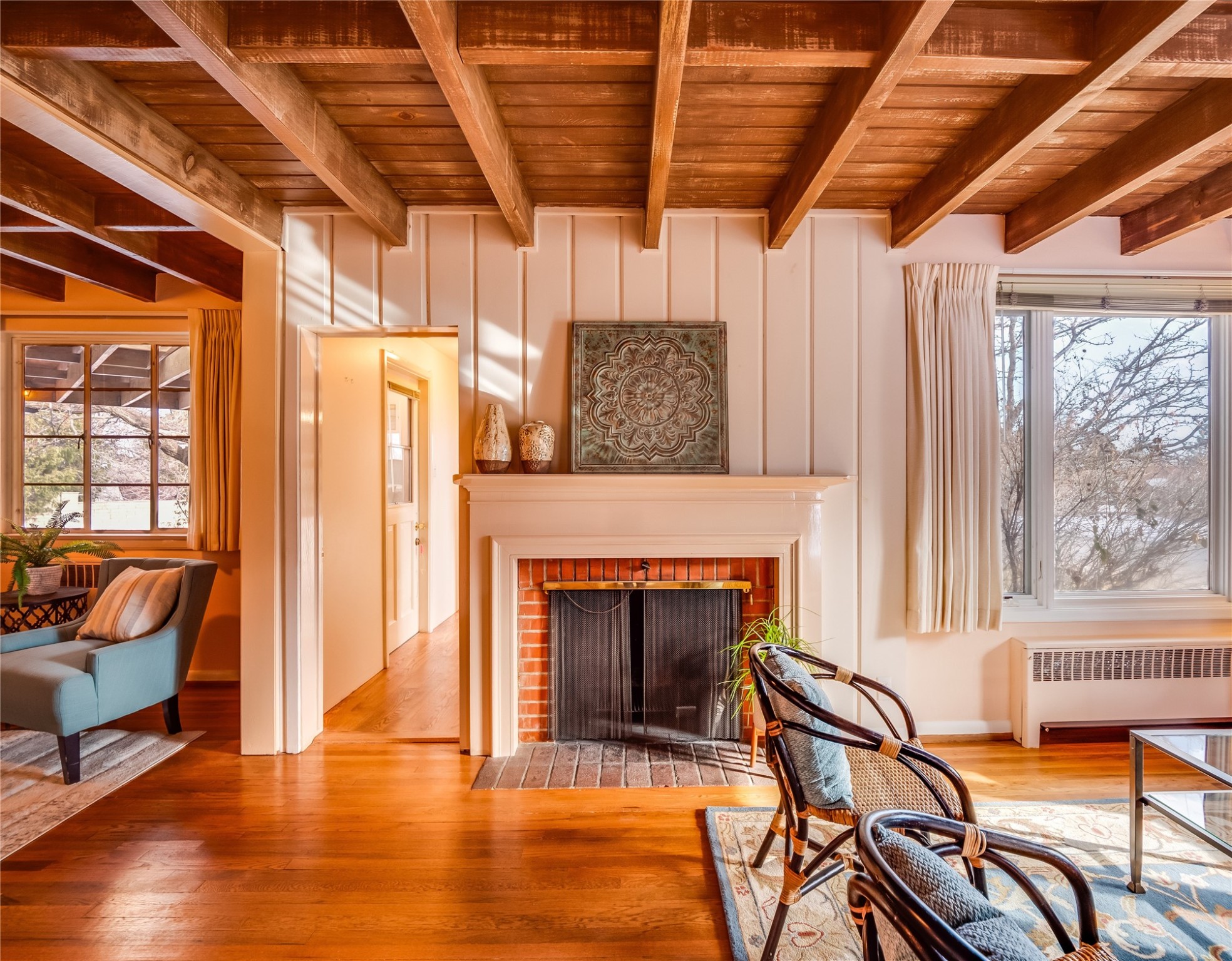 Welcome to this charming single-story corner lot home located in the West area, where classic elegance meets modern comfort! Beautiful front lawn with mature landscaping wraps around to the side yard and leads you to the front entrance. As you step inside, the warm ambiance of the wood floors invites you to explore further. The spacious living area features stunning wood coffered ceilings that add depth and character to the space. The centerpiece is a wood burning fireplace that just beckons you to unwind and relax and a cozy alcove with built-in shelves makes for the perfect place to curl up and read a book. The galley-style kitchen has ample Countertop space for meal preparation, cooking, and hosting. The open-faced shelving creates an airy and inviting atmosphere, providing both storage and an opportunity to showcase your favorite kitchenware or decorative pieces. Connected is the bright expansive family room and dining space. A standout feature in this space is a paneled wall that conceals hidden built-in shelves, a clever addition that combines sophistication with practicality. Large windows and strategically placed doors provide easy access to the two-car carport and the backyard patio. Bedroom Hallway with built in storage houses three nicely sized bedrooms with built in storage and a full guest bath with tile flooring and single sink vanity. From the Living Room there's a separate private hallway with access to the backyard and the large Primary En-Suite with laundry closet. A full bath with tile floors and shower/tub surround, and single sink vanity. A large fenced in backyard with grass, mature landscaping and trees create a beautiful private oasis. A covered patio adorned with skylights ensures the patio remains bright and inviting even during overcast days, or Gather around the built-in brick fireplace for stories and s'mores on cool evenings. Don't miss out in making this delightful home yours, book your tour today!
