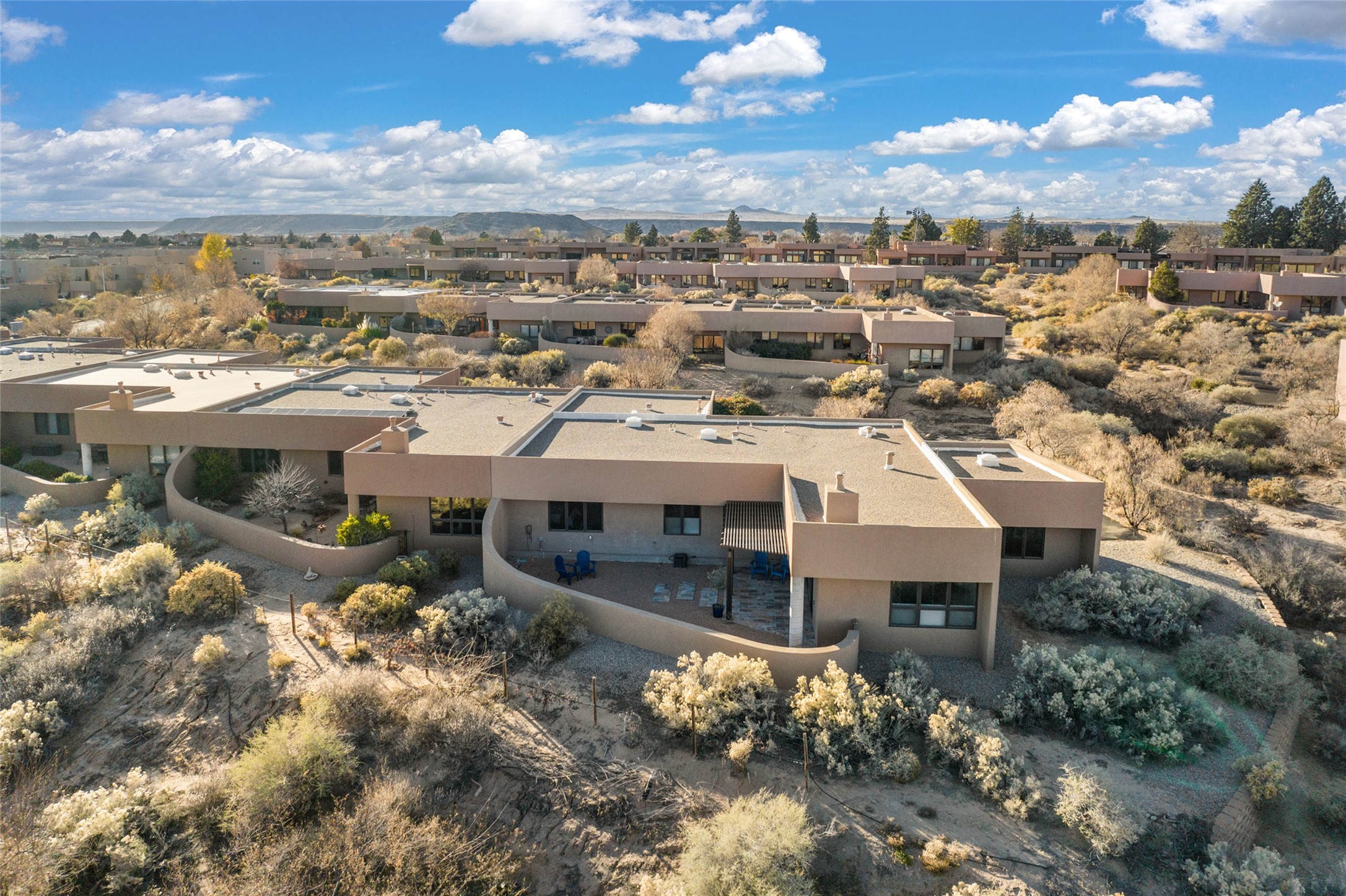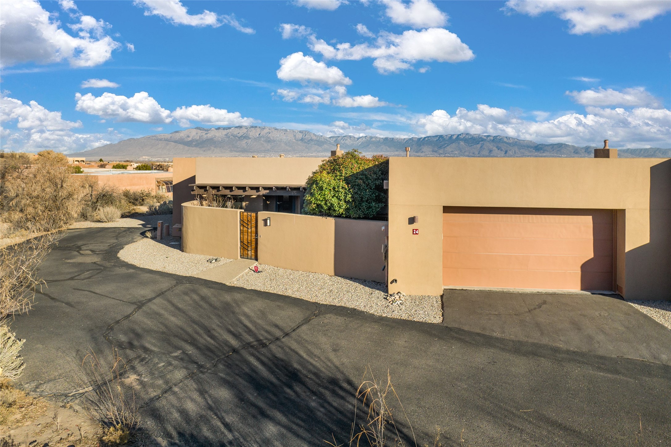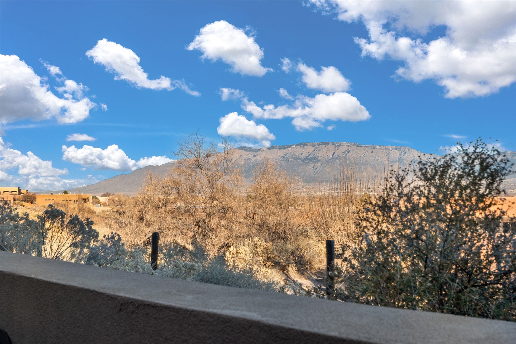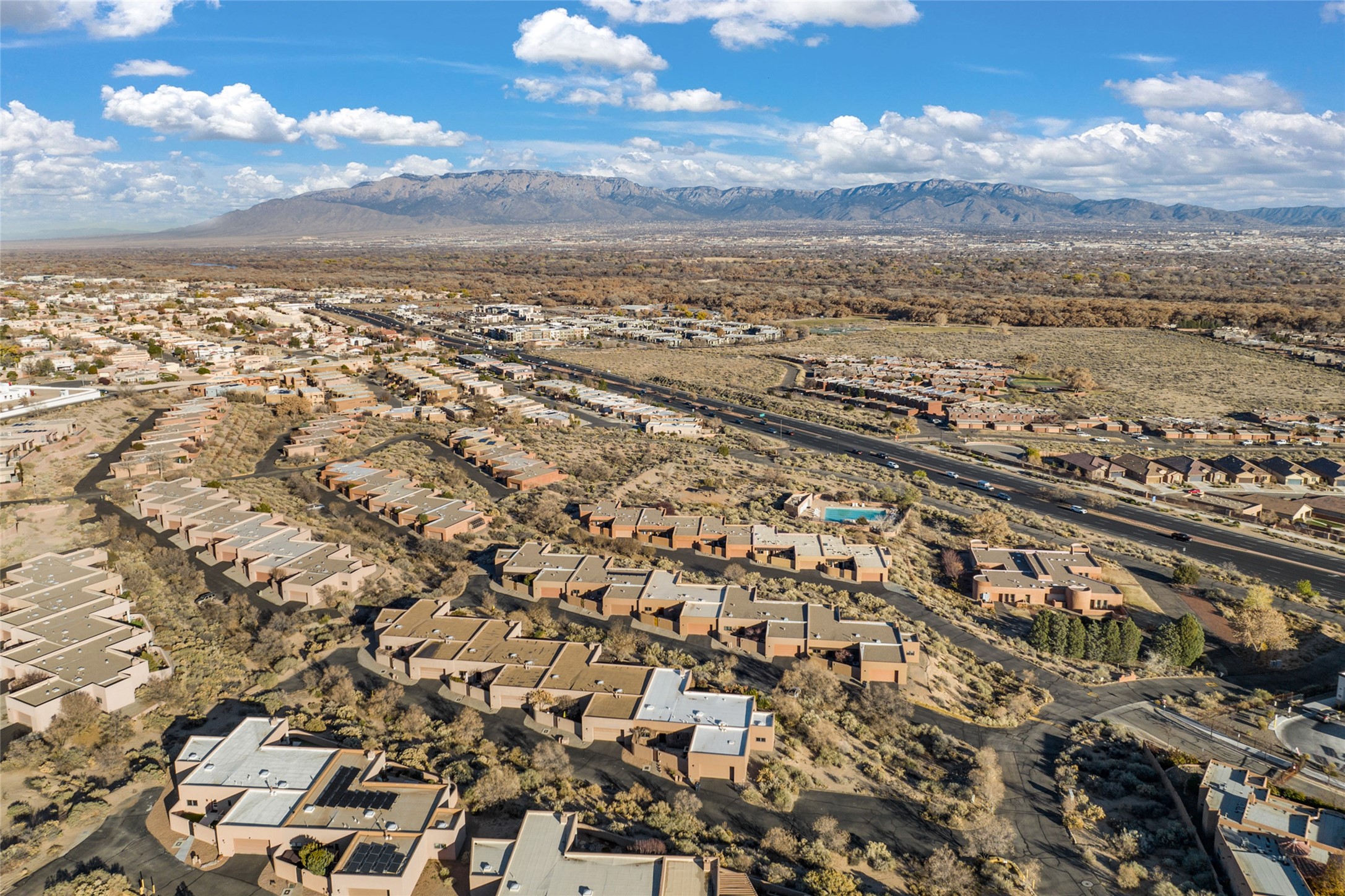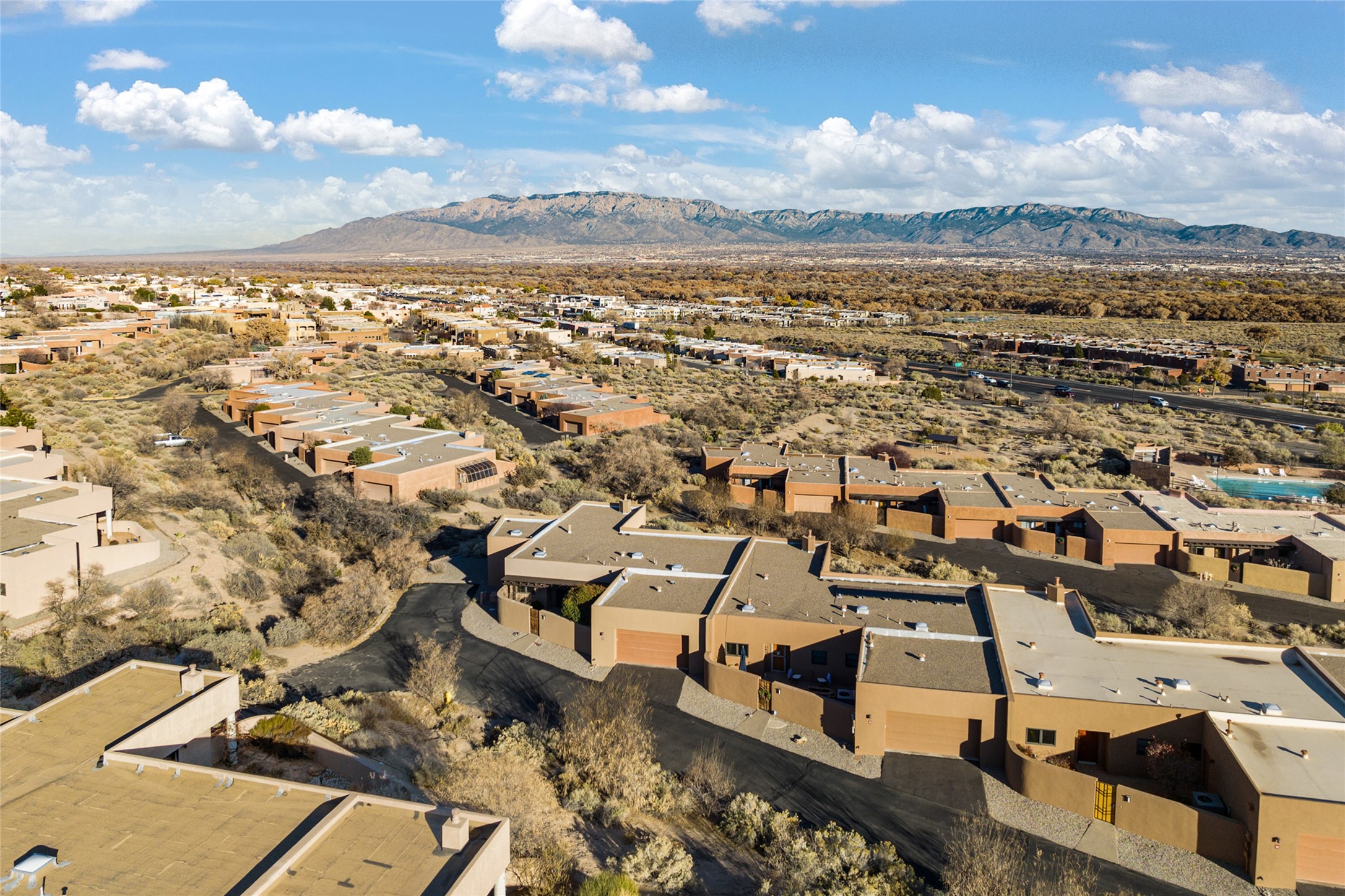 Fabulous townhome with unbelievable views of the Sandia mountains & bosque trees! This spacious 3 or 4 bedroom, 3 bath, 2 car garage home is beautifully designed & situated in a convenient gated community, developed by Ray Graham. Courtyard entry w/ a producing fig tree. Enter into the foyer that invites the open yet defined living areas starting with the cooks kitchen w/ stainless steel appliances, granite countertops, a gas cook top, fan, electric wall stove w/convection oven/ microwave, refrigerator & a moveable island. A large dining room, which transitions w/ a step down to the greatroom w/gas fireplace, lots of wall space for art plus more views! Patio doors opens to the east courtyard w/views & electric for a hot tub. The 4th bedroom has a 1/2 bath, it is perfect for a studio, study, guest or TV room. Primary bedroom is large enough for a sitting area, boasts the mountain views, large walk in closet, & the bath features a beautiful wood accent bench & a steam shower. Two other generous BR's w/fans, large closets, views, & they share a hall bath w/walk in shower that accomodates a wheel chair or walker, if need be. Doors are 36 inches. The laundry/service room is great for storage, dog area, & sink. Accesss to oversize garage that also accesses the front courtyard. Clean design. This is an end unit which offers more privacy, parking, especially for your guests. Over 2400 square feet & built in 2004. All the floors are ceramic tile throughout! There is a wonderful community pool! Easy access to all major river crossings, downtown, North Valley, Los Ranchos de Albuquerque, Los Poblanos, Bosque school, & St. Pius X High. Walking trails, bosque access, & conveniences for shopping is across Coors near Montano.