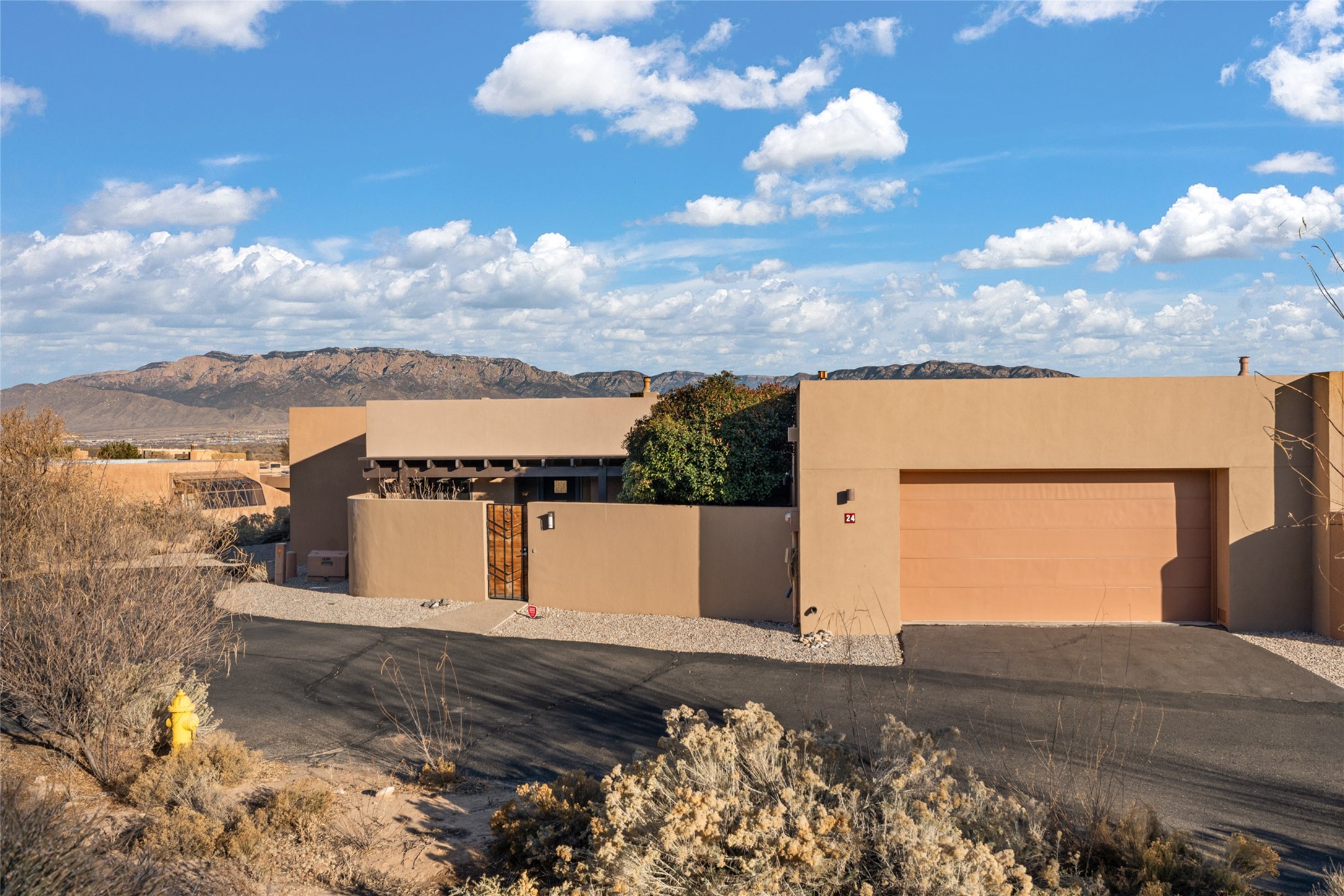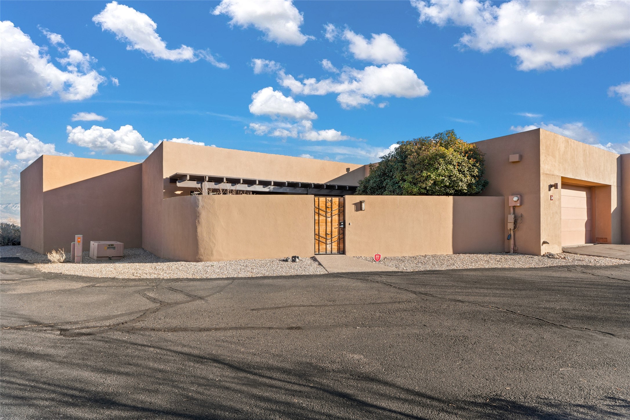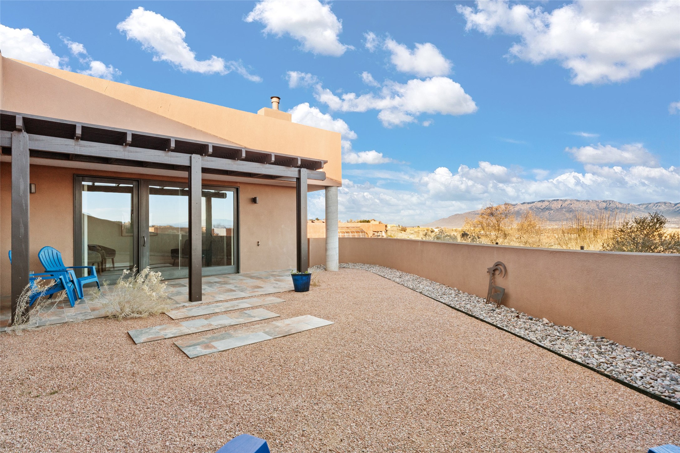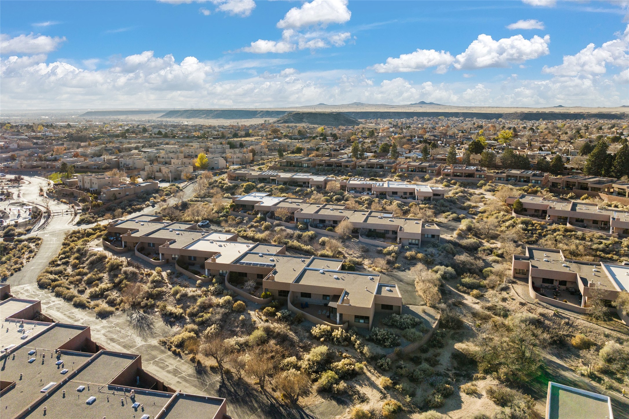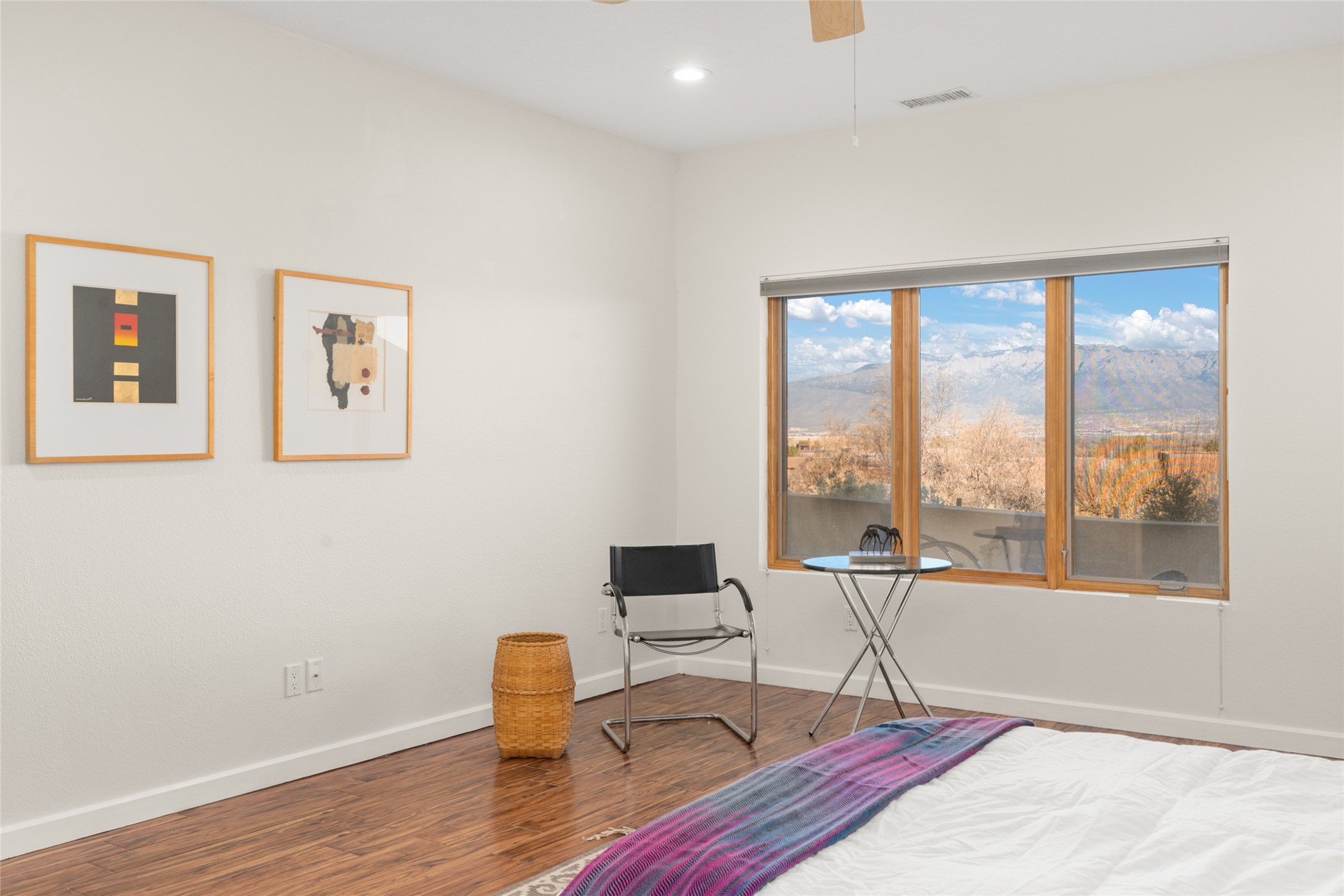 Fabulous townhome with unbelievable views of the Sandia mountains & bosque trees! This spacious 3 or 4 bedroom, 3 bath, 2 car garage home is beautifully designed & situated in a convenient gated community, developed by Ray Graham. Courtyard entry w/ a producing fig tree. Enter into the foyer that invites the open yet defined living areas starting with the cooks kitchen w/ stainless steel appliances, granite countertops, a gas cook top, fan, electric wall stove w/convection oven/ microwave, refrigerator & a moveable island. A large dining room, which transitions w/ a step down to the greatroom w/gas fireplace, lots of wall space for art plus more views! Patio doors opens to the east courtyard w/views & electric for a hot tub. The 4th bedroom has a 1/2 bath, it is perfect for a studio, study, guest or TV room. Primary bedroom is large enough for a sitting area, boasts the mountain views, large walk in closet, & the bath features a beautiful wood accent bench & a steam shower. Two other generous BR's w/fans, large closets, views, & they share a hall bath w/walk in shower that accomodates a wheel chair or walker, if need be. Doors are 36 inches. The laundry/service room is great for storage, dog area, & sink. Accesss to oversize garage that also accesses the front courtyard. Clean design. This is an end unit which offers more privacy, parking, especially for your guests. Over 2400 square feet & built in 2004. All the floors are ceramic tile throughout! There is a wonderful community pool! Easy access to all major river crossings, downtown, North Valley, Los Ranchos de Albuquerque, Los Poblanos, Bosque school, & St. Pius X High. Walking trails, bosque access, & conveniences for shopping is across Coors near Montano.
