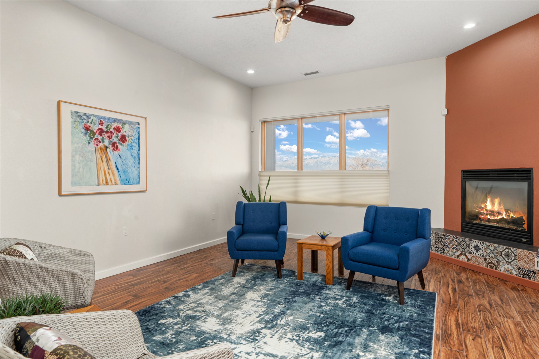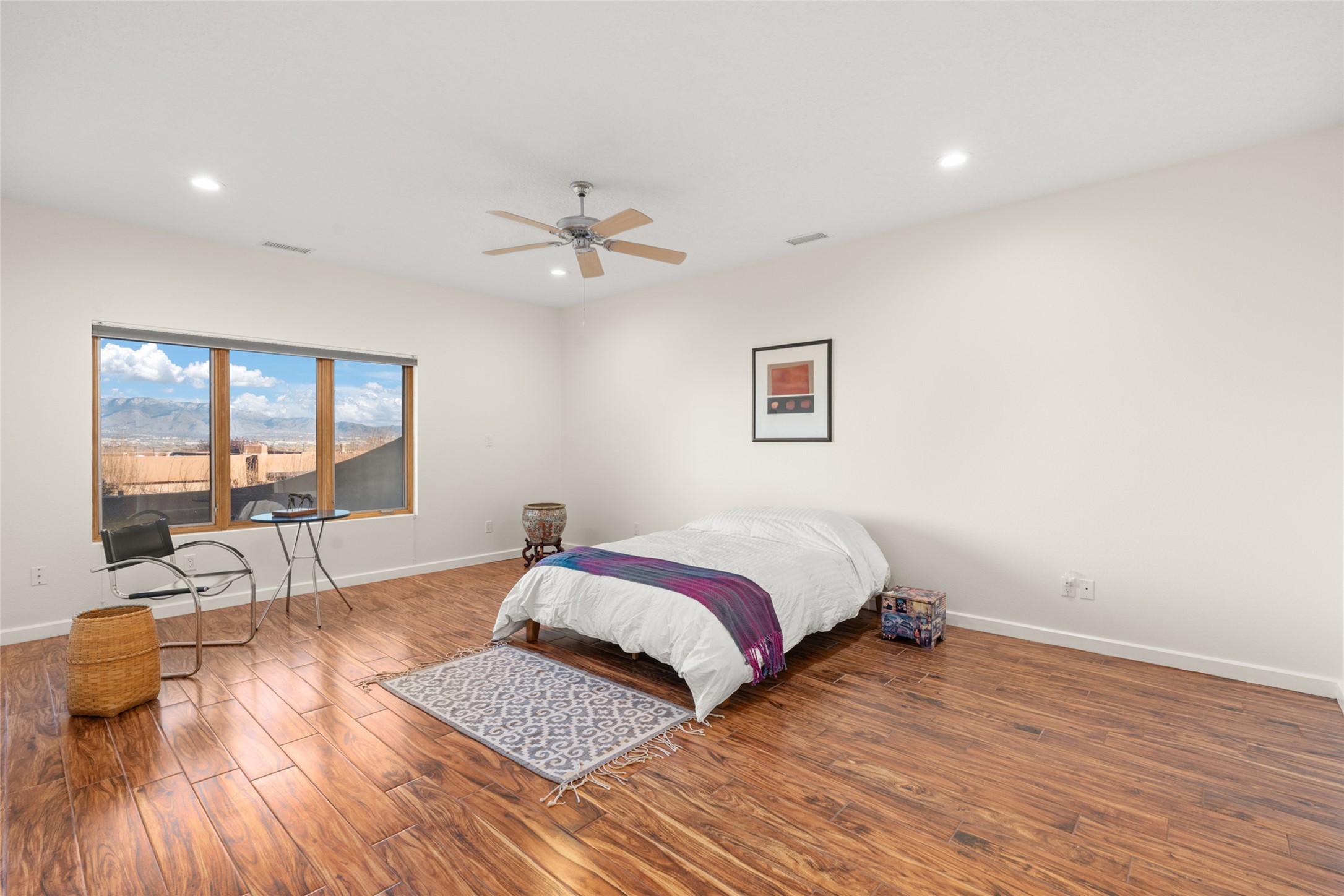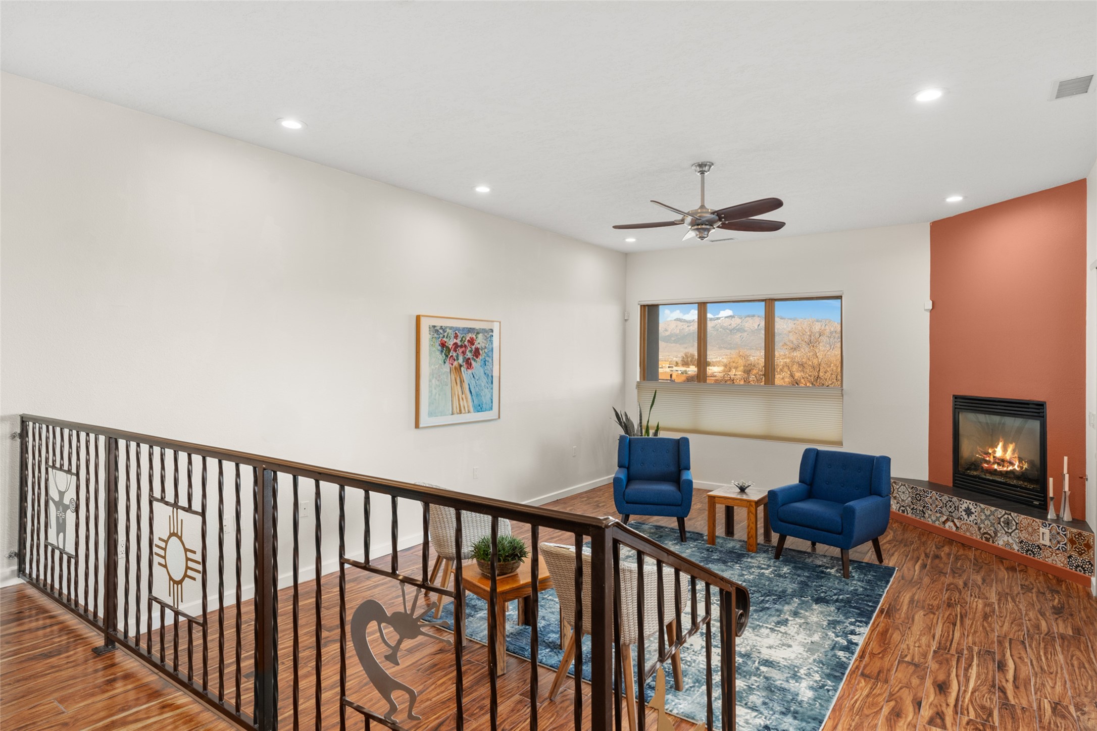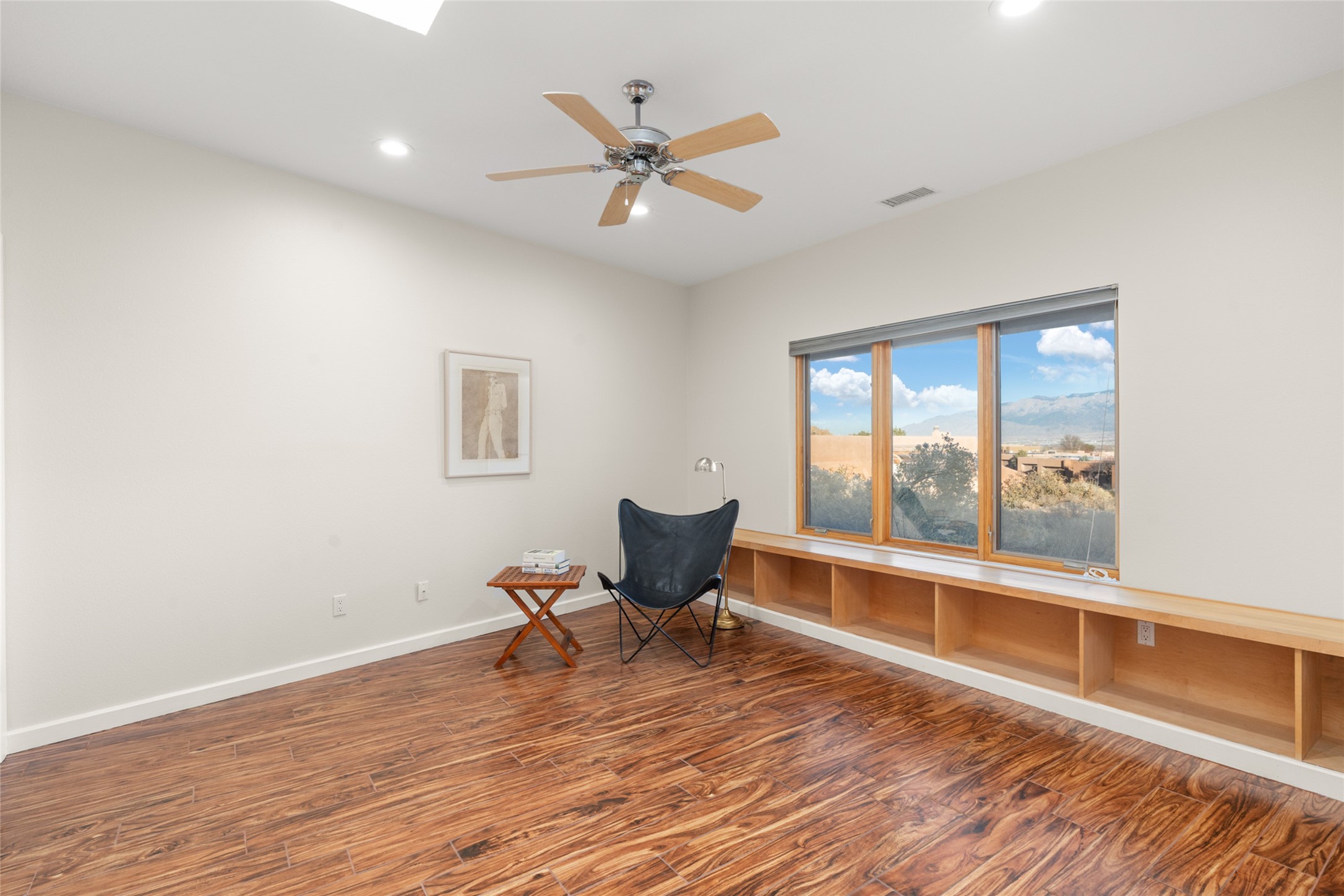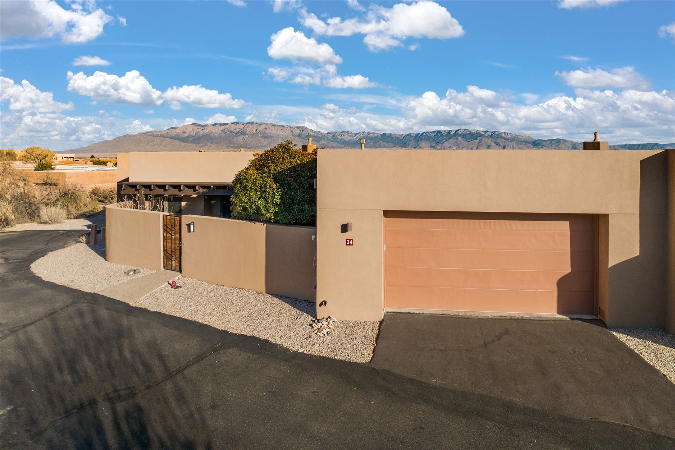 Fabulous townhome with unbelievable views of the Sandia mountains & bosque trees! This spacious 3 or 4 bedroom, 3 bath, 2 car garage home is beautifully designed & situated in a convenient gated community, developed by Ray Graham. Courtyard entry w/ a producing fig tree. Enter into the foyer that invites the open yet defined living areas starting with the cooks kitchen w/ stainless steel appliances, granite countertops, a gas cook top, fan, electric wall stove w/convection oven/ microwave, refrigerator & a moveable island. A large dining room, which transitions w/ a step down to the greatroom w/gas fireplace, lots of wall space for art plus more views! Patio doors opens to the east courtyard w/views & electric for a hot tub. The 4th bedroom has a 1/2 bath, it is perfect for a studio, study, guest or TV room. Primary bedroom is large enough for a sitting area, boasts the mountain views, large walk in closet, & the bath features a beautiful wood accent bench & a steam shower. Two other generous BR's w/fans, large closets, views, & they share a hall bath w/walk in shower that accomodates a wheel chair or walker, if need be. Doors are 36 inches. The laundry/service room is great for storage, dog area, & sink. Accesss to oversize garage that also accesses the front courtyard. Clean design. This is an end unit which offers more privacy, parking, especially for your guests. Over 2400 square feet & built in 2004. All the floors are ceramic tile throughout! There is a wonderful community pool! Easy access to all major river crossings, downtown, North Valley, Los Ranchos de Albuquerque, Los Poblanos, Bosque school, & St. Pius X High. Walking trails, bosque access, & conveniences for shopping is across Coors near Montano.