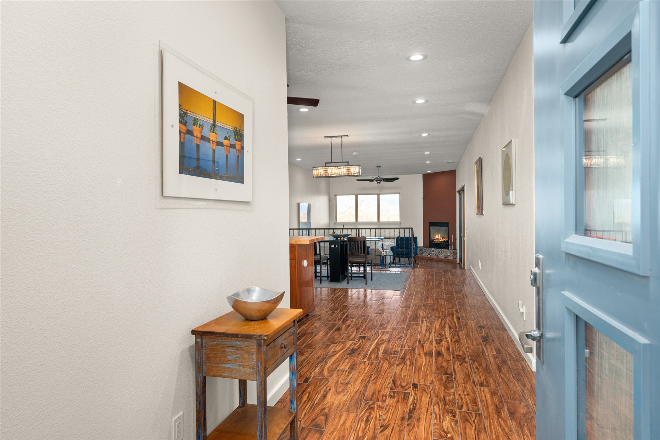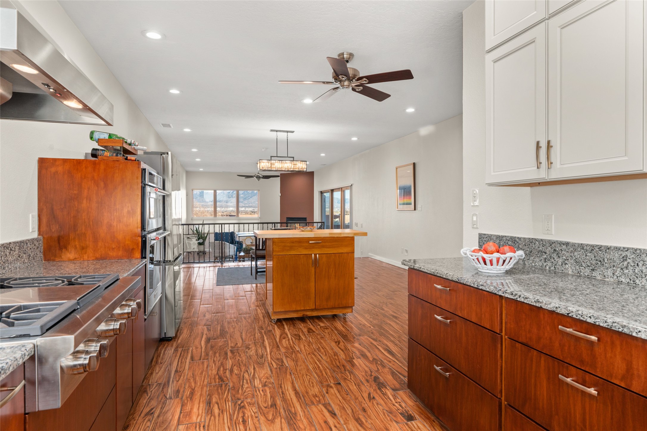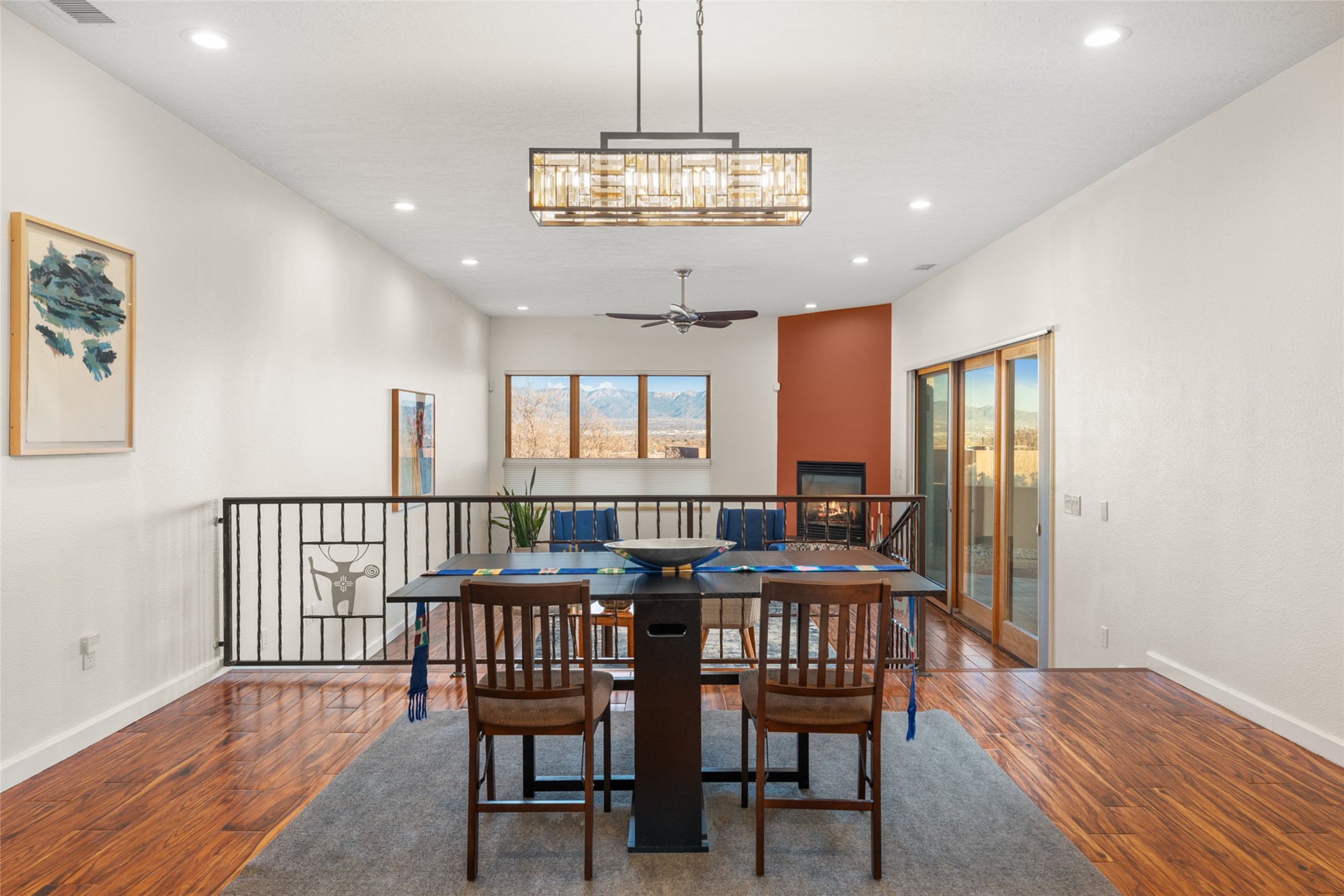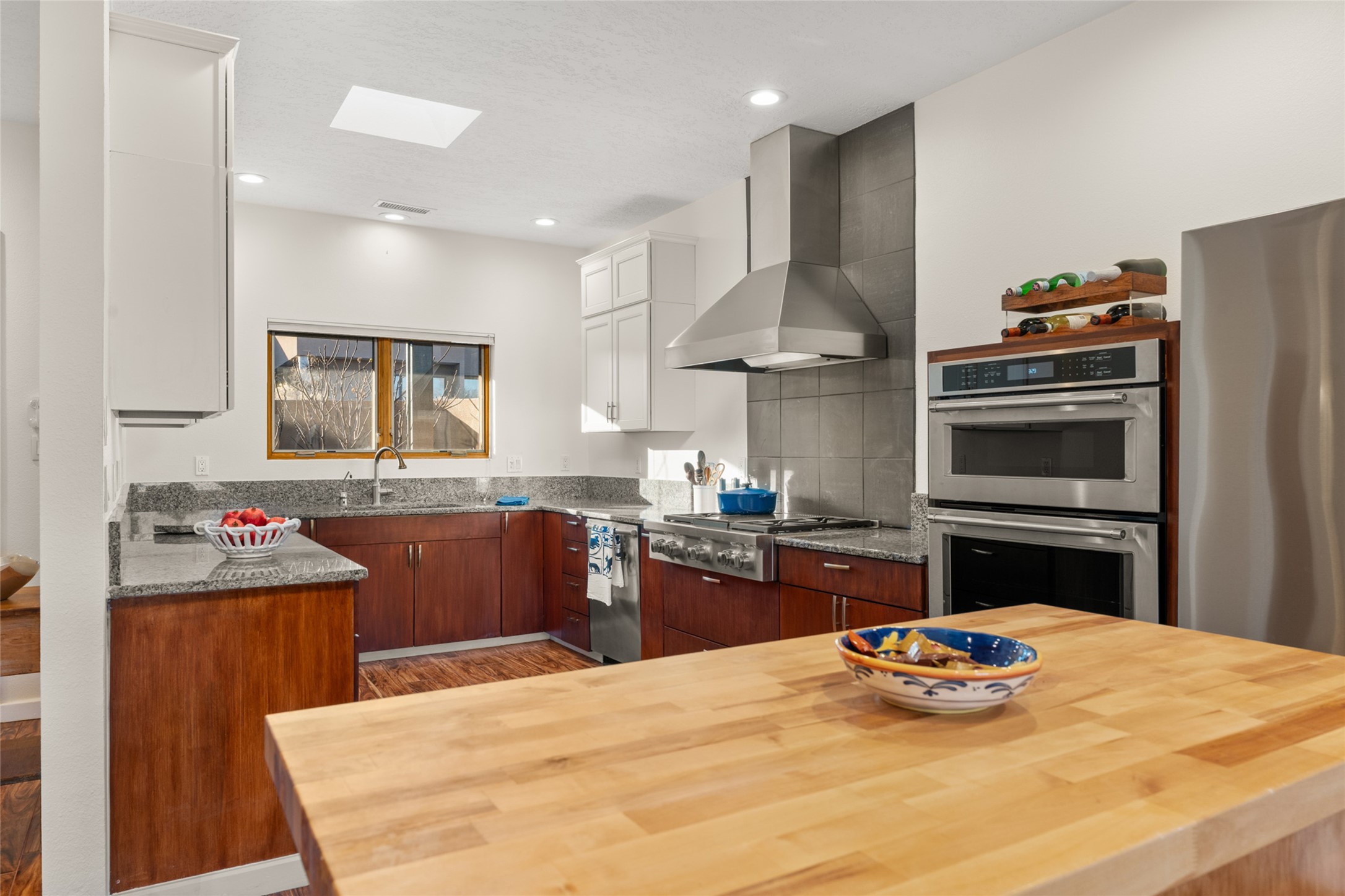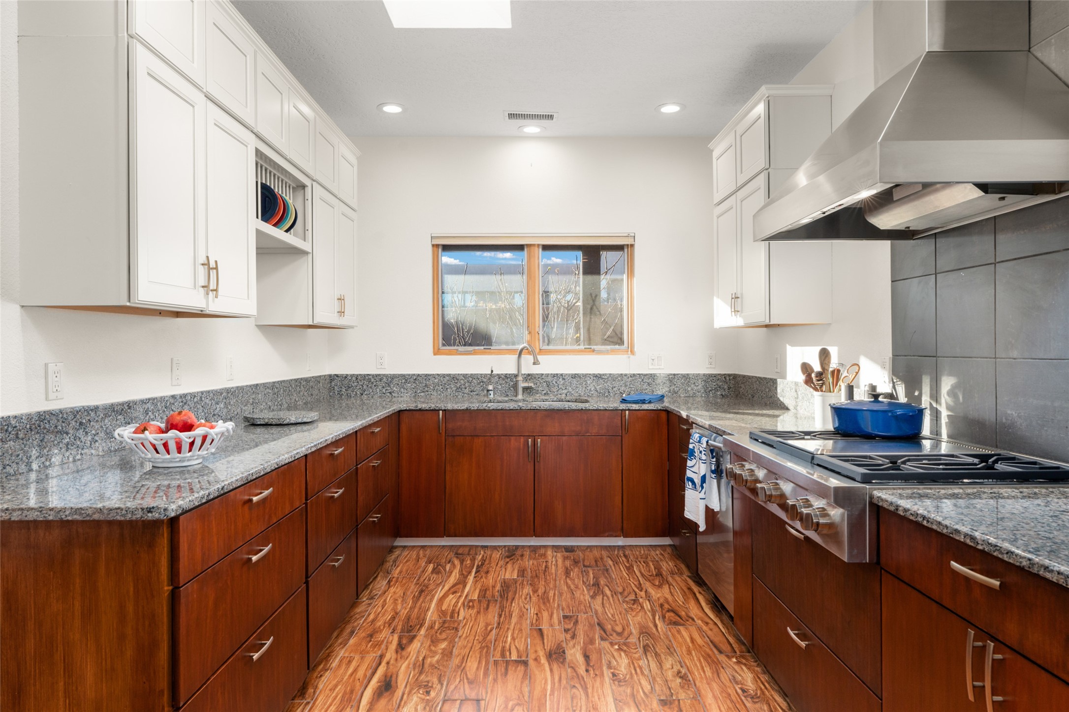 Fabulous townhome with unbelievable views of the Sandia mountains & bosque trees! This spacious 3 or 4 bedroom, 3 bath, 2 car garage home is beautifully designed & situated in a convenient gated community, developed by Ray Graham. Courtyard entry w/ a producing fig tree. Enter into the foyer that invites the open yet defined living areas starting with the cooks kitchen w/ stainless steel appliances, granite countertops, a gas cook top, fan, electric wall stove w/convection oven/ microwave, refrigerator & a moveable island. A large dining room, which transitions w/ a step down to the greatroom w/gas fireplace, lots of wall space for art plus more views! Patio doors opens to the east courtyard w/views & electric for a hot tub. The 4th bedroom has a 1/2 bath, it is perfect for a studio, study, guest or TV room. Primary bedroom is large enough for a sitting area, boasts the mountain views, large walk in closet, & the bath features a beautiful wood accent bench & a steam shower. Two other generous BR's w/fans, large closets, views, & they share a hall bath w/walk in shower that accomodates a wheel chair or walker, if need be. Doors are 36 inches. The laundry/service room is great for storage, dog area, & sink. Accesss to oversize garage that also accesses the front courtyard. Clean design. This is an end unit which offers more privacy, parking, especially for your guests. Over 2400 square feet & built in 2004. All the floors are ceramic tile throughout! There is a wonderful community pool! Easy access to all major river crossings, downtown, North Valley, Los Ranchos de Albuquerque, Los Poblanos, Bosque school, & St. Pius X High. Walking trails, bosque access, & conveniences for shopping is across Coors near Montano.