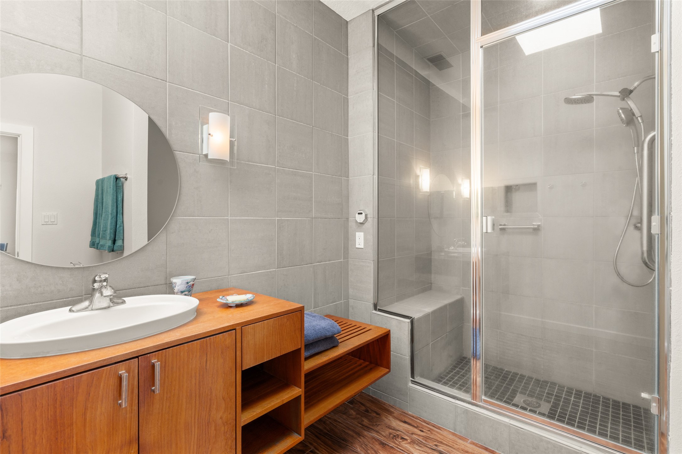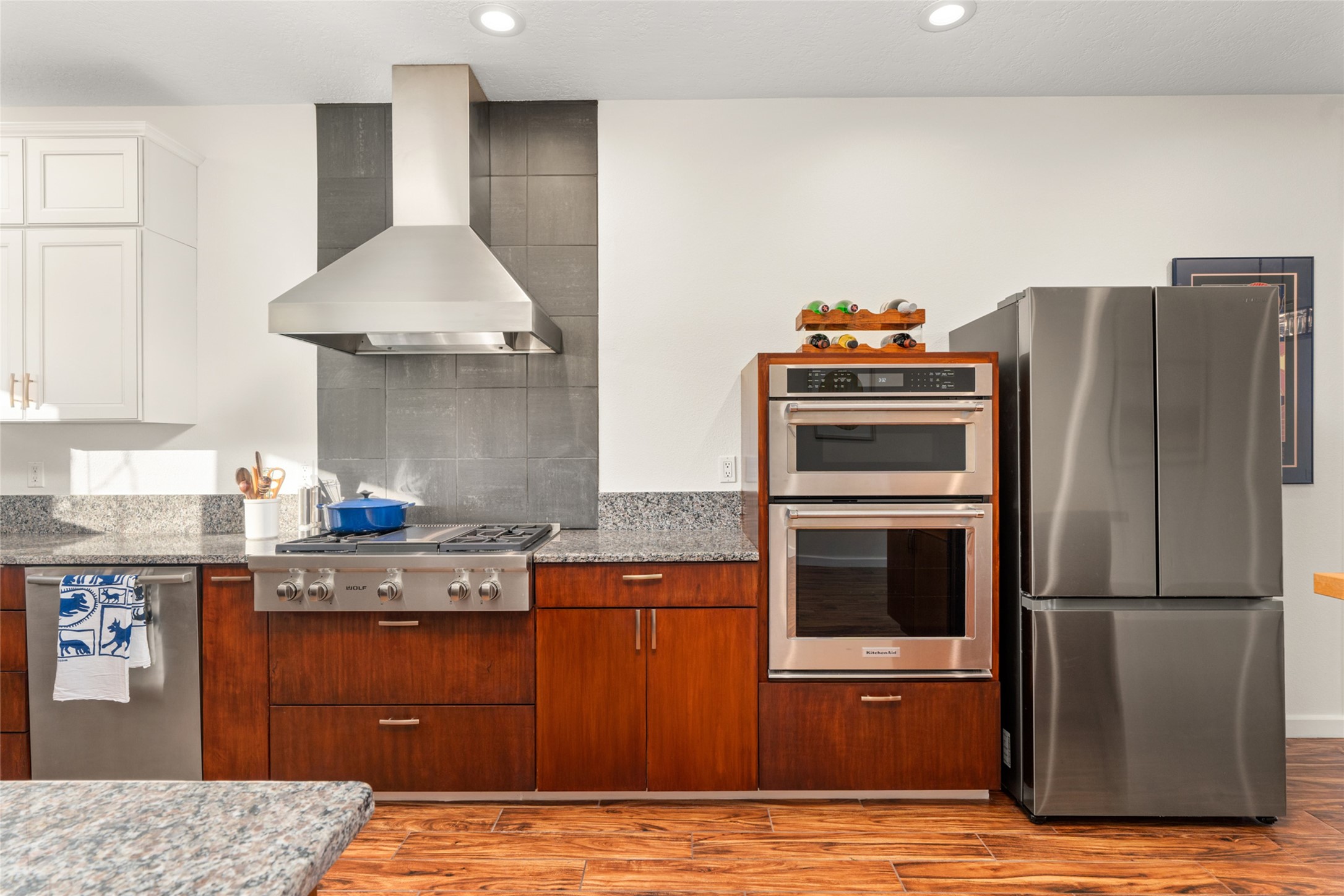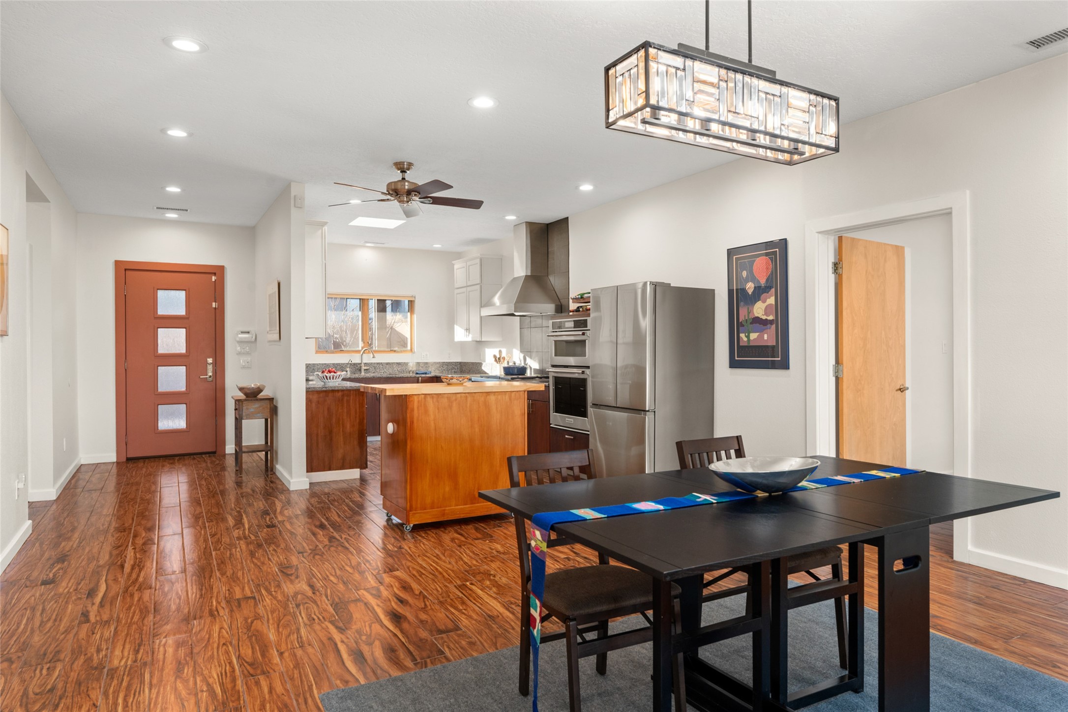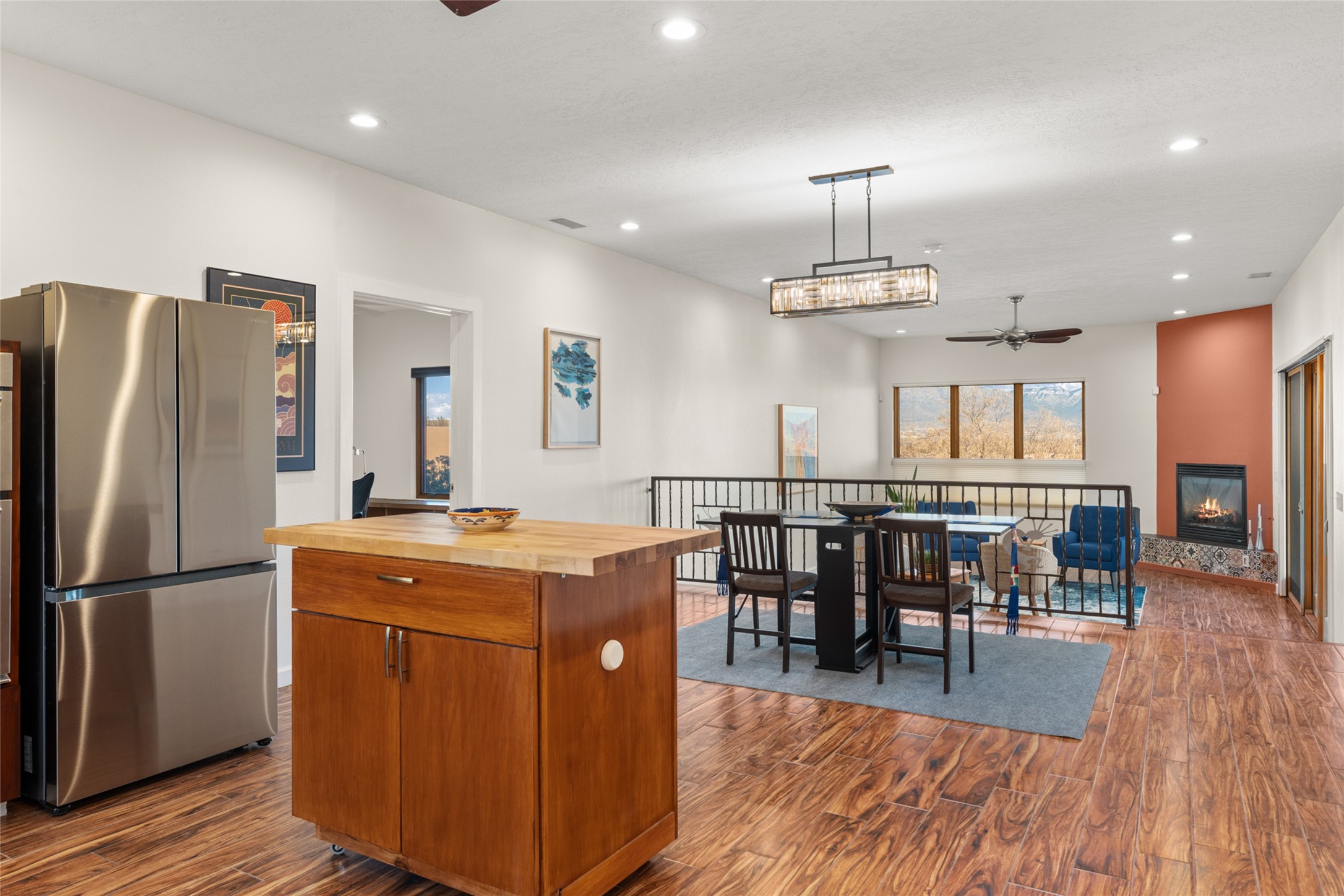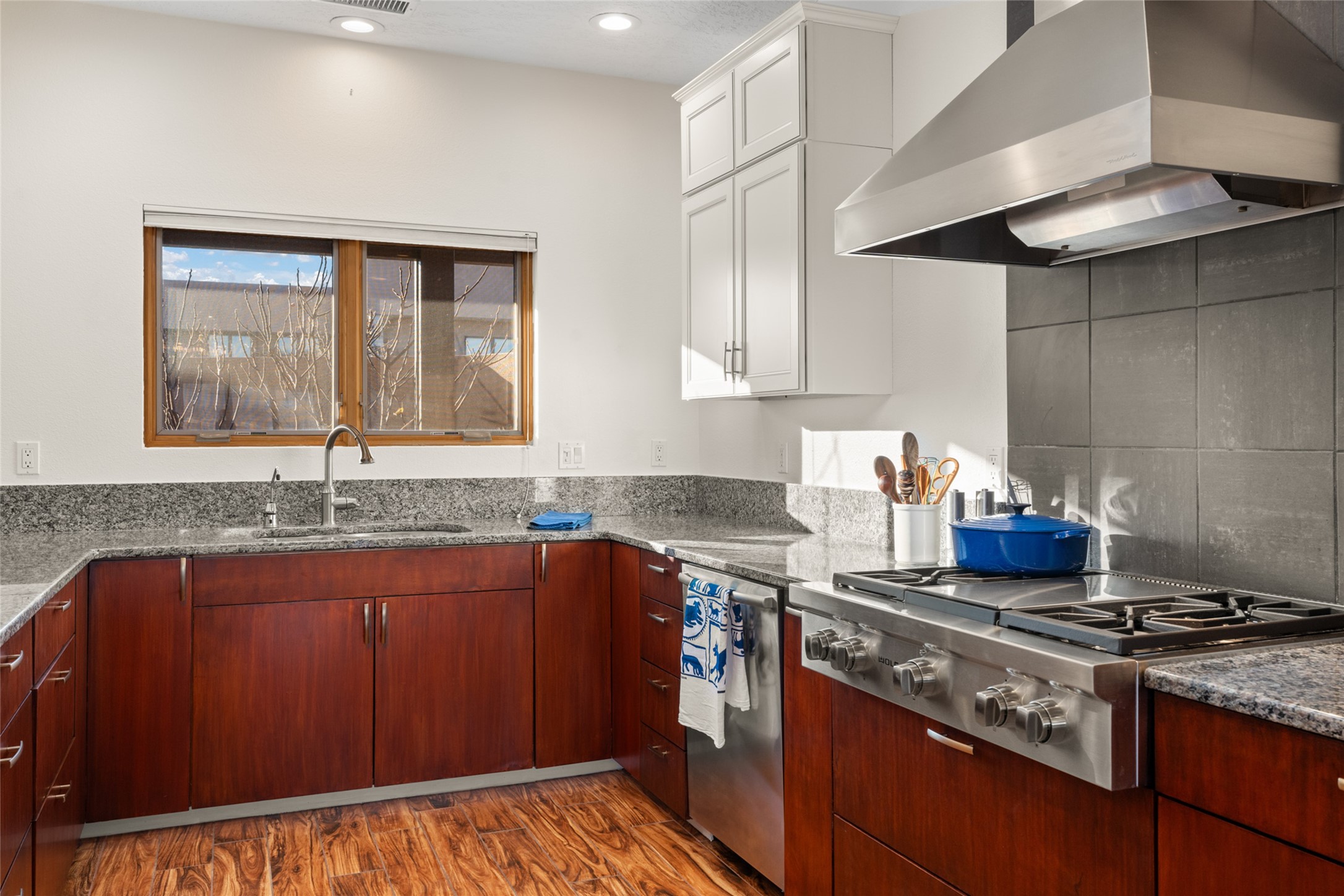 Fabulous townhome with unbelievable views of the Sandia mountains & bosque trees! This spacious 3 or 4 bedroom, 3 bath, 2 car garage home is beautifully designed & situated in a convenient gated community, developed by Ray Graham. Courtyard entry w/ a producing fig tree. Enter into the foyer that invites the open yet defined living areas starting with the cooks kitchen w/ stainless steel appliances, granite countertops, a gas cook top, fan, electric wall stove w/convection oven/ microwave, refrigerator & a moveable island. A large dining room, which transitions w/ a step down to the greatroom w/gas fireplace, lots of wall space for art plus more views! Patio doors opens to the east courtyard w/views & electric for a hot tub. The 4th bedroom has a 1/2 bath, it is perfect for a studio, study, guest or TV room. Primary bedroom is large enough for a sitting area, boasts the mountain views, large walk in closet, & the bath features a beautiful wood accent bench & a steam shower. Two other generous BR's w/fans, large closets, views, & they share a hall bath w/walk in shower that accomodates a wheel chair or walker, if need be. Doors are 36 inches. The laundry/service room is great for storage, dog area, & sink. Accesss to oversize garage that also accesses the front courtyard. Clean design. This is an end unit which offers more privacy, parking, especially for your guests. Over 2400 square feet & built in 2004. All the floors are ceramic tile throughout! There is a wonderful community pool! Easy access to all major river crossings, downtown, North Valley, Los Ranchos de Albuquerque, Los Poblanos, Bosque school, & St. Pius X High. Walking trails, bosque access, & conveniences for shopping is across Coors near Montano.