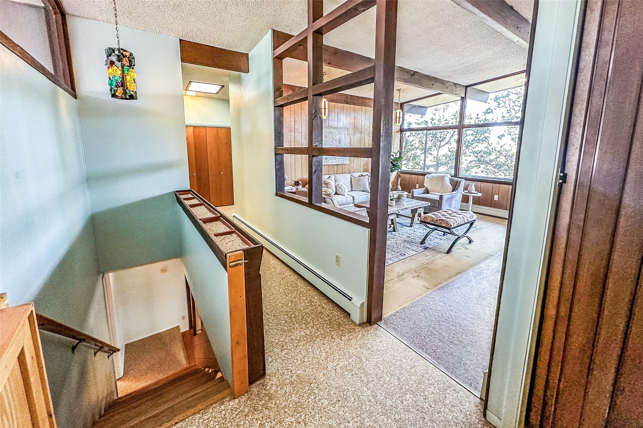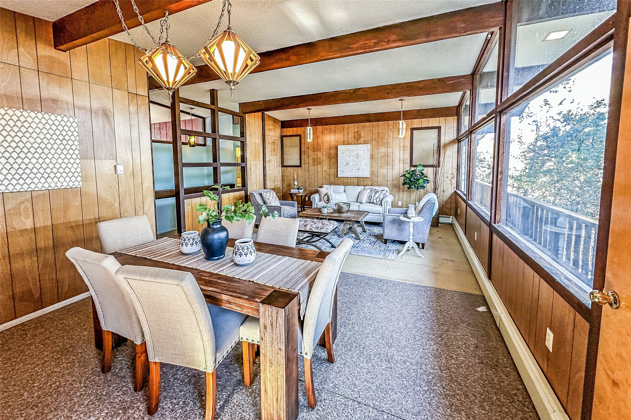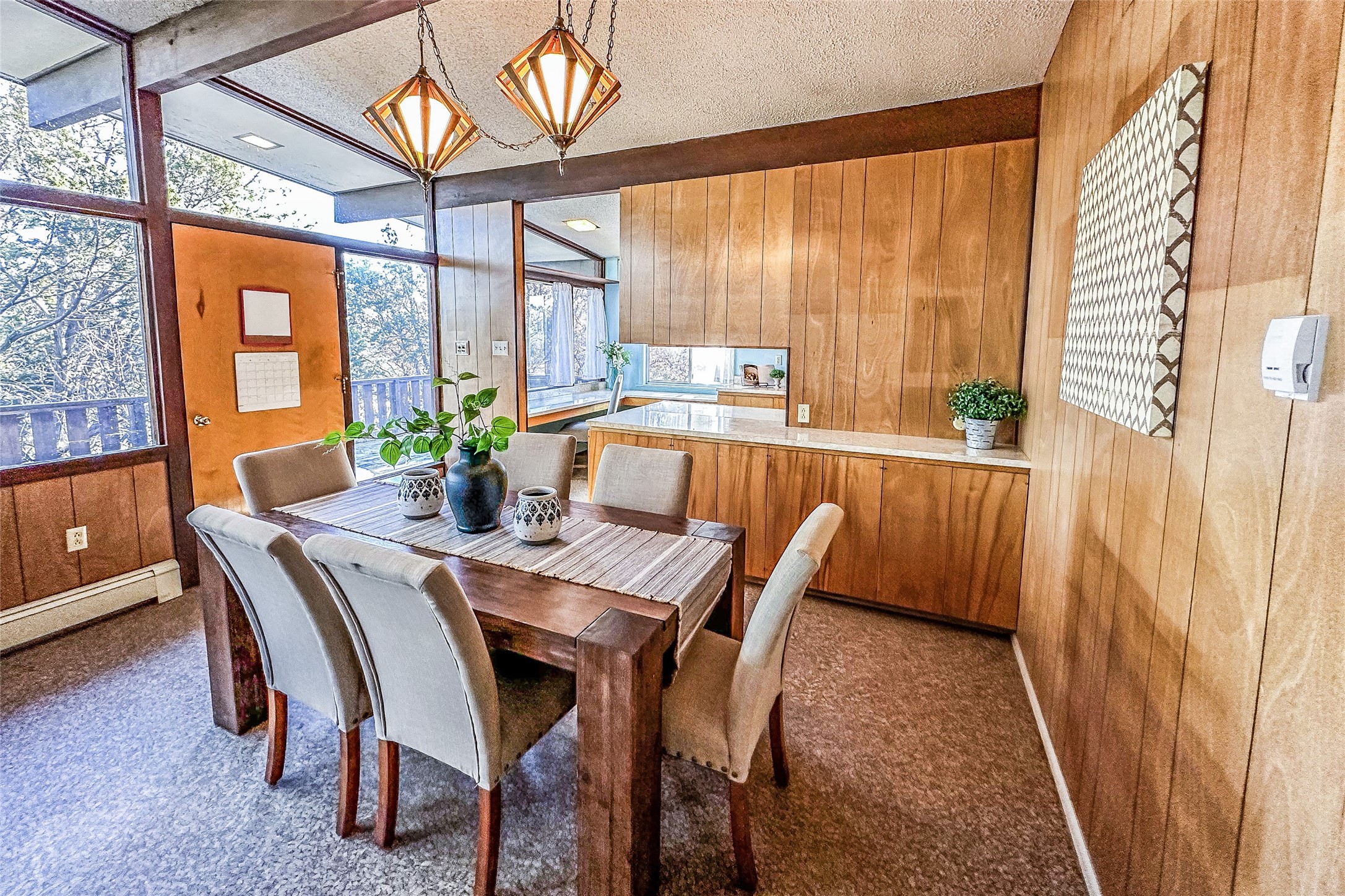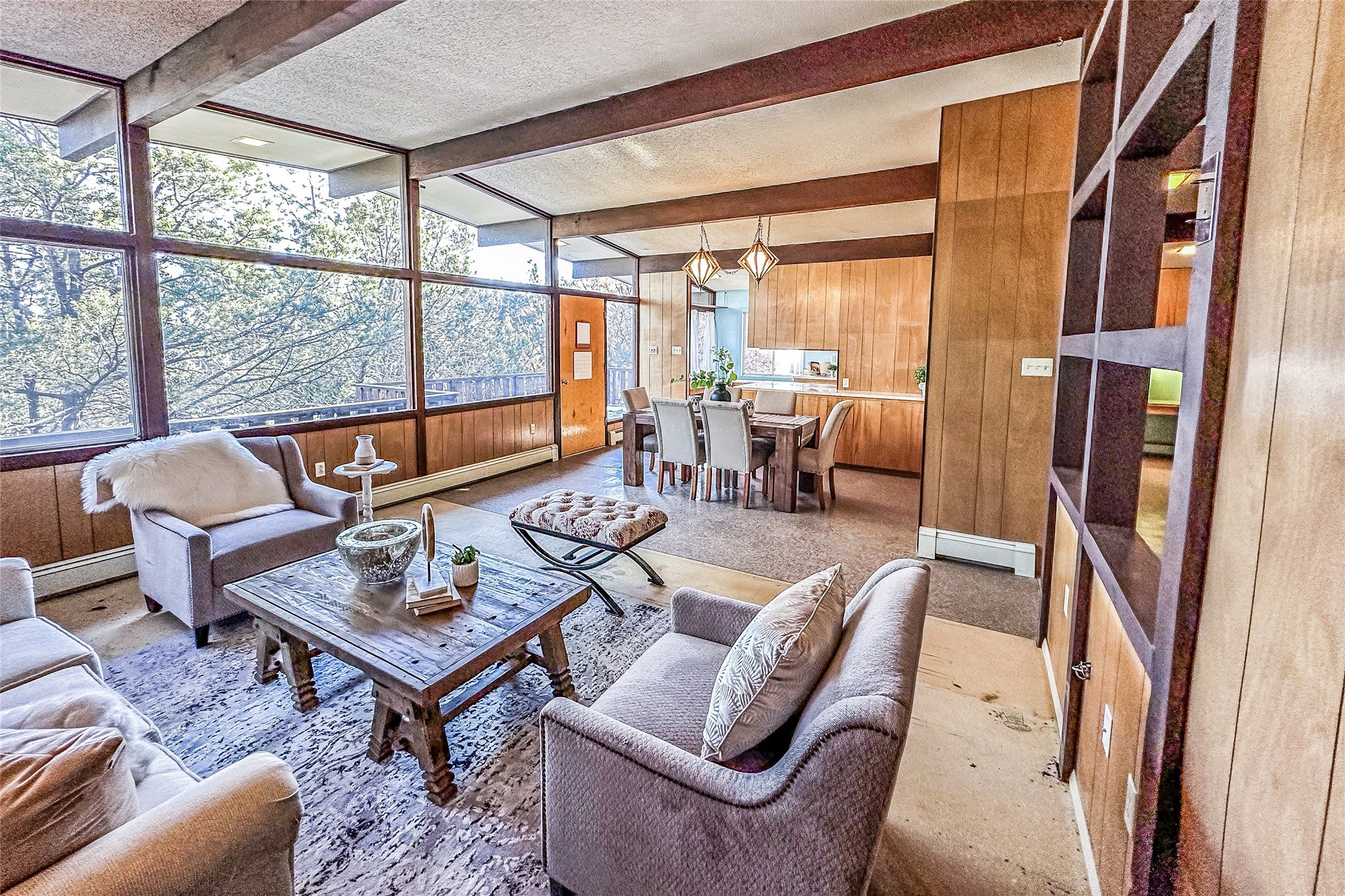 Experience the epitome of authentic Mid-Century Architecture on a sprawling .40-acre Canyon Lot in the coveted Barranca Mesa! This expansive 4-bedroom, 3-bathroom residence is nestled amidst a lush landscape adorned with mature pine trees, seamlessly blending with their natural surroundings. Upon entry, immerse yourself in the captivating mid-century ambiance of the spacious Living/Dining room, featuring large picture windows extending into the kitchen and flooding the space with an abundance of natural light. Throughout the main living area, revel in the charm of wood paneling and wood-beamed vaulted ceilings, transitioning seamlessly into a luminous kitchen featuring original wood cabinetry, a peninsula island, and versatile desk space. The main floor hosts a generous primary bedroom with dual closets and an en suite bathroom, an additional bedroom, and a separate full bathroom. Descend to the lower level to discover a vast, open-concept basement area enhanced by a charming brick fireplace, ideal for creating a secondary living room, an entertainment haven, or a sizable game room. Two additional guest bedrooms, another full bathroom, a spacious laundry room, and a sizeable workshop complete the lower level. Generous storage space is a hallmark throughout the entire home, garage, workshop, and pantry areas. Additionally, the living space extends to a patio and backyard area, offering ample room to envision your perfect outdoor entertaining oasis! Enjoy exceptional views overlooking the nearby canyon, with direct canyon and hiking access at the rear of the property. This residence is more than a home - it's a must-see authentic mid-century canvas awaiting your creative touches and vision to transform it into your own personal masterpiece! Seize the opportunity to explore this unique property today!