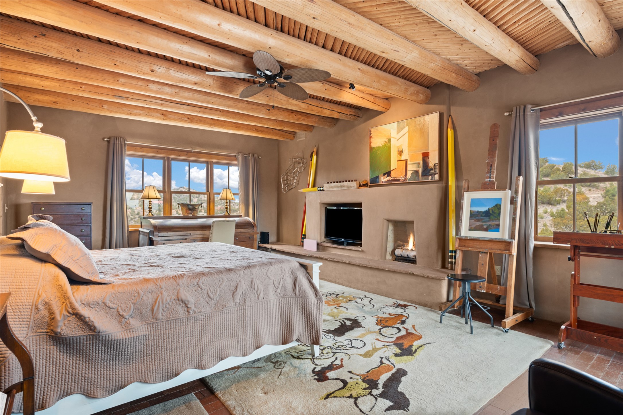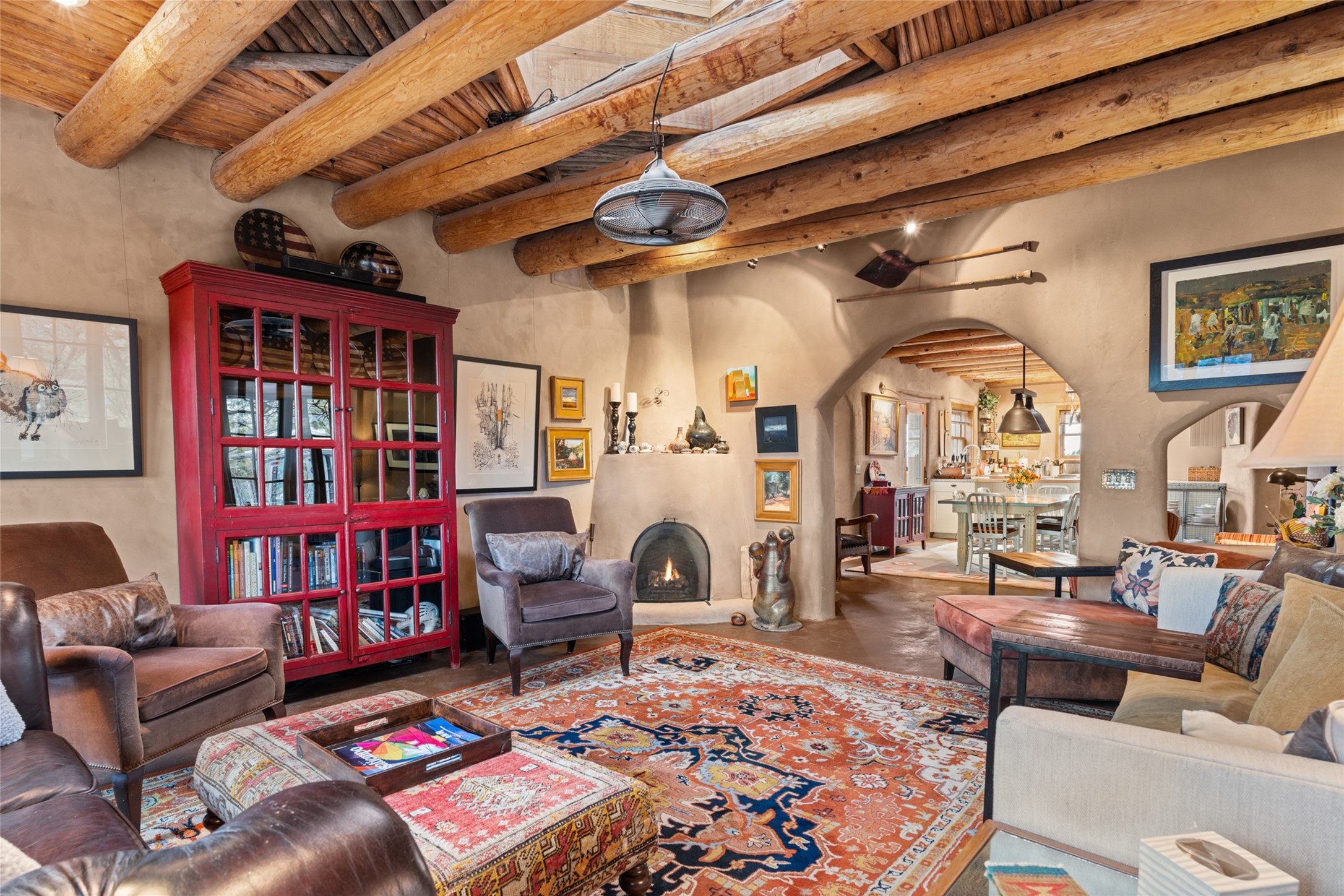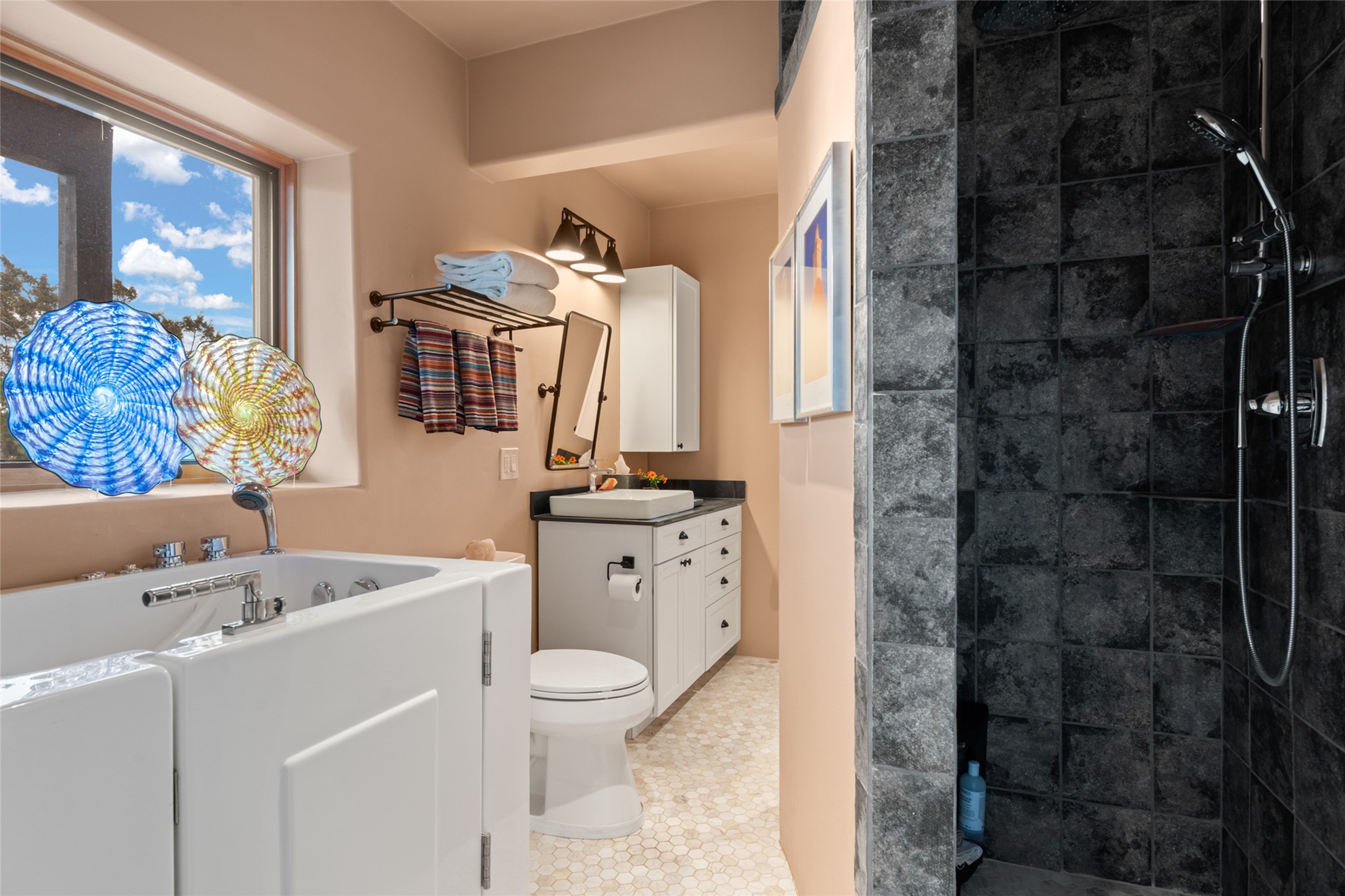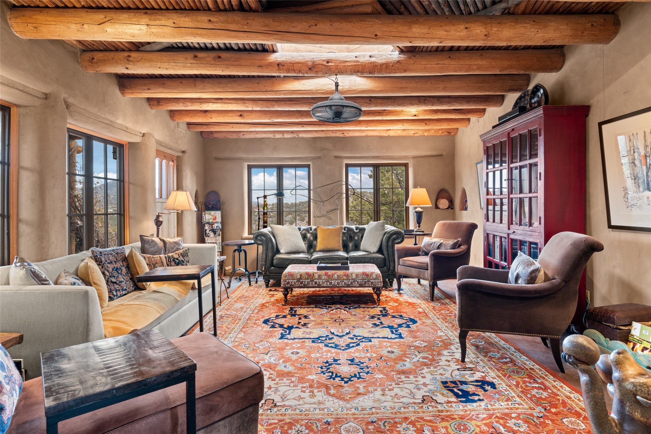 Welcome to your dream home located at 17 Sunlit Dr West. This charming and elegant adobe house, built in 1976, offers a quiet and peaceful environment. The house boasts old-world Santa Fe charm with vigas and latillas on the ceiling of every room. The efficient galley kitchen comes with a walk-in pantry, and the living room skylight is decorated with a beautiful star design in the latillas. The house features three bathrooms, all with unique Mexican Talavera tiles. The master bathroom is a luxurious retreat with dual sinks, a Jacuzzi tub, and a walk-in shower. Enjoy the warmth of two wood-burning fireplaces and a wood stove, along with a radiant heat system throughout the entire home. The spacious living room and dining area are perfect for family gatherings. This house has undergone several upgrades and improvements, including the addition of a giant deck with recycled plastic "Trex" type decking in 2009. The main waterline was replaced to 20" deep in 2010, and the boilers in the house and casita were replaced with on-demand water heaters for radiant heating in 2010. The roof and stucco of the main house were updated in 2014, and the northeast sitting area of the house was relandscaped with flagstone and a drip system in 2016. The casita underwent a complete remodel in 2023, including a new roof, stucco, screened porch, drip system, fenced pollinator garden, and a Tuff Shed was installed in 2023. Don't miss this opportunity to own your dream home with all the features and upgrades you could ever want. Make this house your forever home, and enjoy the peace and tranquility that it has to offer.