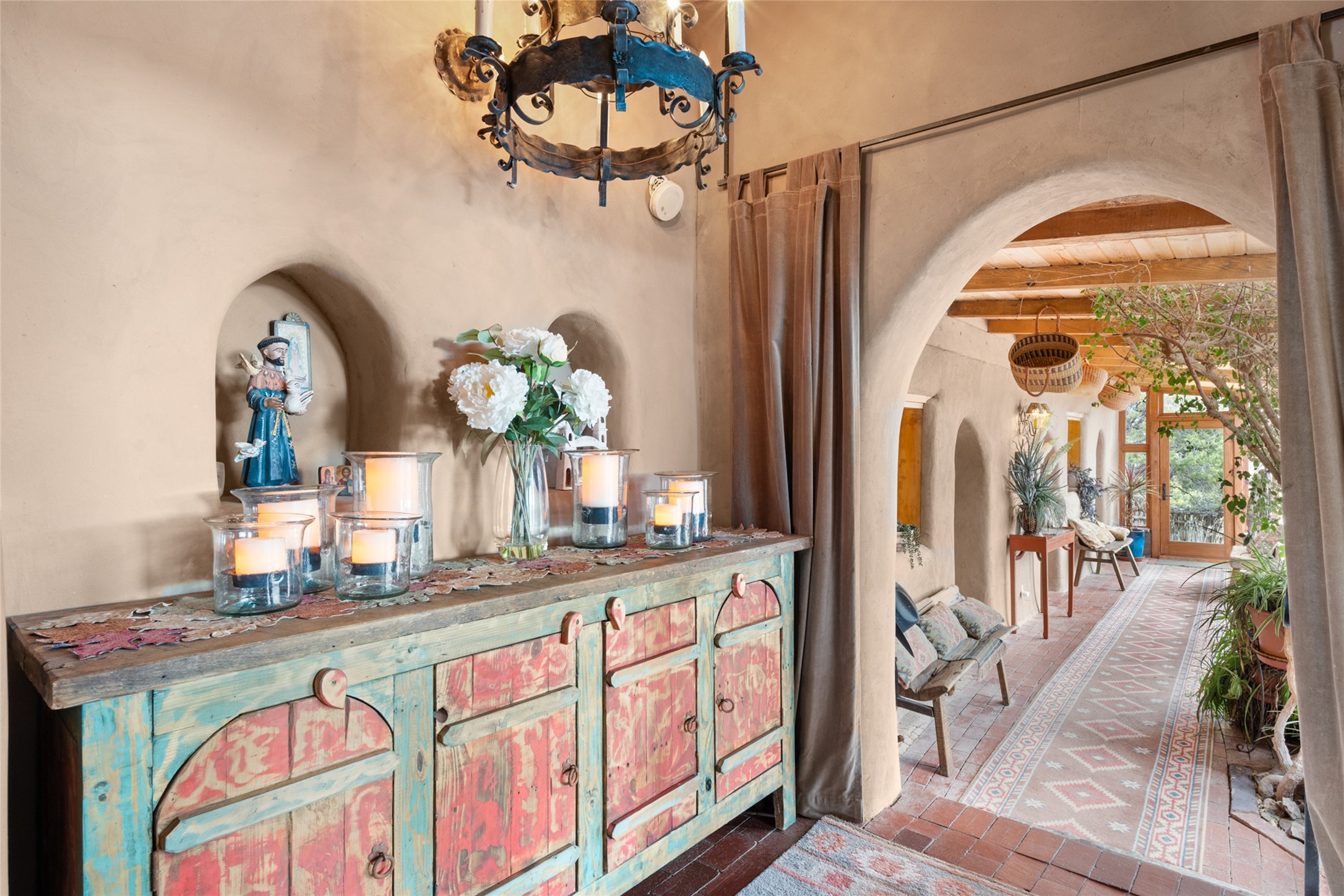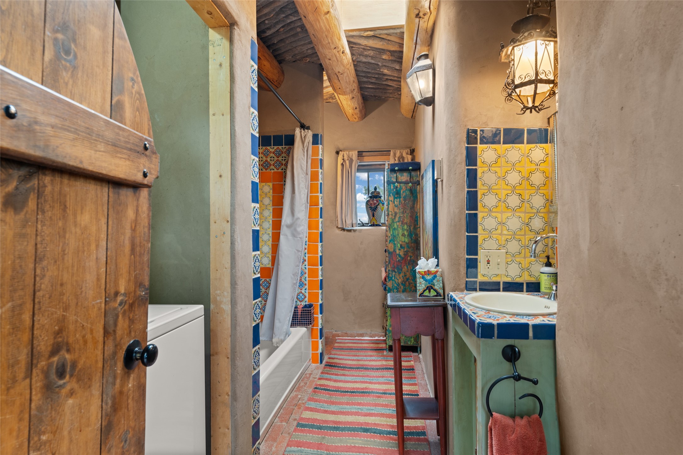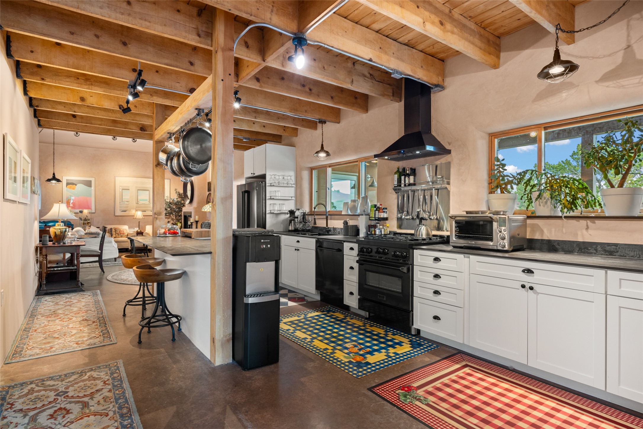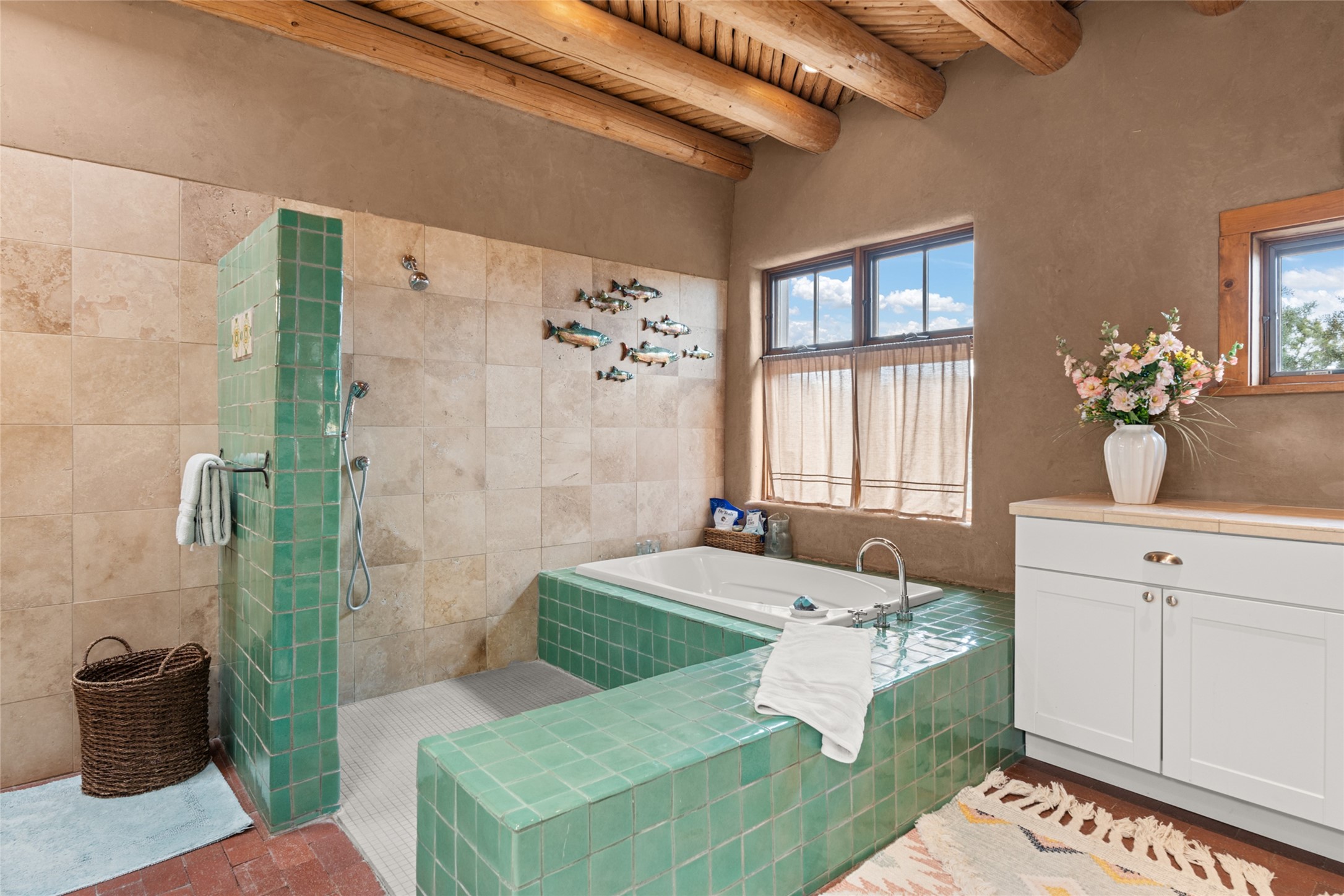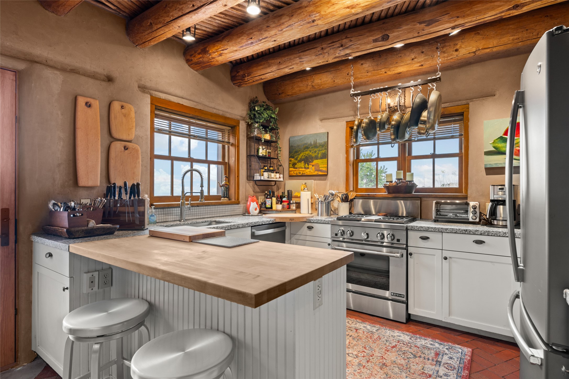 Welcome to your dream home located at 17 Sunlit Dr West. This charming and elegant adobe house, built in 1976, offers a quiet and peaceful environment. The house boasts old-world Santa Fe charm with vigas and latillas on the ceiling of every room. The efficient galley kitchen comes with a walk-in pantry, and the living room skylight is decorated with a beautiful star design in the latillas. The house features three bathrooms, all with unique Mexican Talavera tiles. The master bathroom is a luxurious retreat with dual sinks, a Jacuzzi tub, and a walk-in shower. Enjoy the warmth of two wood-burning fireplaces and a wood stove, along with a radiant heat system throughout the entire home. The spacious living room and dining area are perfect for family gatherings. This house has undergone several upgrades and improvements, including the addition of a giant deck with recycled plastic "Trex" type decking in 2009. The main waterline was replaced to 20" deep in 2010, and the boilers in the house and casita were replaced with on-demand water heaters for radiant heating in 2010. The roof and stucco of the main house were updated in 2014, and the northeast sitting area of the house was relandscaped with flagstone and a drip system in 2016. The casita underwent a complete remodel in 2023, including a new roof, stucco, screened porch, drip system, fenced pollinator garden, and a Tuff Shed was installed in 2023. Don't miss this opportunity to own your dream home with all the features and upgrades you could ever want. Make this house your forever home, and enjoy the peace and tranquility that it has to offer.