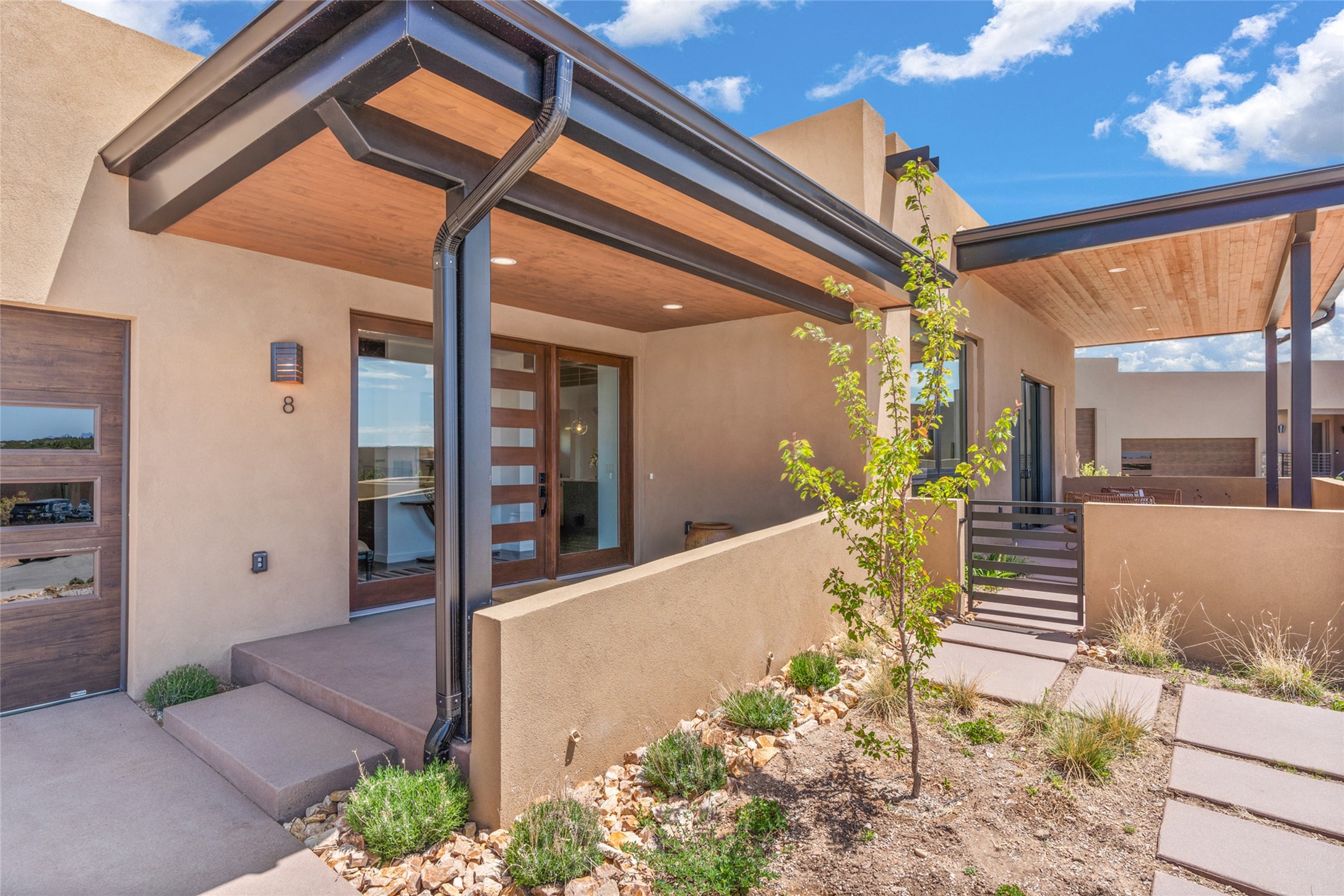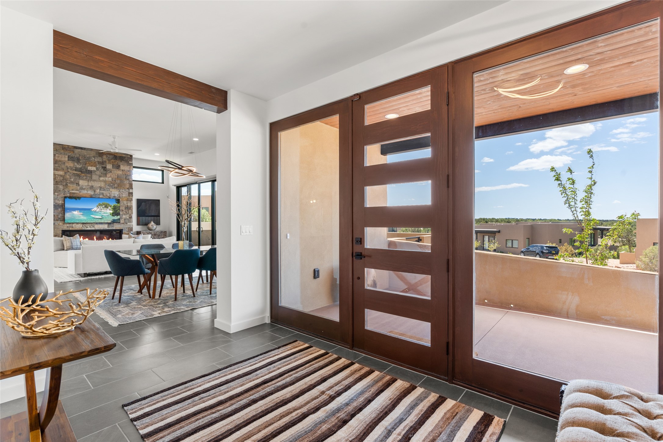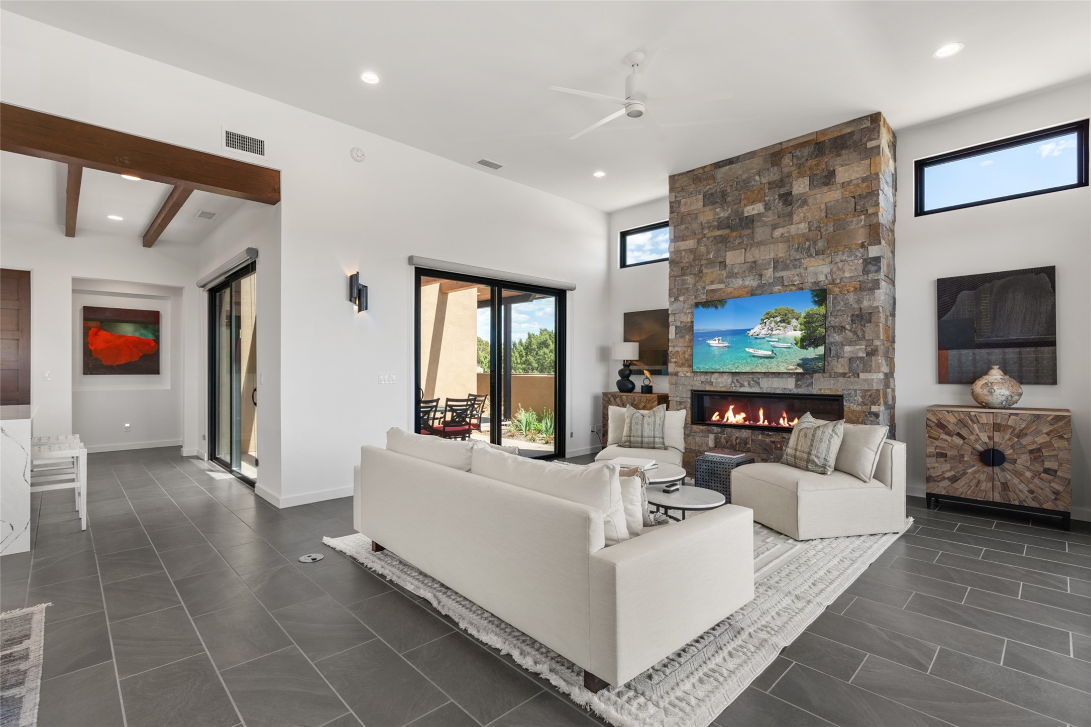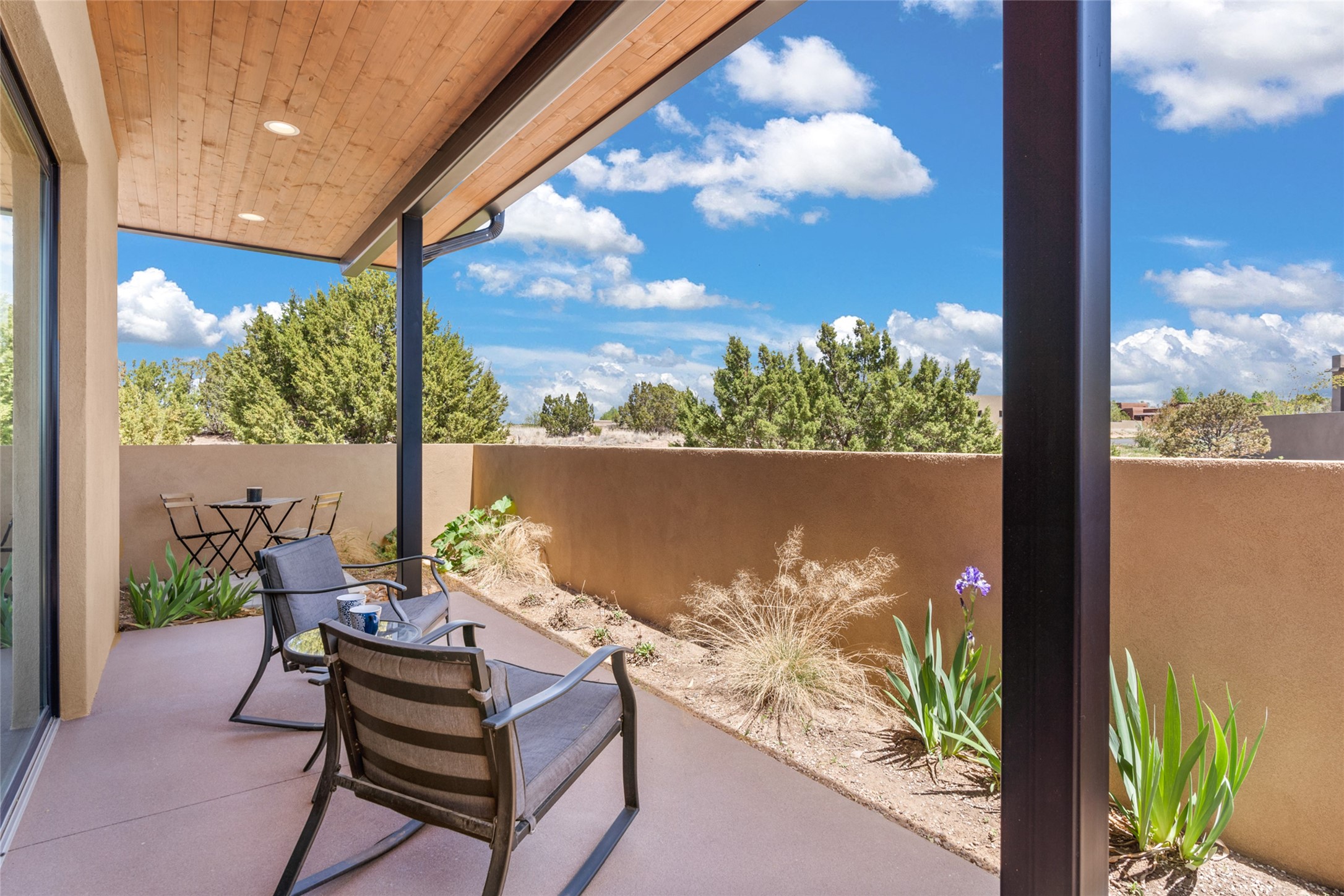 Welcome to a sanctuary of easy elegance sited on the high side of a cul-de-sac in the Valverde community of Las Campanas. This recently constructed haven evokes a sense of airy serenity and spaciousness, complete with modern upgrades for day-to-day convenience. Accented by large windows and a gas fireplace with stone surround, this single-level, open concept floor plan invites gatherings large and small and features adjacent patios for an easy flow between interior and exterior spaces. The stylish kitchen is a chef's delight, with a central island, Viking stainless steel appliances, quartz countertops and ample pantry. The award winning owner's suite is an oasis with its private portal, spa-like bathroom with curbless shower, freestanding tub, dual vanity and capacious walk-in closet which connects to the laundry room. Beyond the main living area is a separate wing offering a large guest suite and a flex-room which can be used as an office, den, or third bedroom. The oversized garage completes the package in this sustainable, low-maintenance, thoughtfully designed home built by the award-winning Arete Homes of Santa Fe.