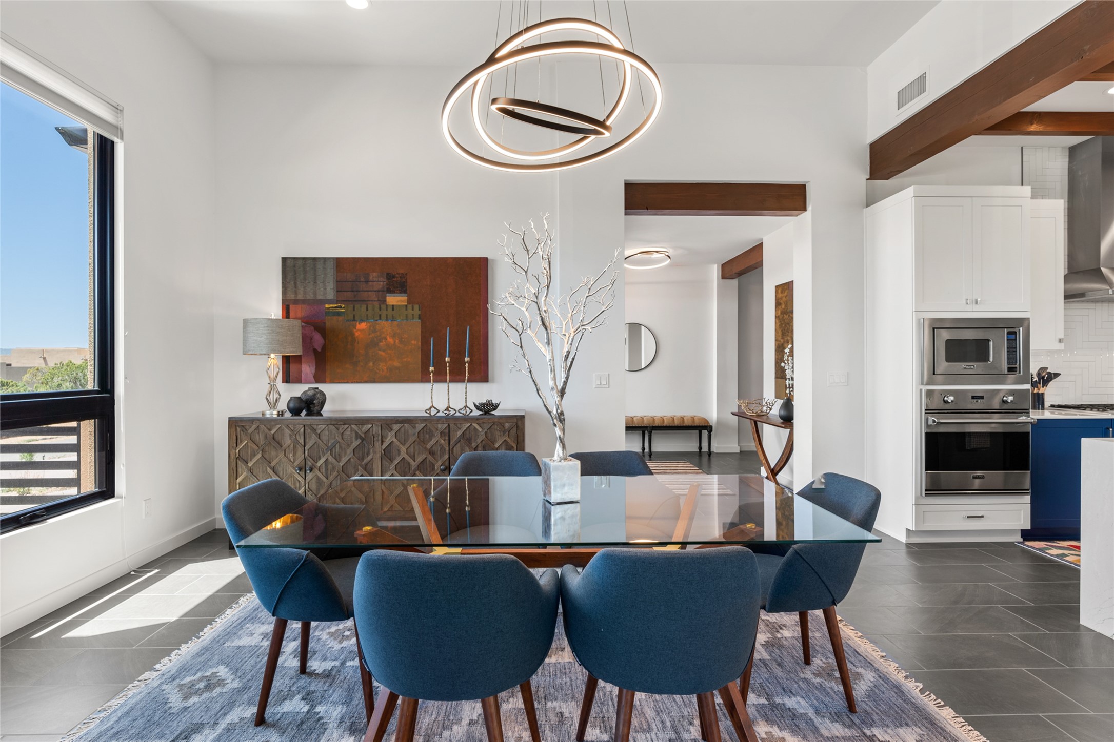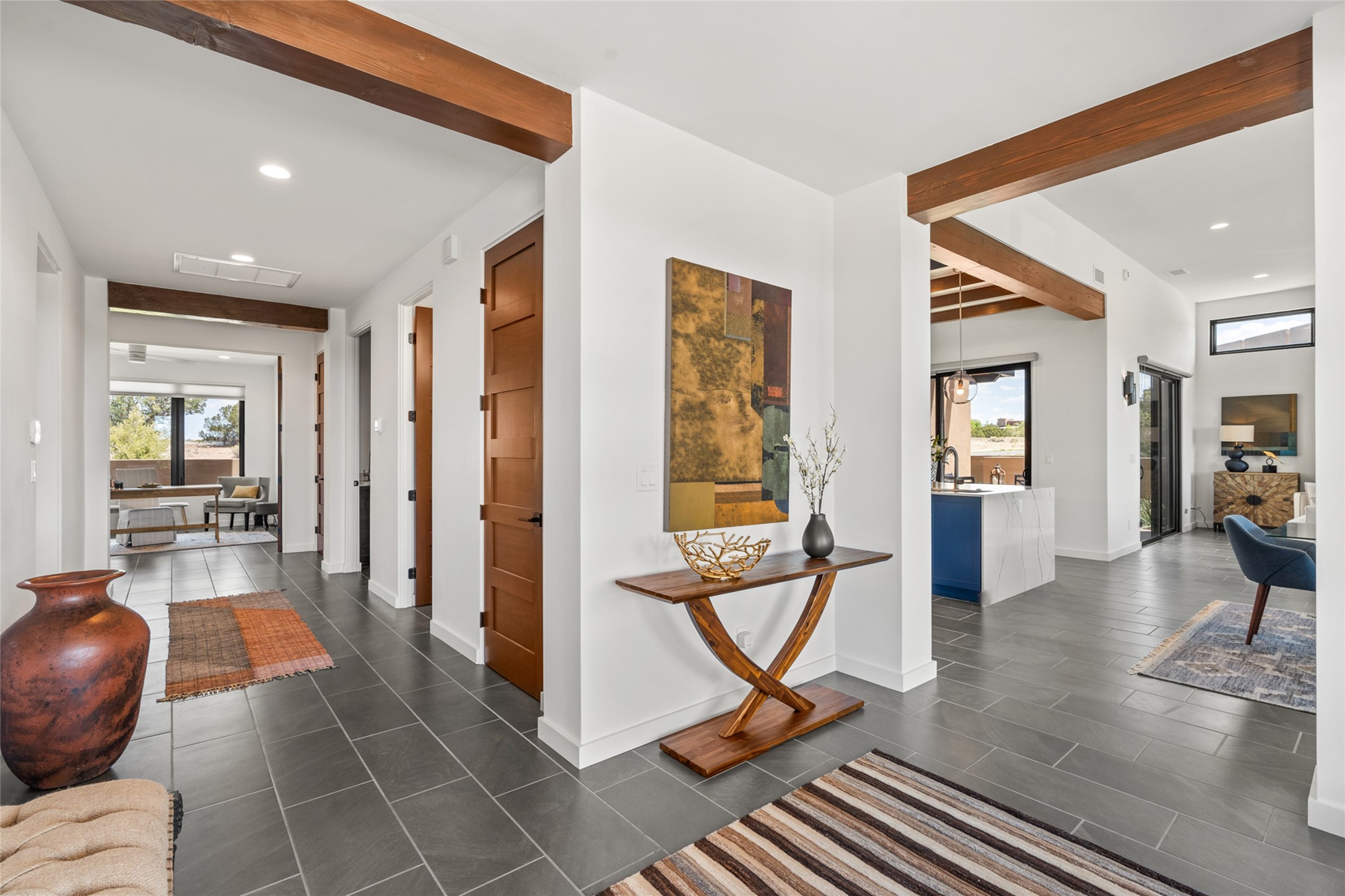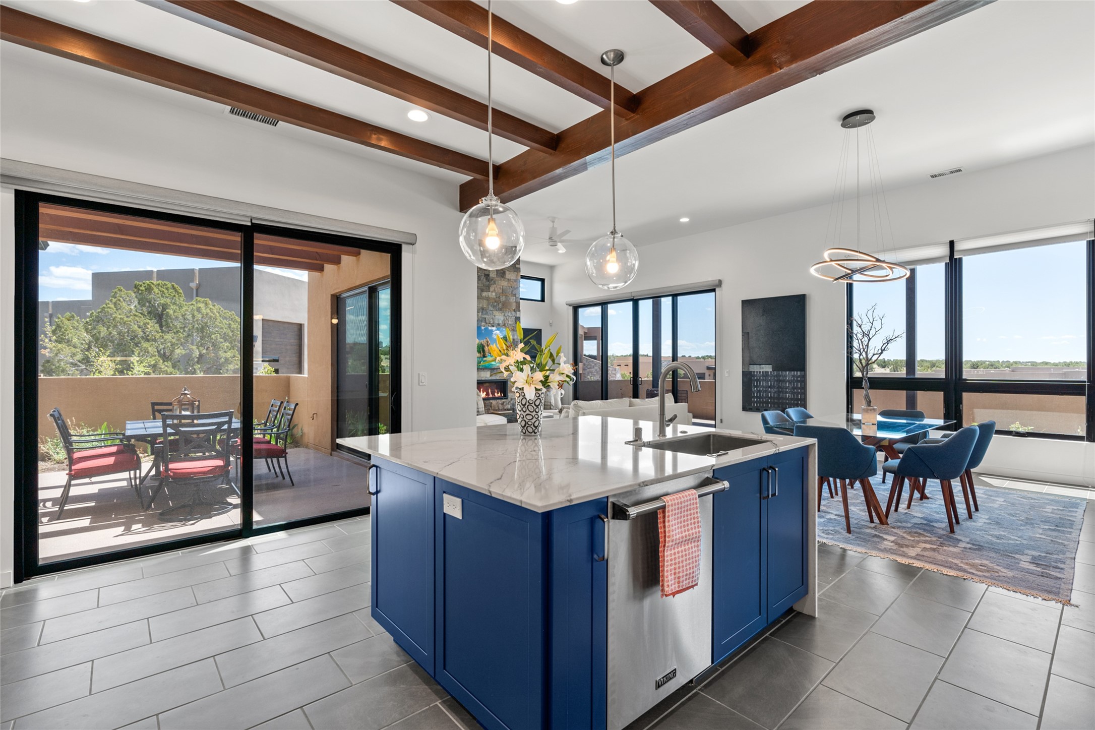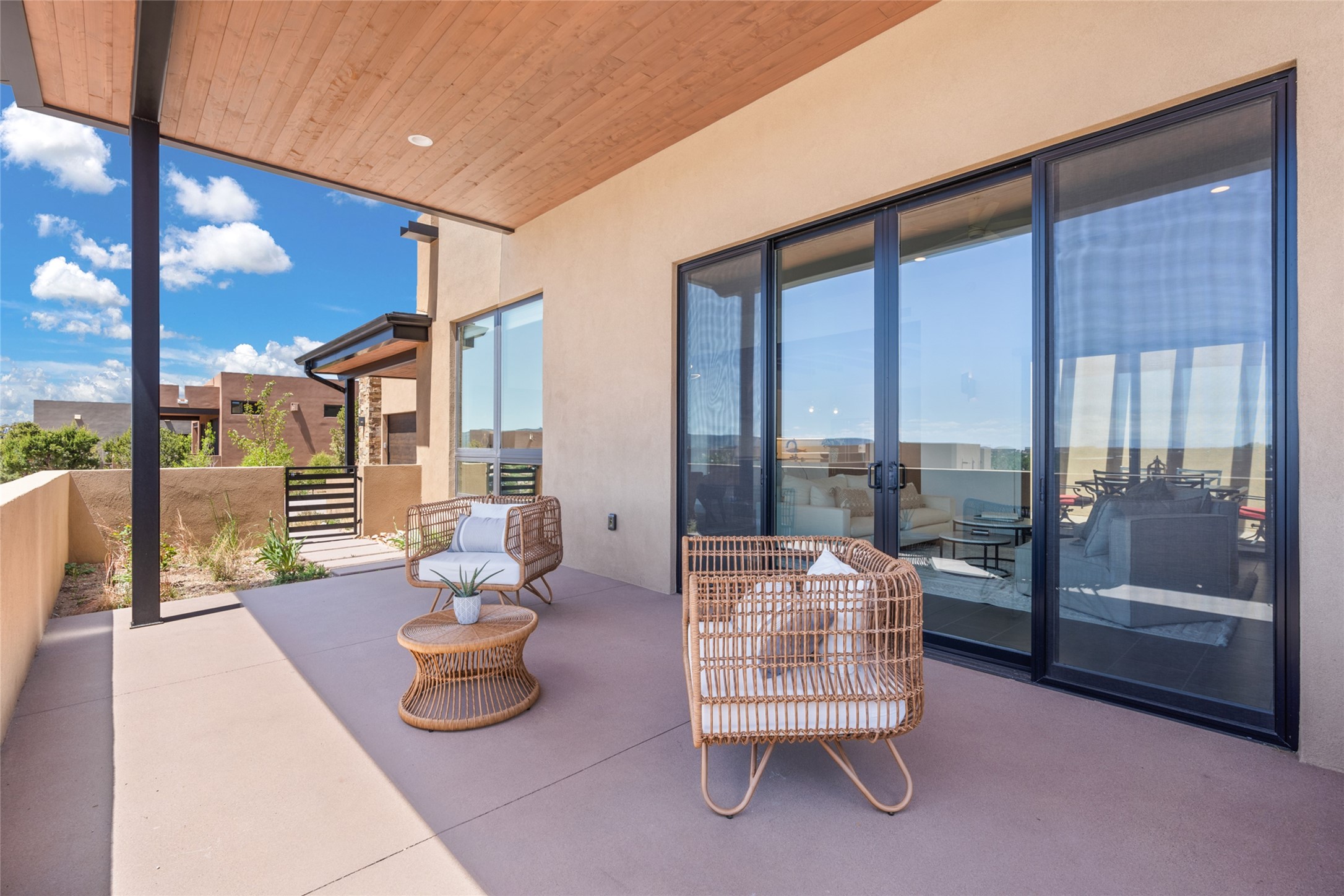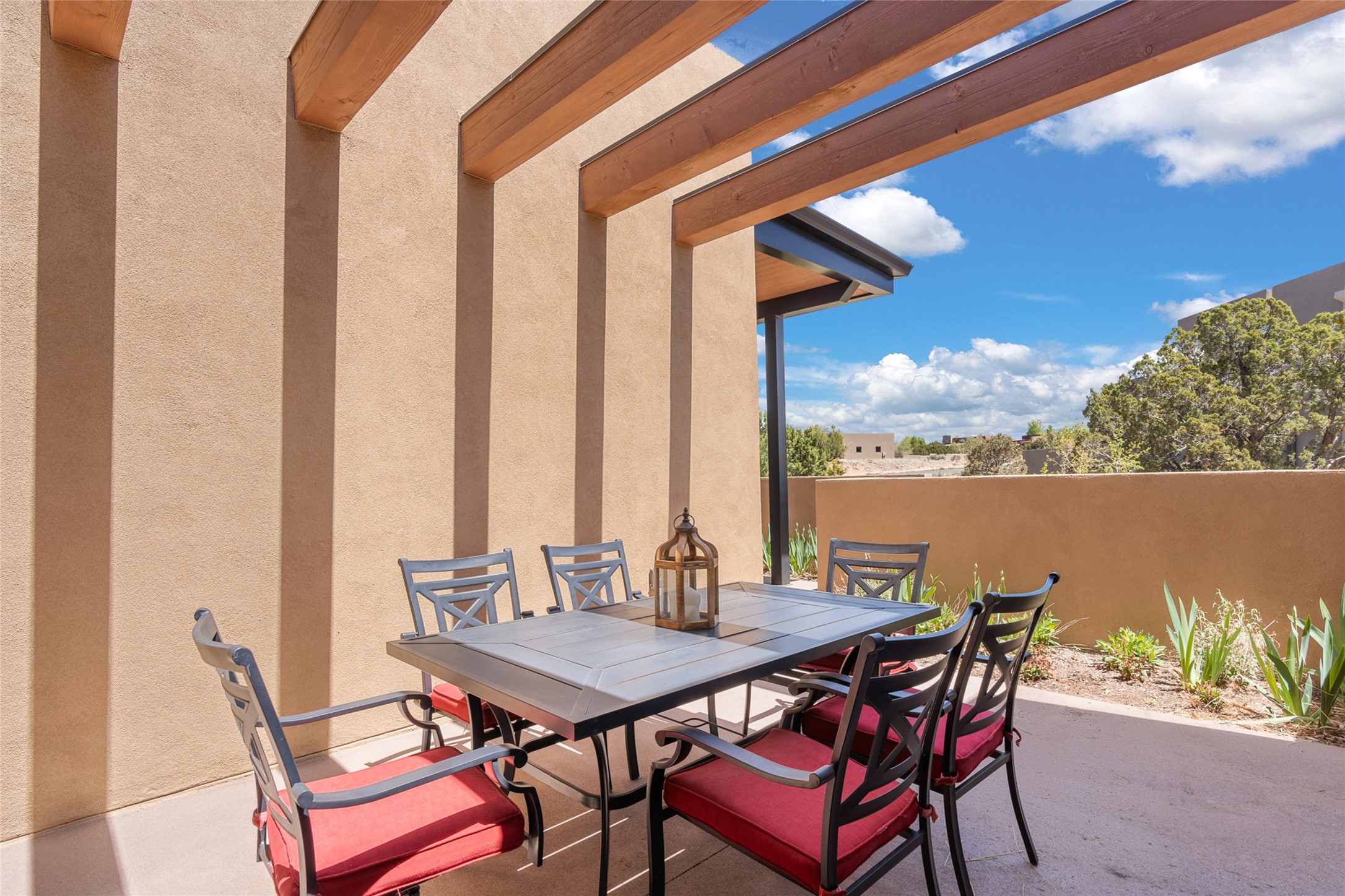 Welcome to a sanctuary of easy elegance sited on the high side of a cul-de-sac in the Valverde community of Las Campanas. This recently constructed haven evokes a sense of airy serenity and spaciousness, complete with modern upgrades for day-to-day convenience. Accented by large windows and a gas fireplace with stone surround, this single-level, open concept floor plan invites gatherings large and small and features adjacent patios for an easy flow between interior and exterior spaces. The stylish kitchen is a chef's delight, with a central island, Viking stainless steel appliances, quartz countertops and ample pantry. The award winning owner's suite is an oasis with its private portal, spa-like bathroom with curbless shower, freestanding tub, dual vanity and capacious walk-in closet which connects to the laundry room. Beyond the main living area is a separate wing offering a large guest suite and a flex-room which can be used as an office, den, or third bedroom. The oversized garage completes the package in this sustainable, low-maintenance, thoughtfully designed home built by the award-winning Arete Homes of Santa Fe.