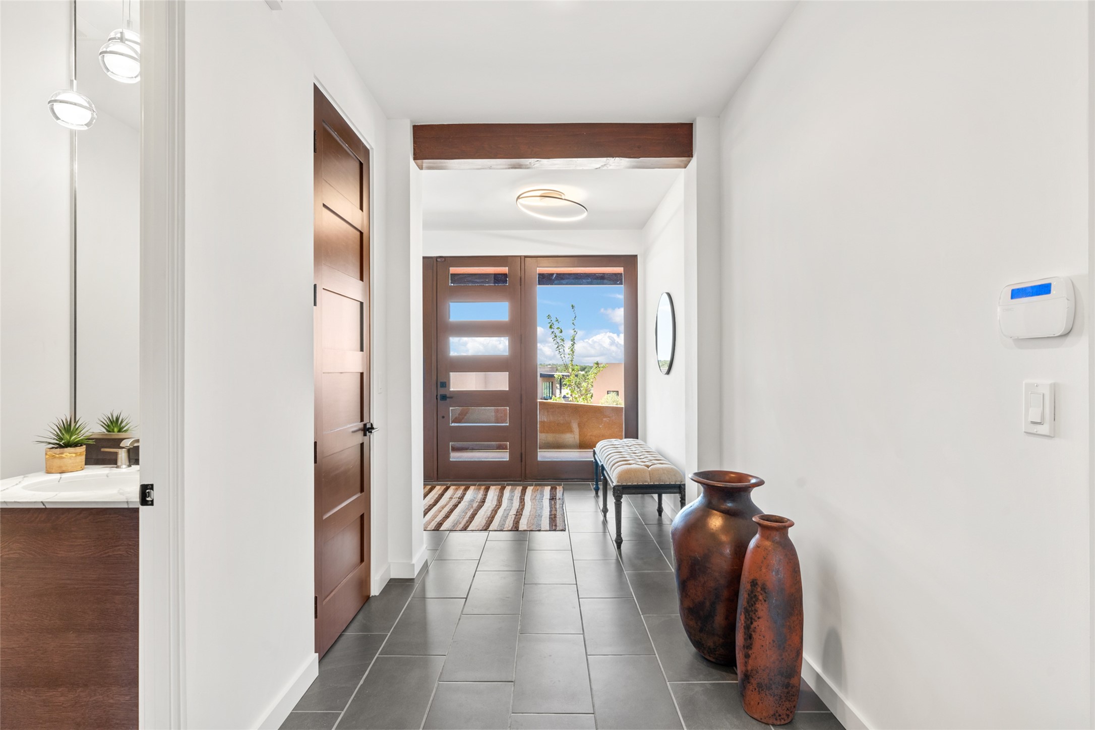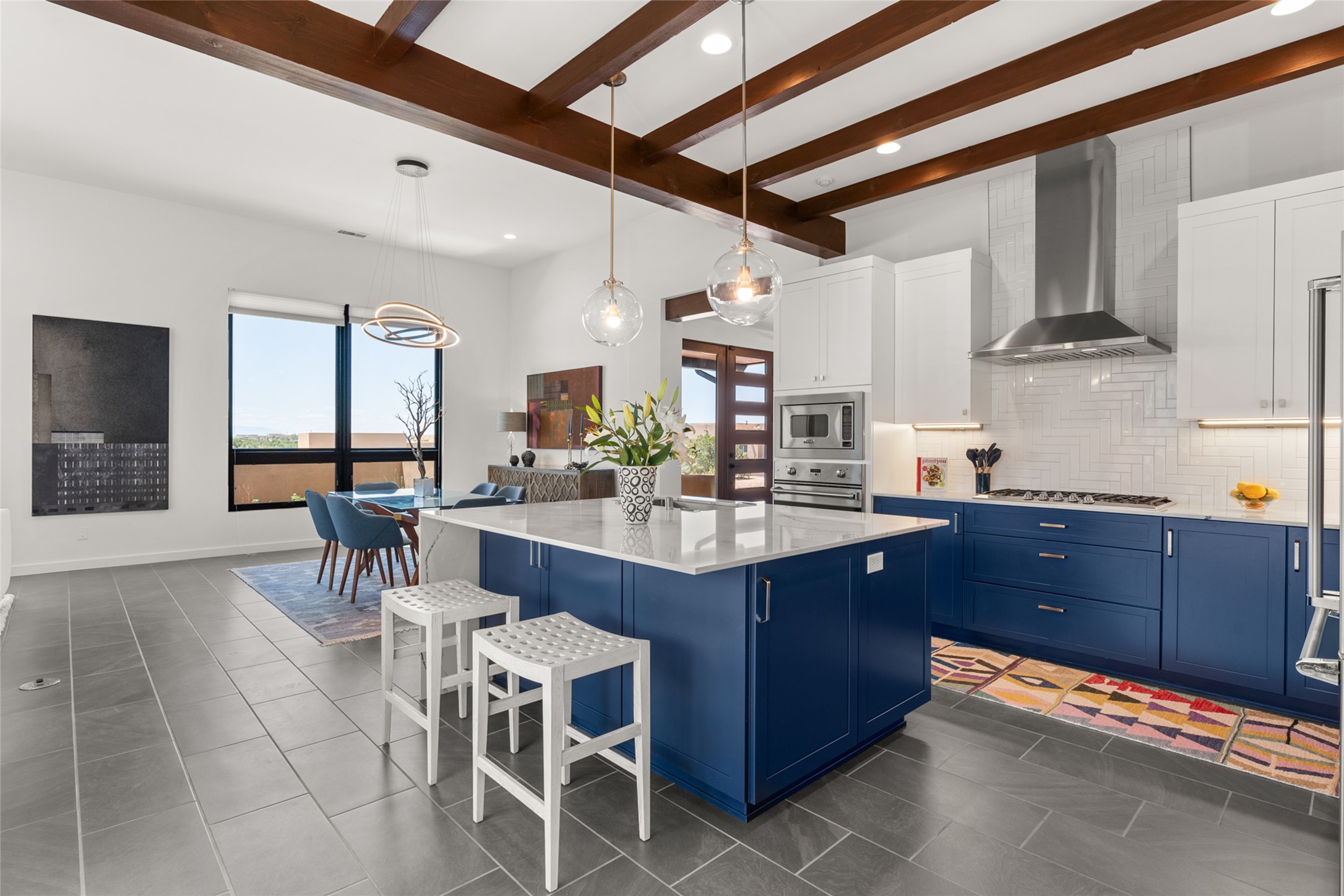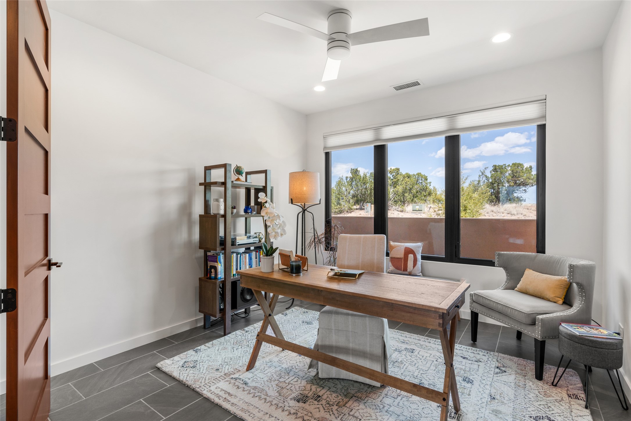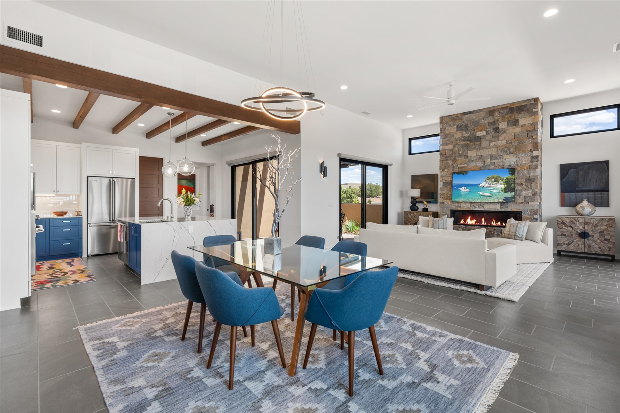 Welcome to a sanctuary of easy elegance sited on the high side of a cul-de-sac in the Valverde community of Las Campanas. This recently constructed haven evokes a sense of airy serenity and spaciousness, complete with modern upgrades for day-to-day convenience. Accented by large windows and a gas fireplace with stone surround, this single-level, open concept floor plan invites gatherings large and small and features adjacent patios for an easy flow between interior and exterior spaces. The stylish kitchen is a chef's delight, with a central island, Viking stainless steel appliances, quartz countertops and ample pantry. The award winning owner's suite is an oasis with its private portal, spa-like bathroom with curbless shower, freestanding tub, dual vanity and capacious walk-in closet which connects to the laundry room. Beyond the main living area is a separate wing offering a large guest suite and a flex-room which can be used as an office, den, or third bedroom. The oversized garage completes the package in this sustainable, low-maintenance, thoughtfully designed home built by the award-winning Arete Homes of Santa Fe.