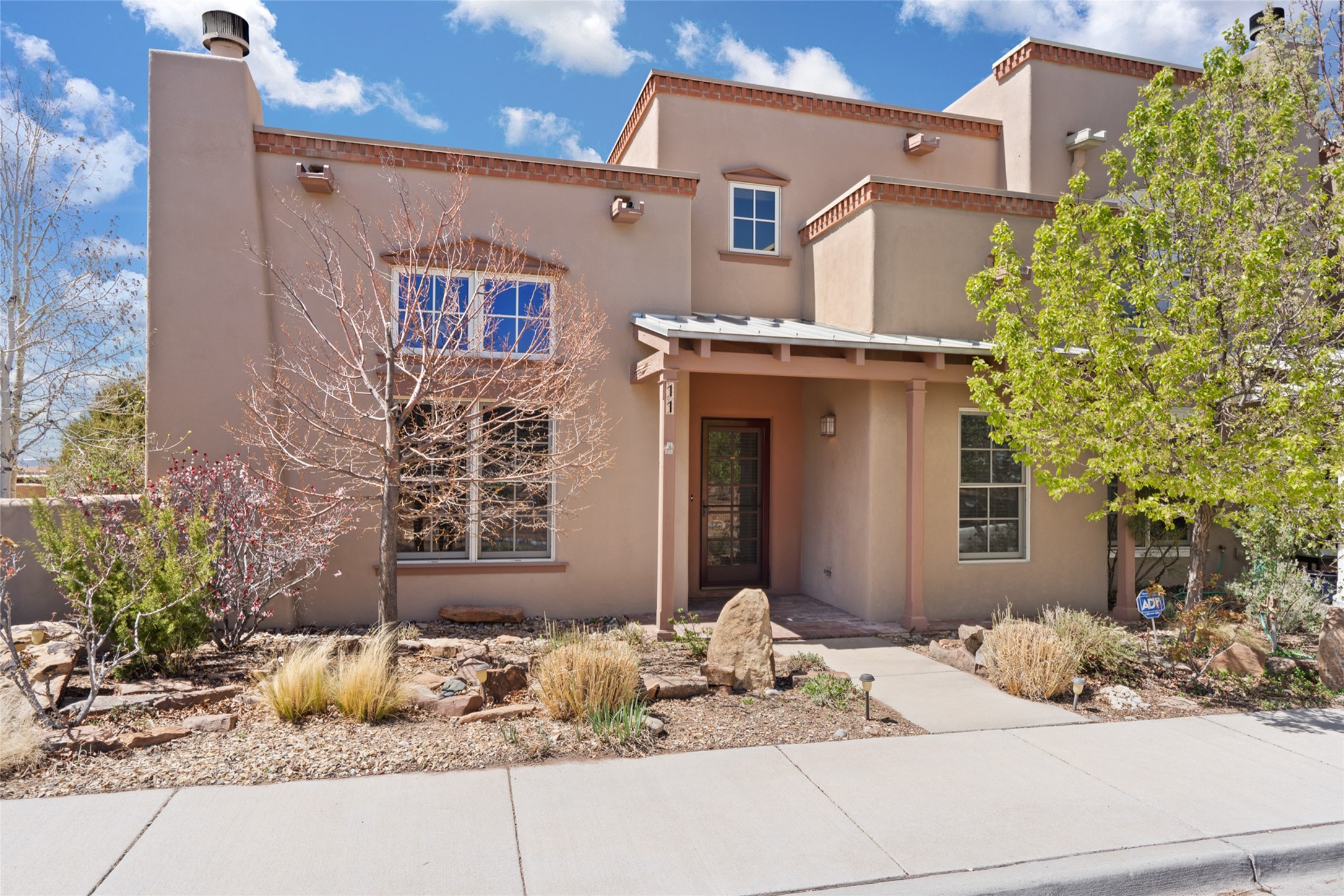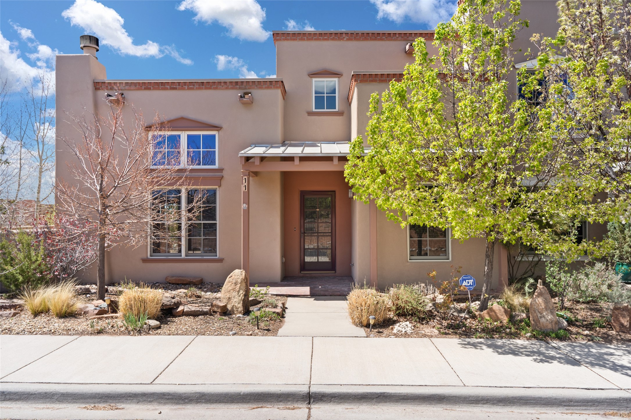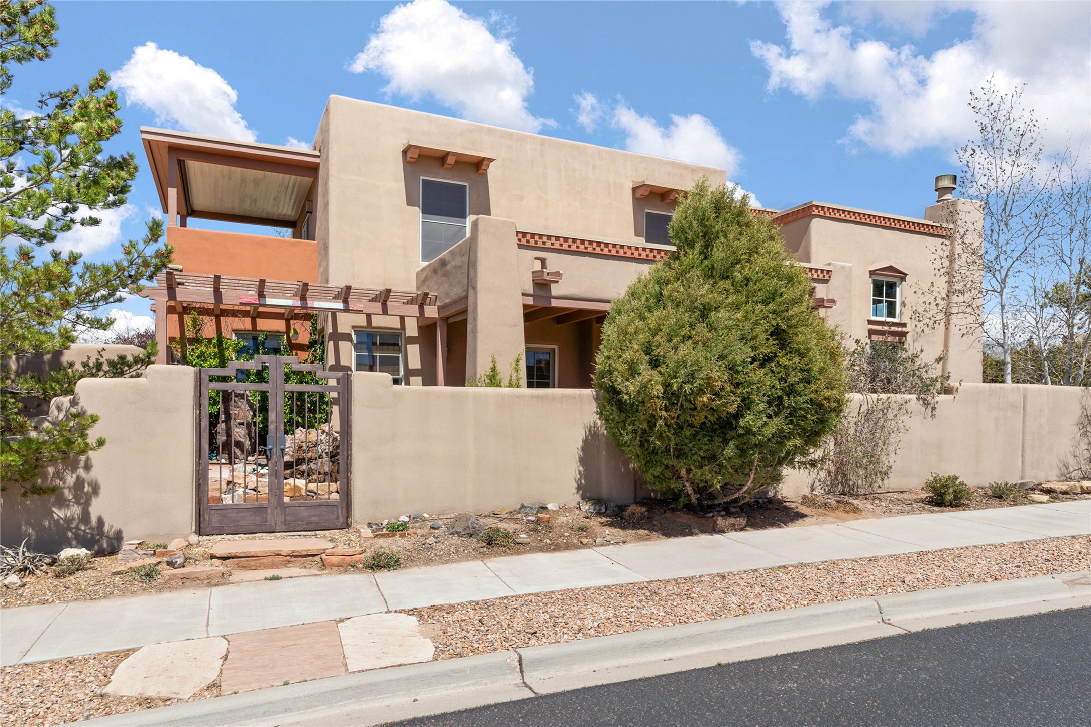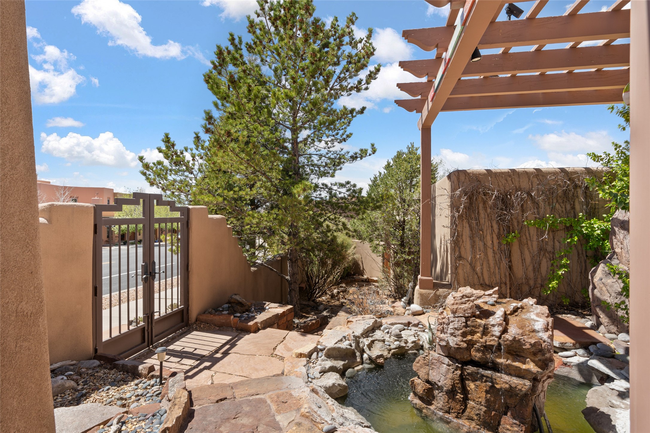Are you looking for the ideal second home or retire in Santa Fe? If so, look at this 3-bedroom, 3-bath home in Aldea, just minutes from the Santa Fe Plaza and close to the Santa Fe Opera. This beautiful Bruce Thompson home was featured on HGTV, Dreaming in the Desert, Season 22, Episode 11. This home is lovely for entertaining with an open Living, Dining, and Kitchen floor plan. Gorgeous, easy-care yard with a year-round waterfall pond next to a large outdoor covered portal to enjoy your dinner with friends or the day. The beautiful primary suite upstairs has a sitting/office area, an ensuite bathroom with a walk-in shower, a custom walk-in closet, and a covered Veranda to view the Jemez Mountain range and the sunsets. A guest room and full bath are adjacent. The third guest bedroom/office is on the main level with a 3/4 bathroom. A double-car garage is spacious, with storage and a workbench. The recent upgrades are mini-splits for air conditioning/heat, a tankless water heater, and a Bosh refrigerator. The Aldea neighborhood features trails for walking, running, and pickleball courts.