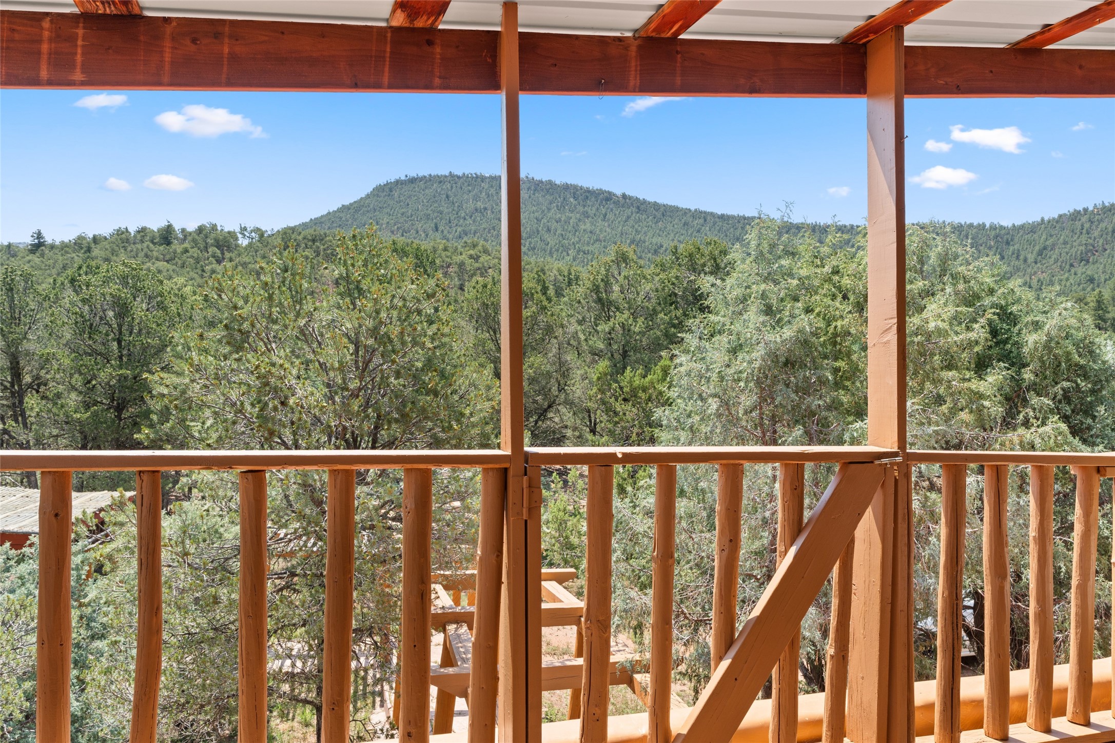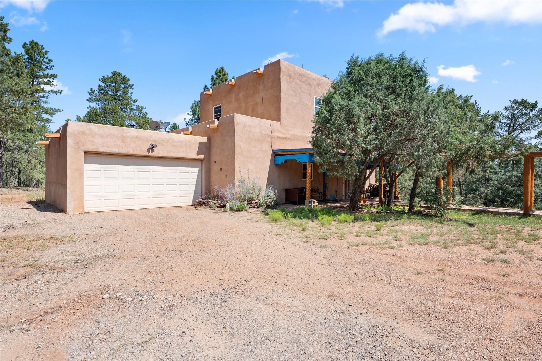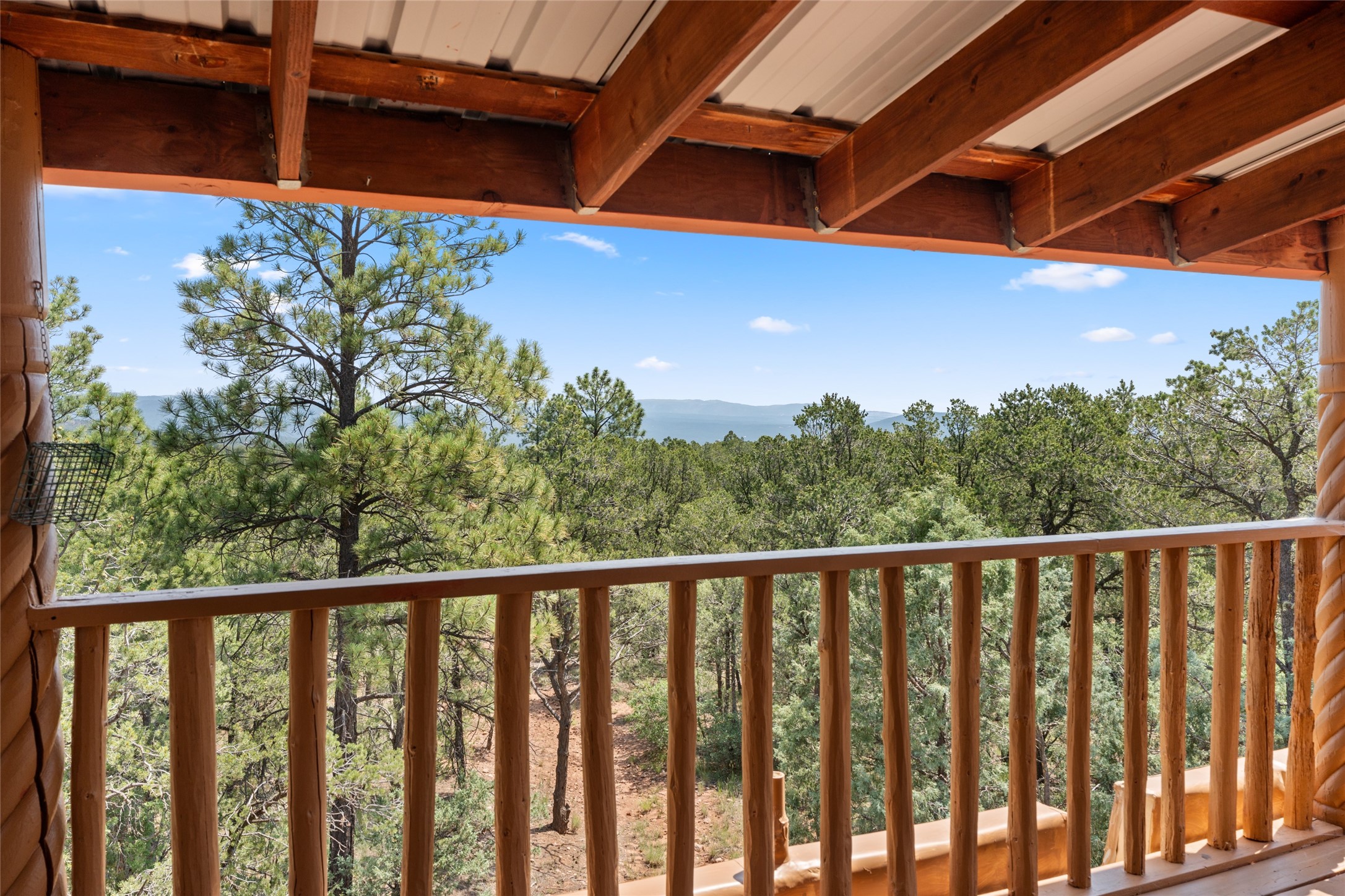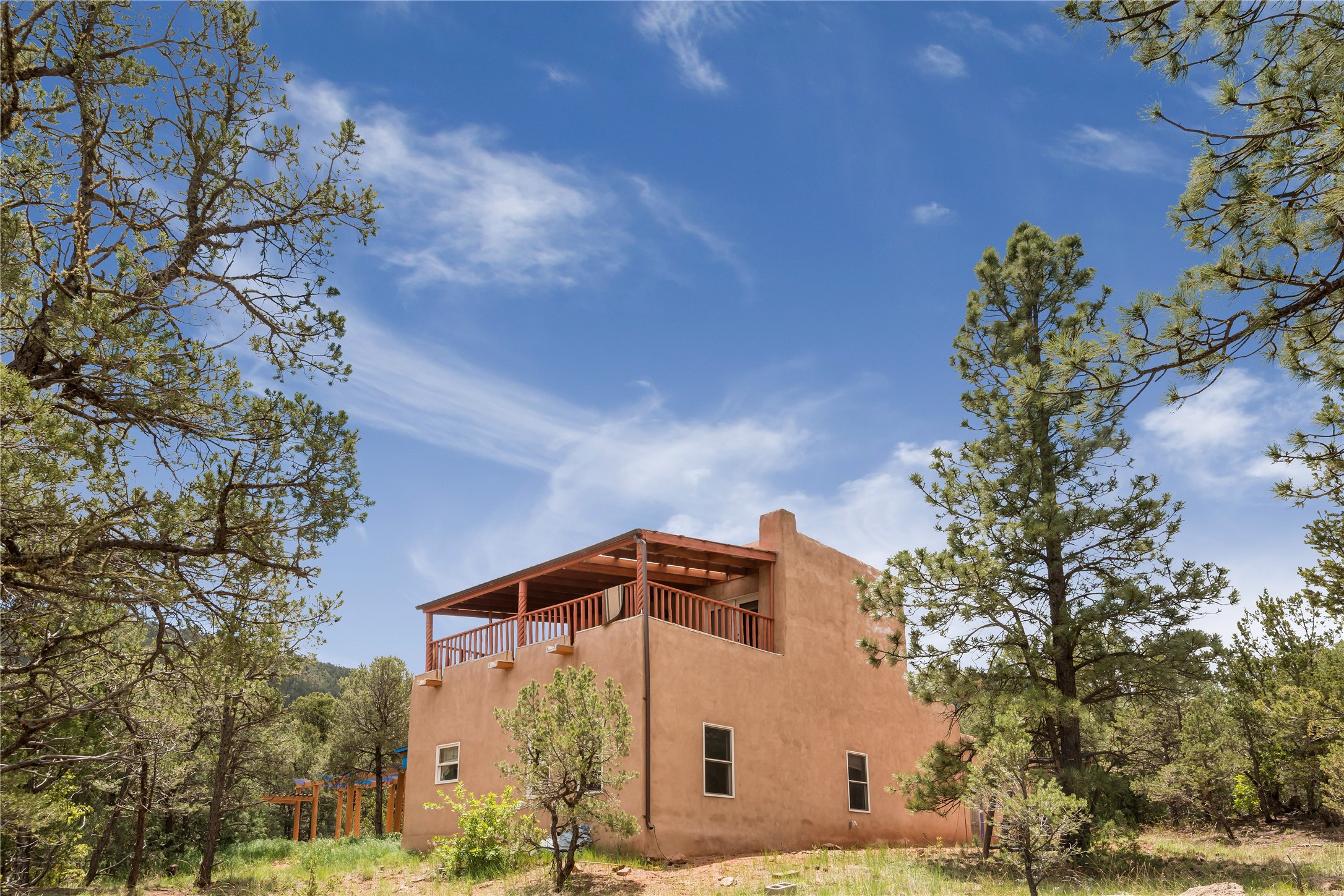 Combining the best of nature and comfort while providing ample space and privacy. This remarkable 2 bedroom and 2 bathroom home on 14.374 beautiful acres of serene wooded land can be your personal oasis away from the city. At the same time, it is a short drive to Santa Fe and the endearing small town of Pecos which is proximal to the gorgeous Pecos River with trout fishing. With no HOA or CCR's, this expansive land offers endless possibilities! Traditional features of this home include: wood beamed ceilings, a cozy wood-burning kiva fireplace, a private well, beautiful brick floors throughout, radiant heating, attached 2 car garage, an updated roof (roof was redone and has a transferrable 10 year warranty), a storage shed, and is gated for added privacy. Additionally, this gem of a home includes a residential kitchen with stainless steel appliances and a separate spacious commercial kitchen ideal for culinary enthusiasts! On the first level you have a lovely bedroom, bathroom, office and two kitchens (one residential and one commercial). On the second level, the largest bedroom/bathroom was thoughtfully placed to enjoy the breath taking New Mexico sunrise. Moreover, the upstairs deck provides stunning views of the surrounding mountains, perfect for entertaining or relaxing under the stars. Come see this wonderful property today!