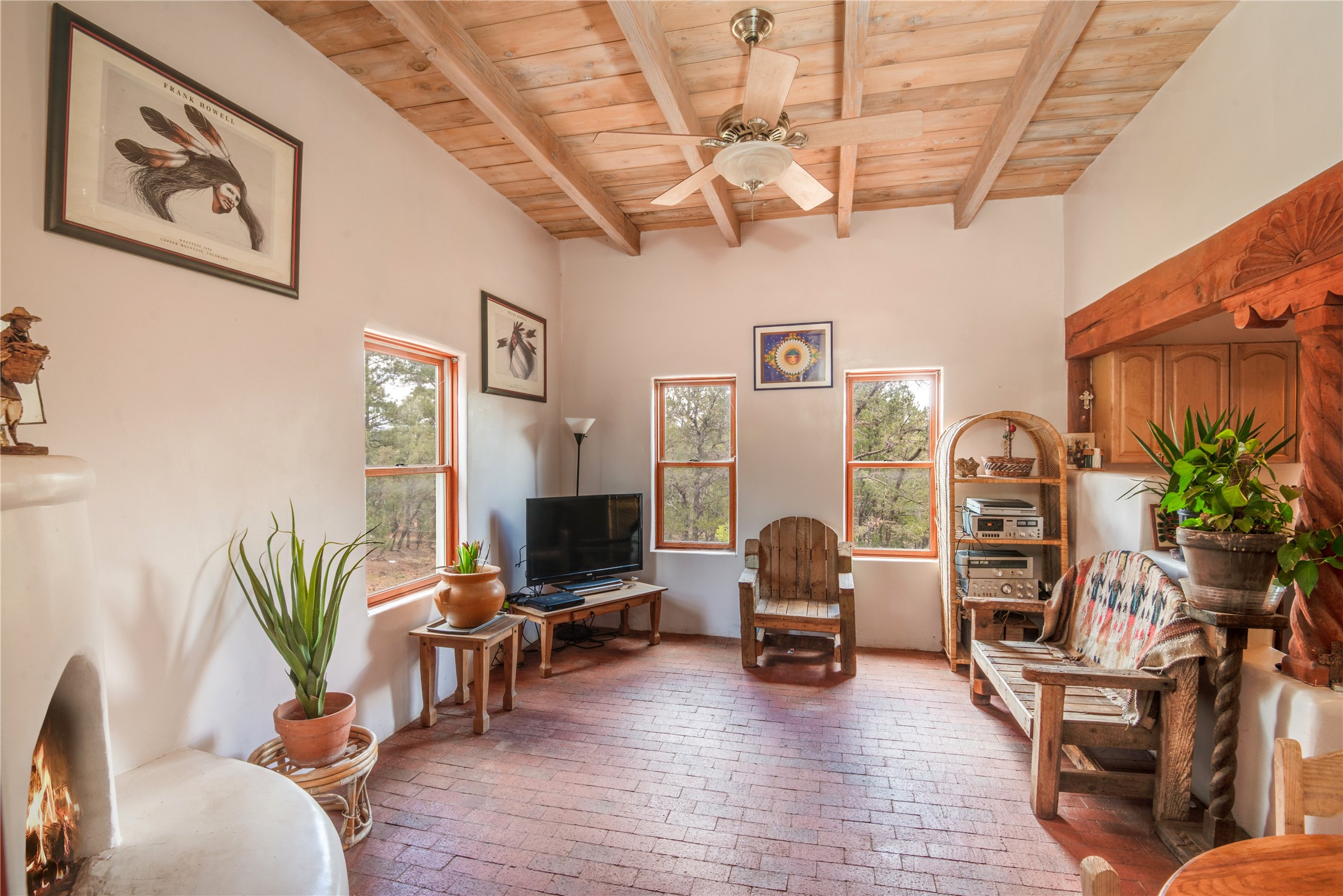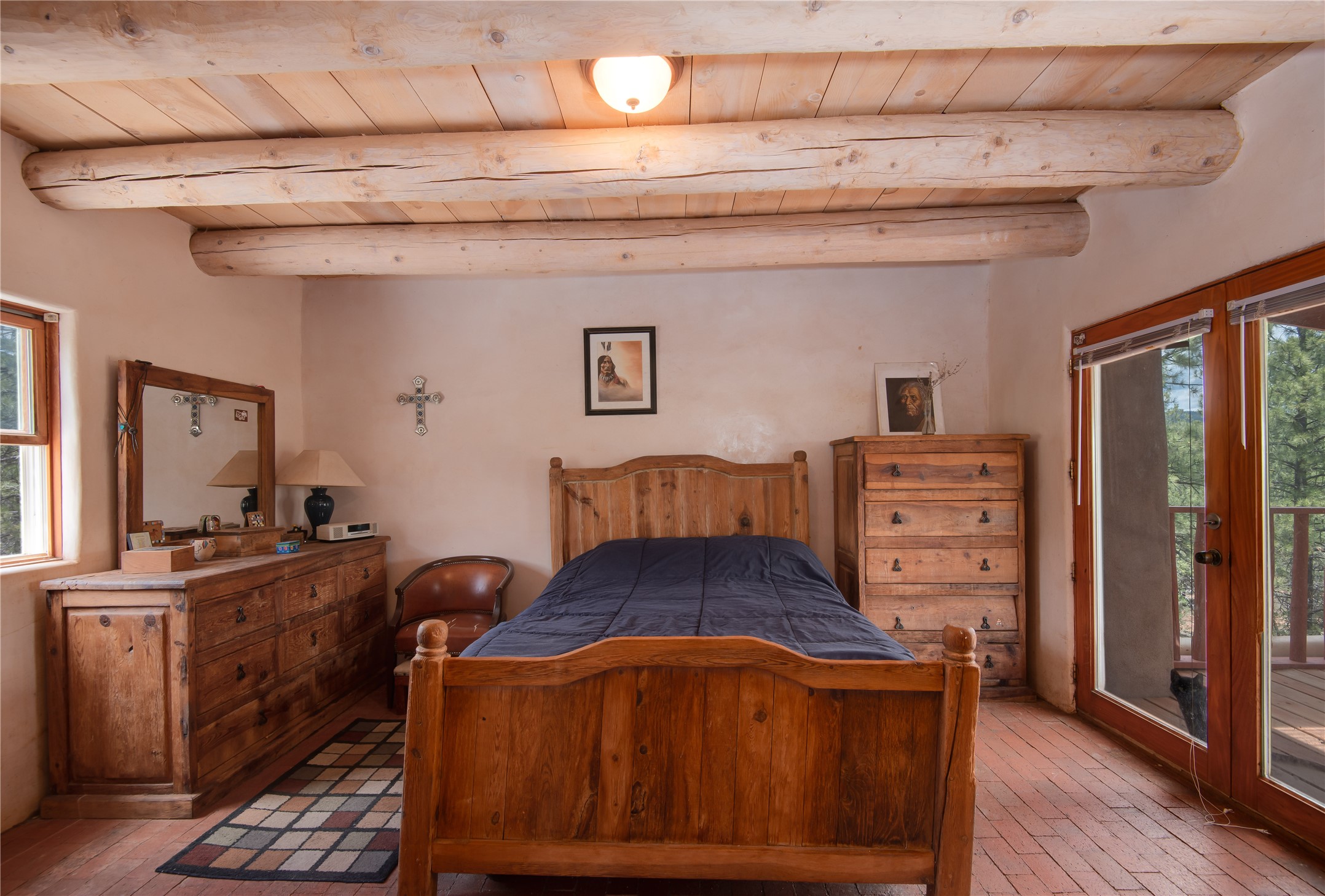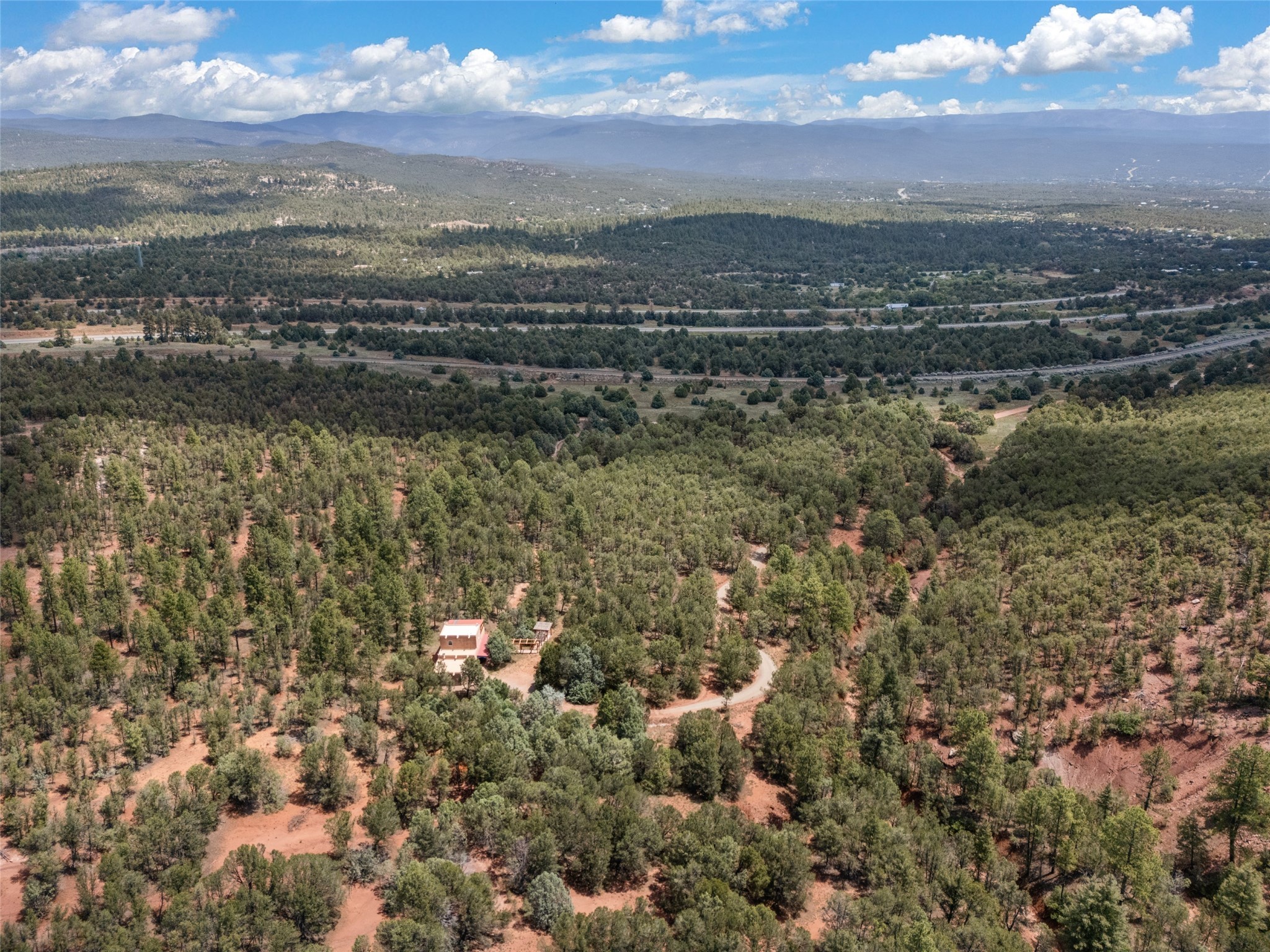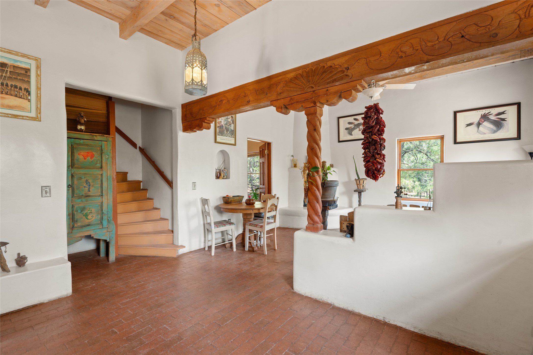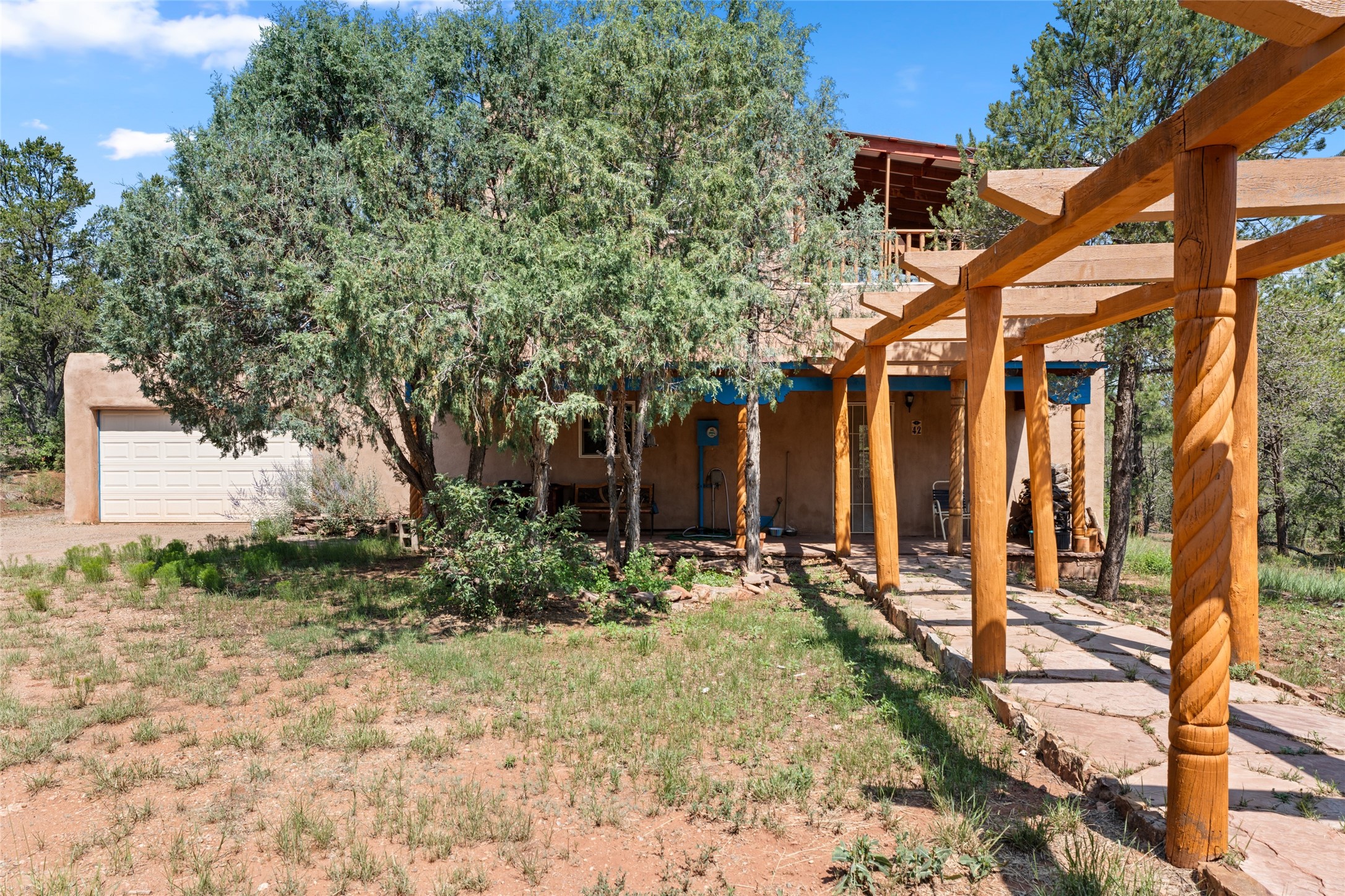 Combining the best of nature and comfort while providing ample space and privacy. This remarkable 2 bedroom and 2 bathroom home on 14.374 beautiful acres of serene wooded land can be your personal oasis away from the city. At the same time, it is a short drive to Santa Fe and the endearing small town of Pecos which is proximal to the gorgeous Pecos River with trout fishing. With no HOA or CCR's, this expansive land offers endless possibilities! Traditional features of this home include: wood beamed ceilings, a cozy wood-burning kiva fireplace, a private well, beautiful brick floors throughout, radiant heating, attached 2 car garage, an updated roof (roof was redone and has a transferrable 10 year warranty), a storage shed, and is gated for added privacy. Additionally, this gem of a home includes a residential kitchen with stainless steel appliances and a separate spacious commercial kitchen ideal for culinary enthusiasts! On the first level you have a lovely bedroom, bathroom, office and two kitchens (one residential and one commercial). On the second level, the largest bedroom/bathroom was thoughtfully placed to enjoy the breath taking New Mexico sunrise. Moreover, the upstairs deck provides stunning views of the surrounding mountains, perfect for entertaining or relaxing under the stars. Come see this wonderful property today!